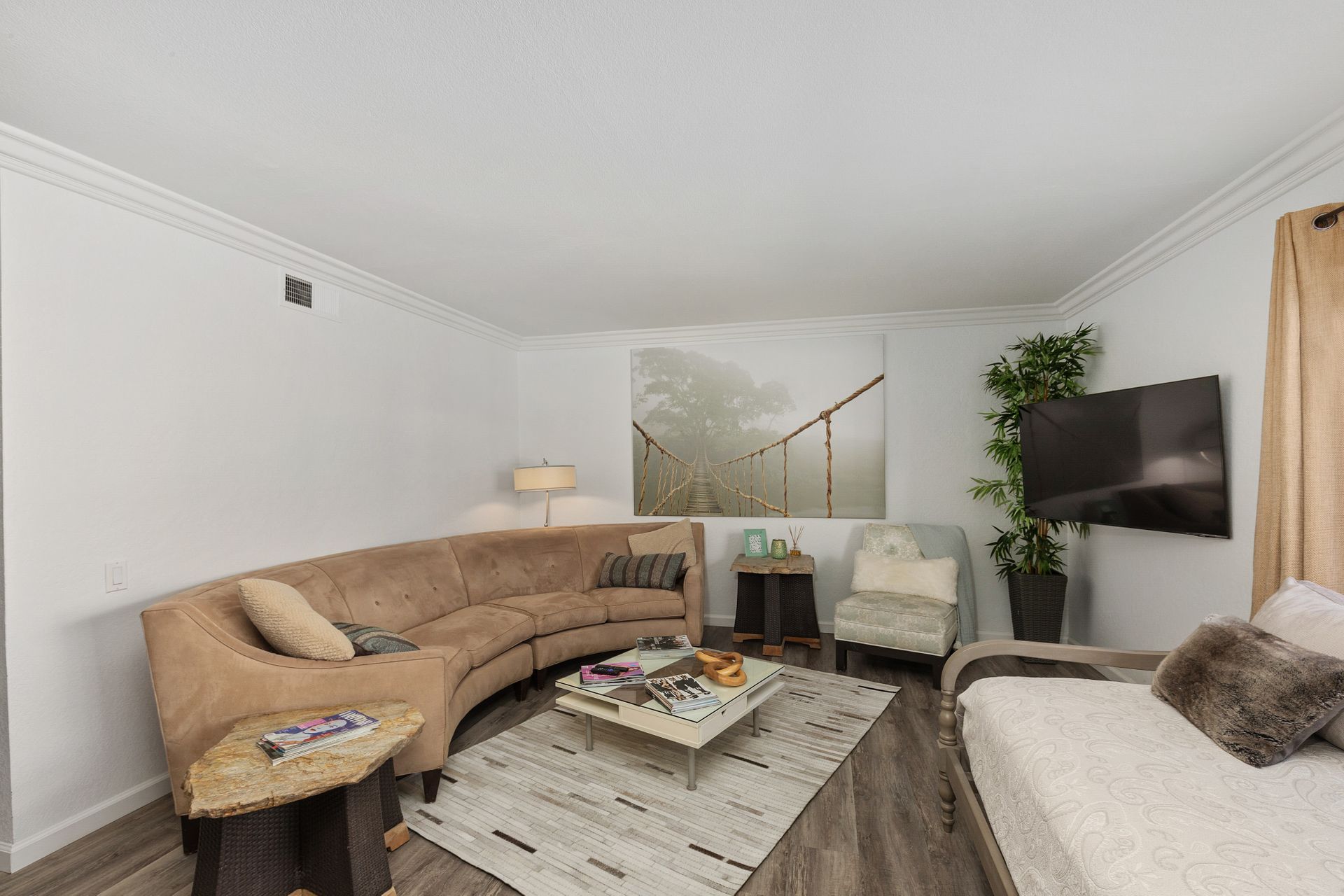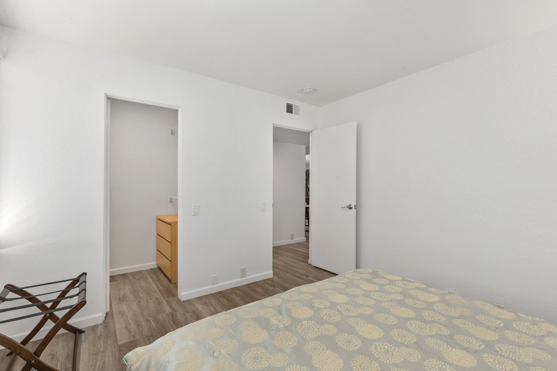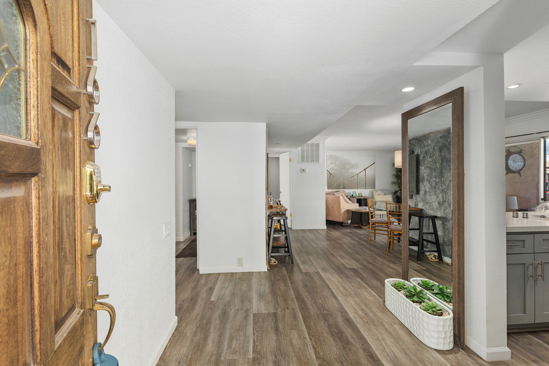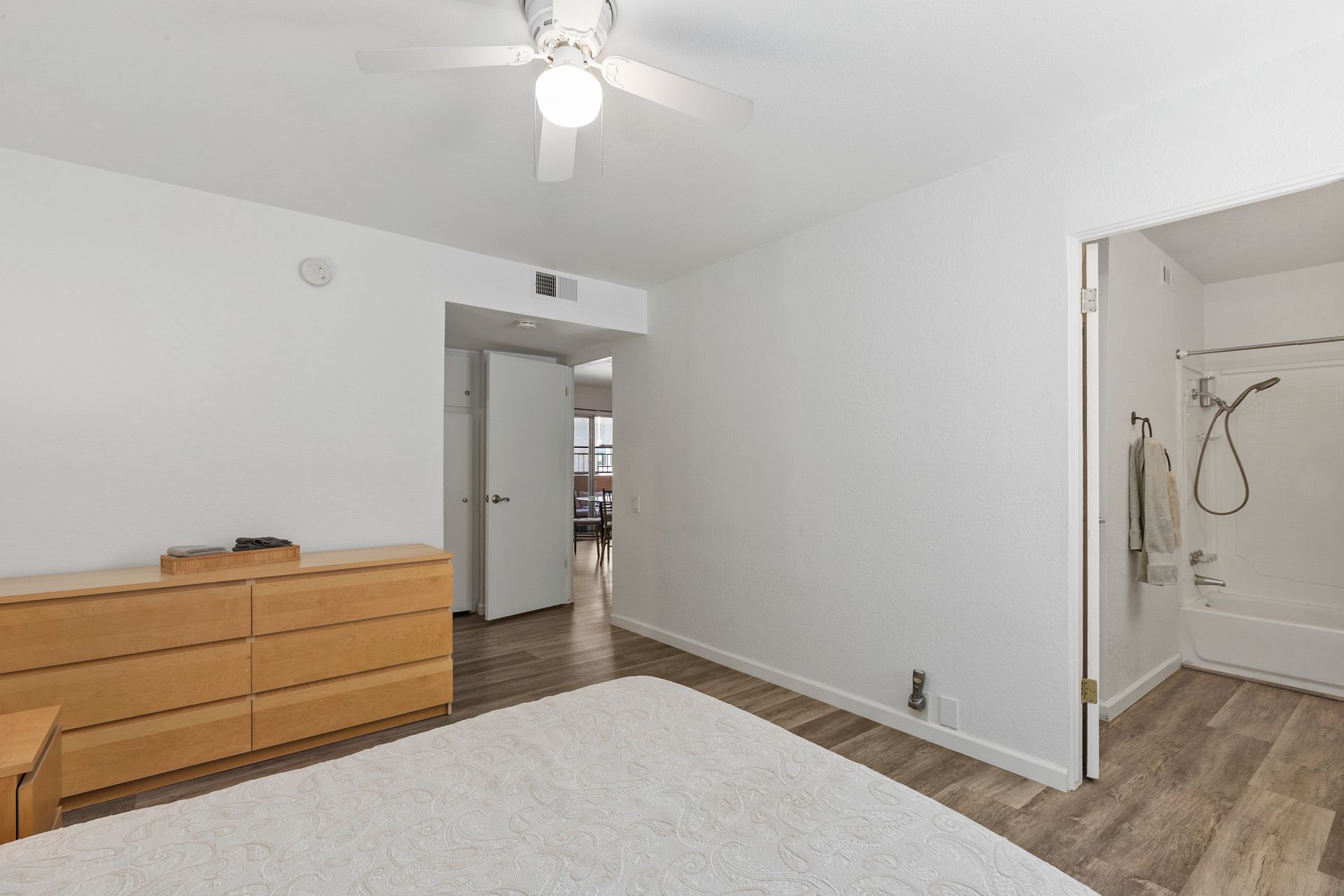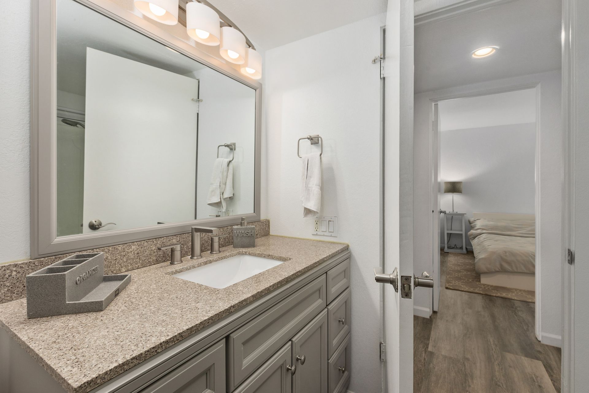 Welcome to Americana Gardens Delight, the property features direct access to the community pool from the private patio, this is the only unit with direct access in the complex, providing a convenient and refreshing outdoor oasis. This charming downstairs end unit has two-bedroom, two-bathroom home offers approximately 1,150 square feet of living space. The low homeowners association (HOA) fees cover essential services such as roof maintenance, building upkeep, gas, water, and trash removal, making this home a low-maintenance option. The kitchen is designed for the discerning chef, boasting quartz countertops, a gas stove, and stainless steel appliances. The open floor plan seamlessly integrates the kitchen with a dining area and a spacious living room views of the patio and pool for a relaxing atmosphere. Residents can enjoy the convenience of in-unit side-by-side washer and dryer hookups. This makes for a wonderful owners unit and or part, full time renters, 30 day minimum rental per HOA. Americana Gardens is centrally located, this is a must see!