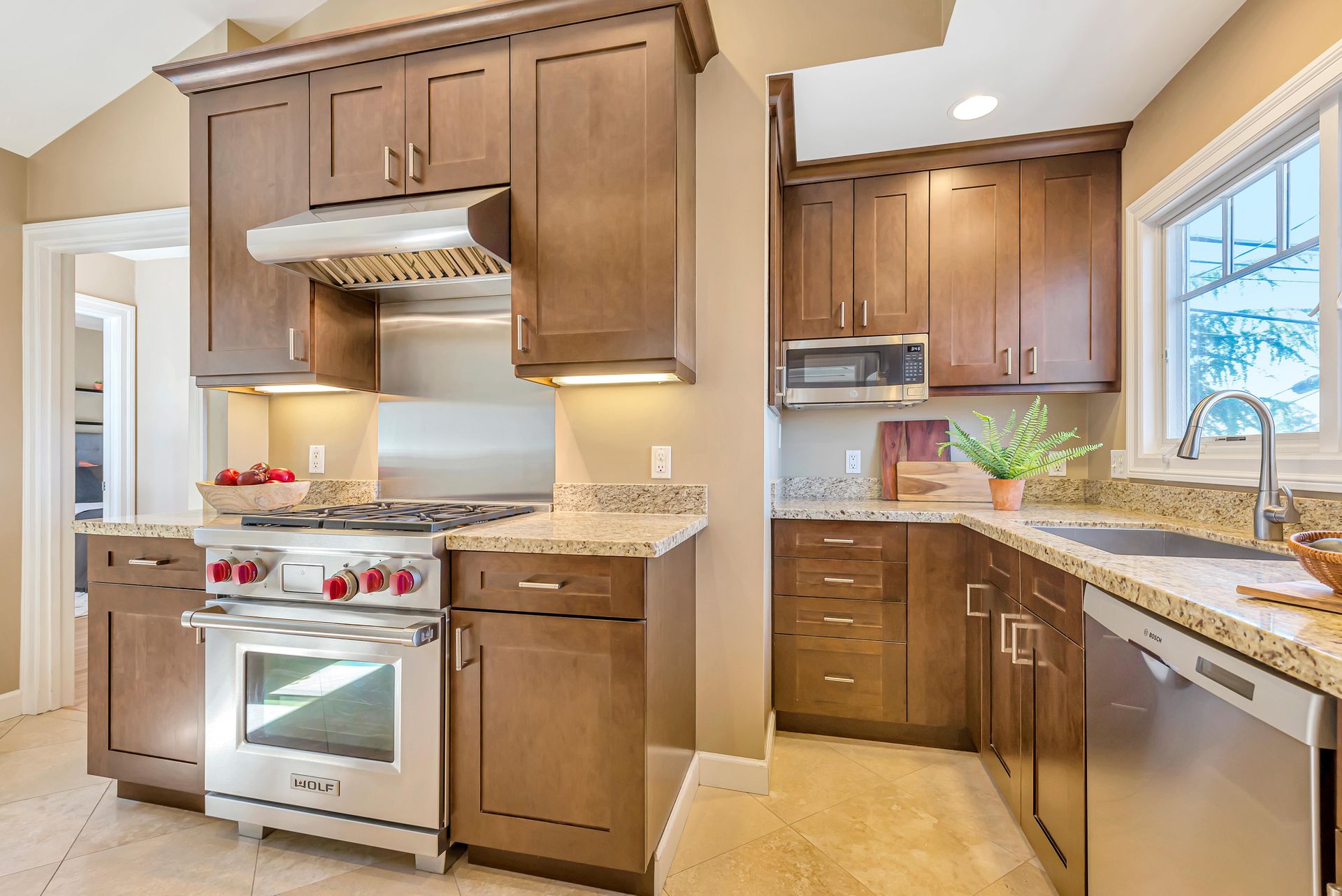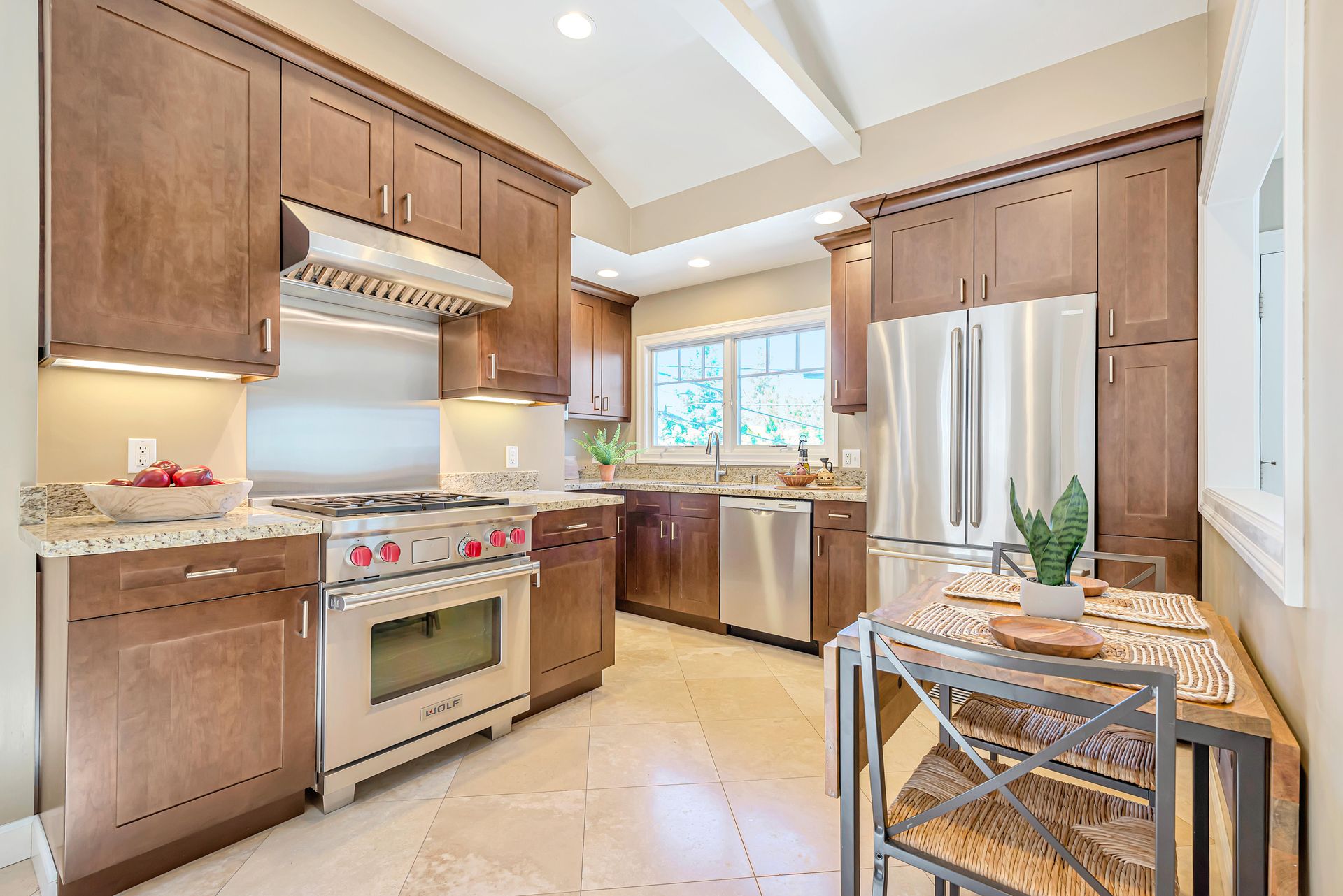 The updated kitchen features granite countertops, beautiful wood cabinets, tile flooring and stainless-steel appliances, including a Wolf range, and Bosch dishwasher.