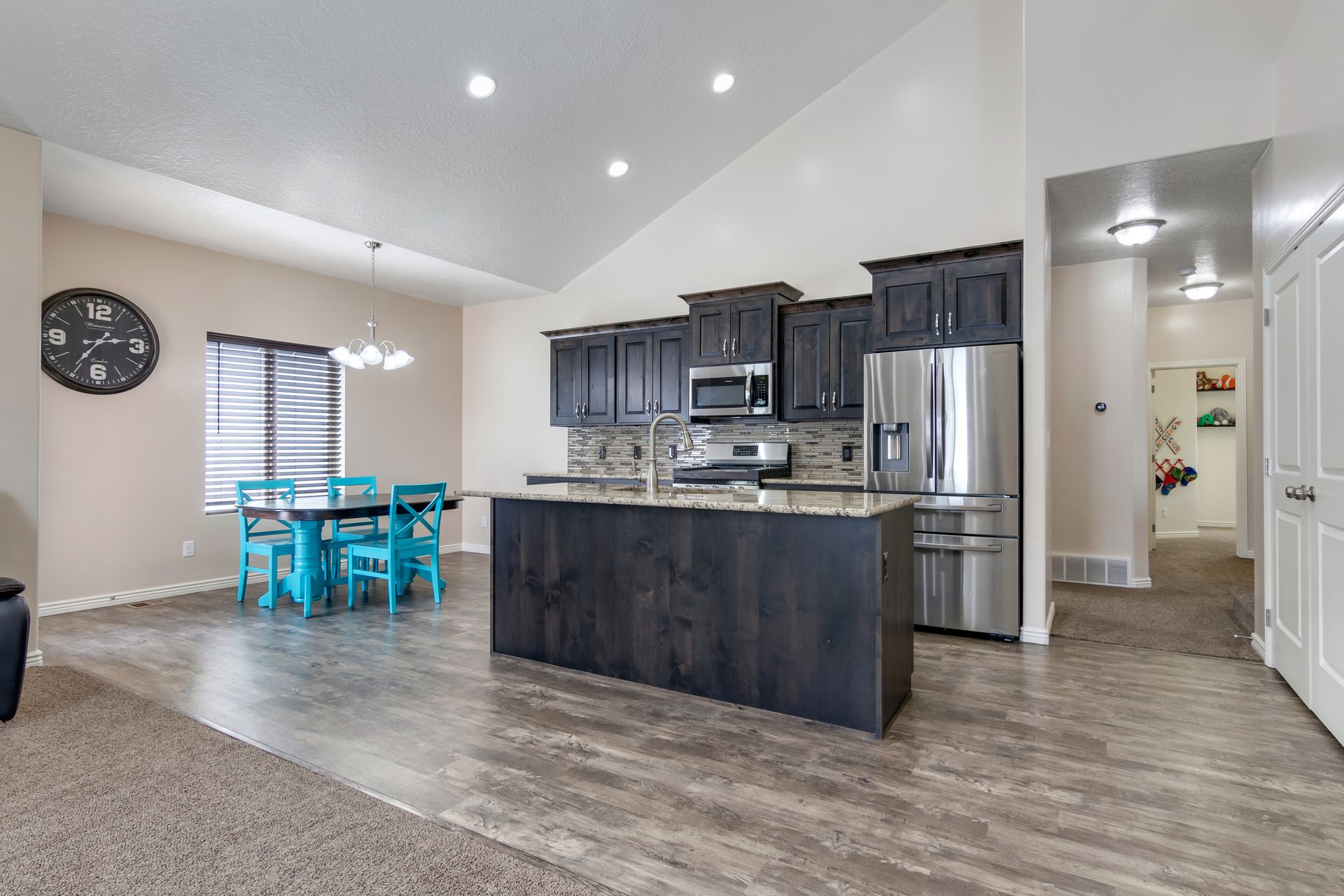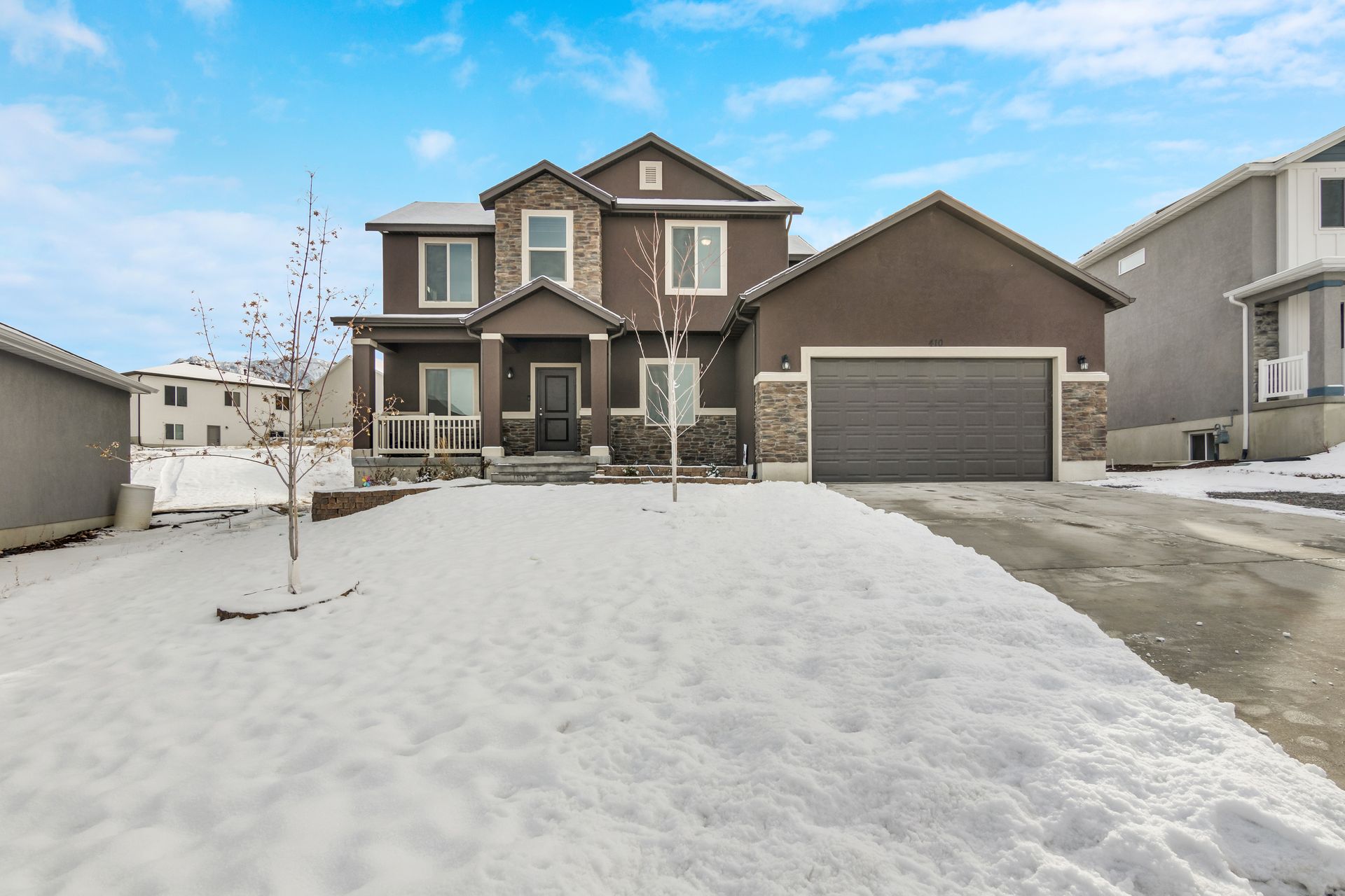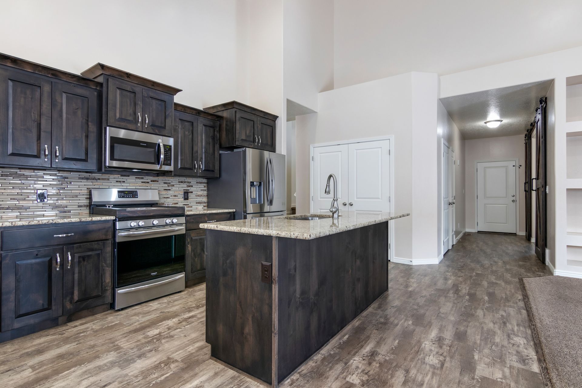 Welcome home! This nearly brand new and gorgeous, spacious home comes with all the bells and whistles including a covered patio, barn doors into your den, a large, open and vaulted family room adjacent to the open kitchen which includes granite, gas stove and range, lots of counter space and a large pantry. Master on the main with a truly expansive walk-in closet and a separate soaking tub and shower. The main floor has two additional spacious bedrooms, bath and laundry. The upstairs comes with an open loft, two more large bedrooms and a bathroom. This home has lots of light and closets! Upgraded carpet and eight-pound pad. Nine-foot ceilings! The basement is huge with lots of space to grow. The lot is amazing! All of this is set in a desirable neighborhood with proximity to great schools.