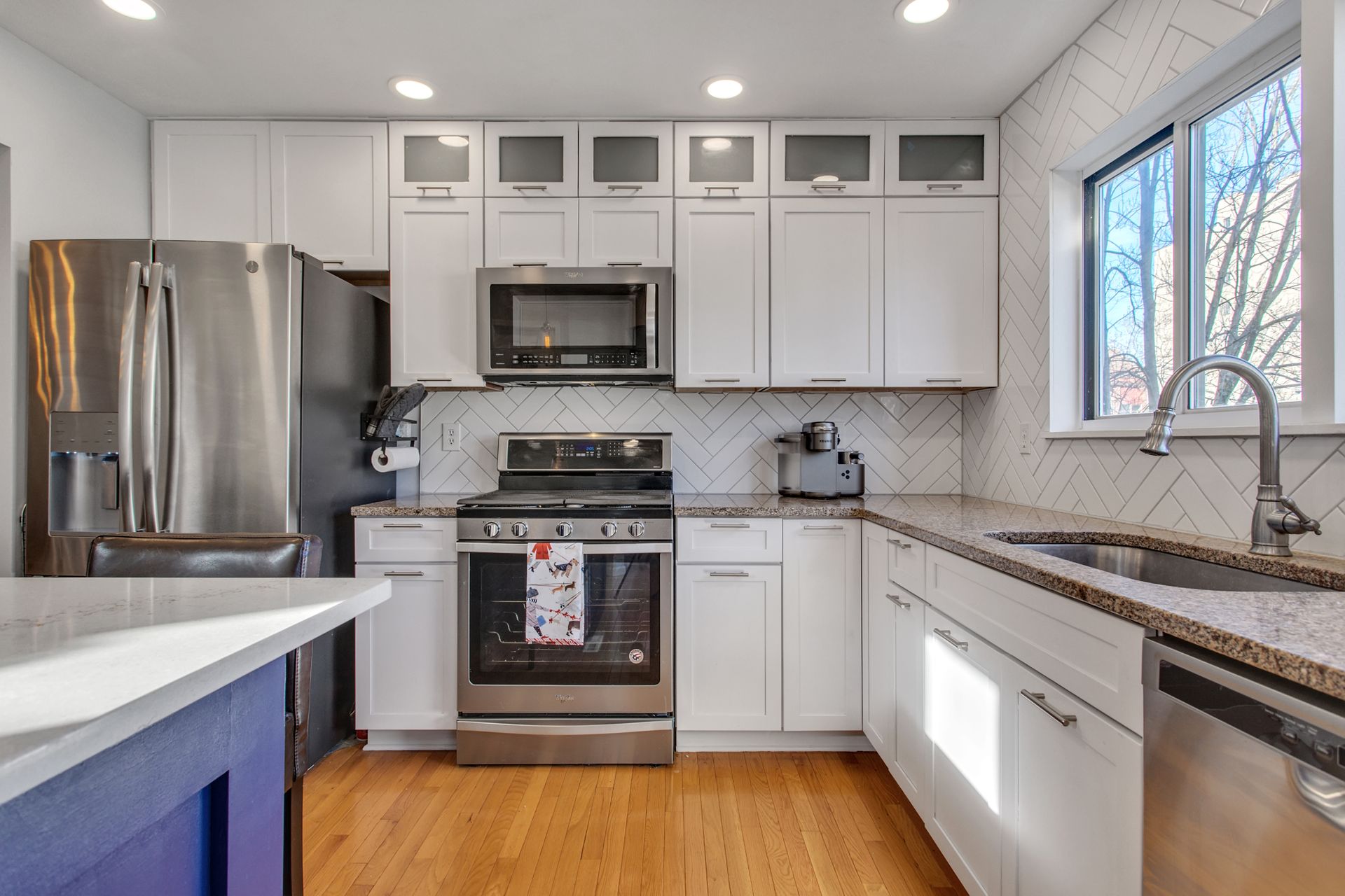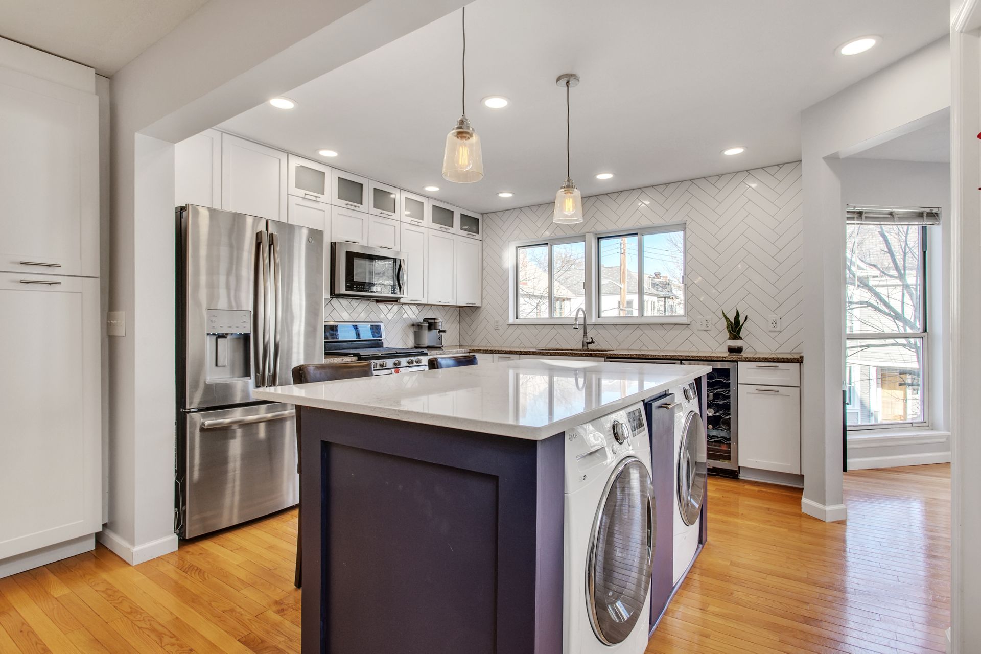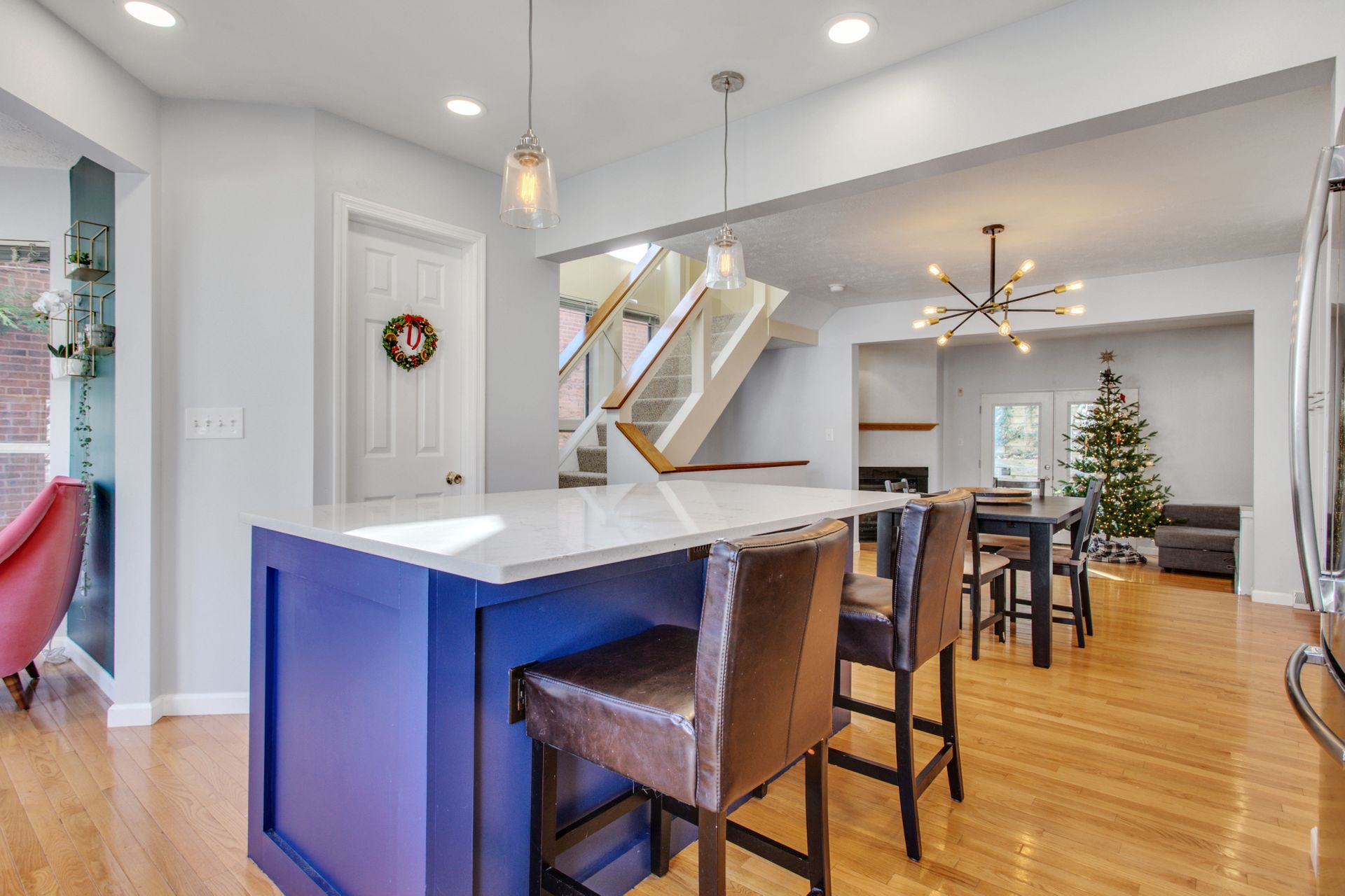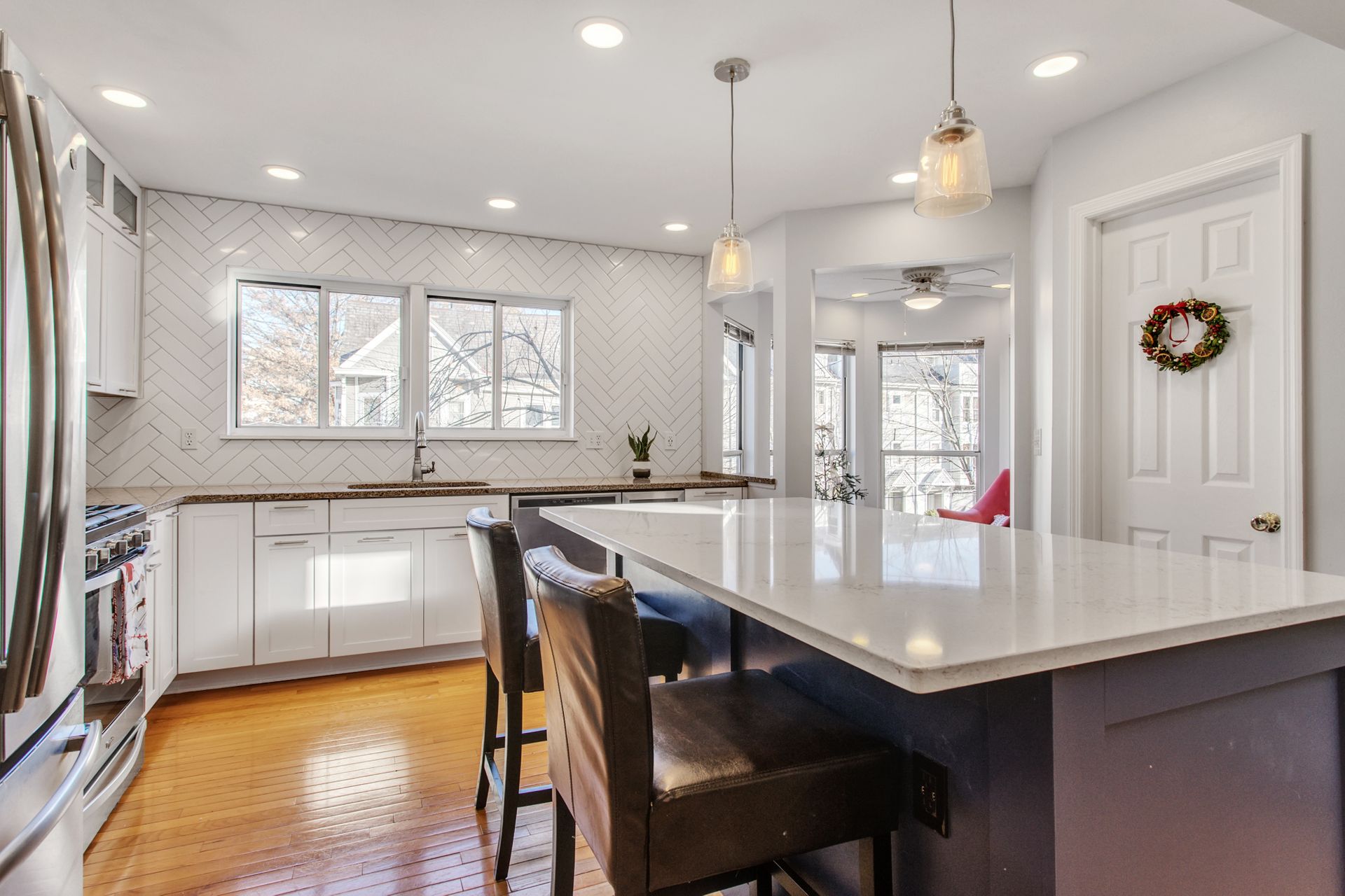 The interior features hardwood floors throughout main level. The white kitchen includes a wine beverage refrigerator and was opened up in 2019 to allow for a massive island. A quaint sitting room/office area was added just off the kitchen and has an abundance of light from the wraparound windows and a fireplace. Enjoy spacious built-in cabinets in the dining room (2020), as well as new hardwood-looking tile in the foyer, which is durable for an entryway.