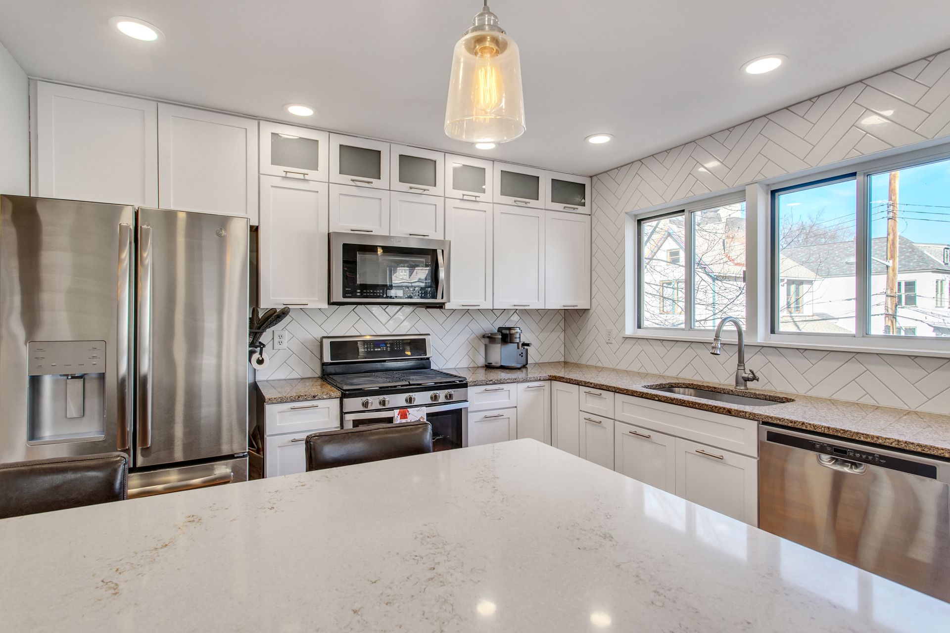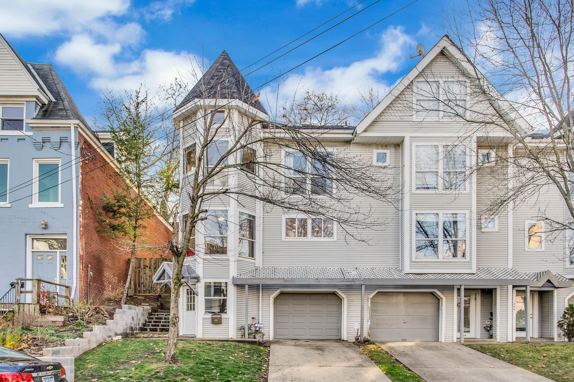 The main level is complete with a powder room, access to the two-car tandem garage and a large rear patio located off the living room, great for entertaining. The third-floor rooftop deck with a retractable awning is a great private space for outdoor entertainment and relaxation. Additional features include granite counters in the kitchen and master bathroom, as well as updated design lighting with Edison bulbs.