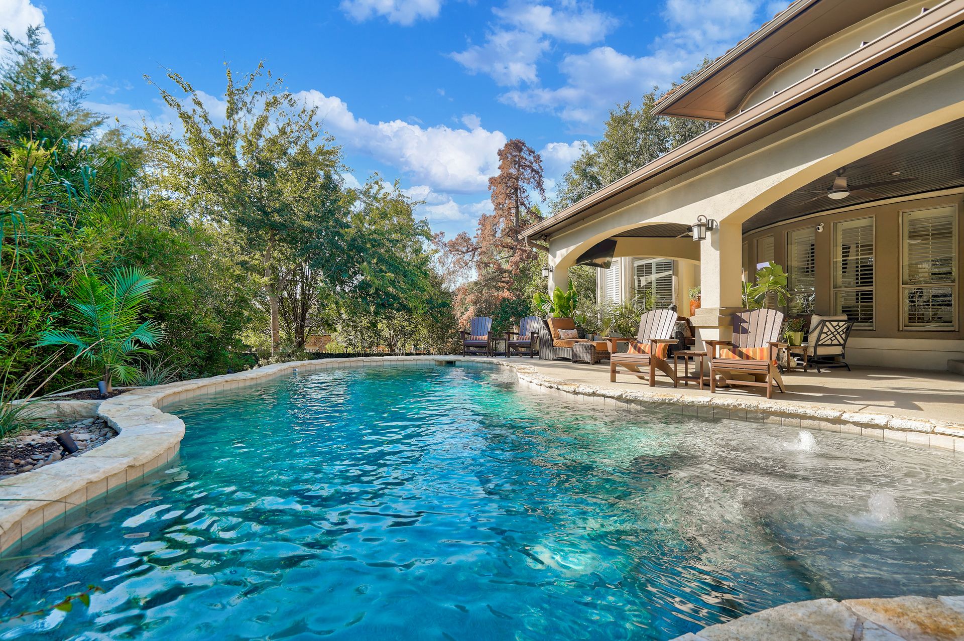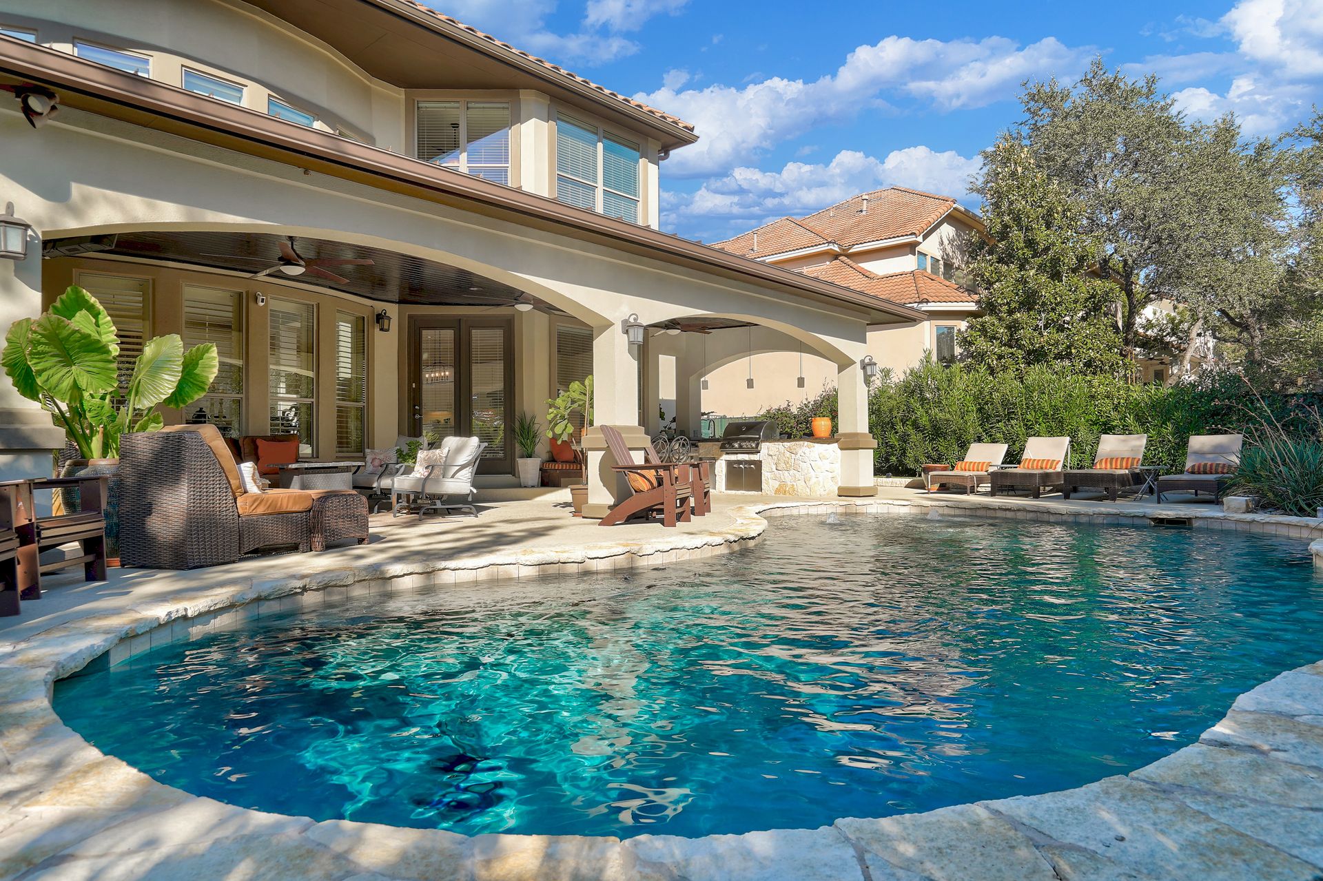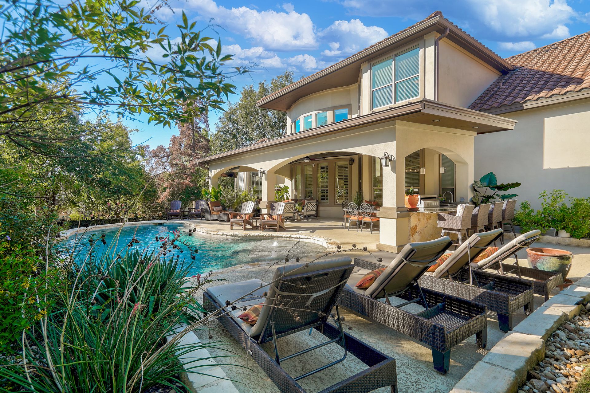 Beautiful 5 bedroom, 4 bath, 3 car garage home has been impeccably maintained in the prestigious Falconhead community. Located on a cul-de-sac with a private and fenced backyard. You are welcomed into a grand entry foyer with a chandelier and dramatic dual staircases. The great room with high ceilings provides plenty of natural light from the wall of windows which allows for viewing the spacious outdoor seating area with a covered patio, and a custom-built pool with beautiful tile accents and water features. Unwind in the peaceful outdoor living space which is truly an oasis and includes a granite outdoor kitchen. Inside, the newly remodeled kitchen is a gourmet chef’s dream with a new gas range cooktop, quartz countertops, a workstation sink, dishwasher, garbage disposal, under-cabinet lighting, and recessed lighting. The oversized island and breakfast room provide the perfect space for family and friends to gather, and it opens into the great room with automatic electric shades that open and closes with the press of a button. The luxurious spacious primary suite overlooks the pool and yard from the bay window. The primary bathroom has been fully remodeled and provides a spa-like environment with a beautiful stand-alone soaking tub, a walk-in shower, dual sink, and a large walk-in closet. The home also has a dedicated office off the entry with wood floors that could also double as a 5th bedroom. Upstairs, there is a large media room that provides an exceptional movie-watching experience. The office nook has built-in shelves and cabinets. There are three upstairs bedrooms; two share a jack-and-jill bathroom, each with tile flooring and coordinated accent tile. The third bedroom has a full bathroom outside in the private hallway. This serene neighborhood has a great golf course, playground, and parks within walking distance. Close to Bee Cave shops and fabulous restaurants. Outstanding Lake Travis ISD. Low taxes and low utilities!