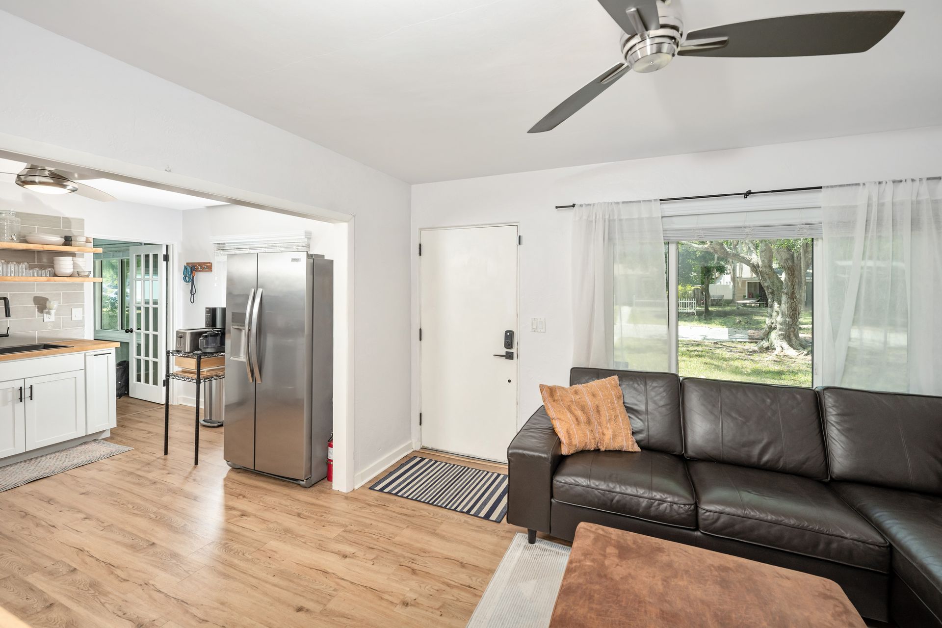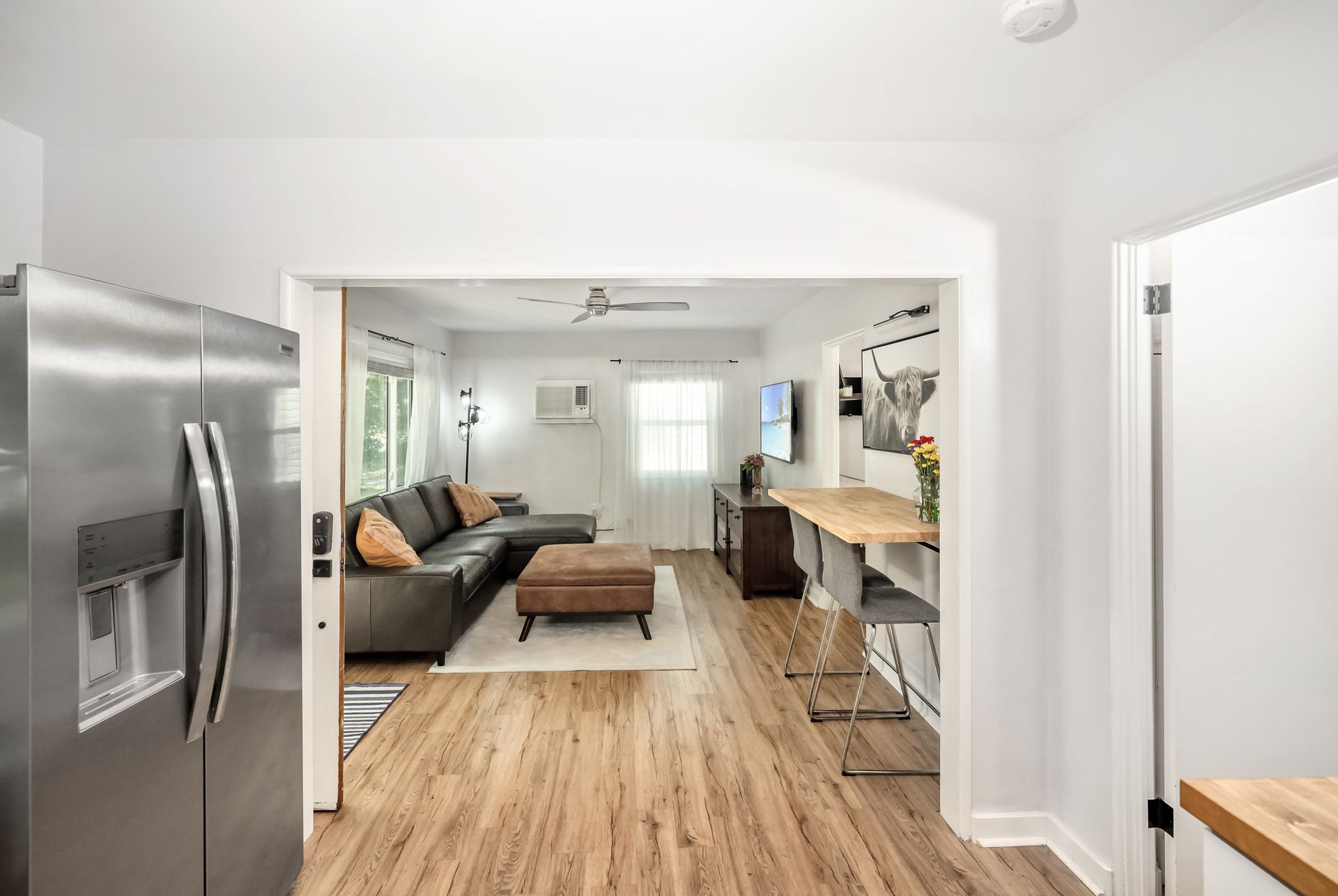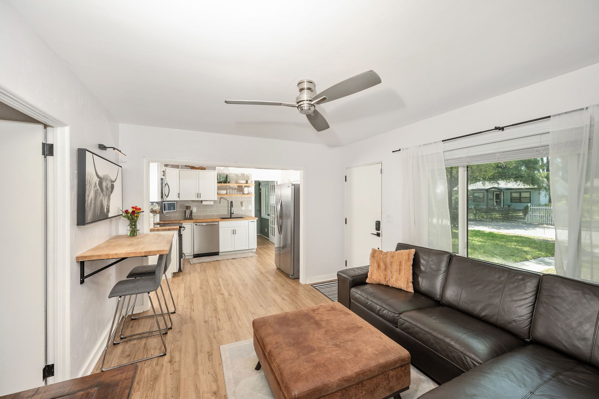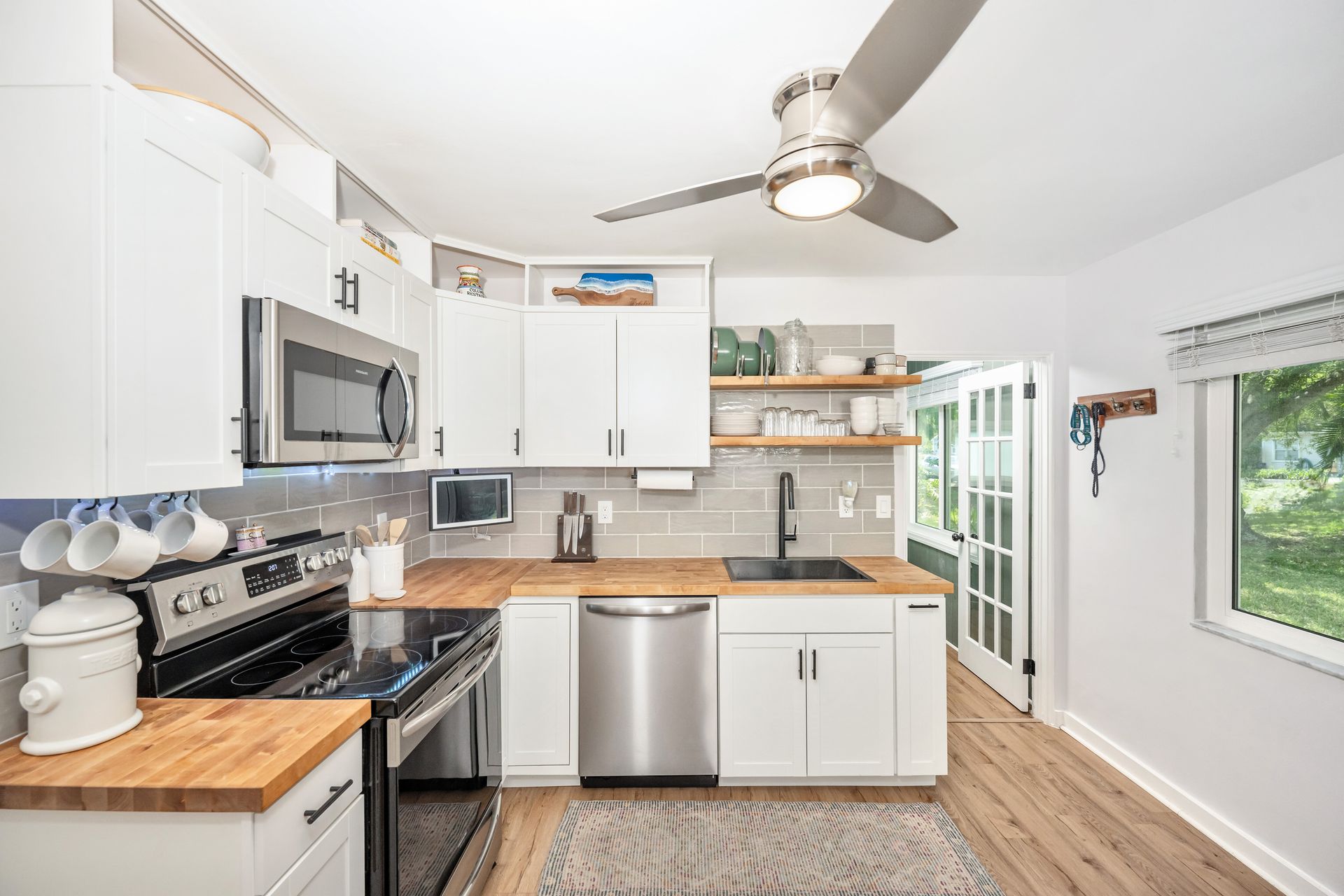 Updated finishes include new high-quality laminate flooring, contemporary shaker-style cabinetry, butcher block counter tops, and sleek stainless steel appliances. The addition of all new hurricane impact windows and back door to withstand wind forces up to 140 mph, newer plumbing and paint throughout the interior and exterior.