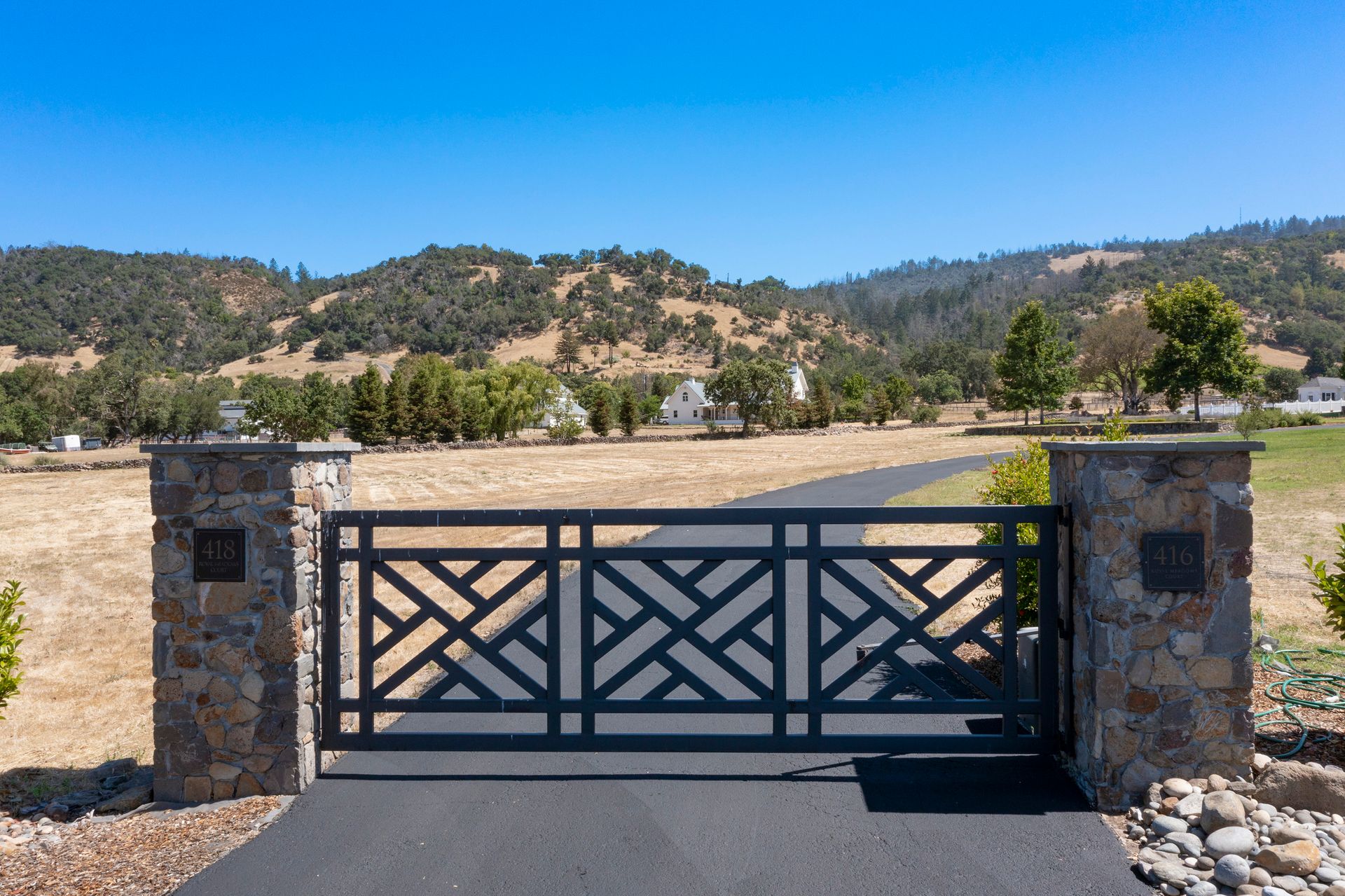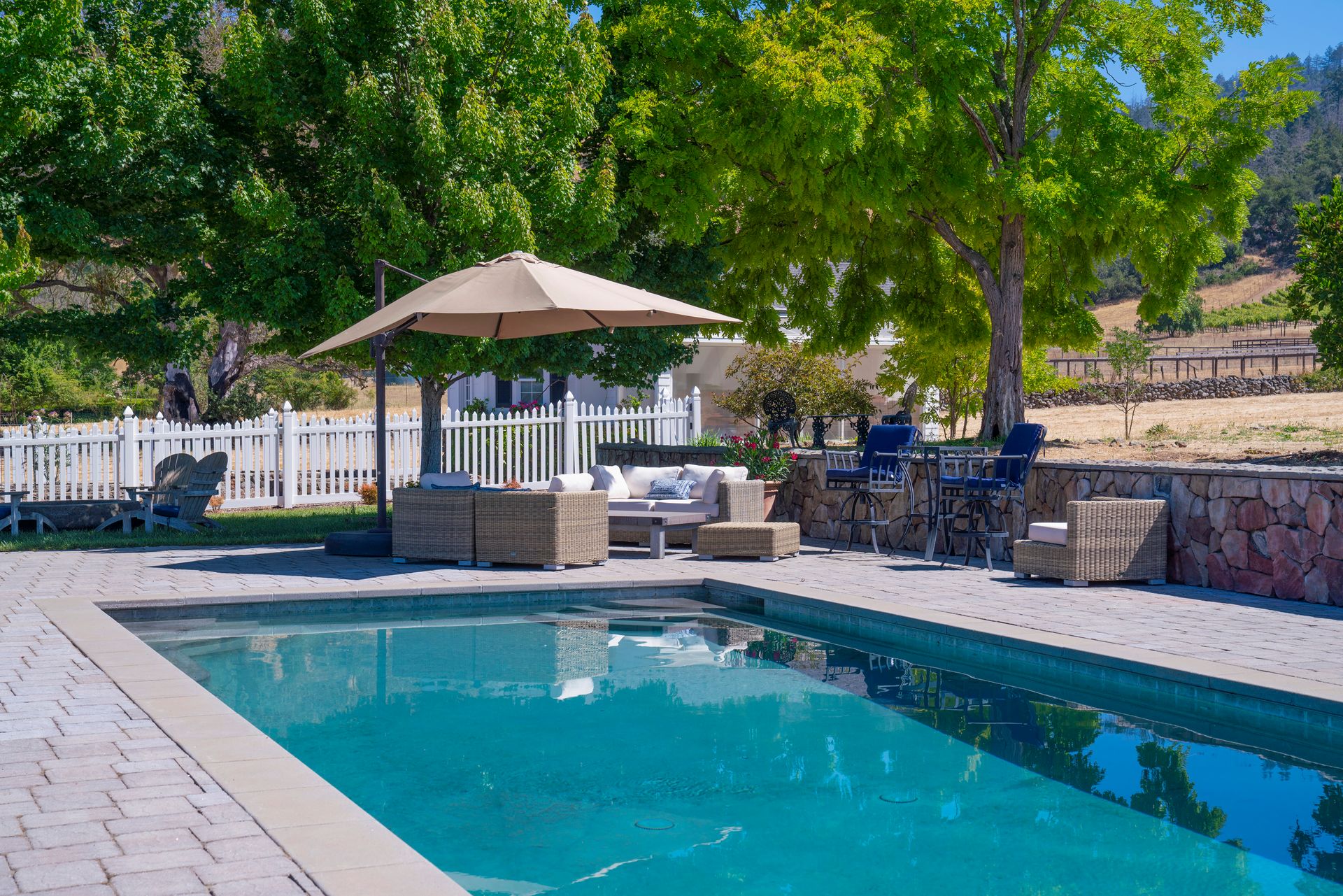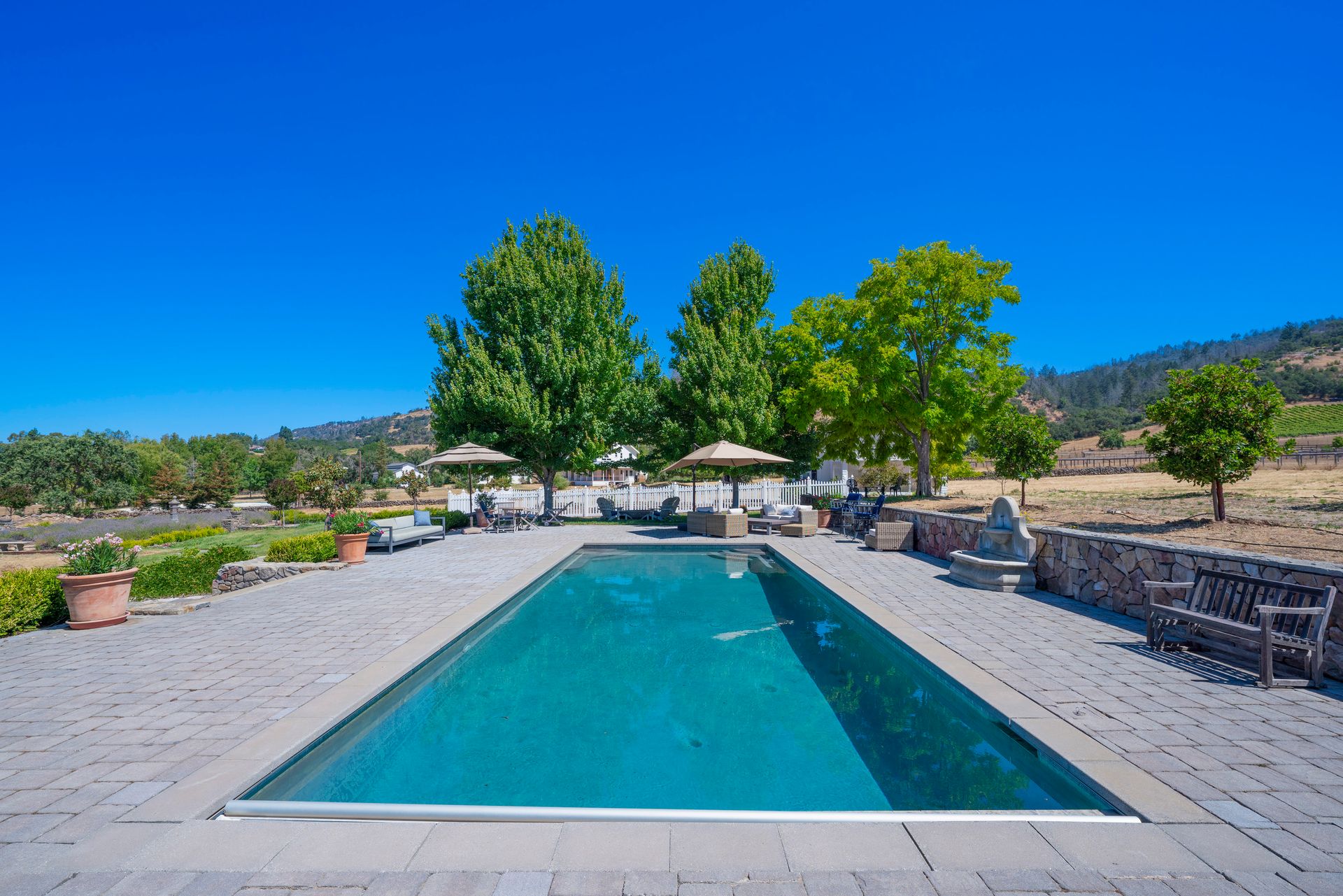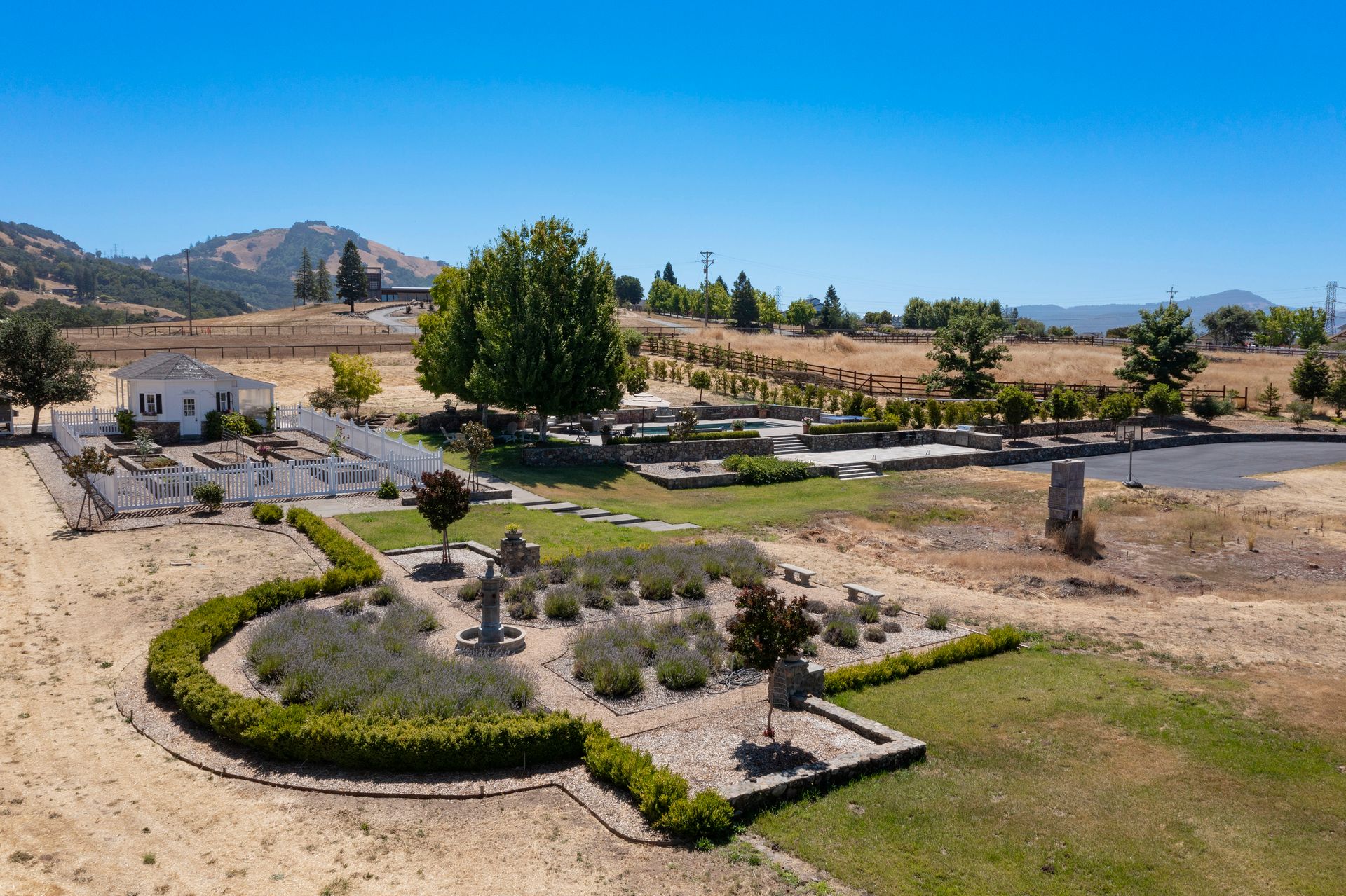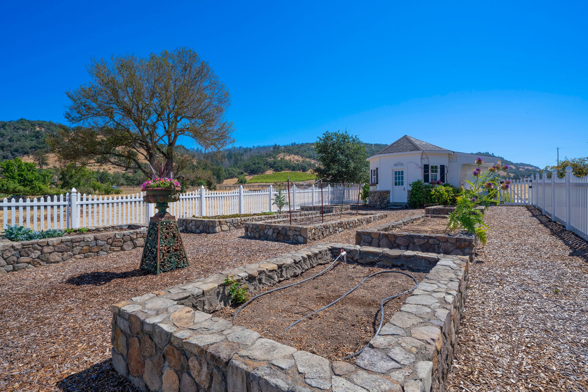 Beautiful 5-acre gated Wine Country estate property with a 1,200 square foot additional dwelling unit built in 2018 featuring 2 bedrooms, 2 full bathrooms, a fenced back yard, an attached 2-car garage, and a detached 2-car garage. An open floor plan great room boasts a vaulted ceiling, a gas fireplace, and French doors leading to the patio, extending the living area, and providing seamless indoor-outdoor flow. An open concept kitchen is highlighted by a center island and Silestone quartz counter tops. Prepare meals surrounded by beauty and functionality, as natural light pours in through the large windows, offering picturesque views of the surrounding hills and vineyards. Additional property features include a large inground pool with an expansive paver pool deck, built-in grill with granite countertops and sink, charming old-world potter’s shed and greenhouse, large-fenced garden area with raised stone garden beds, a French lavender garden with a stunning fountain, custom-designed chicken coop, large concrete firepit for special gatherings, and much more. Flat usable land with room for horses or vineyards offers endless possibilities while just minutes to town. This stunning Wine Country property is the opportunity to build the main house of your dreams, completing your resort-style estate.