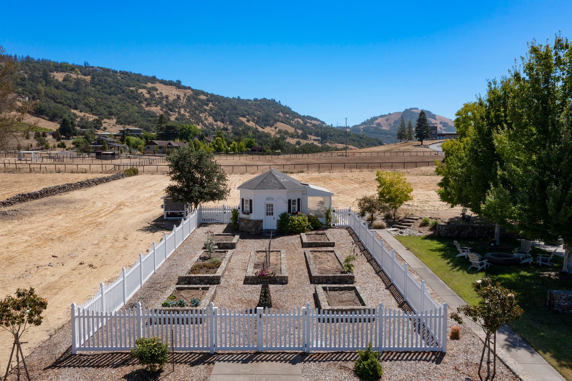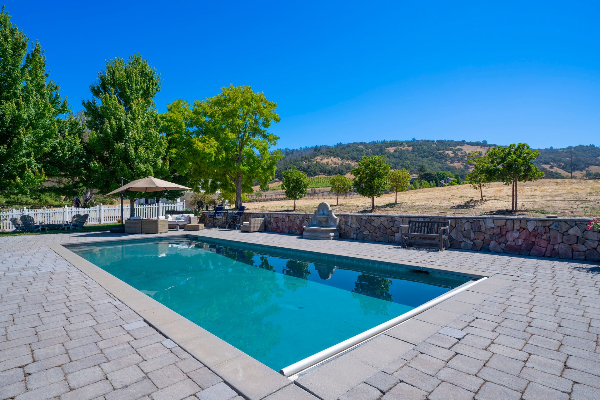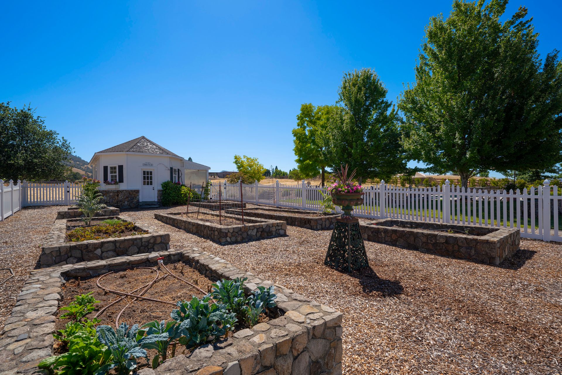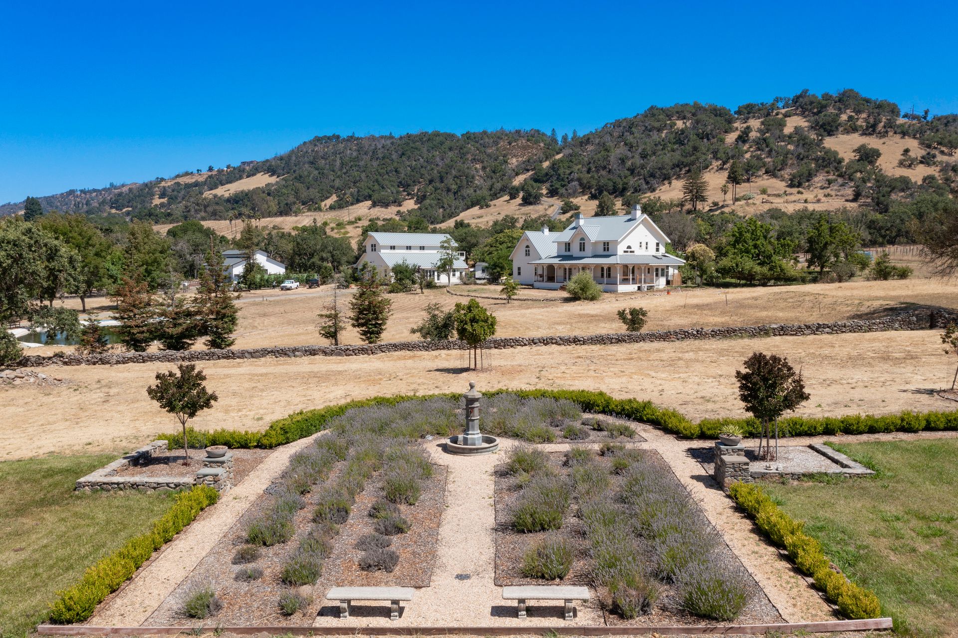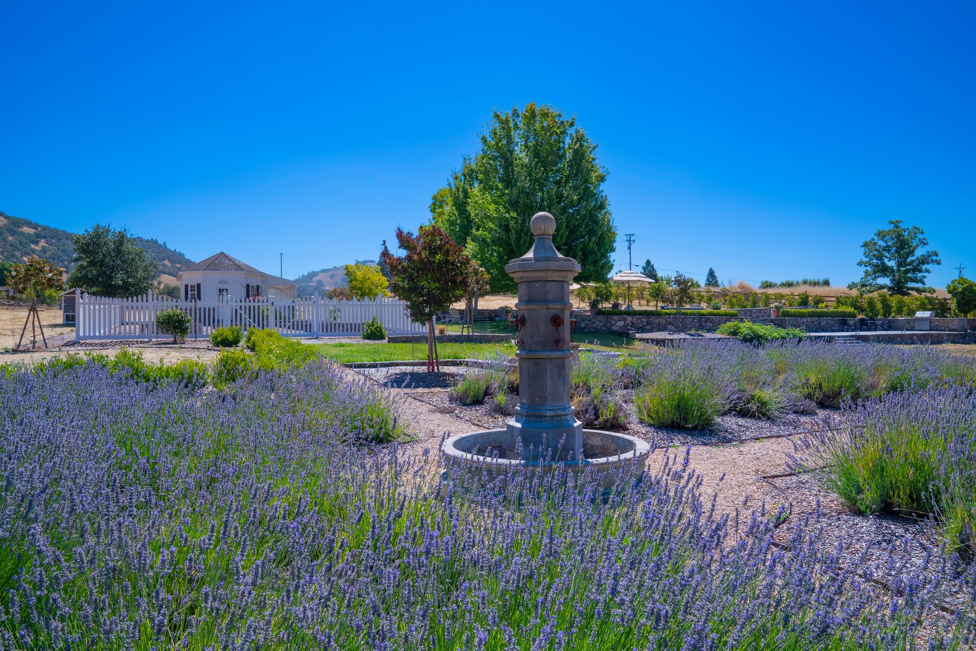 Beautiful 5-acre gated Wine Country estate property with a 1,200 square foot additional dwelling unit built in 2018 featuring 2 bedrooms, 2 full bathrooms, a fenced back yard, an attached 2-car garage, and a detached 2-car garage. An open floor plan great room boasts a vaulted ceiling, a gas fireplace, and French doors leading to the patio, extending the living area, and providing seamless indoor-outdoor flow. An open concept kitchen is highlighted by a center island and Silestone quartz counter tops. Prepare meals surrounded by beauty and functionality, as natural light pours in through the large windows, offering picturesque views of the surrounding hills and vineyards. Additional property features include a large inground pool with an expansive paver pool deck, built-in grill with granite countertops and sink, charming old-world potter’s shed and greenhouse, large-fenced garden area with raised stone garden beds, a French lavender garden with a stunning fountain, custom-designed chicken coop, large concrete firepit for special gatherings, and much more. Flat usable land with room for horses or vineyards offers endless possibilities while just minutes to town. This stunning Wine Country property is the opportunity to build the main house of your dreams, completing your resort-style estate.