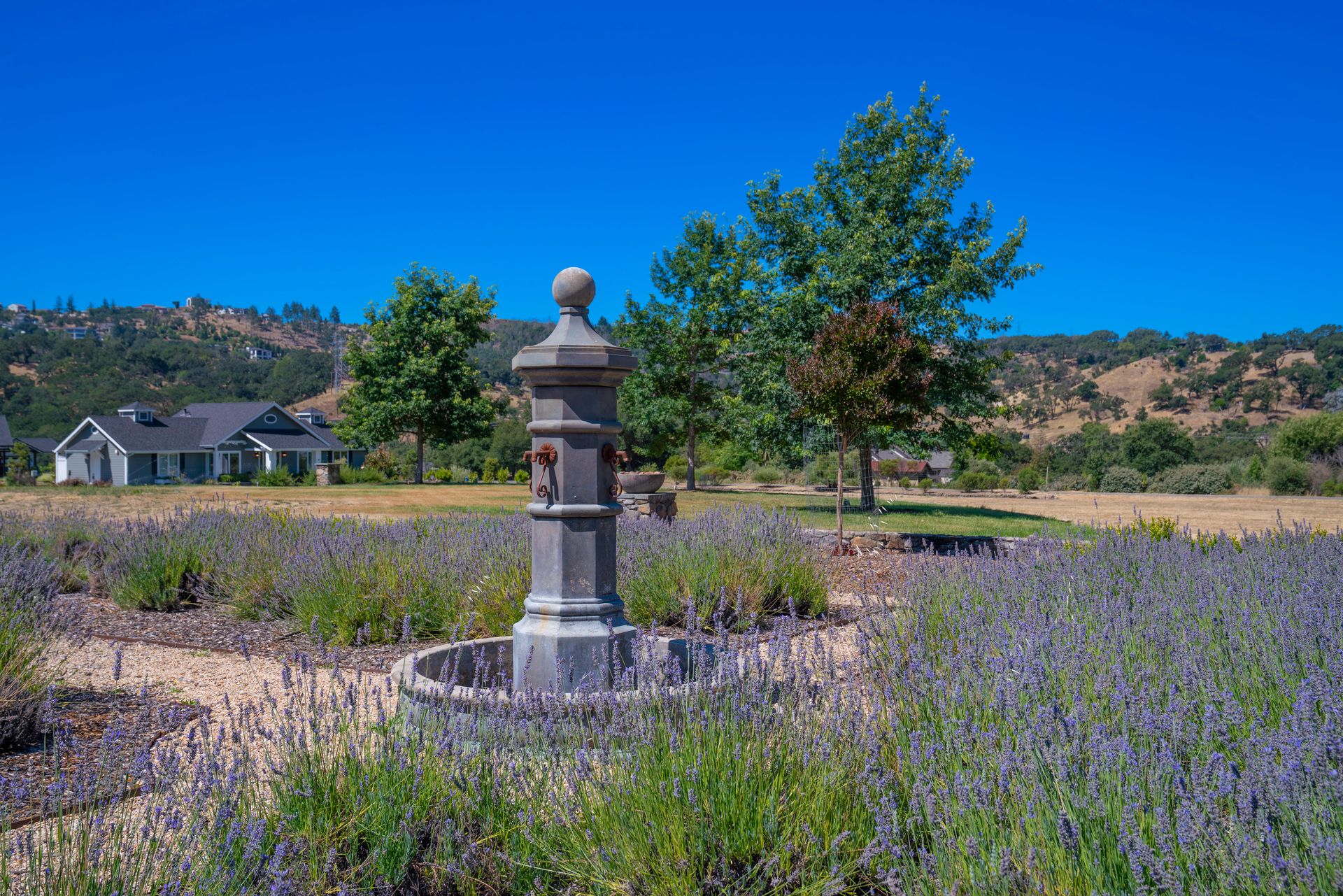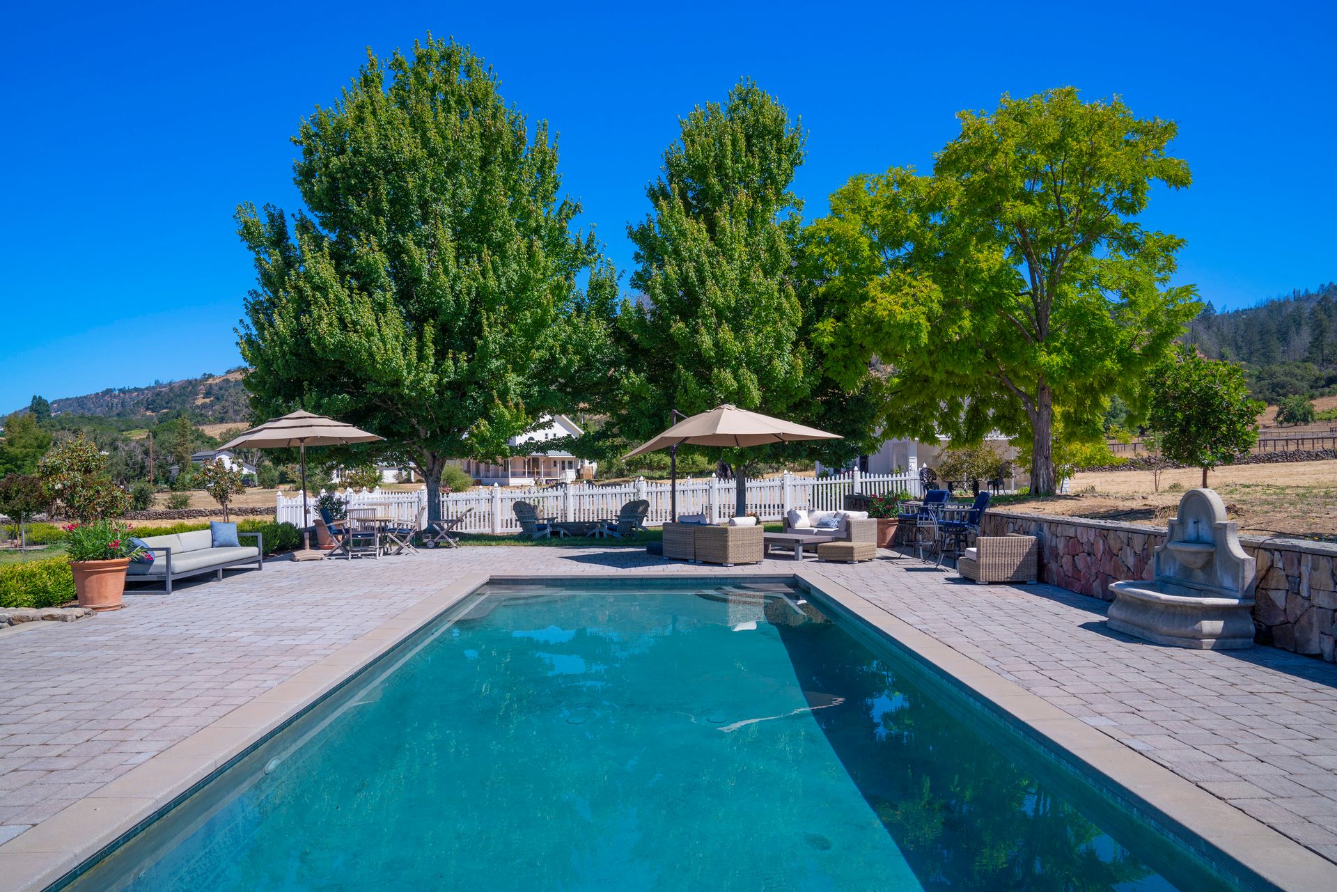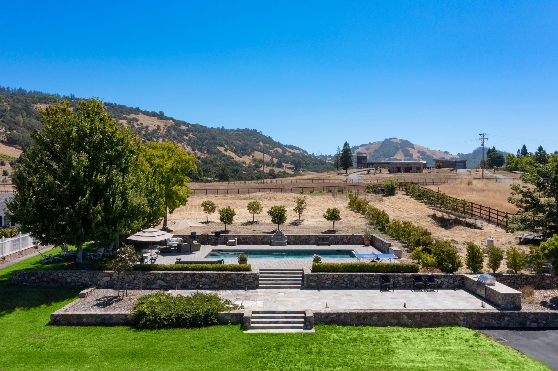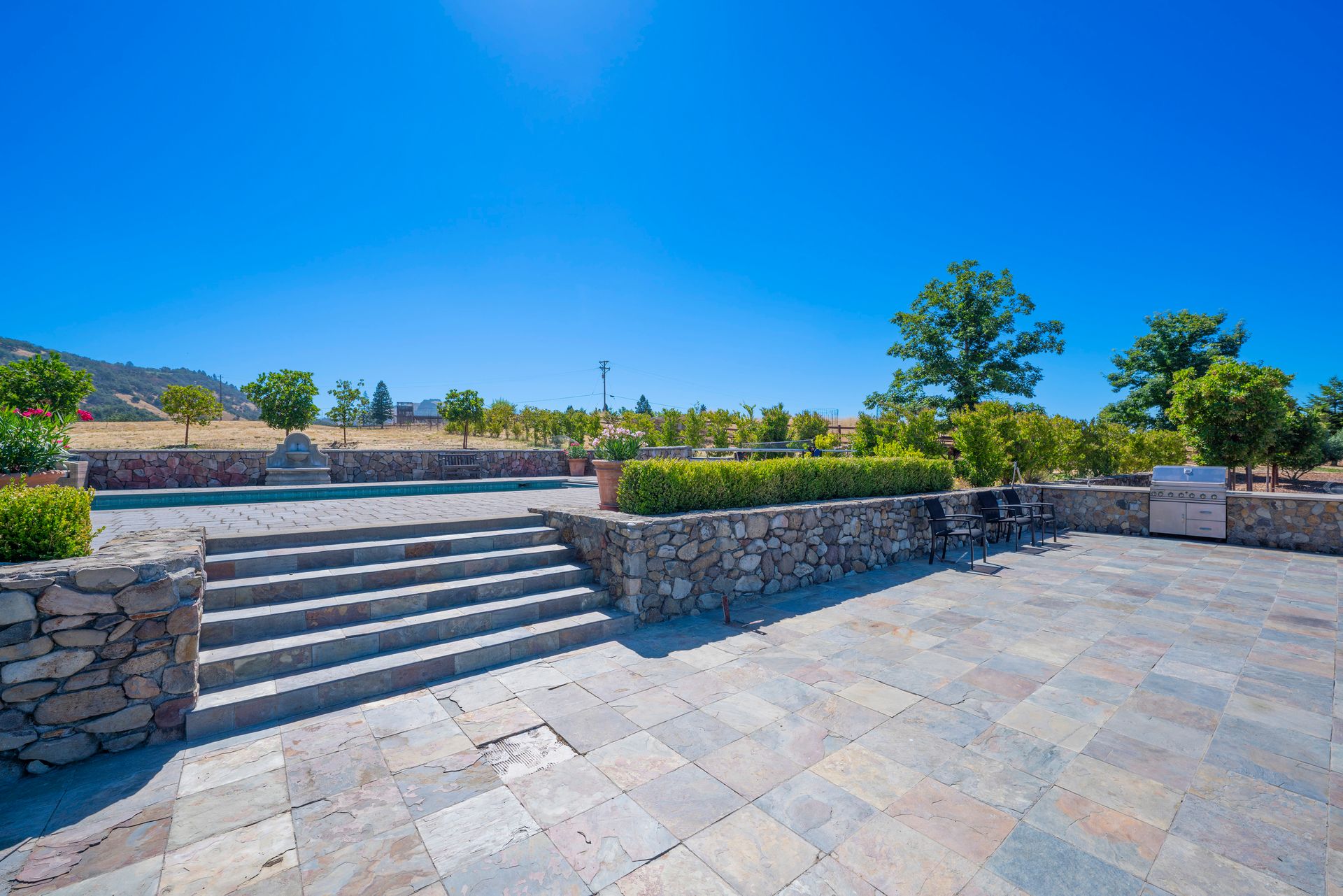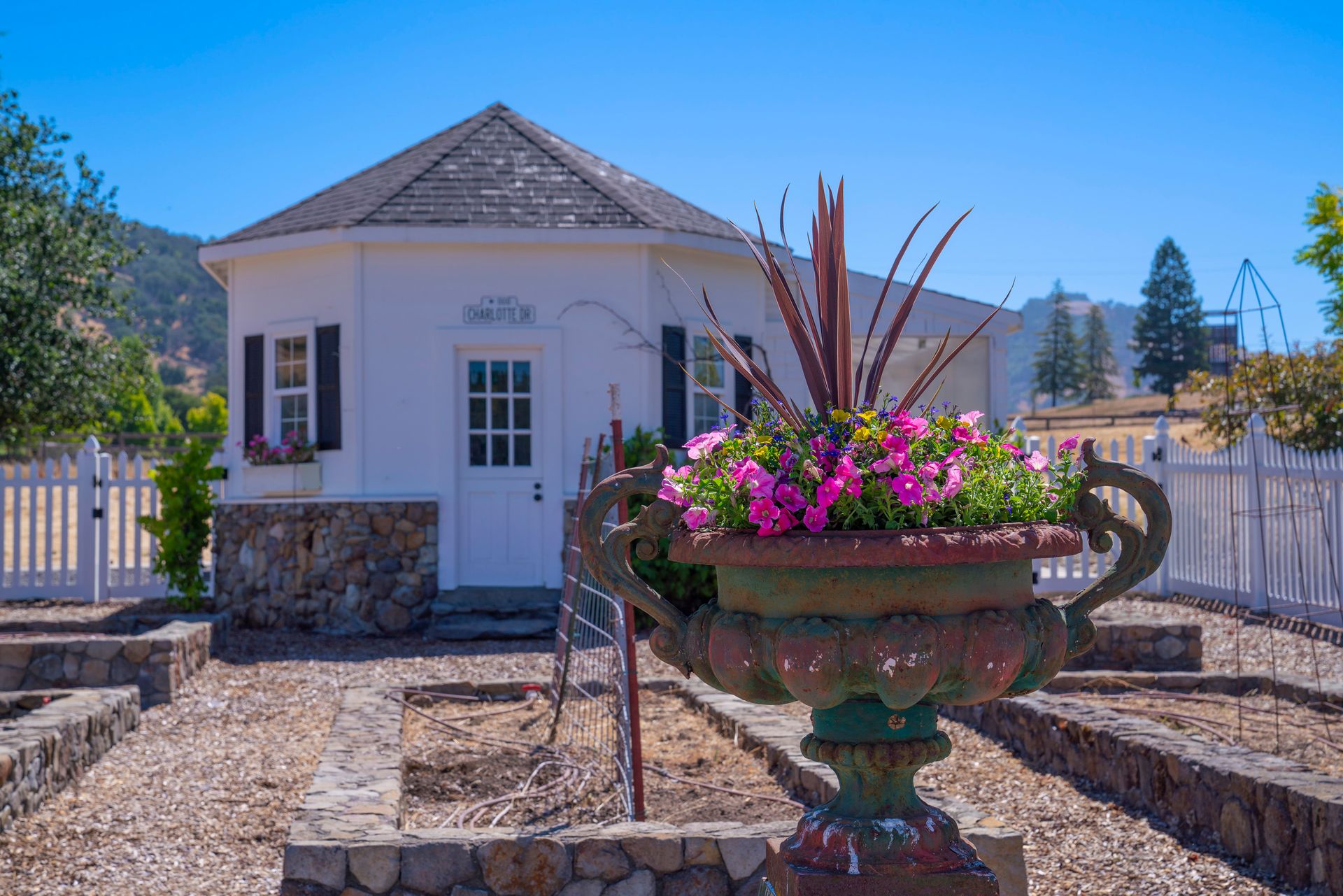 Beautiful 5-acre gated Wine Country estate property with a 1,200 square foot additional dwelling unit built in 2018 featuring 2 bedrooms, 2 full bathrooms, a fenced back yard, an attached 2-car garage, and a detached 2-car garage. An open floor plan great room boasts a vaulted ceiling, a gas fireplace, and French doors leading to the patio, extending the living area, and providing seamless indoor-outdoor flow. An open concept kitchen is highlighted by a center island and Silestone quartz counter tops. Prepare meals surrounded by beauty and functionality, as natural light pours in through the large windows, offering picturesque views of the surrounding hills and vineyards. Additional property features include a large inground pool with an expansive paver pool deck, built-in grill with granite countertops and sink, charming old-world potter’s shed and greenhouse, large-fenced garden area with raised stone garden beds, a French lavender garden with a stunning fountain, custom-designed chicken coop, large concrete firepit for special gatherings, and much more. Flat usable land with room for horses or vineyards offers endless possibilities while just minutes to town. This stunning Wine Country property is the opportunity to build the main house of your dreams, completing your resort-style estate.