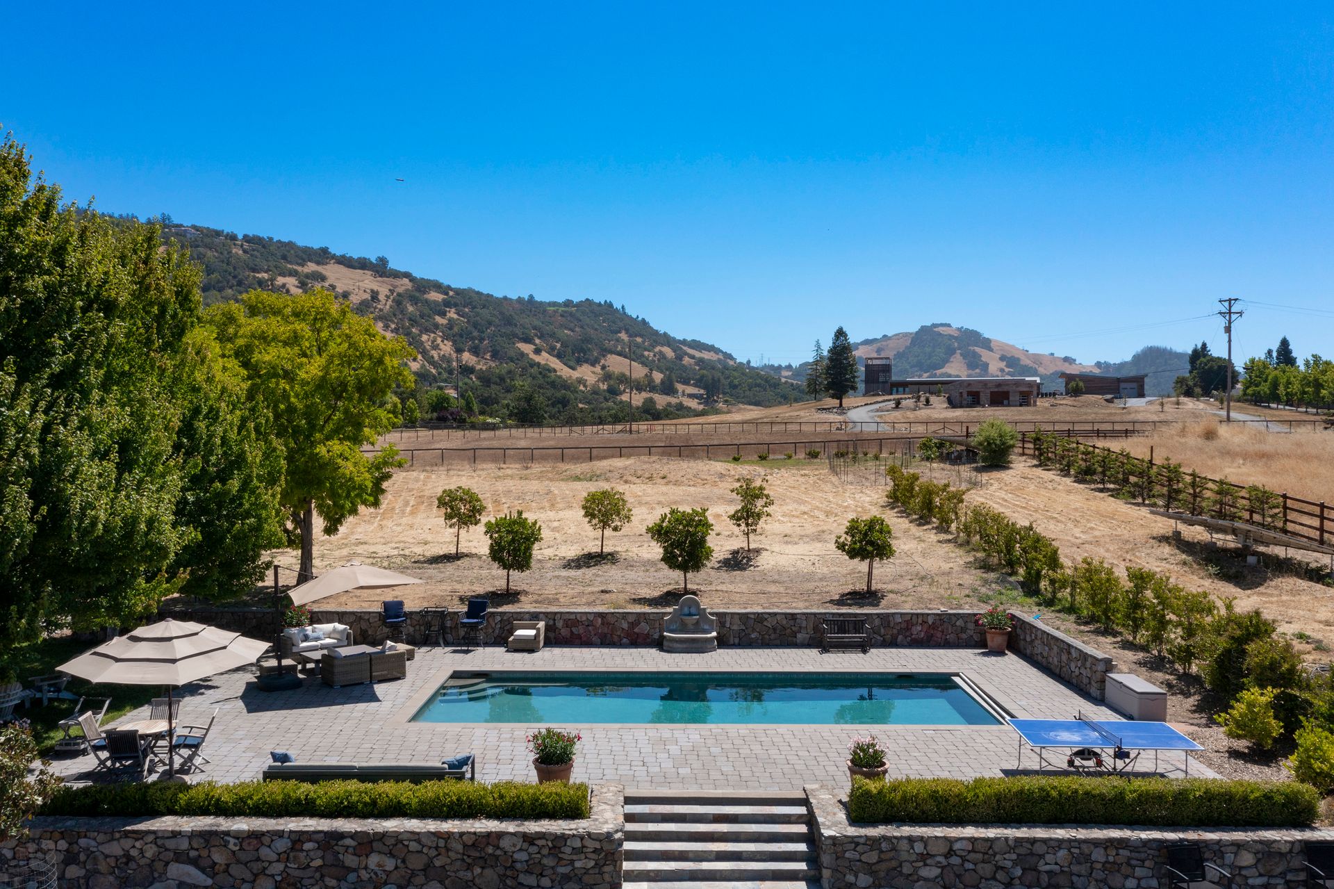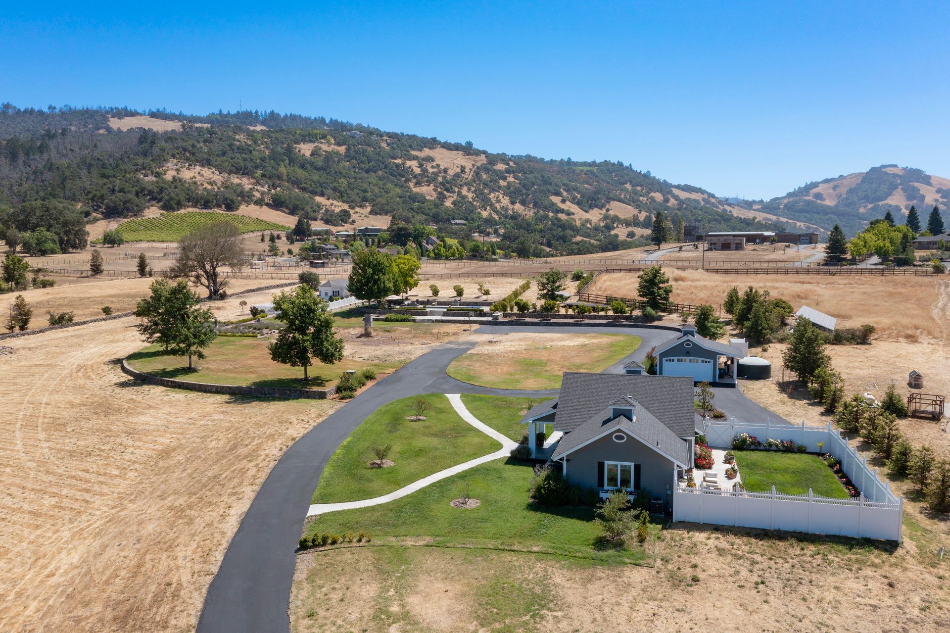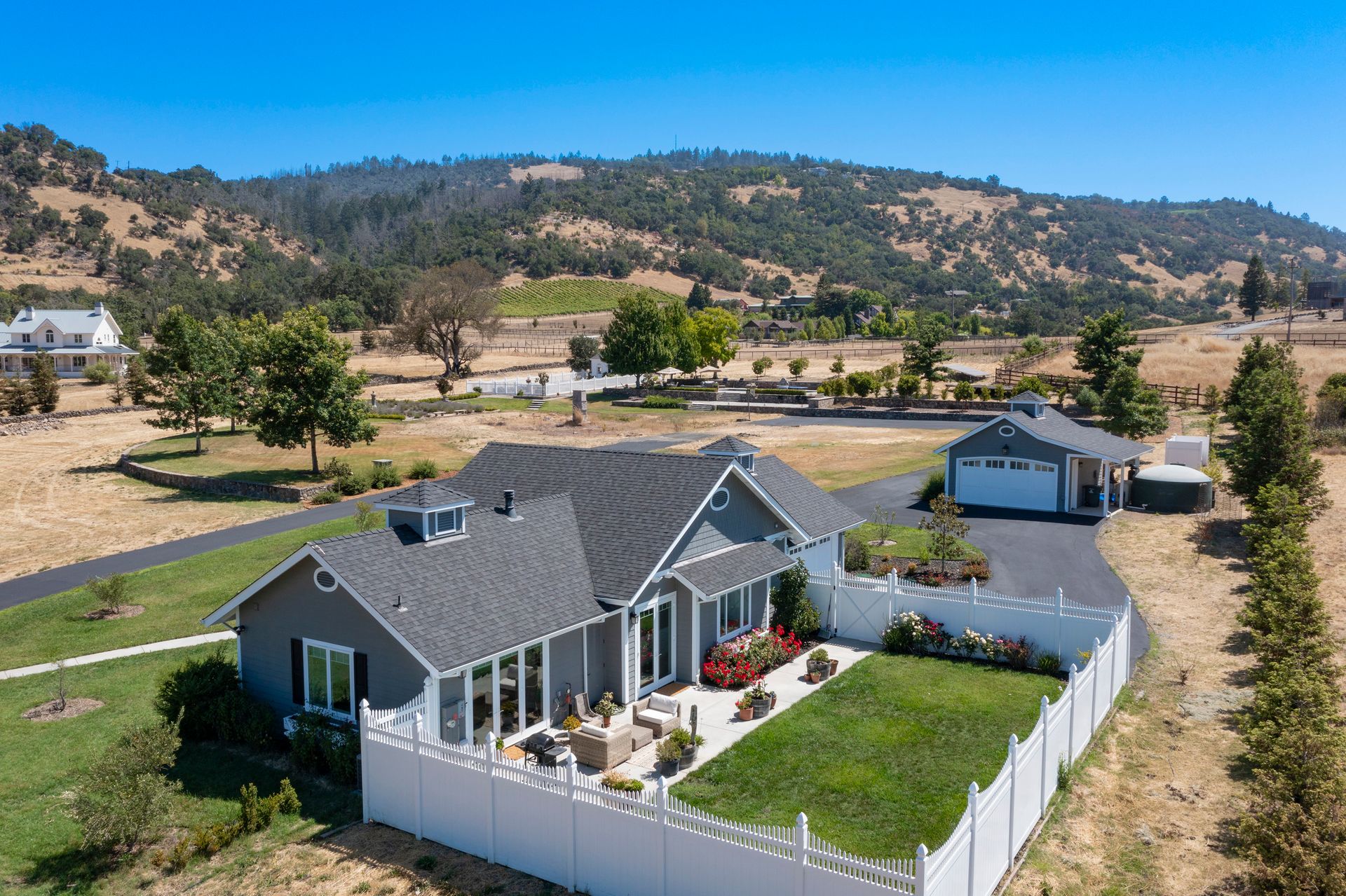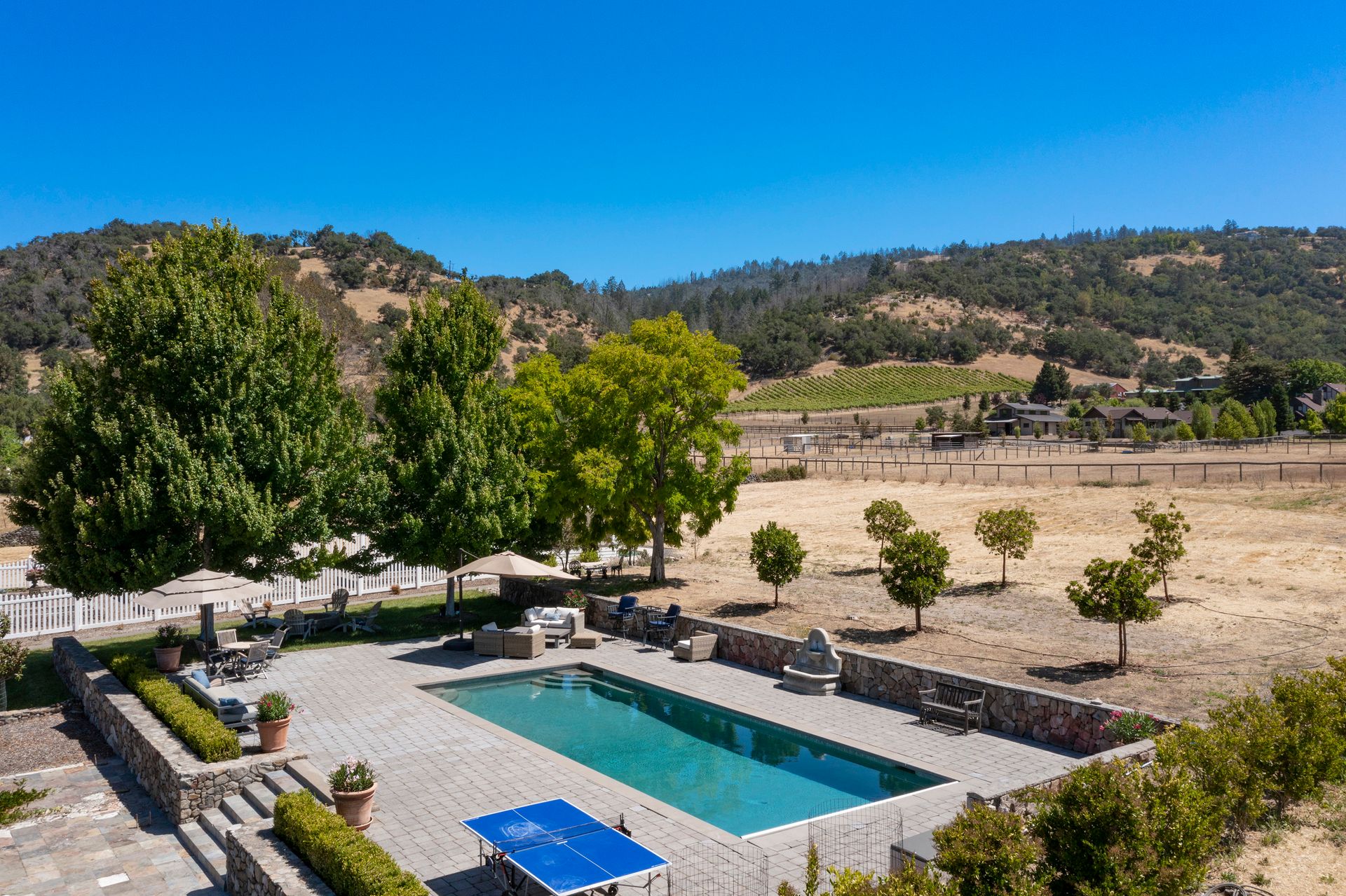 Beautiful 5-acre gated Wine Country estate property with a 1,200 square foot additional dwelling unit built in 2018 featuring 2 bedrooms, 2 full bathrooms, a fenced back yard, an attached 2-car garage, and a detached 2-car garage. An open floor plan great room boasts a vaulted ceiling, a gas fireplace, and French doors leading to the patio, extending the living area, and providing seamless indoor-outdoor flow. An open concept kitchen is highlighted by a center island and Silestone quartz counter tops. Prepare meals surrounded by beauty and functionality, as natural light pours in through the large windows, offering picturesque views of the surrounding hills and vineyards. Additional property features include a large inground pool with an expansive paver pool deck, built-in grill with granite countertops and sink, charming old-world potter’s shed and greenhouse, large-fenced garden area with raised stone garden beds, a French lavender garden with a stunning fountain, custom-designed chicken coop, large concrete firepit for special gatherings, and much more. Flat usable land with room for horses or vineyards offers endless possibilities while just minutes to town. This stunning Wine Country property is the opportunity to build the main house of your dreams, completing your resort-style estate.