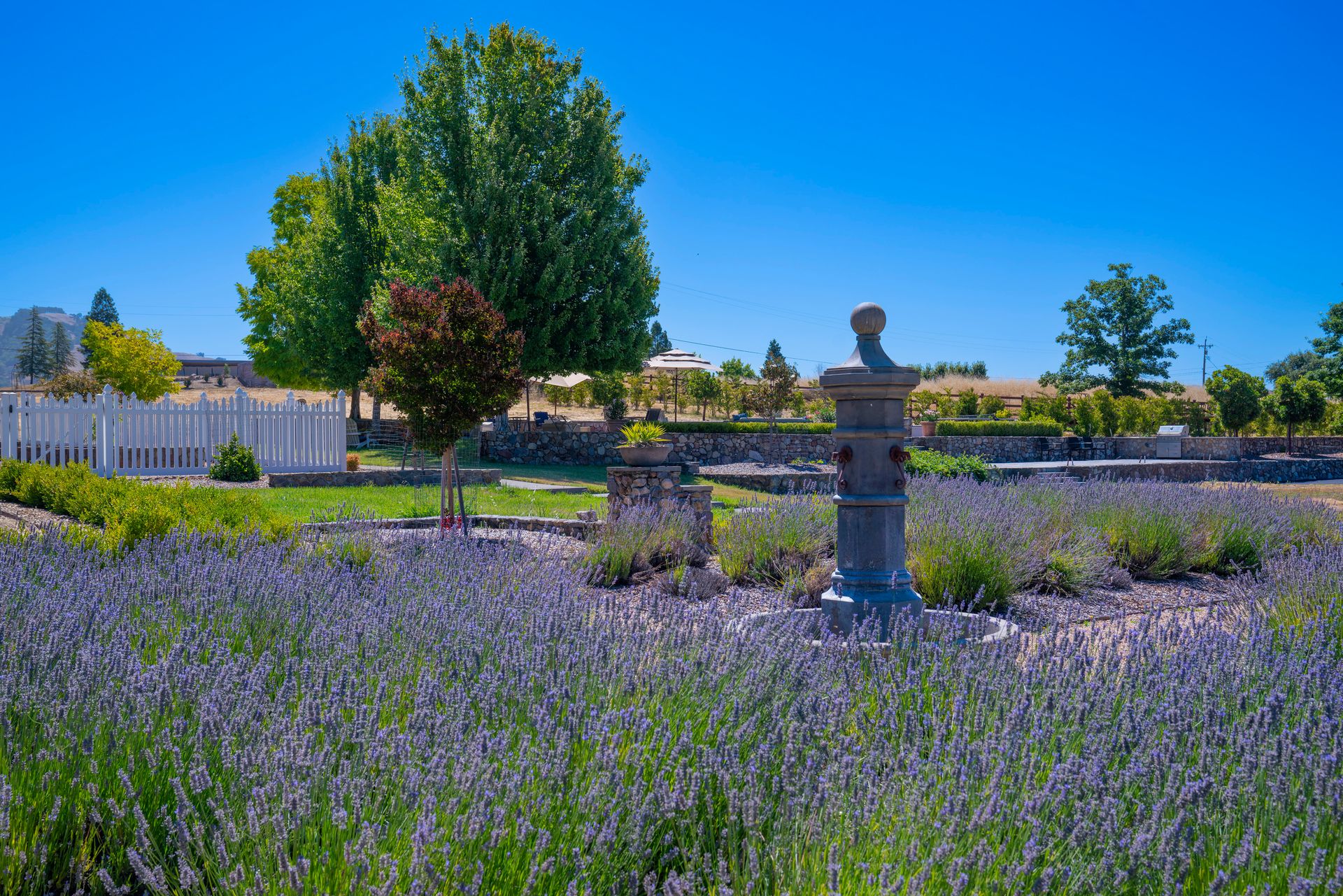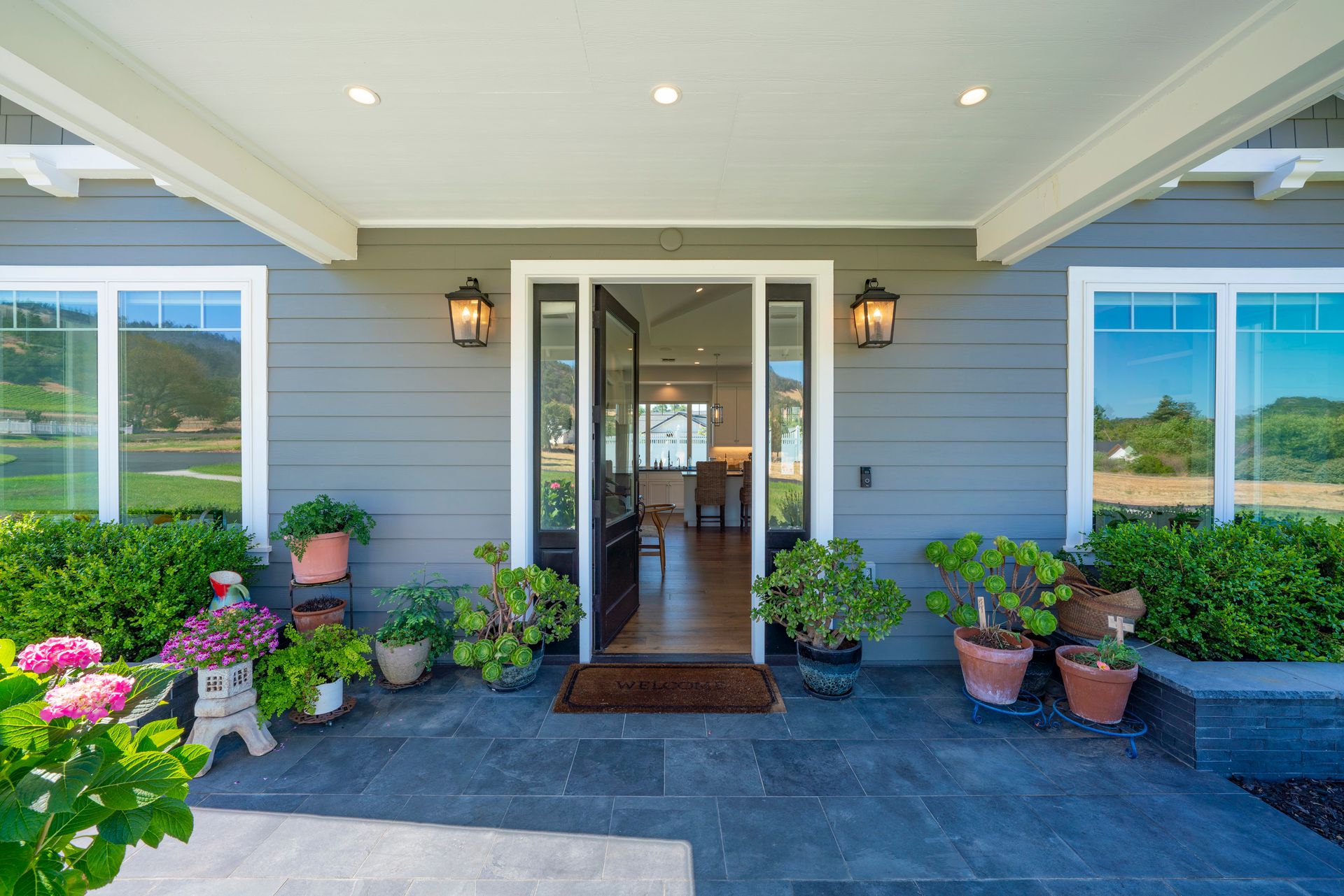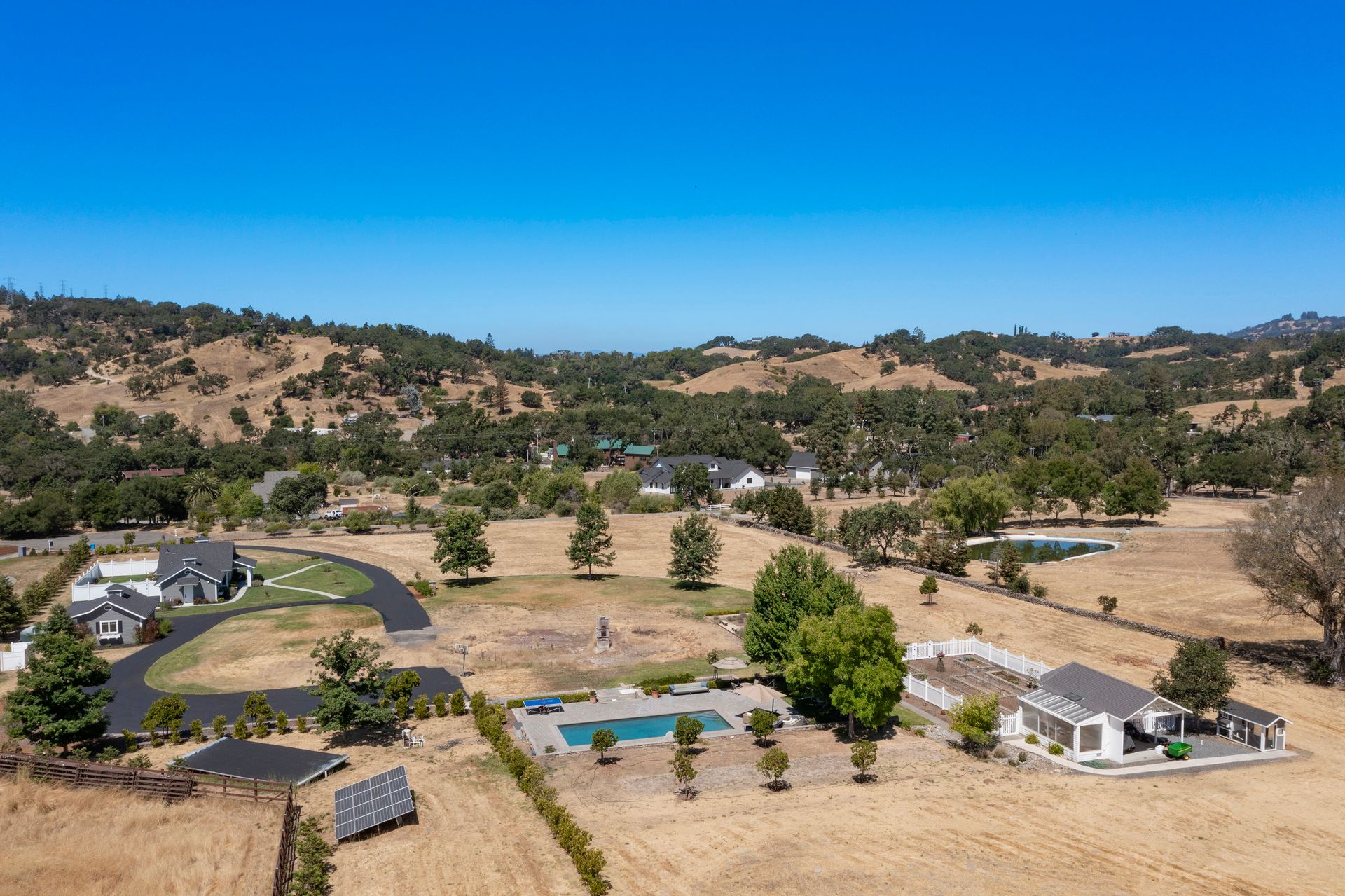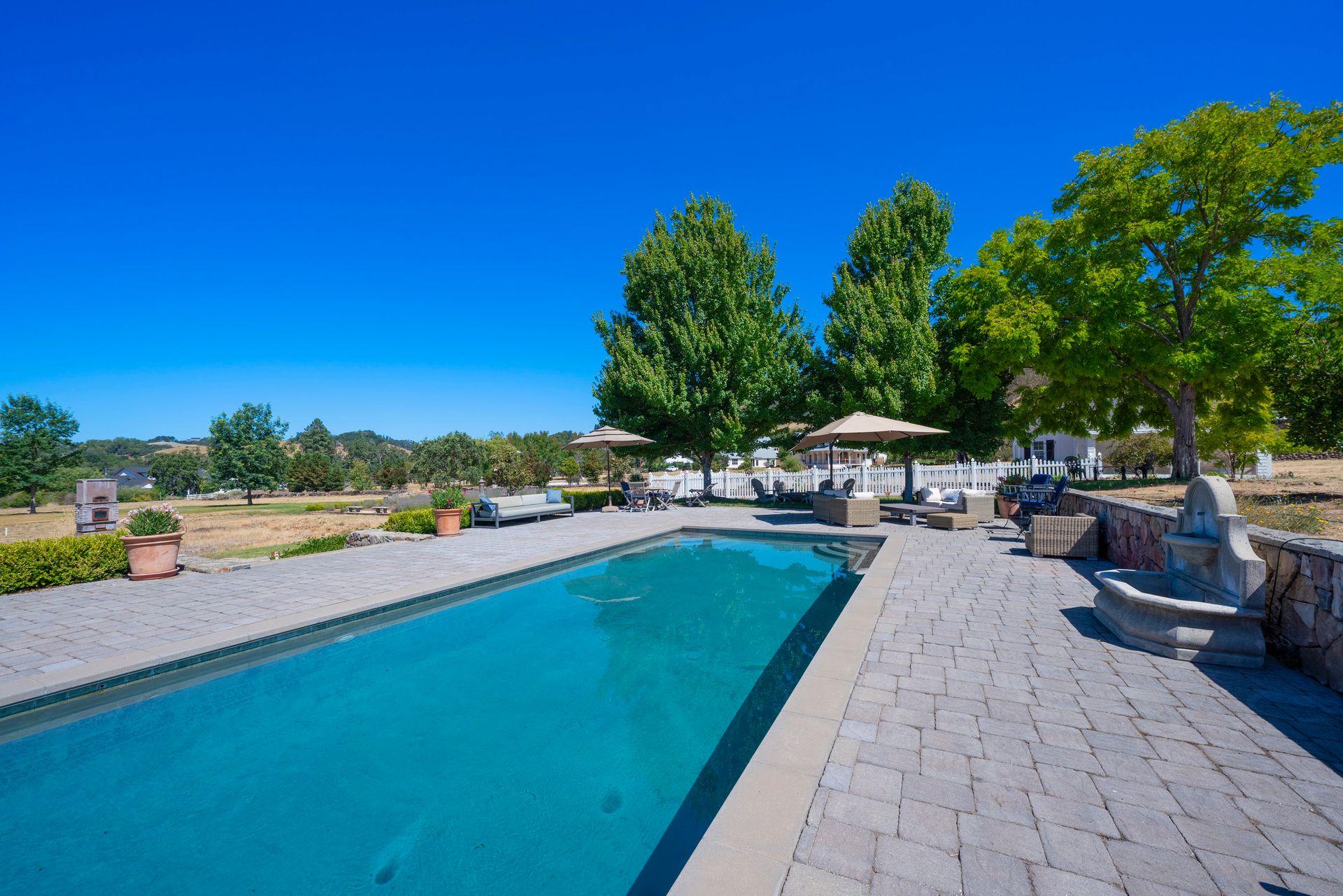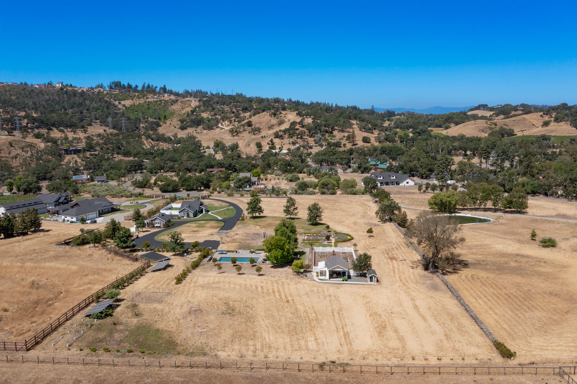 Beautiful 5-acre gated Wine Country estate property with a 1,200 square foot additional dwelling unit built in 2018 featuring 2 bedrooms, 2 full bathrooms, a fenced back yard, an attached 2-car garage, and a detached 2-car garage. An open floor plan great room boasts a vaulted ceiling, a gas fireplace, and French doors leading to the patio, extending the living area, and providing seamless indoor-outdoor flow. An open concept kitchen is highlighted by a center island and Silestone quartz counter tops. Prepare meals surrounded by beauty and functionality, as natural light pours in through the large windows, offering picturesque views of the surrounding hills and vineyards. Additional property features include a large inground pool with an expansive paver pool deck, built-in grill with granite countertops and sink, charming old-world potter’s shed and greenhouse, large-fenced garden area with raised stone garden beds, a French lavender garden with a stunning fountain, custom-designed chicken coop, large concrete firepit for special gatherings, and much more. Flat usable land with room for horses or vineyards offers endless possibilities while just minutes to town. This stunning Wine Country property is the opportunity to build the main house of your dreams, completing your resort-style estate.
