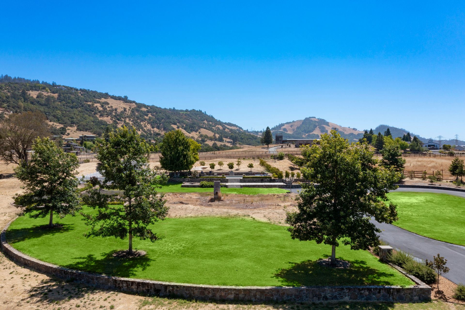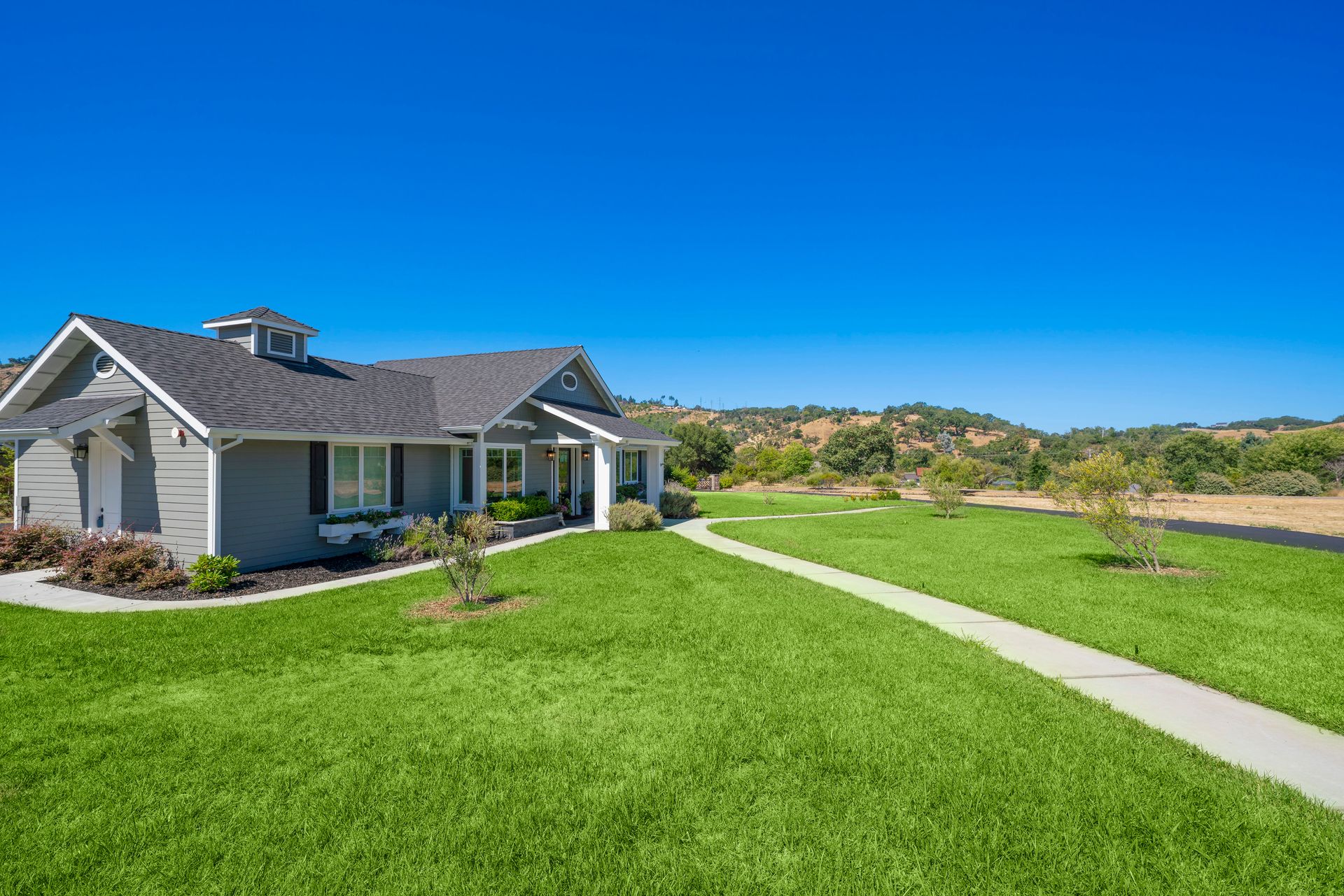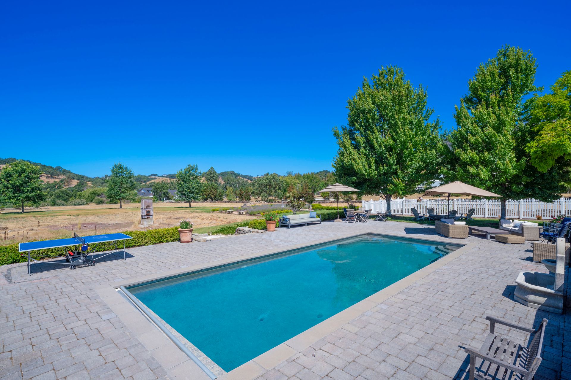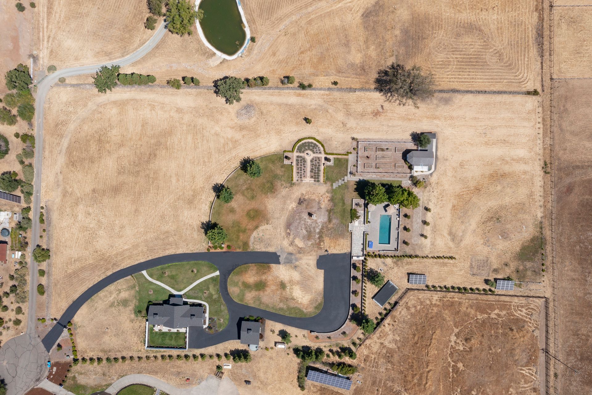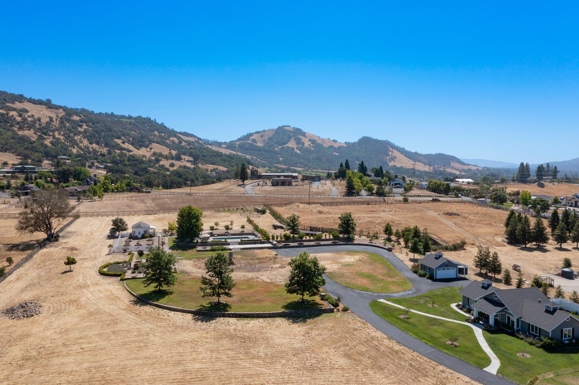 Beautiful 5-acre gated Wine Country estate property with a 1,200 square foot additional dwelling unit built in 2018 featuring 2 bedrooms, 2 full bathrooms, a fenced back yard, an attached 2-car garage, and a detached 2-car garage. An open floor plan great room boasts a vaulted ceiling, a gas fireplace, and French doors leading to the patio, extending the living area, and providing seamless indoor-outdoor flow. An open concept kitchen is highlighted by a center island and Silestone quartz counter tops. Prepare meals surrounded by beauty and functionality, as natural light pours in through the large windows, offering picturesque views of the surrounding hills and vineyards. Additional property features include a large inground pool with an expansive paver pool deck, built-in grill with granite countertops and sink, charming old-world potter’s shed and greenhouse, large-fenced garden area with raised stone garden beds, a French lavender garden with a stunning fountain, custom-designed chicken coop, large concrete firepit for special gatherings, and much more. Flat usable land with room for horses or vineyards offers endless possibilities while just minutes to town. This stunning Wine Country property is the opportunity to build the main house of your dreams, completing your resort-style estate.
