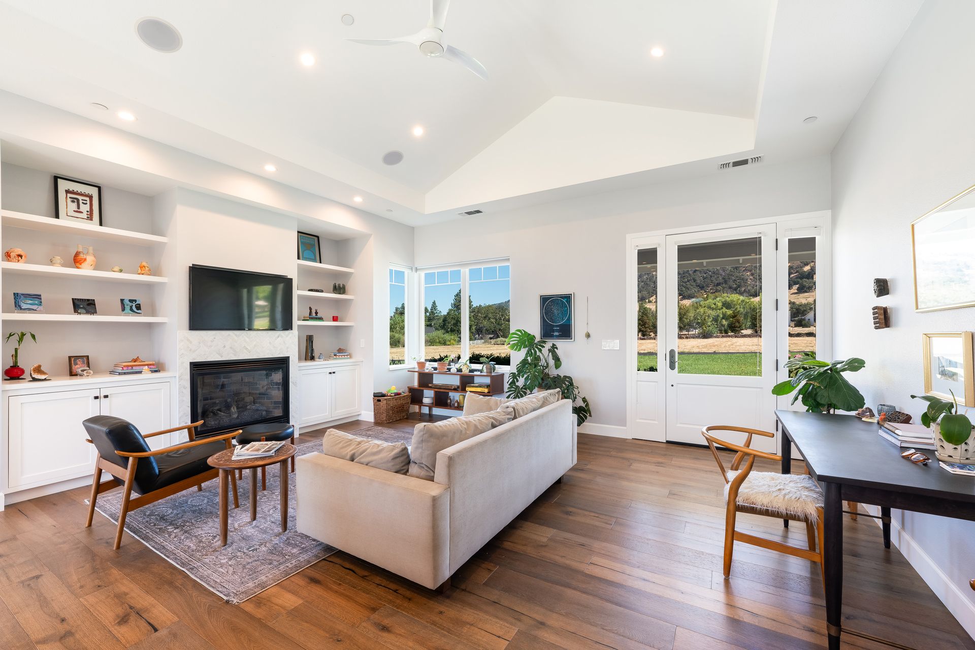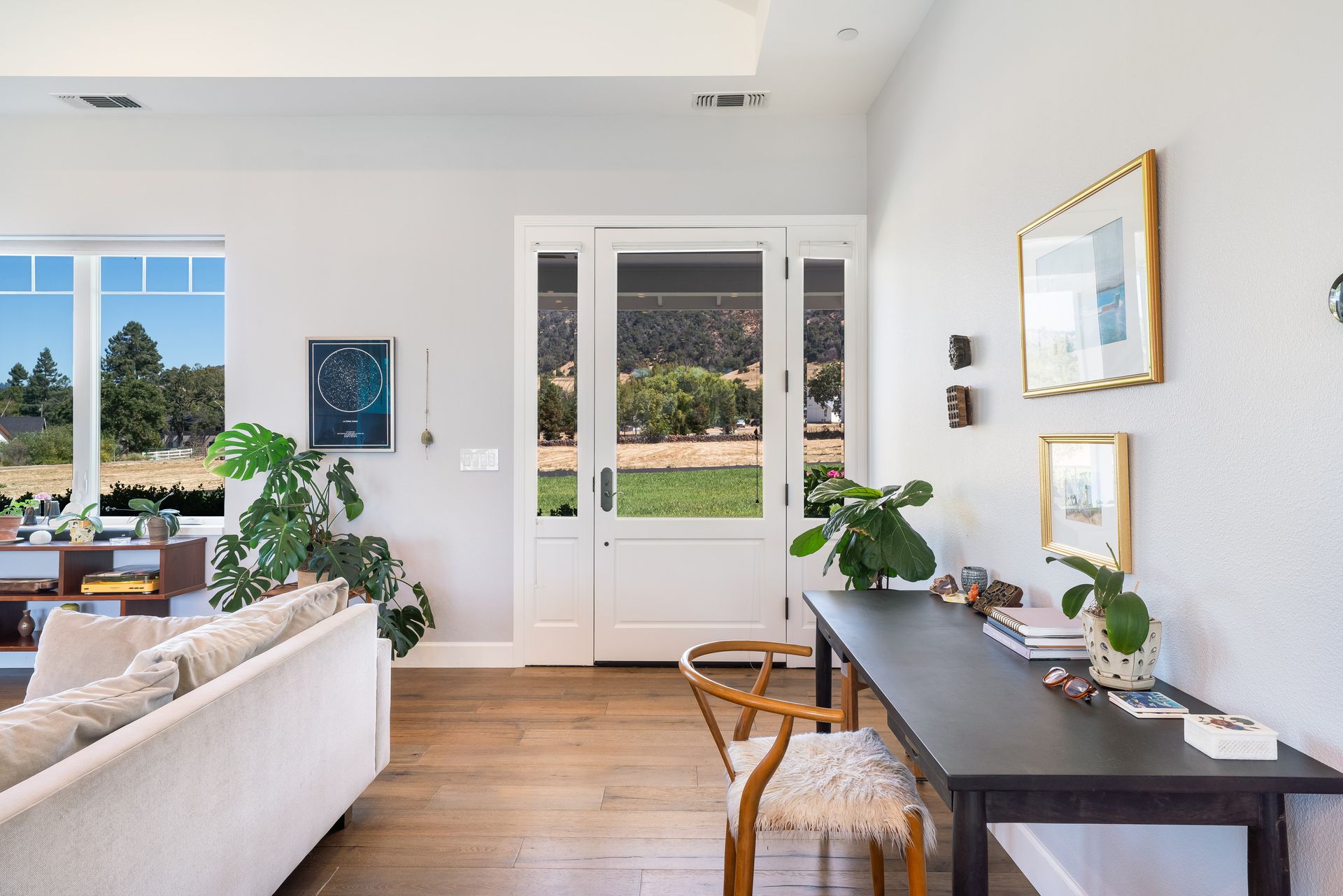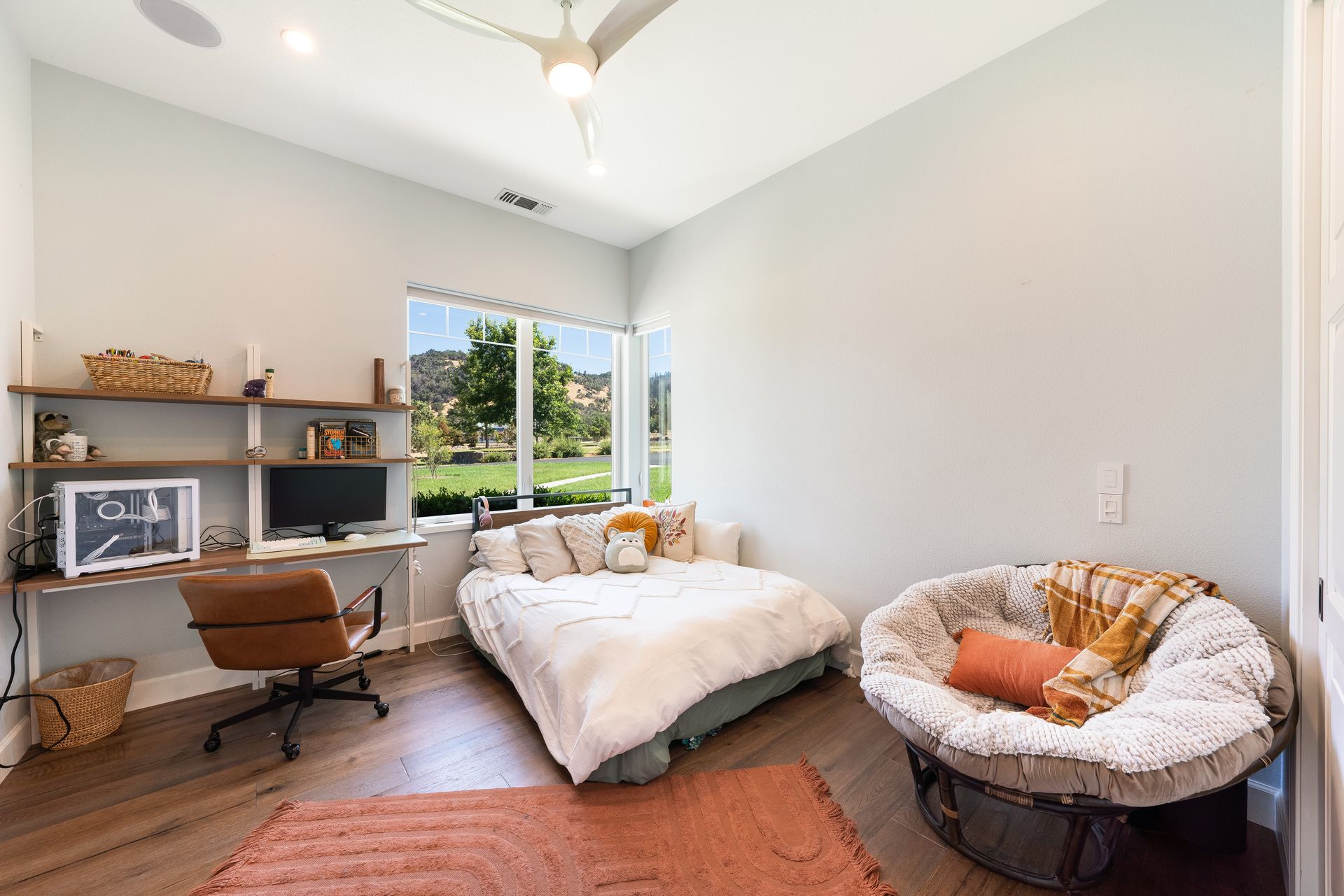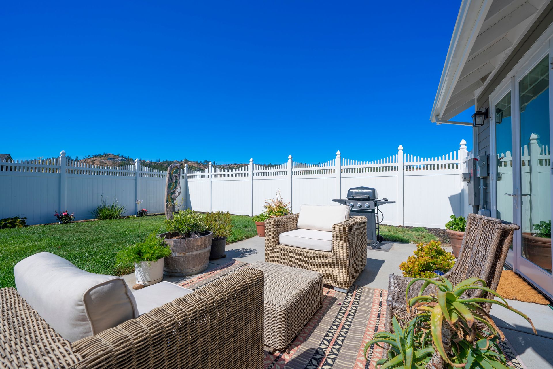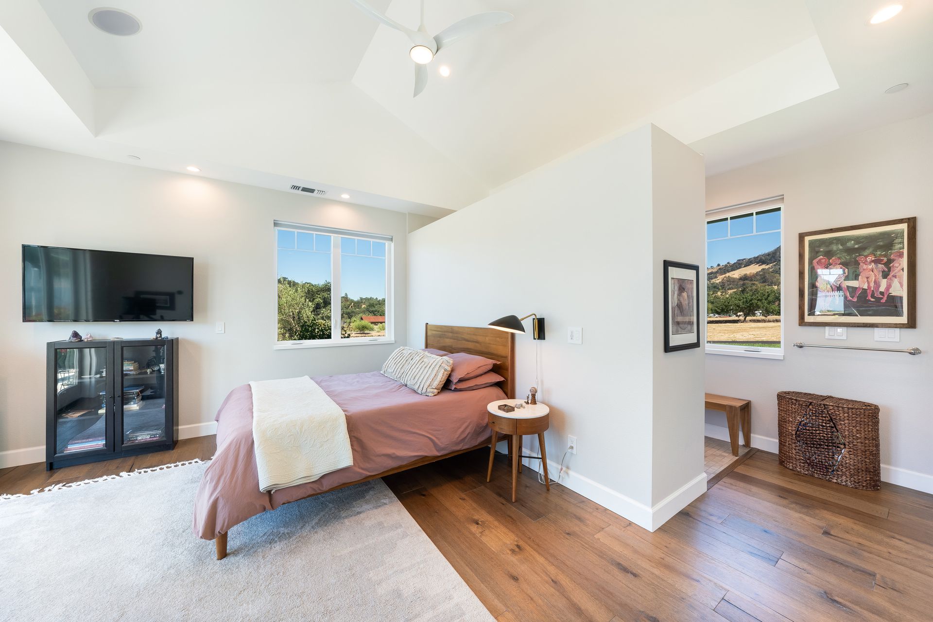Beautiful 5-acre gated Wine Country estate property with a 1,200 square foot additional dwelling unit built in 2018 featuring 2 bedrooms, 2 full bathrooms, a fenced back yard, an attached 2-car garage, and a detached 2-car garage. An open floor plan great room boasts a vaulted ceiling, a gas fireplace, and French doors leading to the patio, extending the living area, and providing seamless indoor-outdoor flow. An open concept kitchen is highlighted by a center island and Silestone quartz counter tops. Prepare meals surrounded by beauty and functionality, as natural light pours in through the large windows, offering picturesque views of the surrounding hills and vineyards. Additional property features include a large inground pool with an expansive paver pool deck, built-in grill with granite countertops and sink, charming old-world potter’s shed and greenhouse, large-fenced garden area with raised stone garden beds, a French lavender garden with a stunning fountain, custom-designed chicken coop, large concrete firepit for special gatherings, and much more. Flat usable land with room for horses or vineyards offers endless possibilities while just minutes to town. This stunning Wine Country property is the opportunity to build the main house of your dreams, completing your resort-style estate.