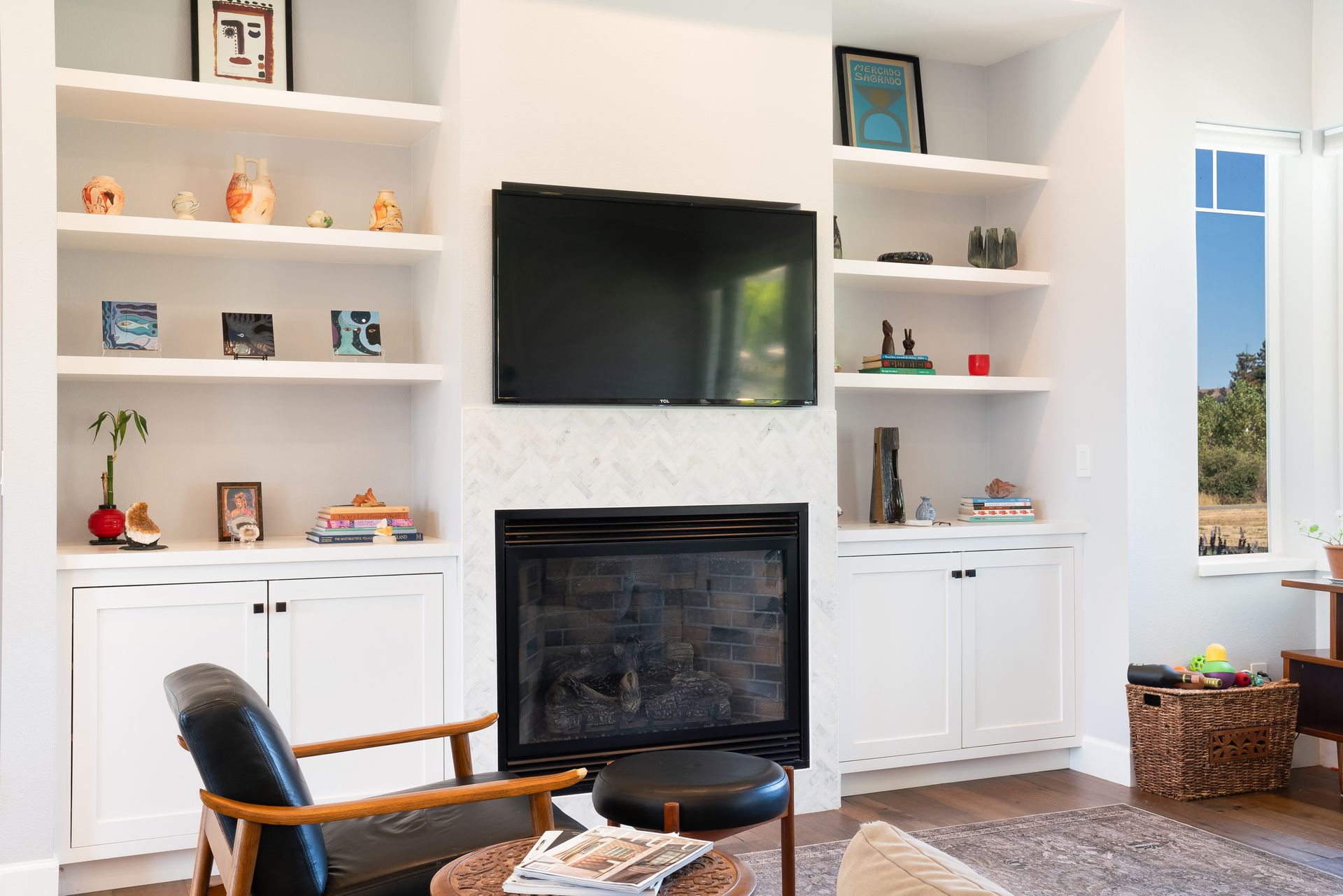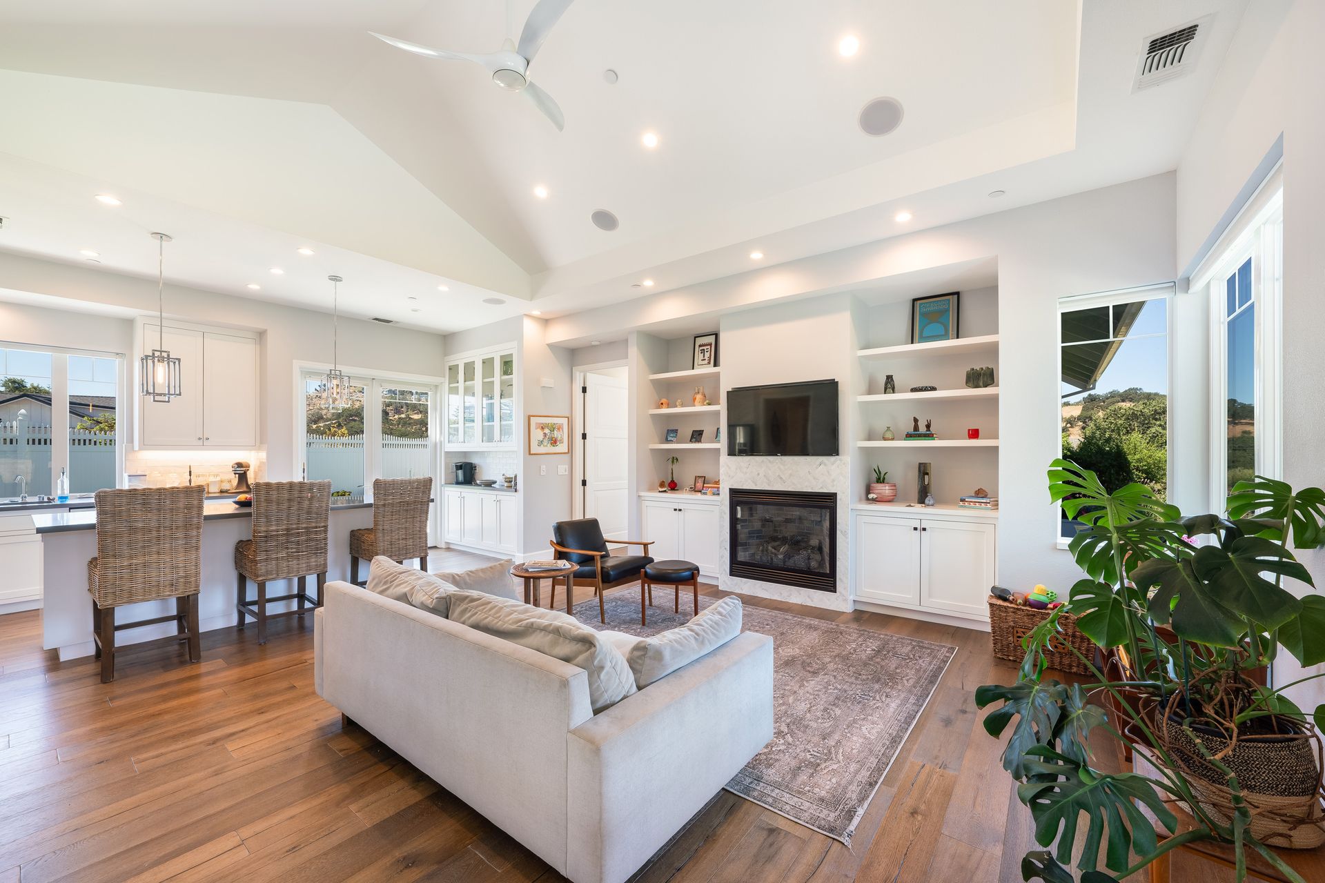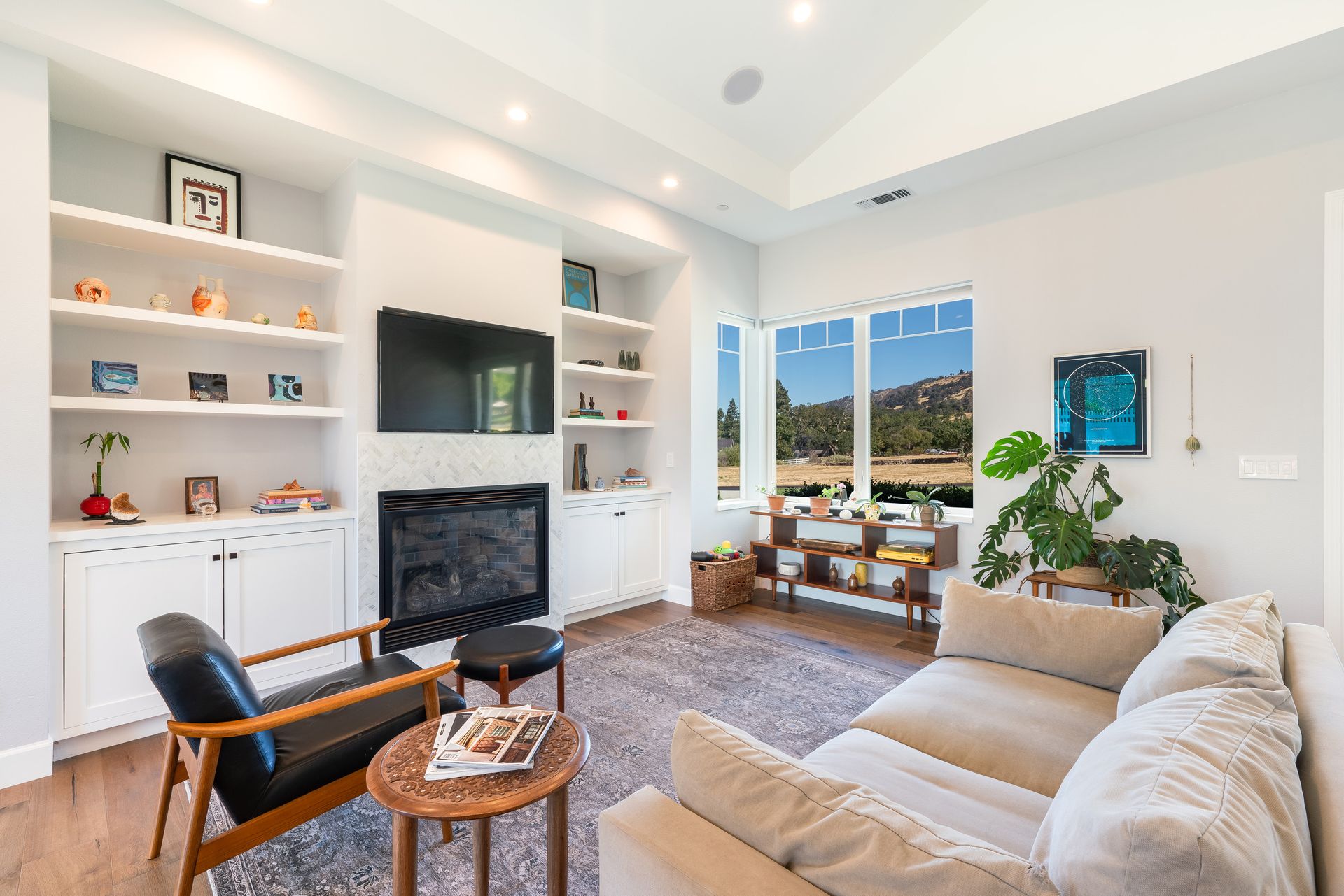 Great room with vaulted ceiling, gas fireplace with blower and Calcutta marble tile, and built-in shelving