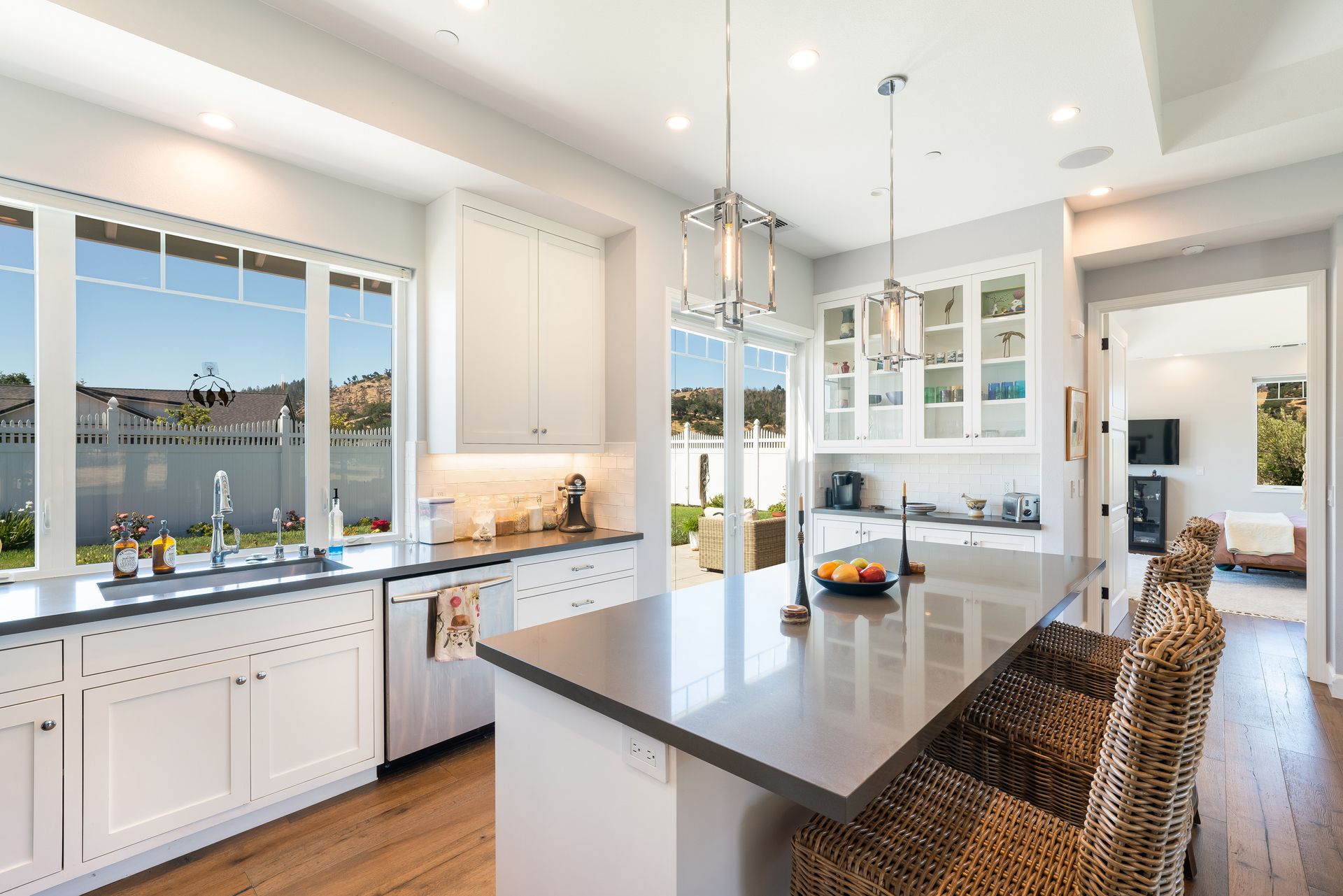 Kitchen features glass front cabinets, soft close drawers, gas range with griddle, refrigerator with filtered water and ice dispenser, microwave, dishwasher, oversized sink with filtered-water dispenser