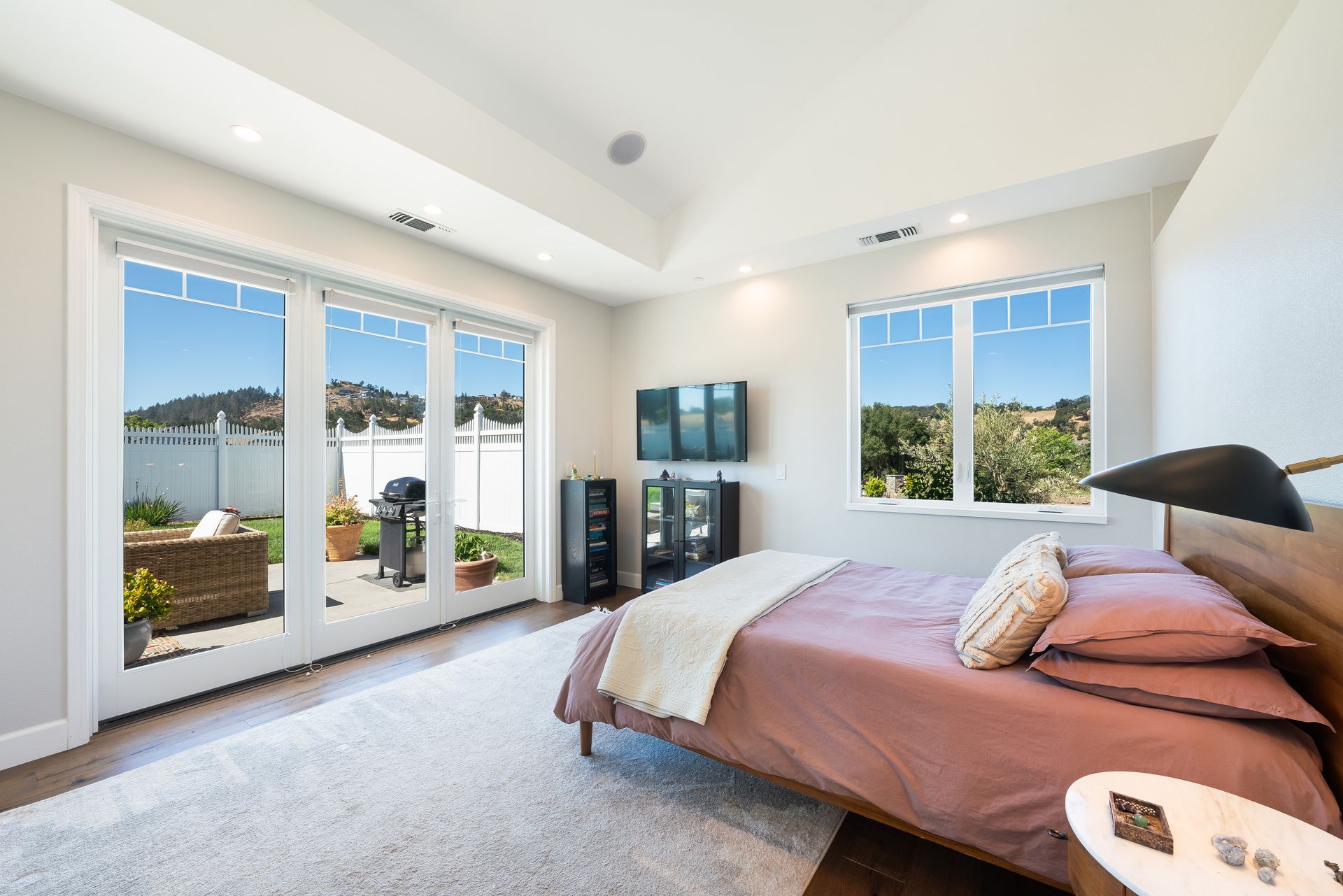 Primary suite with vaulted ceiling and ceiling fan, French doors to patio