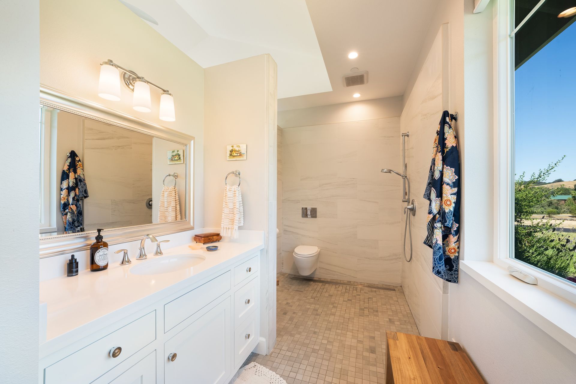 Primary ensuite bathroom with accessible toilet and roll-in shower