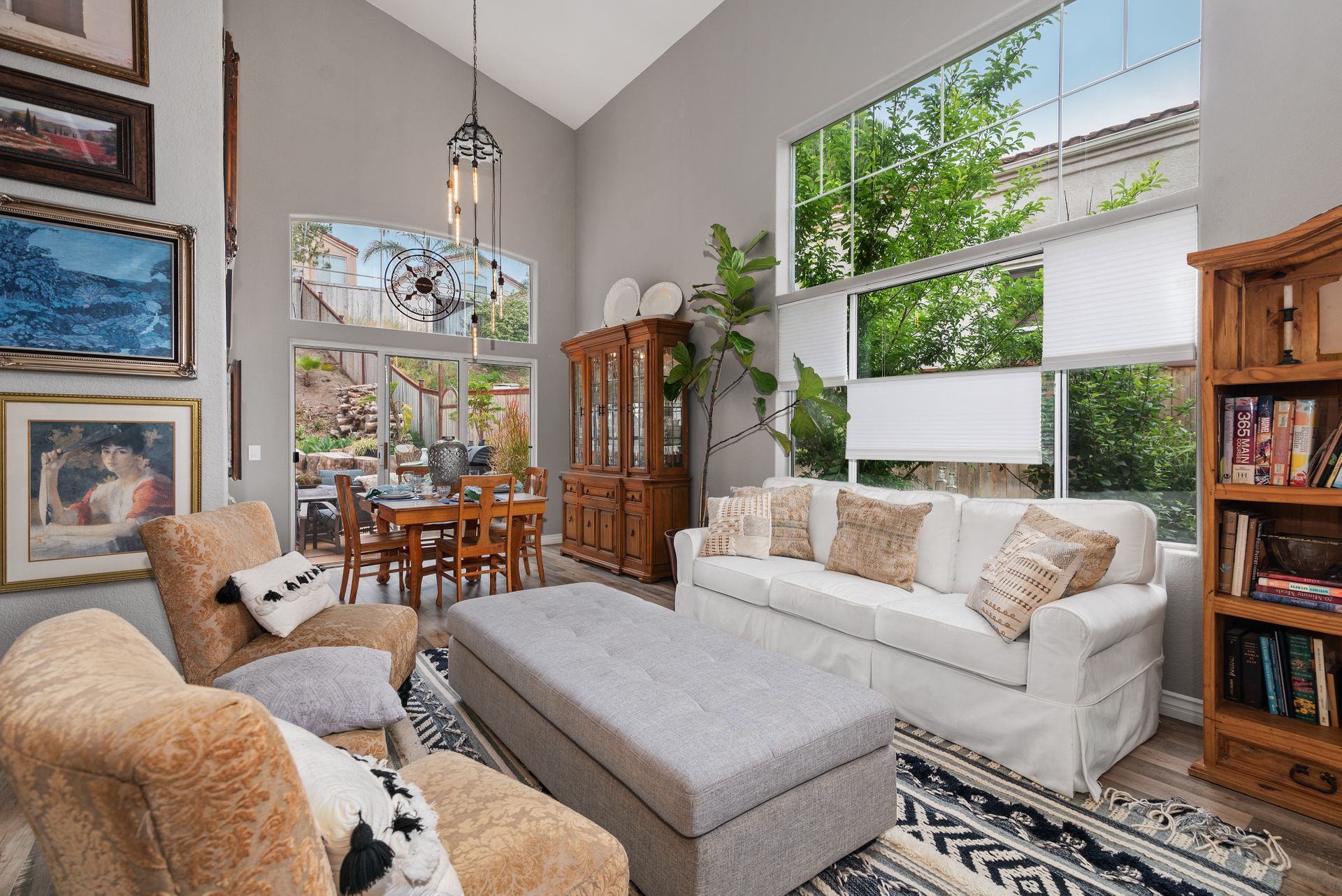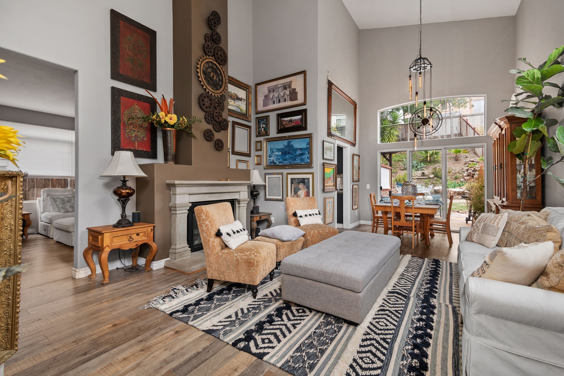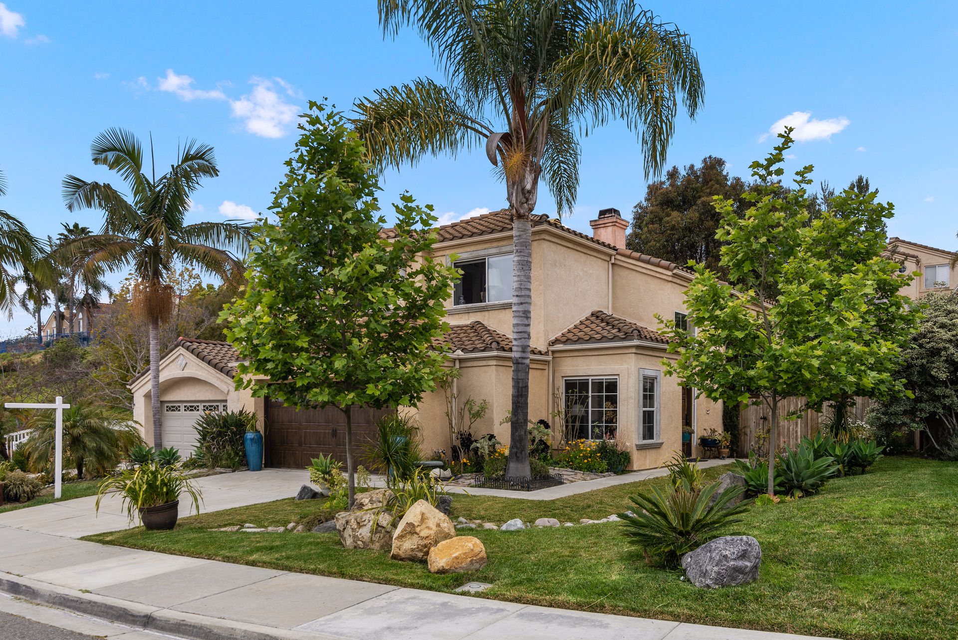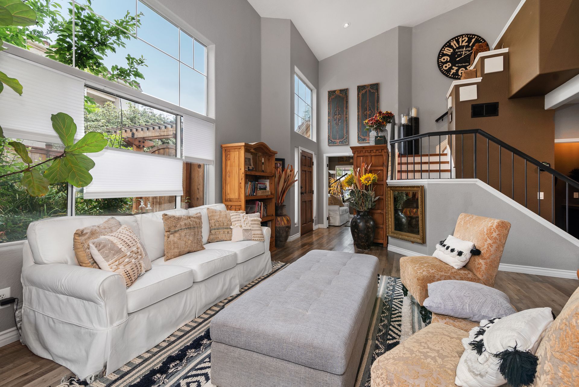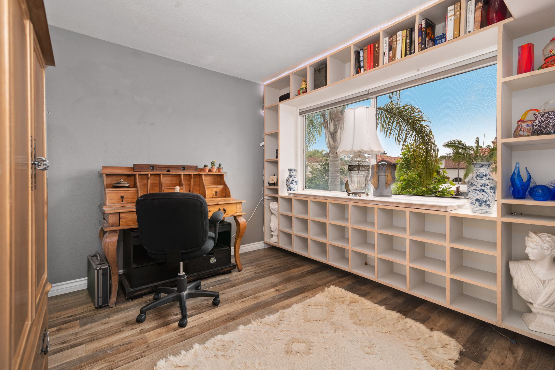 The first things you notice as you enter this home are the soaring high ceilings and light from all of the windows, giving the space a very light and airy feel. There is a two-sided fireplace that services both the formal living area as well as the den for those cozy winter evenings. The circular layout of the downstairs creates a wonderful open space for entertaining. There is a room off of the foyer that could function as an office space, art studio, etc. The kitchen has a large breakfast room off of it as well as a formal dining room on the other side. On the upper level of the home are three bedrooms. There is a lovely hall bath for the secondary rooms just off the large walkway that overlooks the living area. The large primary suite is really special with some very unique features. It has gorgeous Polynesian panels made into closet barn doors, a custom-made closet organizer in the large walk-in closet, complete with a coffee/breakfast station, a wonderful bench seat overlooking the backyard with extra storage inside, and a custom floating desk, all designed and constructed by the homeowner. The en-suite bathroom features a garden tub and walk-in shower along with double sinks. When you access the backyard through the sliding doors downstairs, there is a screened hot tub just outside the door with multiple patio spaces for seating. The yard itself is private with a terraced hill to the back. There is also a lovely custom archway near the front door, that leads into the backyard area. There, you will find numerous fruit trees including apricot, cherry, Fuji apple, plum, lemon, and olive trees. There are also raised beds for growing vegetables. This home is located in the Rancho Del Oro area of Oceanside, midway between the 76 and the 78 freeways and about 10 minutes from the lively downtown area, with the pier, breweries, restaurants, etc. It is zoned for Ivey Ranch Schools and the neighborhood has multiple playgrounds. Come by and see this unique home!