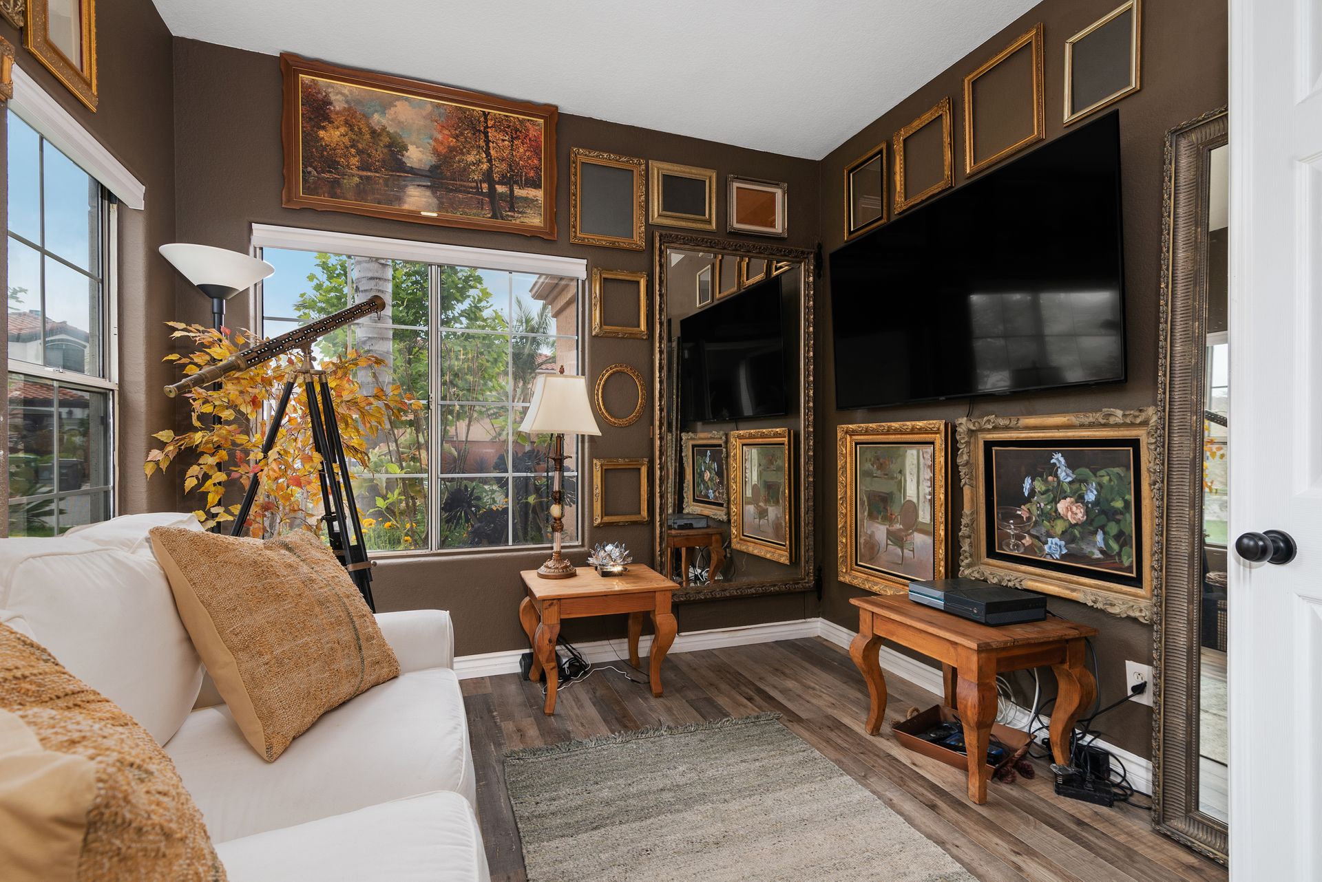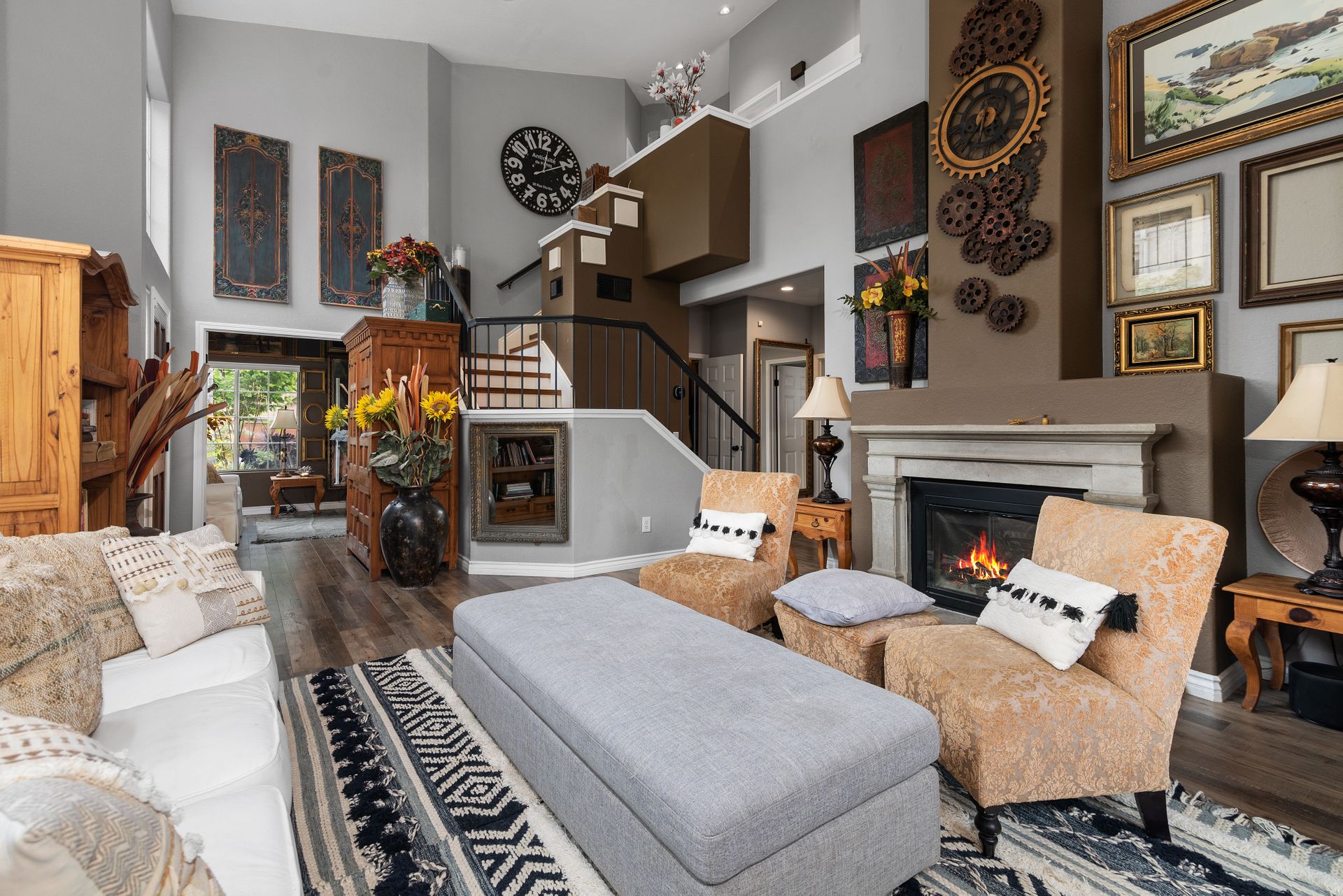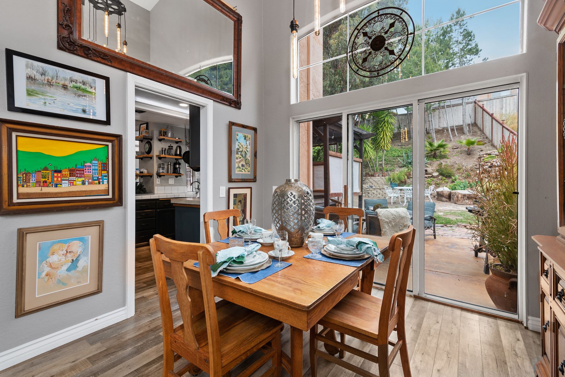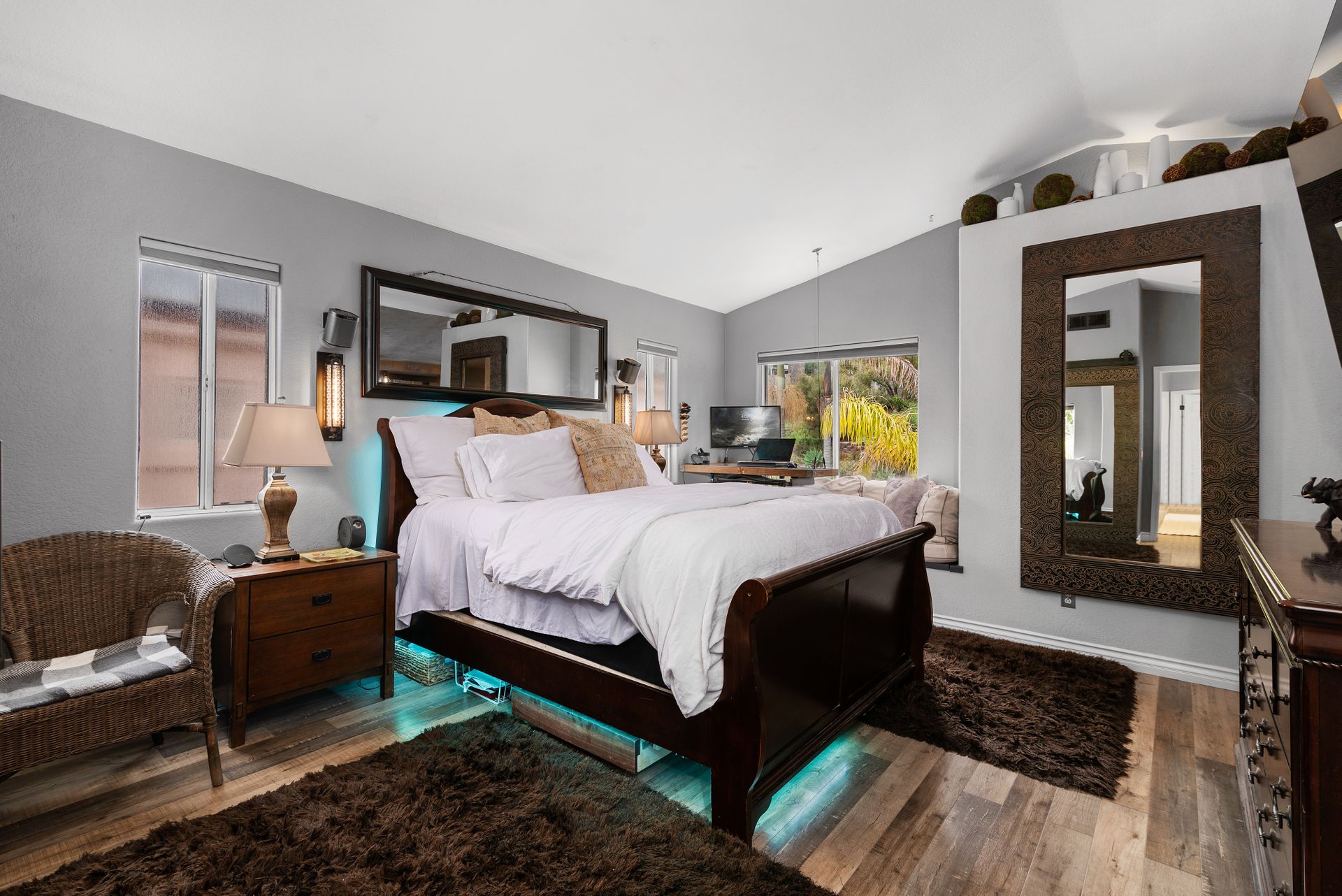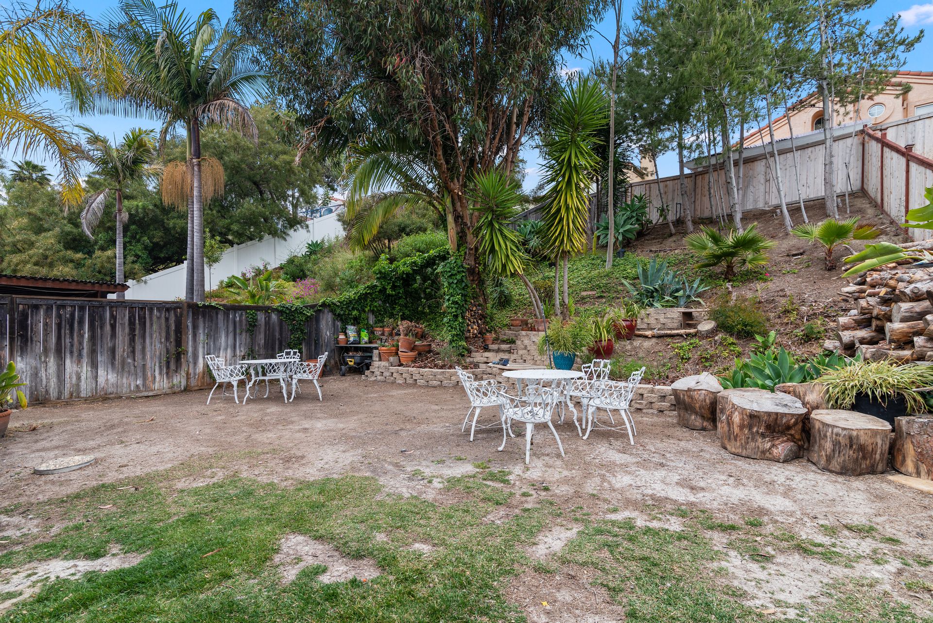 The first things you notice as you enter this home are the soaring high ceilings and light from all of the windows, giving the space a very light and airy feel. There is a two-sided fireplace that services both the formal living area as well as the den for those cozy winter evenings. The circular layout of the downstairs creates a wonderful open space for entertaining. There is a room off of the foyer that could function as an office space, art studio, etc. The kitchen has a large breakfast room off of it as well as a formal dining room on the other side. On the upper level of the home are three bedrooms. There is a lovely hall bath for the secondary rooms just off the large walkway that overlooks the living area. The large primary suite is really special with some very unique features. It has gorgeous Polynesian panels made into closet barn doors, a custom-made closet organizer in the large walk-in closet, complete with a coffee/breakfast station, a wonderful bench seat overlooking the backyard with extra storage inside, and a custom floating desk, all designed and constructed by the homeowner. The en-suite bathroom features a garden tub and walk-in shower along with double sinks. When you access the backyard through the sliding doors downstairs, there is a screened hot tub just outside the door with multiple patio spaces for seating. The yard itself is private with a terraced hill to the back. There is also a lovely custom archway near the front door, that leads into the backyard area. There, you will find numerous fruit trees including apricot, cherry, Fuji apple, plum, lemon, and olive trees. There are also raised beds for growing vegetables. This home is located in the Rancho Del Oro area of Oceanside, midway between the 76 and the 78 freeways and about 10 minutes from the lively downtown area, with the pier, breweries, restaurants, etc. It is zoned for Ivey Ranch Schools and the neighborhood has multiple playgrounds. Come by and see this unique home!