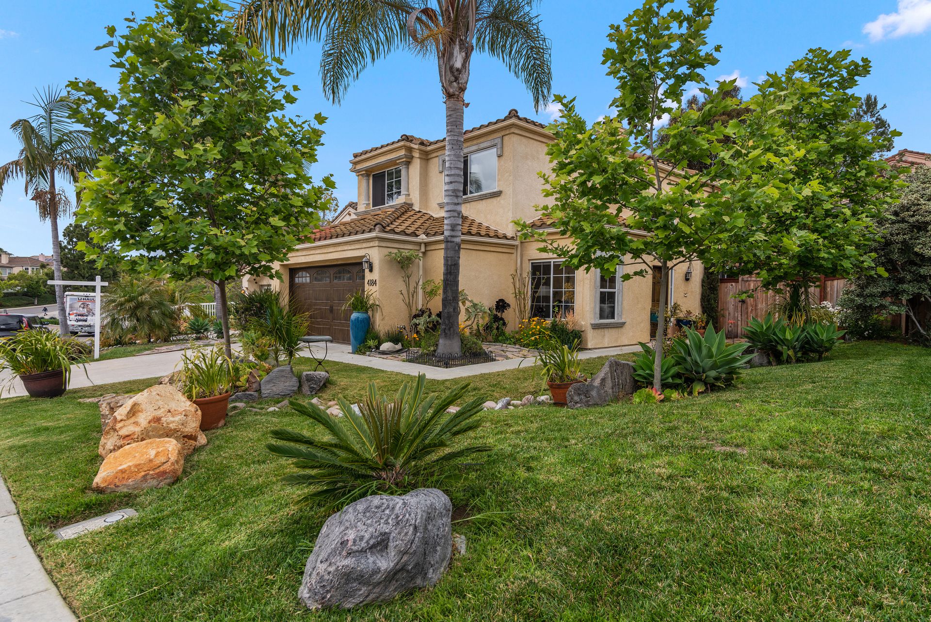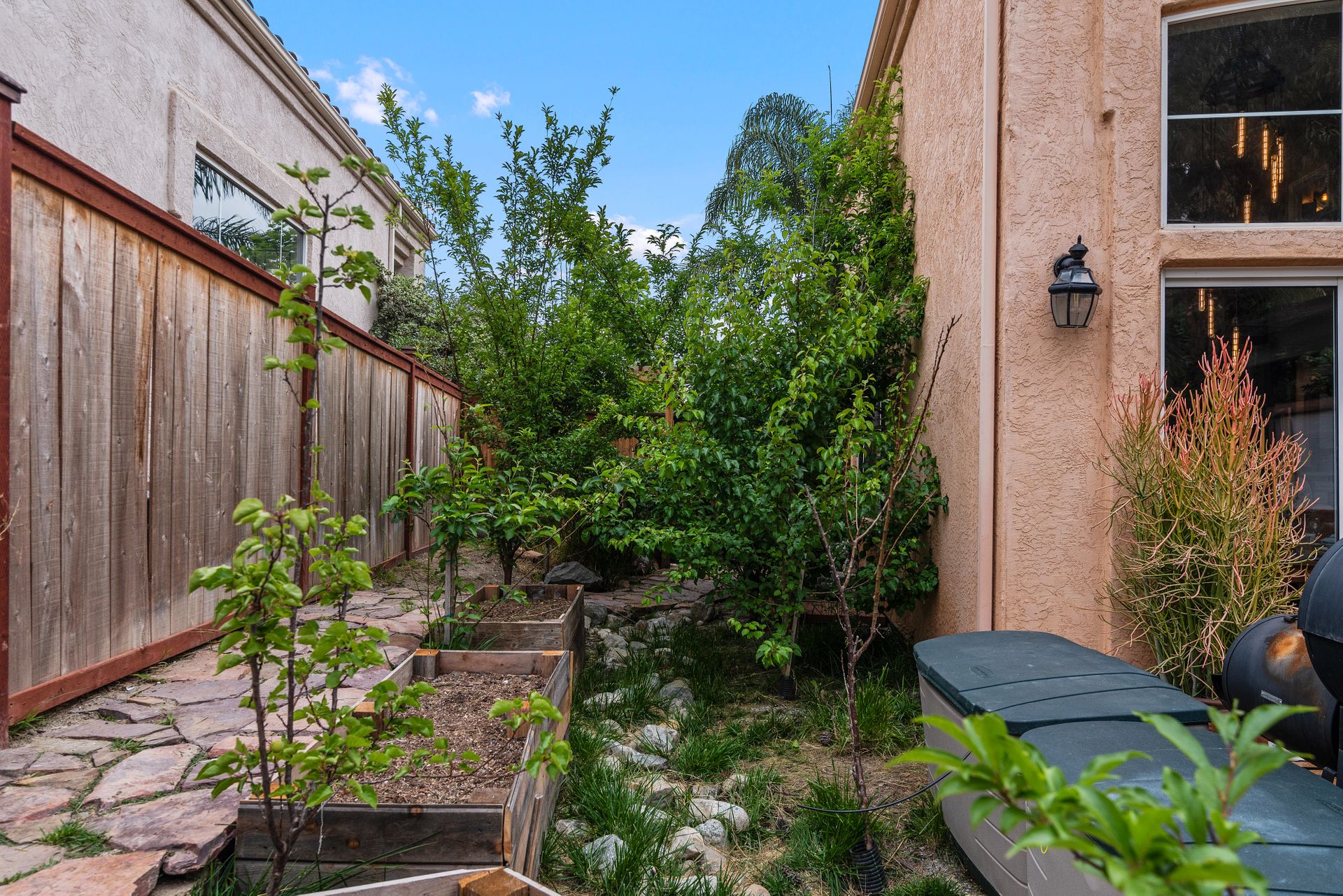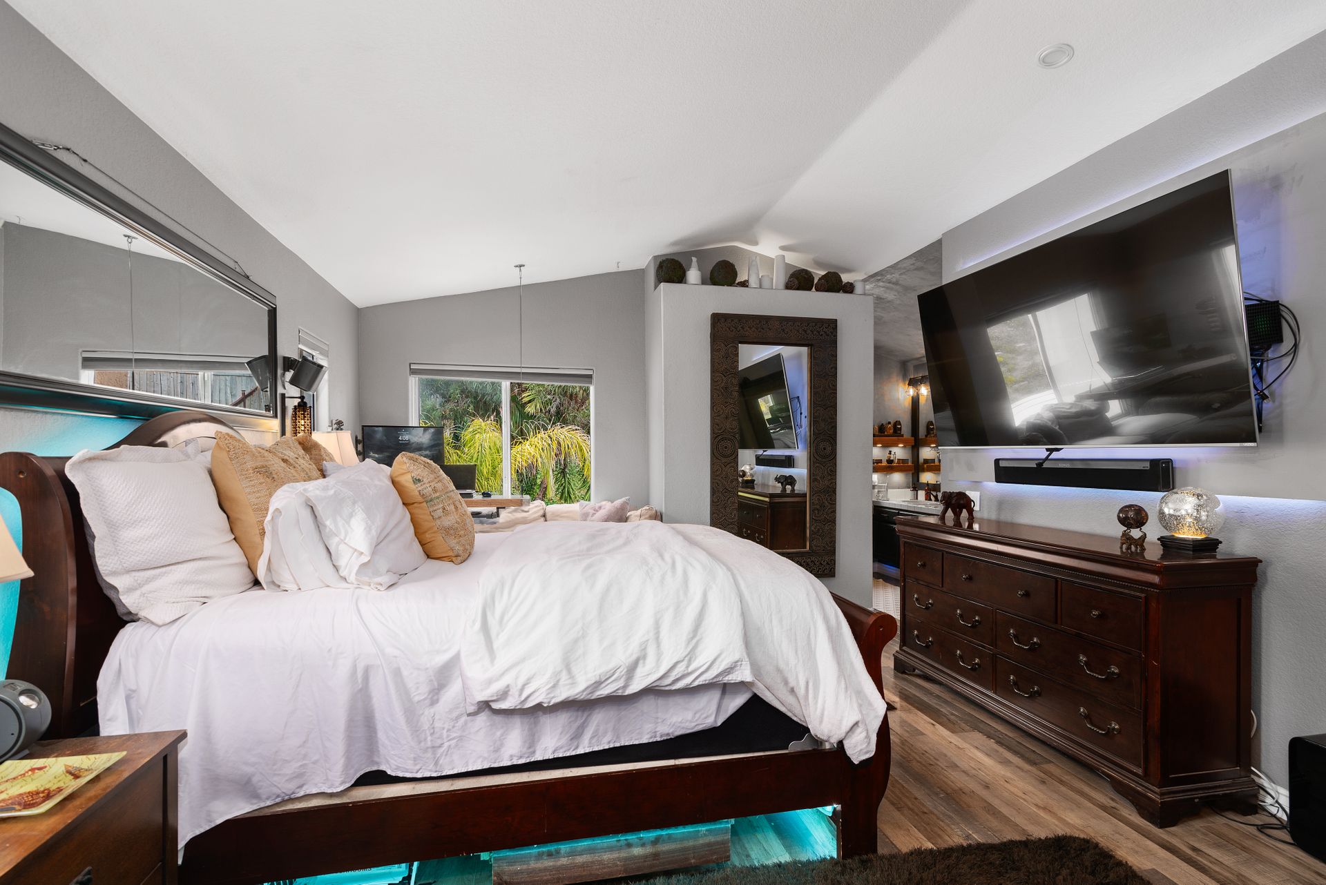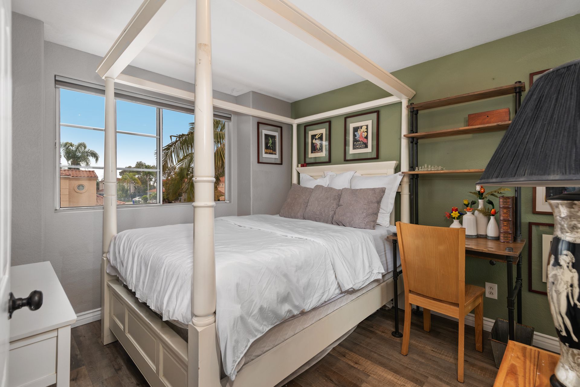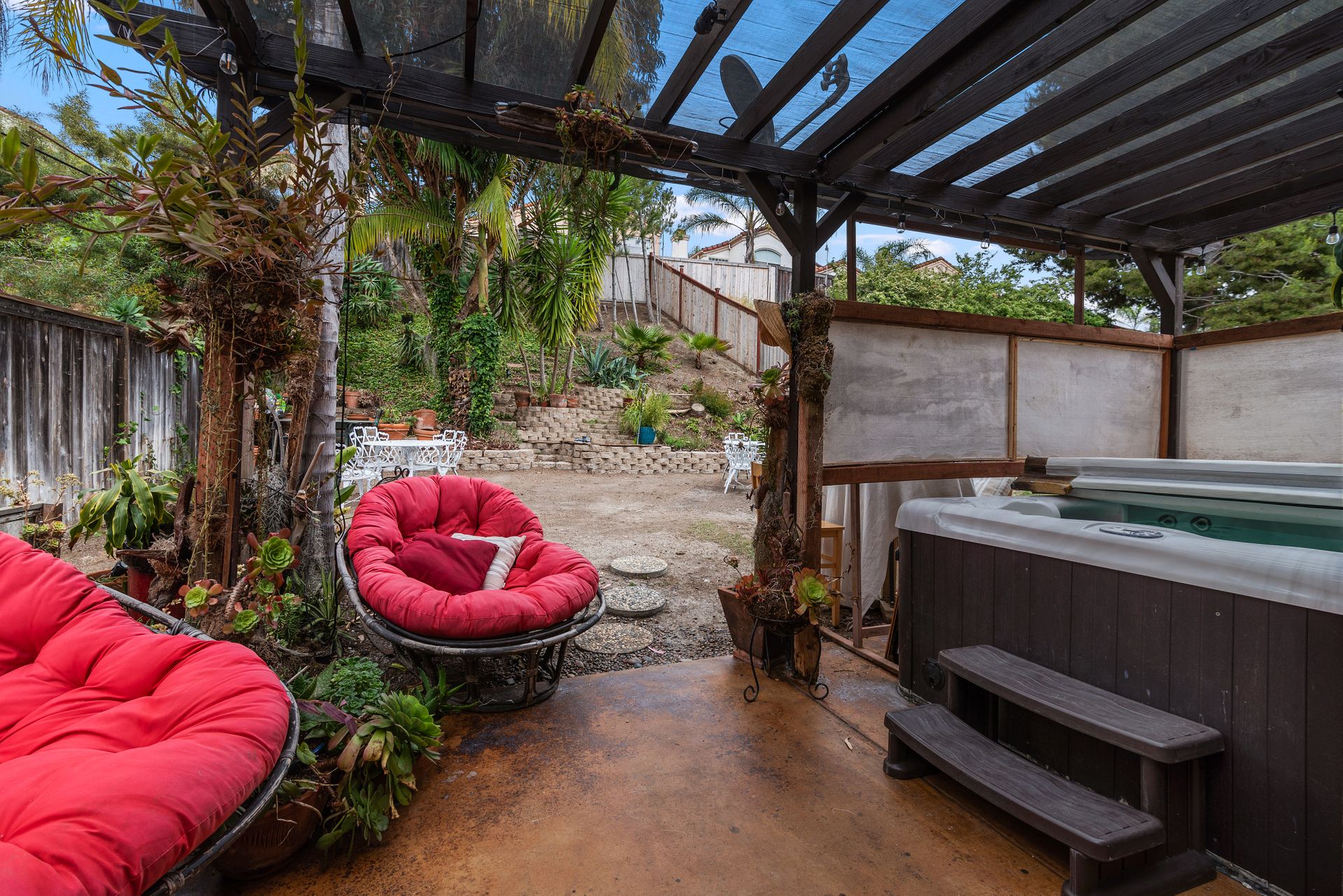 The first things you notice as you enter this home are the soaring high ceilings and light from all of the windows, giving the space a very light and airy feel. There is a two-sided fireplace that services both the formal living area as well as the den for those cozy winter evenings. The circular layout of the downstairs creates a wonderful open space for entertaining. There is a room off of the foyer that could function as an office space, art studio, etc. The kitchen has a large breakfast room off of it as well as a formal dining room on the other side. On the upper level of the home are three bedrooms. There is a lovely hall bath for the secondary rooms just off the large walkway that overlooks the living area. The large primary suite is really special with some very unique features. It has gorgeous Polynesian panels made into closet barn doors, a custom-made closet organizer in the large walk-in closet, complete with a coffee/breakfast station, a wonderful bench seat overlooking the backyard with extra storage inside, and a custom floating desk, all designed and constructed by the homeowner. The en-suite bathroom features a garden tub and walk-in shower along with double sinks. When you access the backyard through the sliding doors downstairs, there is a screened hot tub just outside the door with multiple patio spaces for seating. The yard itself is private with a terraced hill to the back. There is also a lovely custom archway near the front door, that leads into the backyard area. There, you will find numerous fruit trees including apricot, cherry, Fuji apple, plum, lemon, and olive trees. There are also raised beds for growing vegetables. This home is located in the Rancho Del Oro area of Oceanside, midway between the 76 and the 78 freeways and about 10 minutes from the lively downtown area, with the pier, breweries, restaurants, etc. It is zoned for Ivey Ranch Schools and the neighborhood has multiple playgrounds. Come by and see this unique home!