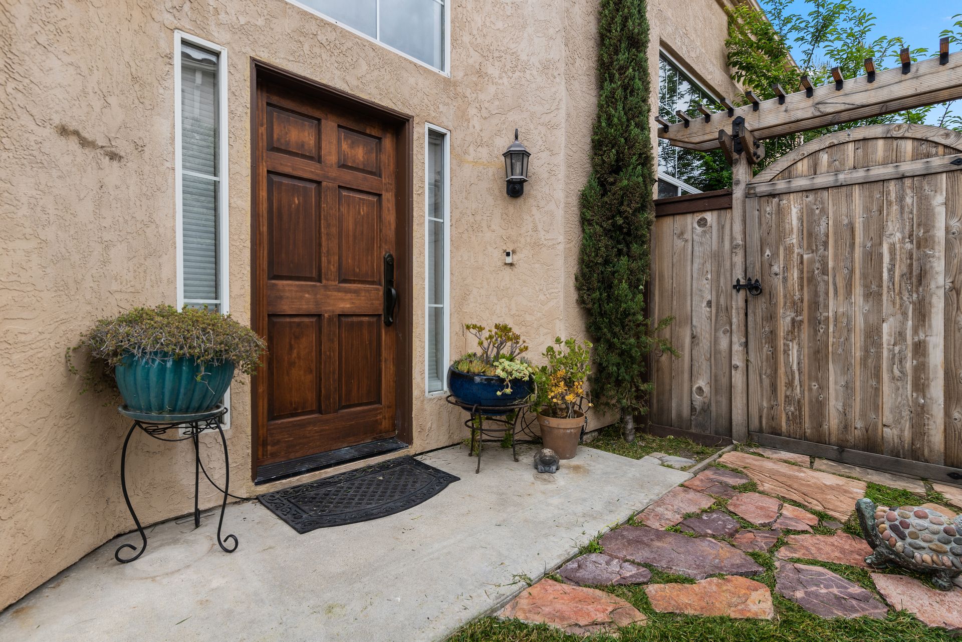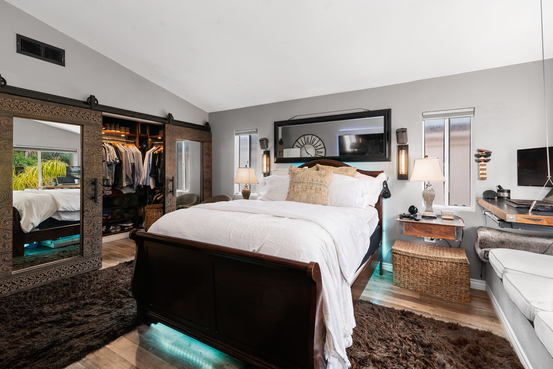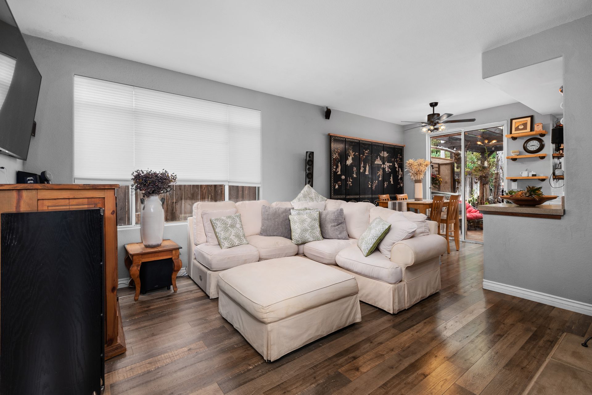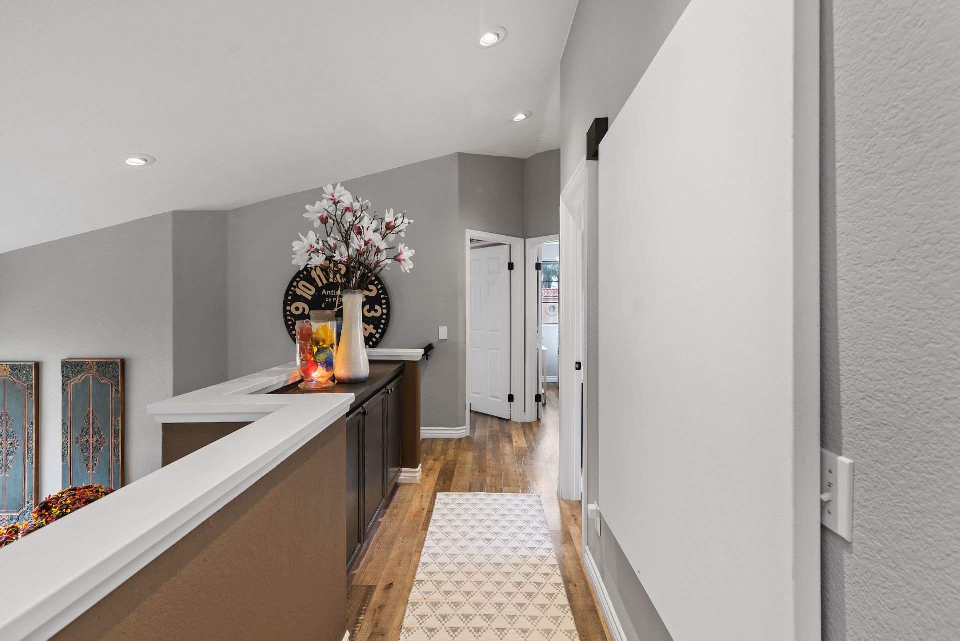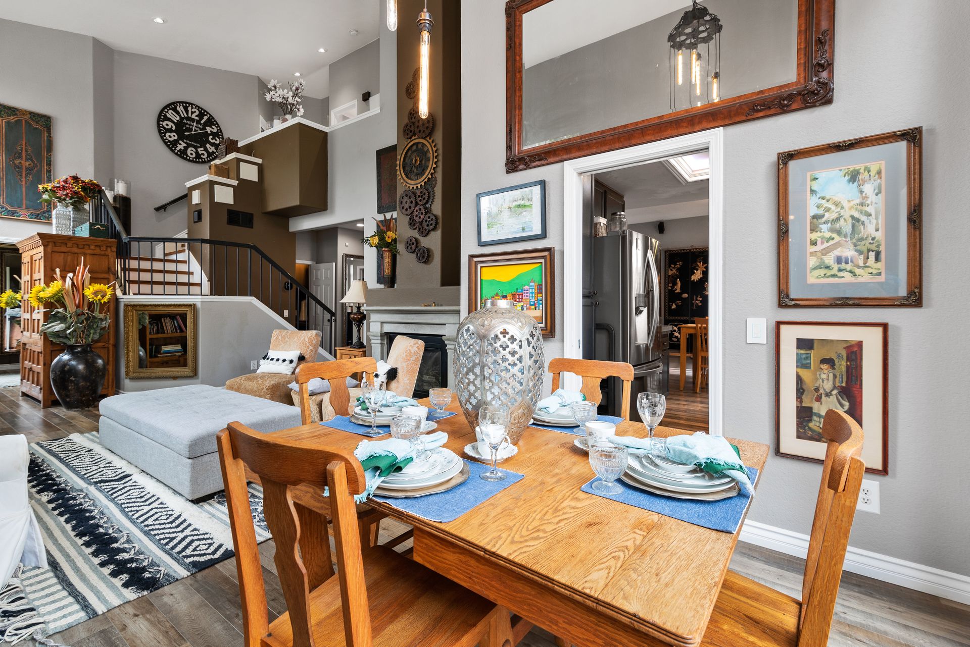 The first things you notice as you enter this home are the soaring high ceilings and light from all of the windows, giving the space a very light and airy feel. There is a two-sided fireplace that services both the formal living area as well as the den for those cozy winter evenings. The circular layout of the downstairs creates a wonderful open space for entertaining. There is a room off of the foyer that could function as an office space, art studio, etc. The kitchen has a large breakfast room off of it as well as a formal dining room on the other side. On the upper level of the home are three bedrooms. There is a lovely hall bath for the secondary rooms just off the large walkway that overlooks the living area. The large primary suite is really special with some very unique features. It has gorgeous Polynesian panels made into closet barn doors, a custom-made closet organizer in the large walk-in closet, complete with a coffee/breakfast station, a wonderful bench seat overlooking the backyard with extra storage inside, and a custom floating desk, all designed and constructed by the homeowner. The en-suite bathroom features a garden tub and walk-in shower along with double sinks. When you access the backyard through the sliding doors downstairs, there is a screened hot tub just outside the door with multiple patio spaces for seating. The yard itself is private with a terraced hill to the back. There is also a lovely custom archway near the front door, that leads into the backyard area. There, you will find numerous fruit trees including apricot, cherry, Fuji apple, plum, lemon, and olive trees. There are also raised beds for growing vegetables. This home is located in the Rancho Del Oro area of Oceanside, midway between the 76 and the 78 freeways and about 10 minutes from the lively downtown area, with the pier, breweries, restaurants, etc. It is zoned for Ivey Ranch Schools and the neighborhood has multiple playgrounds. Come by and see this unique home!