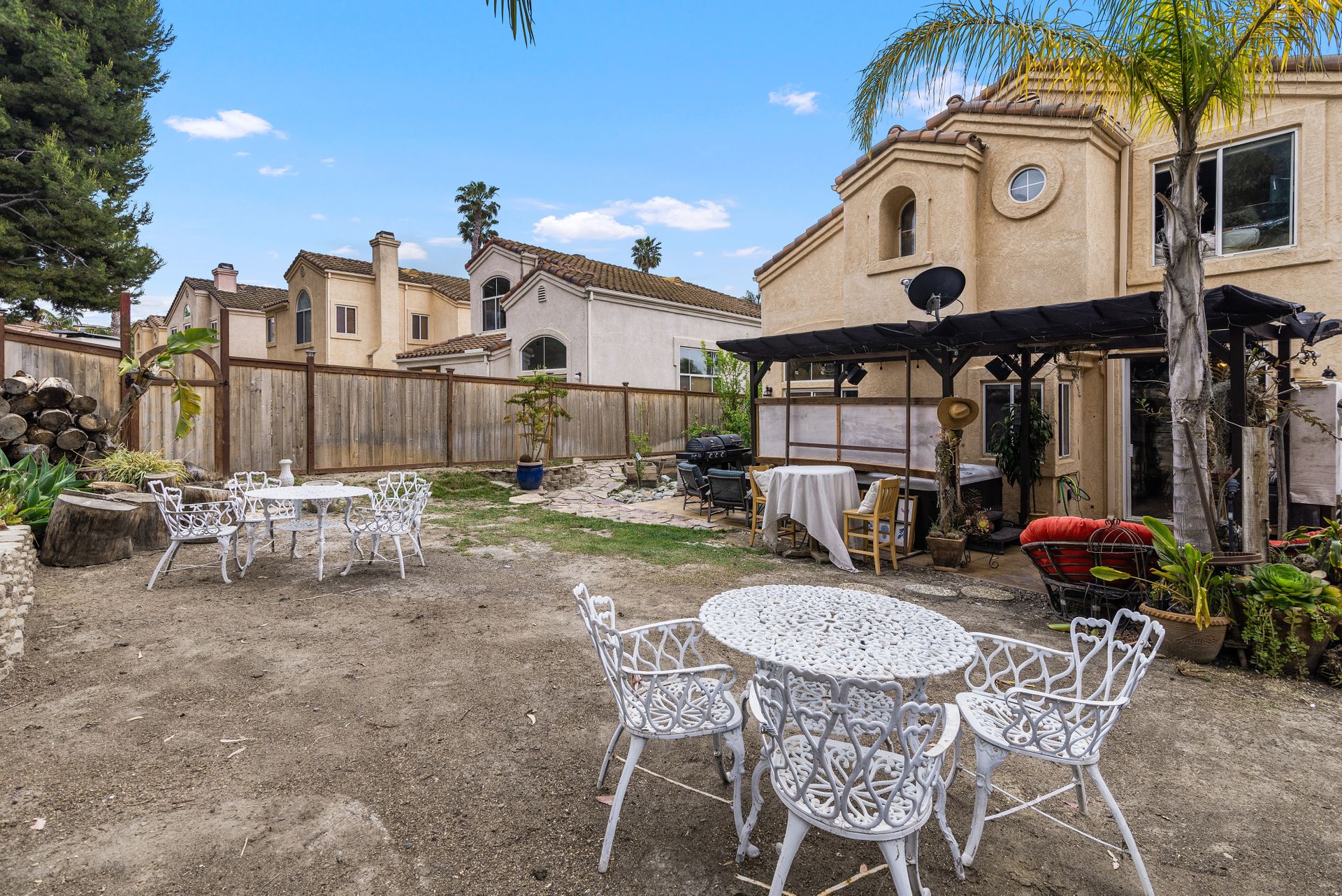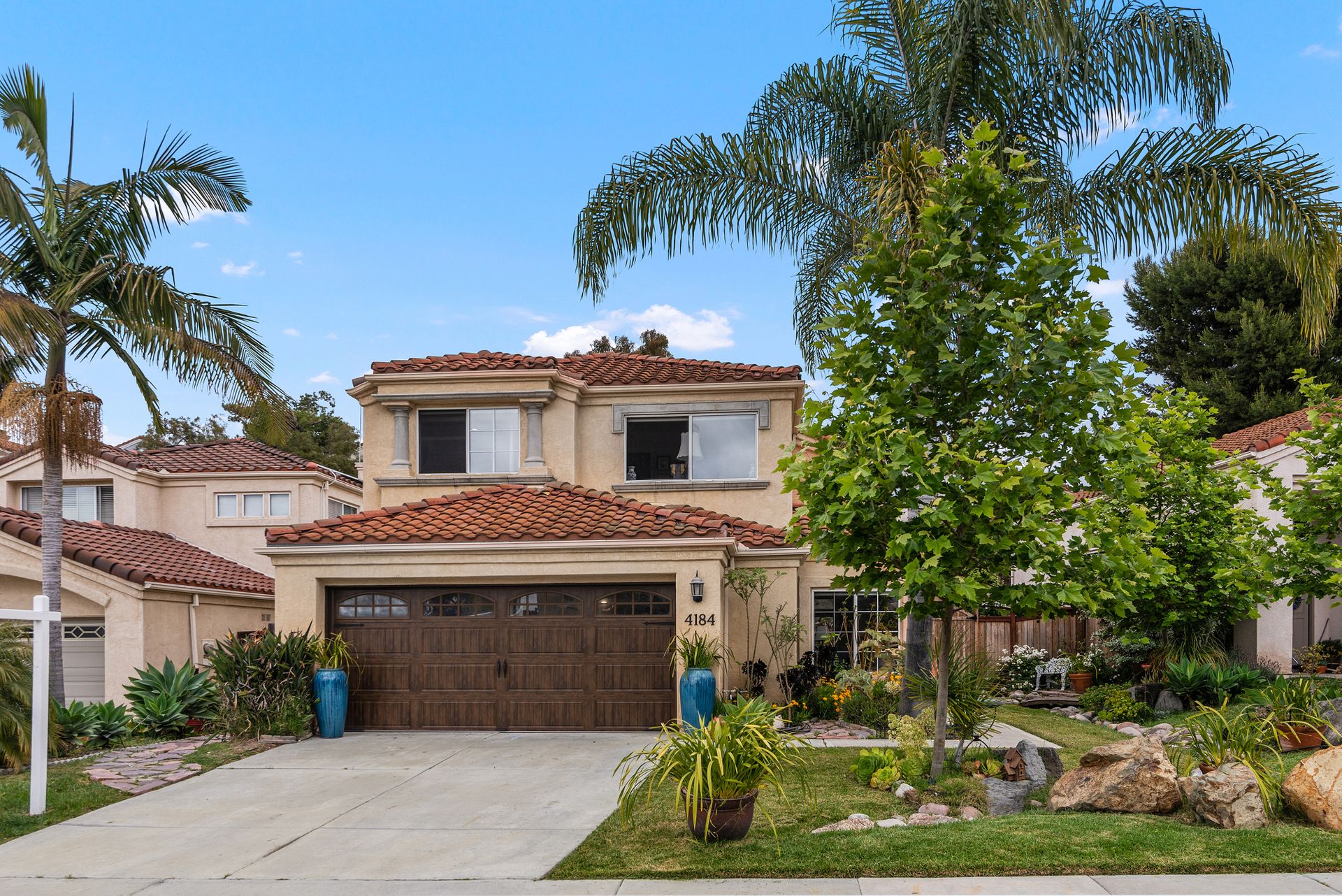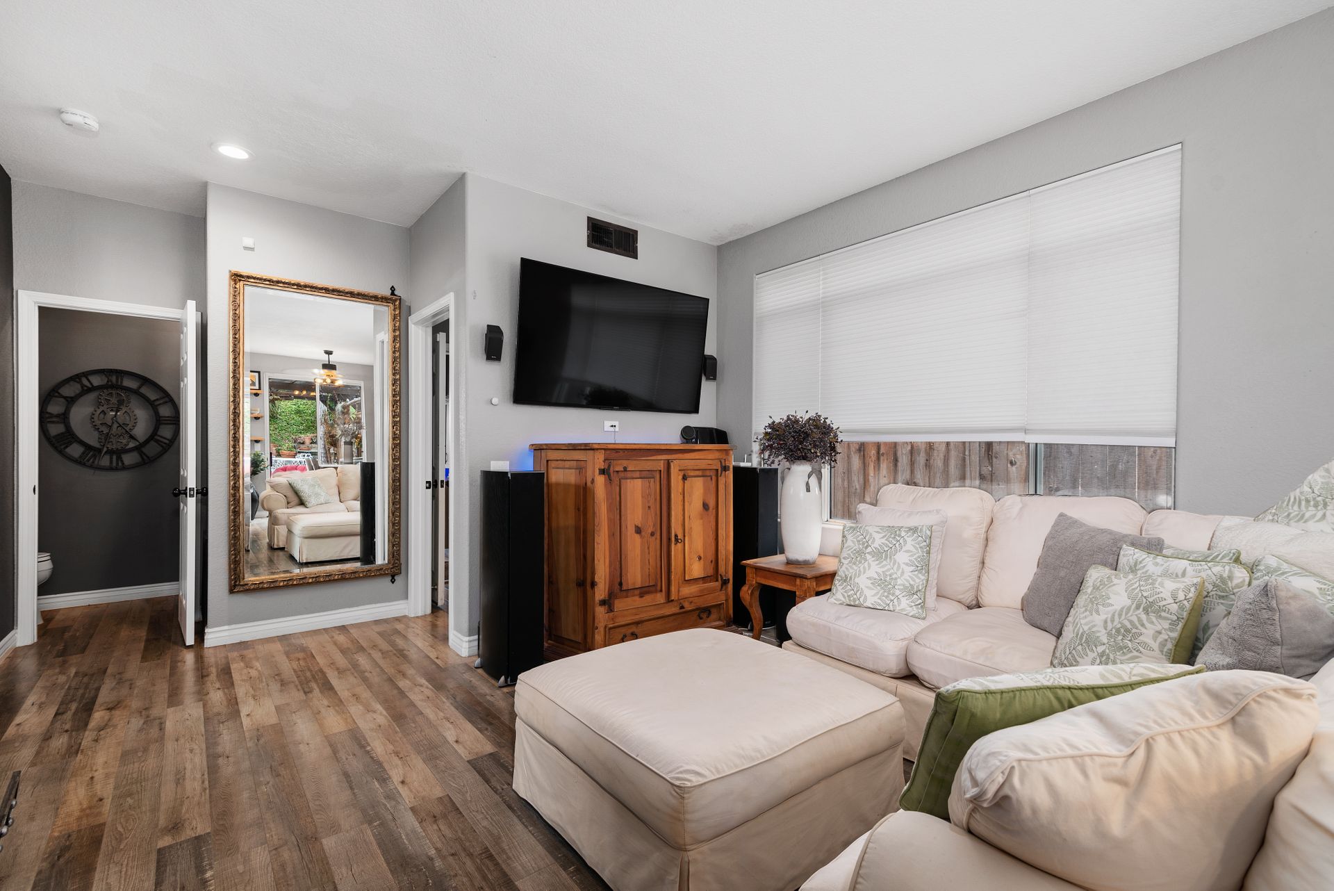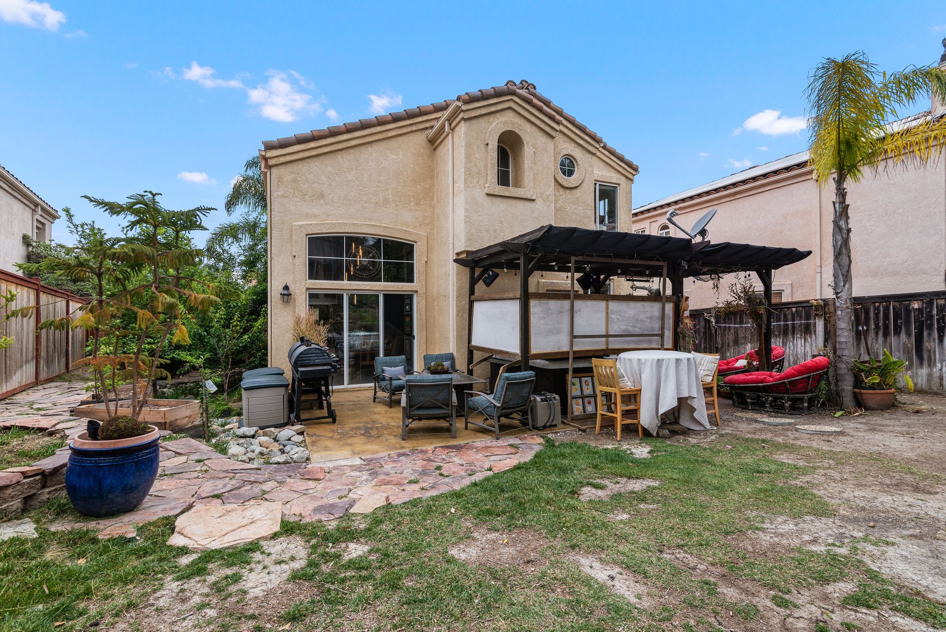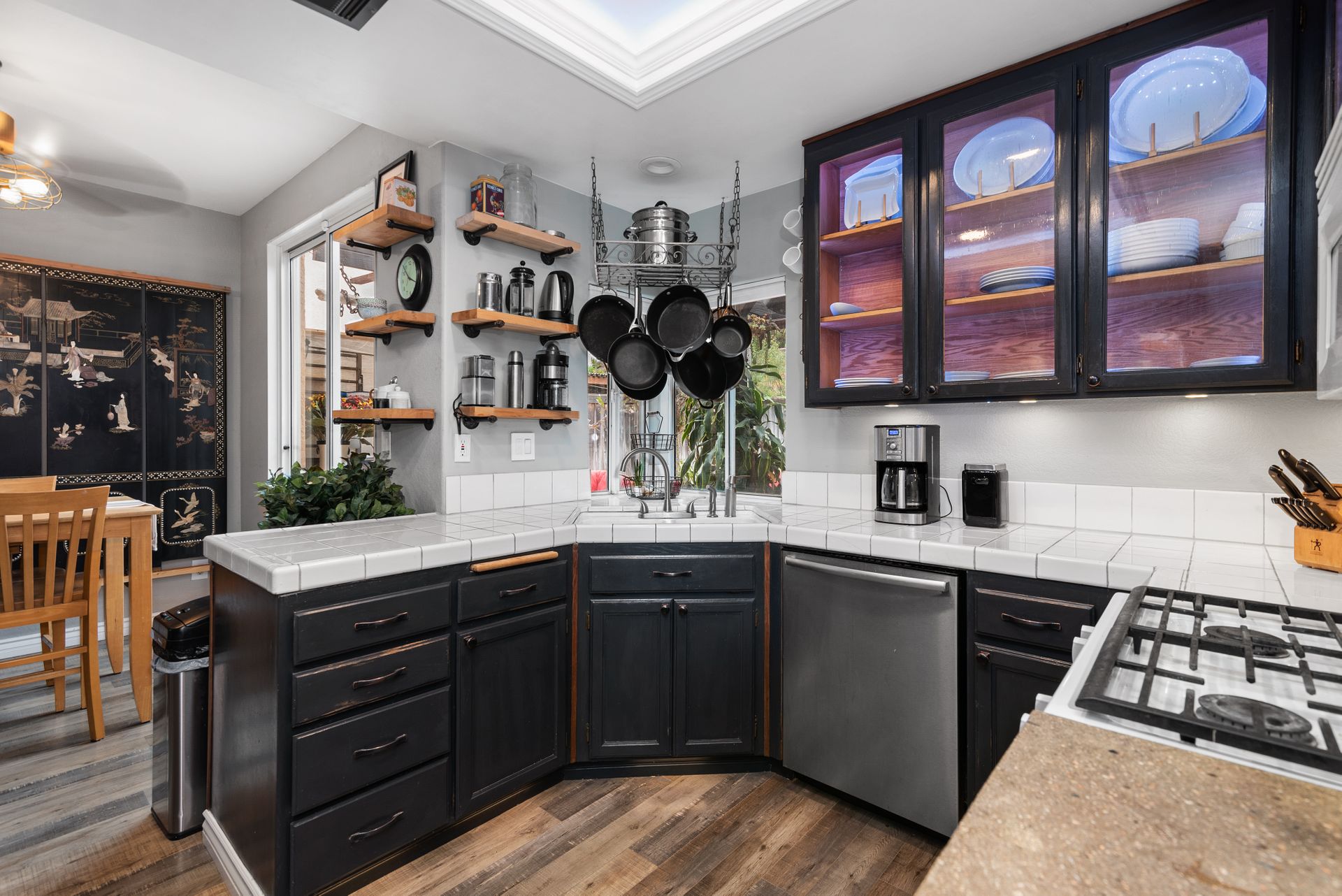 The first things you notice as you enter this home are the soaring high ceilings and light from all of the windows, giving the space a very light and airy feel. There is a two-sided fireplace that services both the formal living area as well as the den for those cozy winter evenings. The circular layout of the downstairs creates a wonderful open space for entertaining. There is a room off of the foyer that could function as an office space, art studio, etc. The kitchen has a large breakfast room off of it as well as a formal dining room on the other side. On the upper level of the home are three bedrooms. There is a lovely hall bath for the secondary rooms just off the large walkway that overlooks the living area. The large primary suite is really special with some very unique features. It has gorgeous Polynesian panels made into closet barn doors, a custom-made closet organizer in the large walk-in closet, complete with a coffee/breakfast station, a wonderful bench seat overlooking the backyard with extra storage inside, and a custom floating desk, all designed and constructed by the homeowner. The en-suite bathroom features a garden tub and walk-in shower along with double sinks. When you access the backyard through the sliding doors downstairs, there is a screened hot tub just outside the door with multiple patio spaces for seating. The yard itself is private with a terraced hill to the back. There is also a lovely custom archway near the front door, that leads into the backyard area. There, you will find numerous fruit trees including apricot, cherry, Fuji apple, plum, lemon, and olive trees. There are also raised beds for growing vegetables. This home is located in the Rancho Del Oro area of Oceanside, midway between the 76 and the 78 freeways and about 10 minutes from the lively downtown area, with the pier, breweries, restaurants, etc. It is zoned for Ivey Ranch Schools and the neighborhood has multiple playgrounds. Come by and see this unique home!