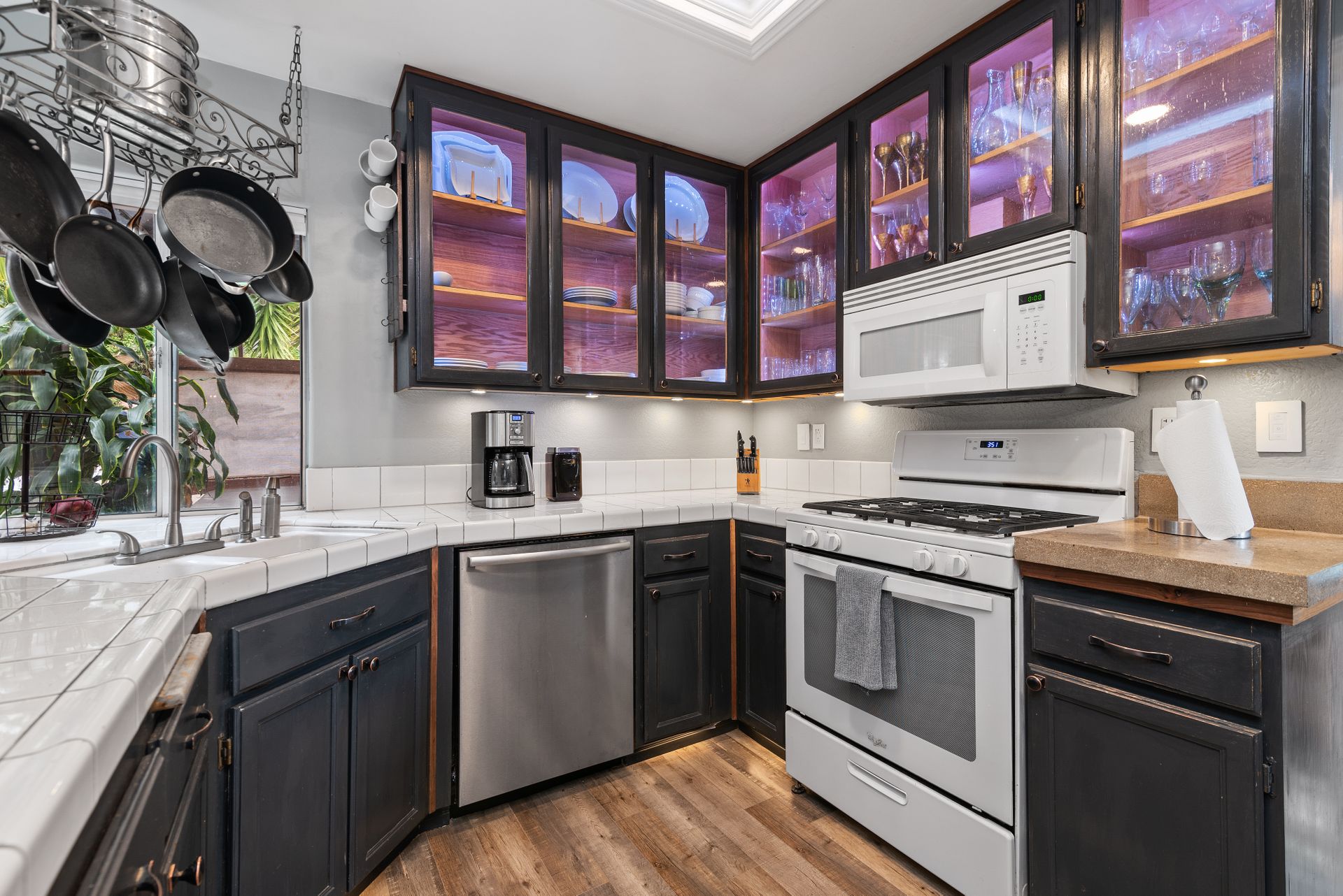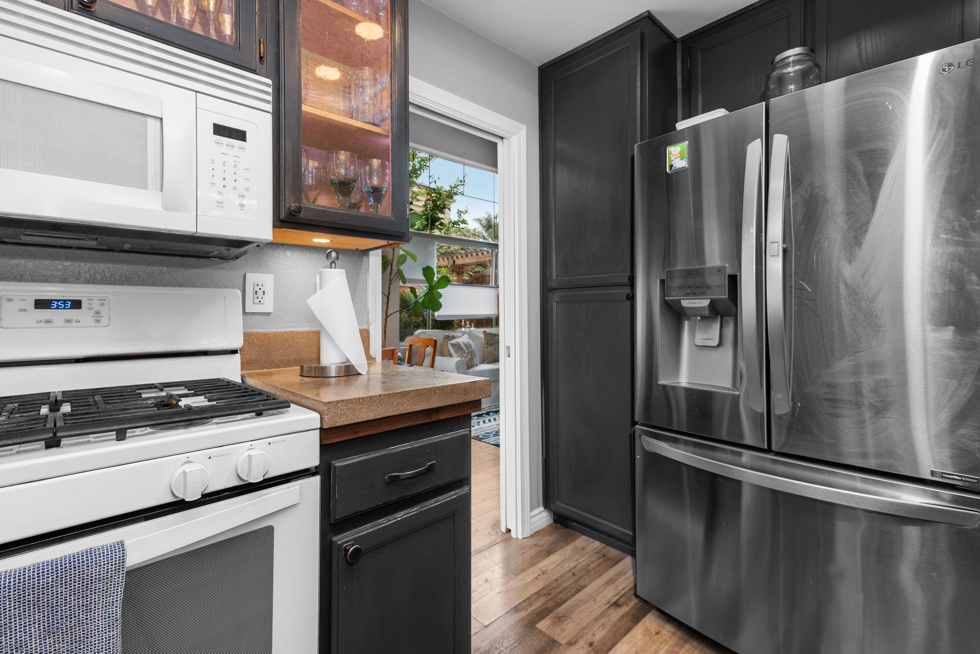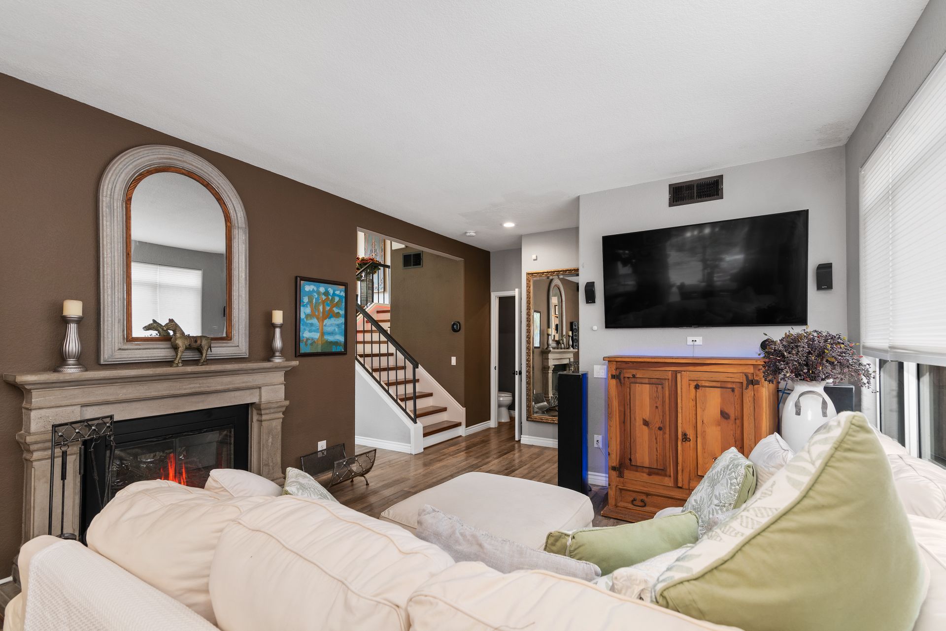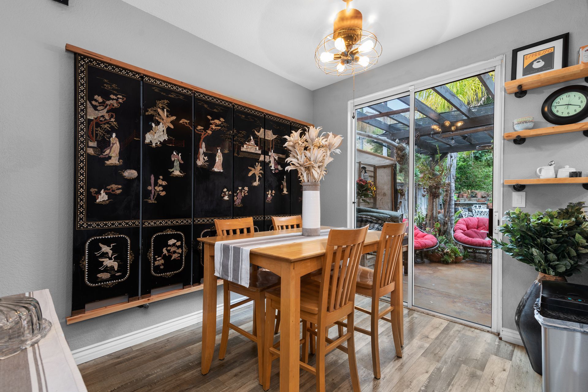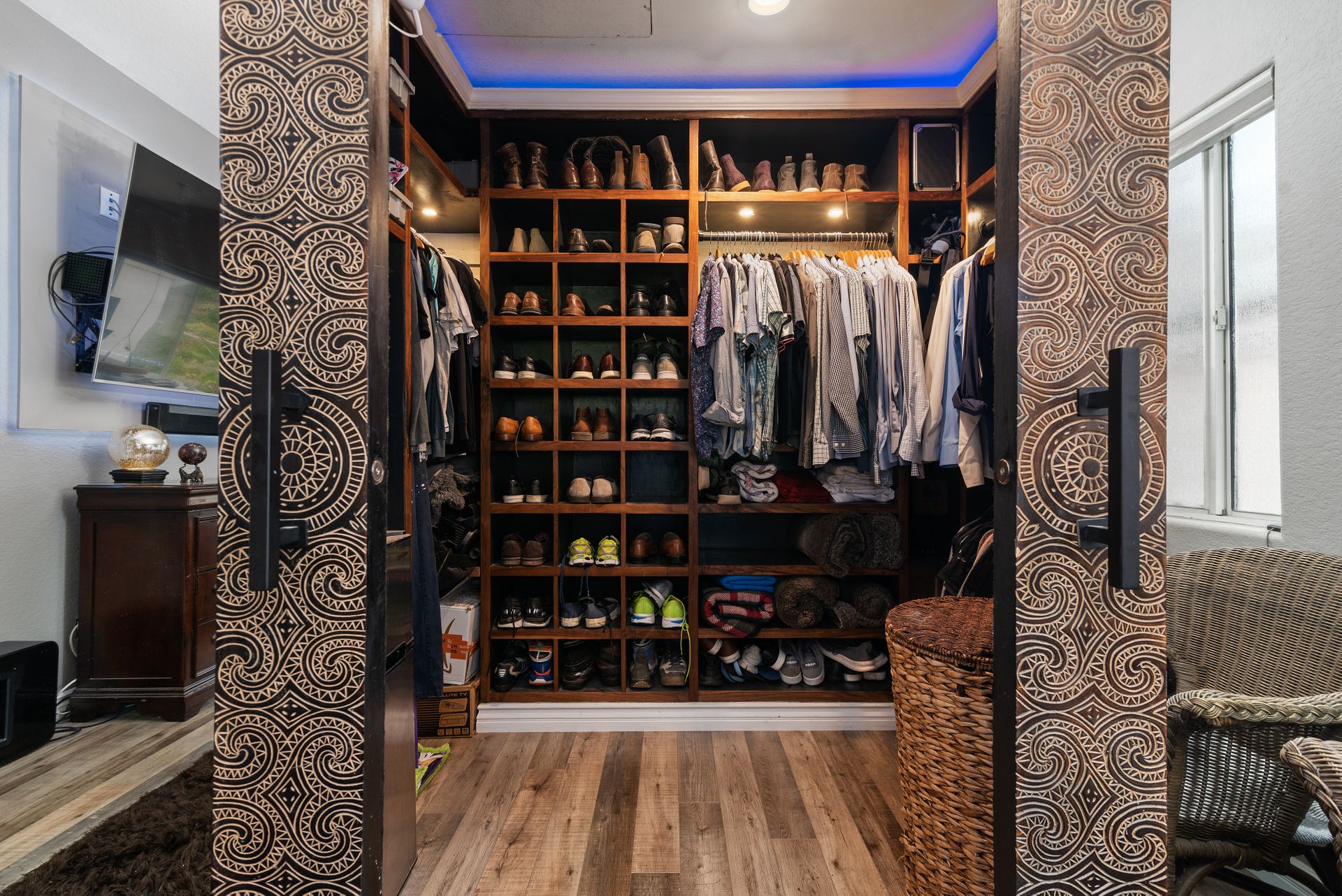 The first things you notice as you enter this home are the soaring high ceilings and light from all of the windows, giving the space a very light and airy feel. There is a two-sided fireplace that services both the formal living area as well as the den for those cozy winter evenings. The circular layout of the downstairs creates a wonderful open space for entertaining. There is a room off of the foyer that could function as an office space, art studio, etc. The kitchen has a large breakfast room off of it as well as a formal dining room on the other side. On the upper level of the home are three bedrooms. There is a lovely hall bath for the secondary rooms just off the large walkway that overlooks the living area. The large primary suite is really special with some very unique features. It has gorgeous Polynesian panels made into closet barn doors, a custom-made closet organizer in the large walk-in closet, complete with a coffee/breakfast station, a wonderful bench seat overlooking the backyard with extra storage inside, and a custom floating desk, all designed and constructed by the homeowner. The en-suite bathroom features a garden tub and walk-in shower along with double sinks. When you access the backyard through the sliding doors downstairs, there is a screened hot tub just outside the door with multiple patio spaces for seating. The yard itself is private with a terraced hill to the back. There is also a lovely custom archway near the front door, that leads into the backyard area. There, you will find numerous fruit trees including apricot, cherry, Fuji apple, plum, lemon, and olive trees. There are also raised beds for growing vegetables. This home is located in the Rancho Del Oro area of Oceanside, midway between the 76 and the 78 freeways and about 10 minutes from the lively downtown area, with the pier, breweries, restaurants, etc. It is zoned for Ivey Ranch Schools and the neighborhood has multiple playgrounds. Come by and see this unique home!