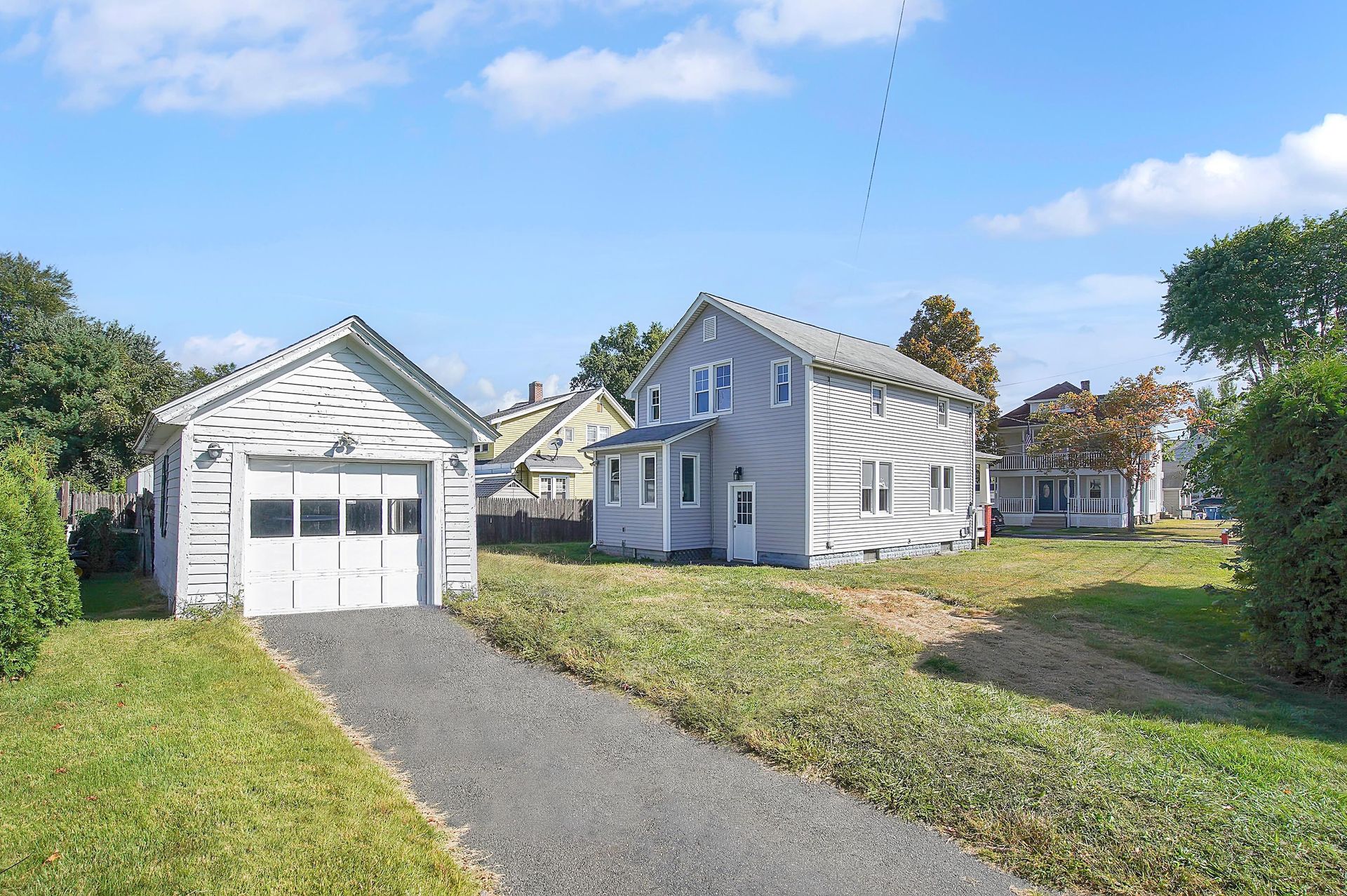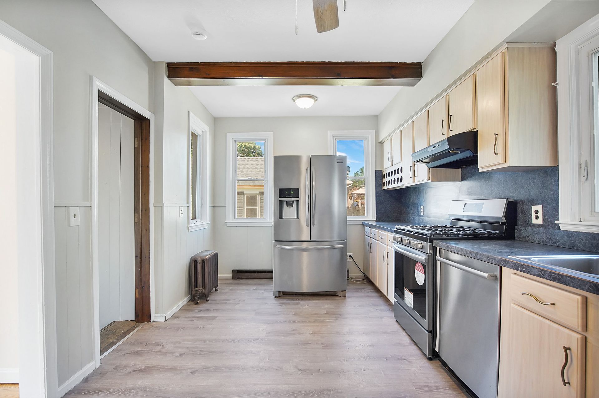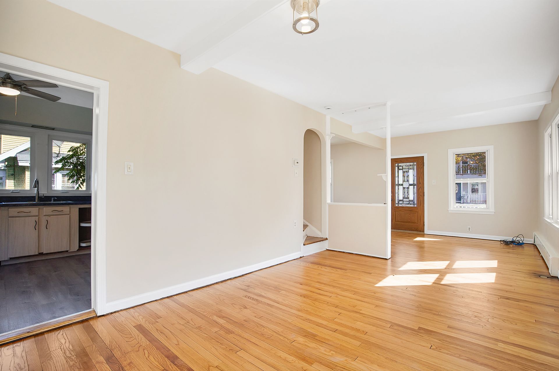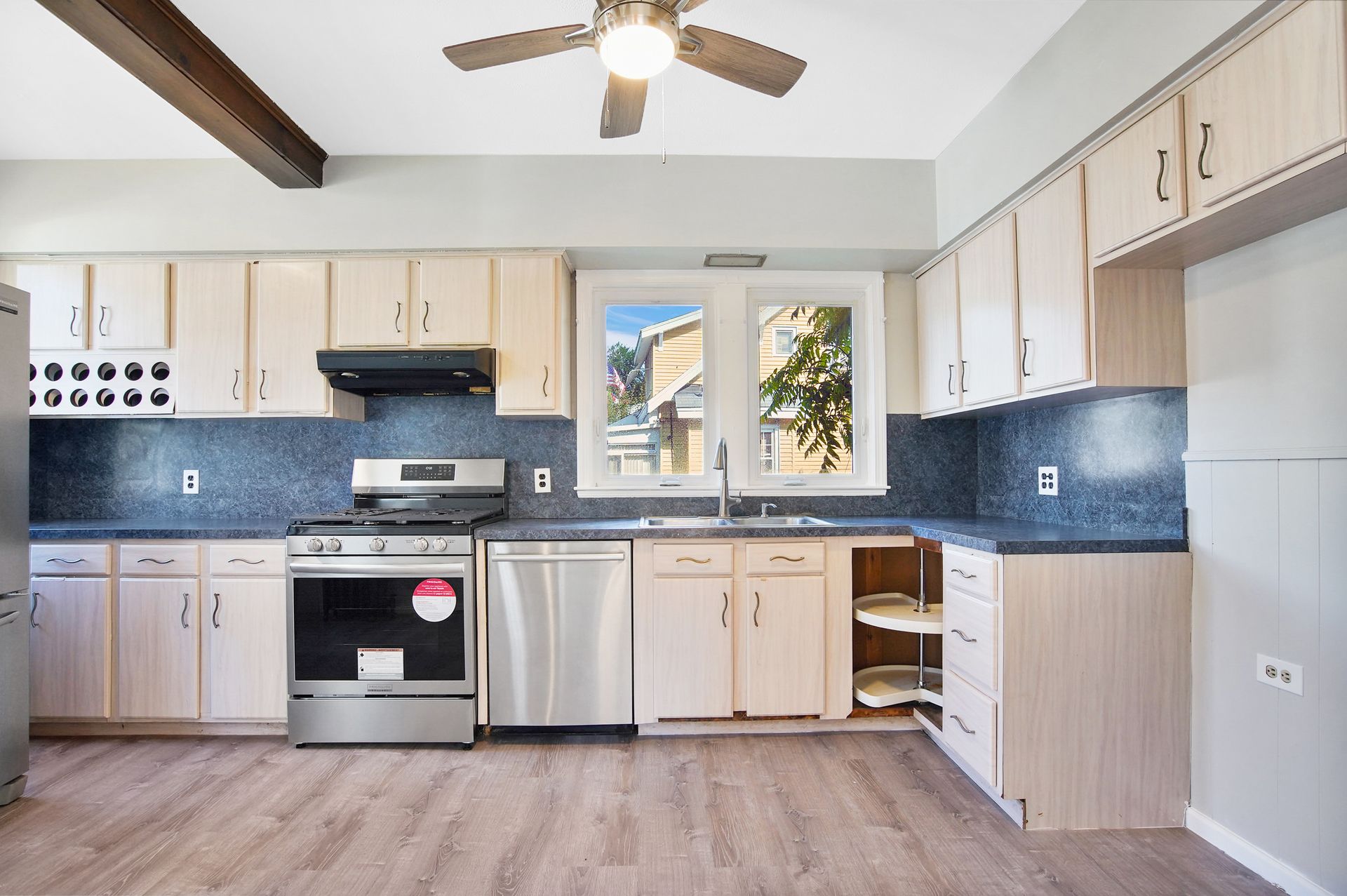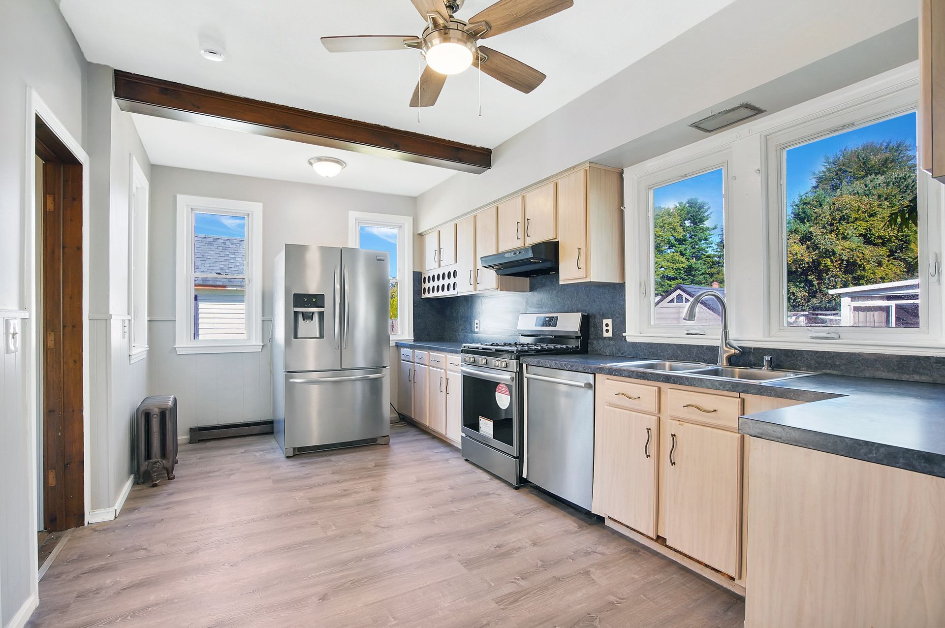 This two-bedroom, one and a half bathroom house features approximately 1,400 square feet of living space. The property has been updated, offering modern updates while maintaining its charming character. The main level includes an open floor plan with a spacious living room and dining area. The adjacent kitchen provides ample counter space and storage. Upstairs, you'll find the two bedrooms, including a primary bedroom. The property also includes a full bathroom on the main level. The backyard provides a private outdoor space. This home is situated in a convenient location, offering accessibility to local amenities.