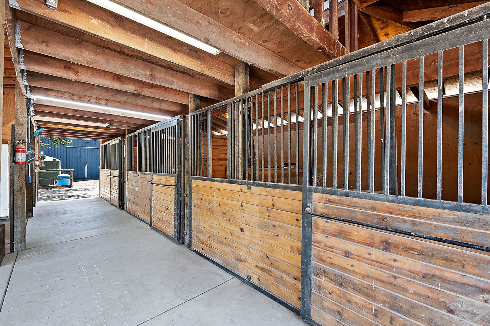 *30'x40' barn with 3 13'x13' horse stalls, water access and sliding doors, 10'x12' tack room with door, saddle racks and shelving, 10'x30' loft area with pull down stairway access. Water heater with outdoor hose access and 20'x20' concrete pad with hitching post & rail fence for clean up. Concrete fooring on center hallway and storage areas.