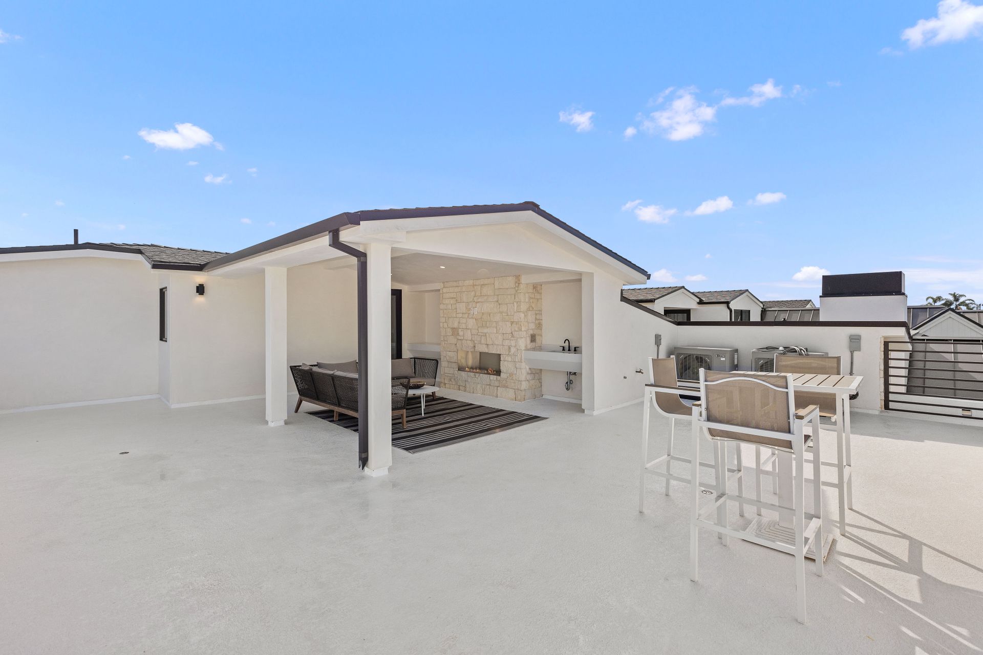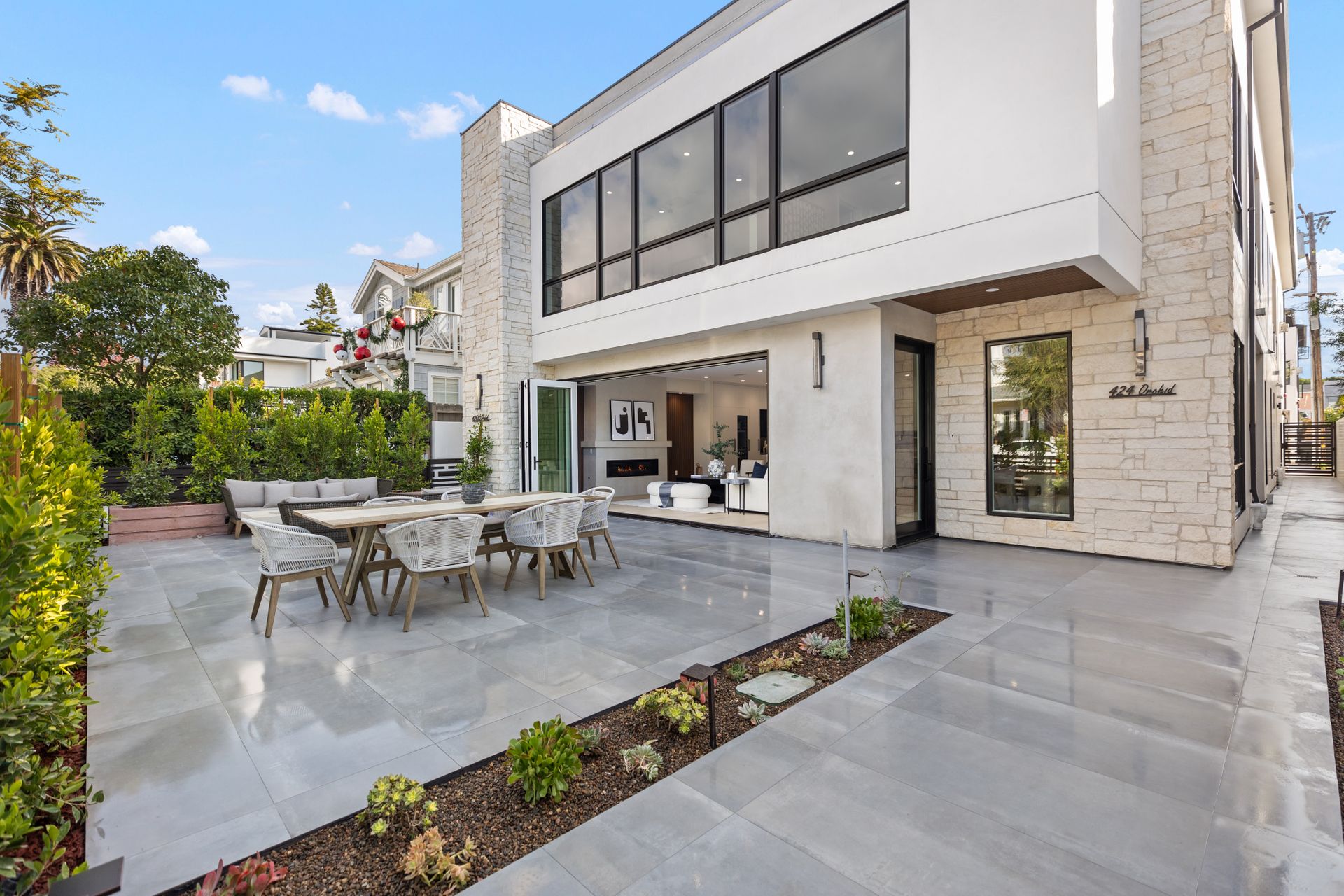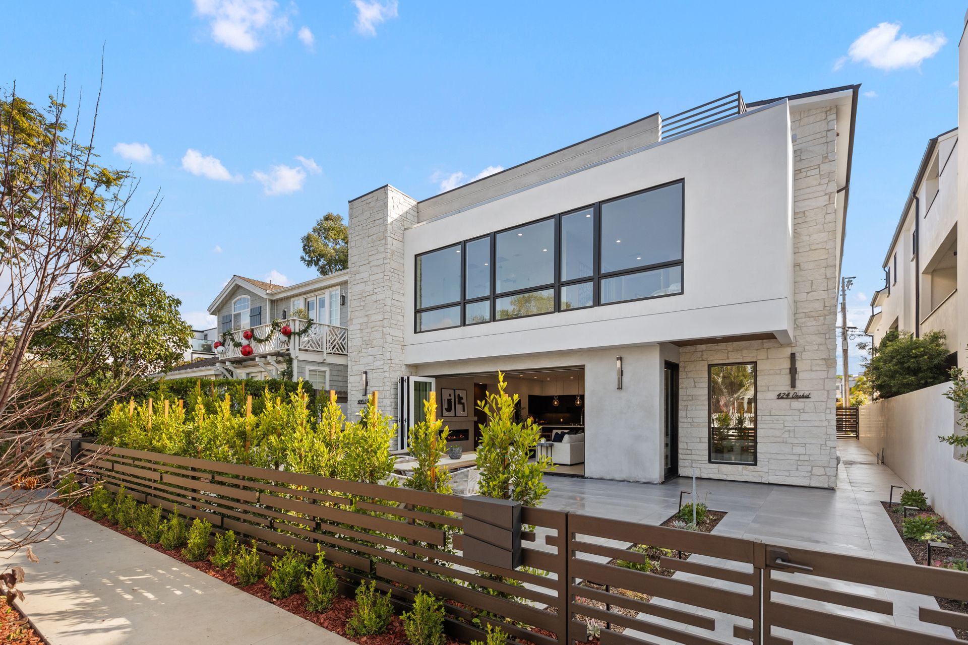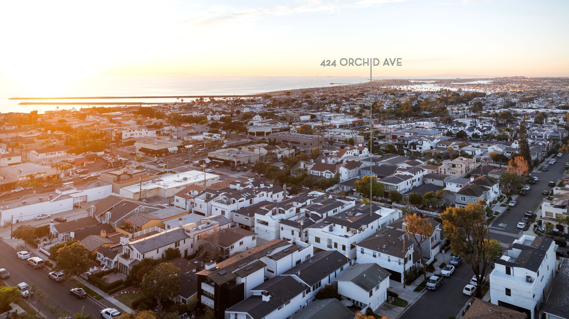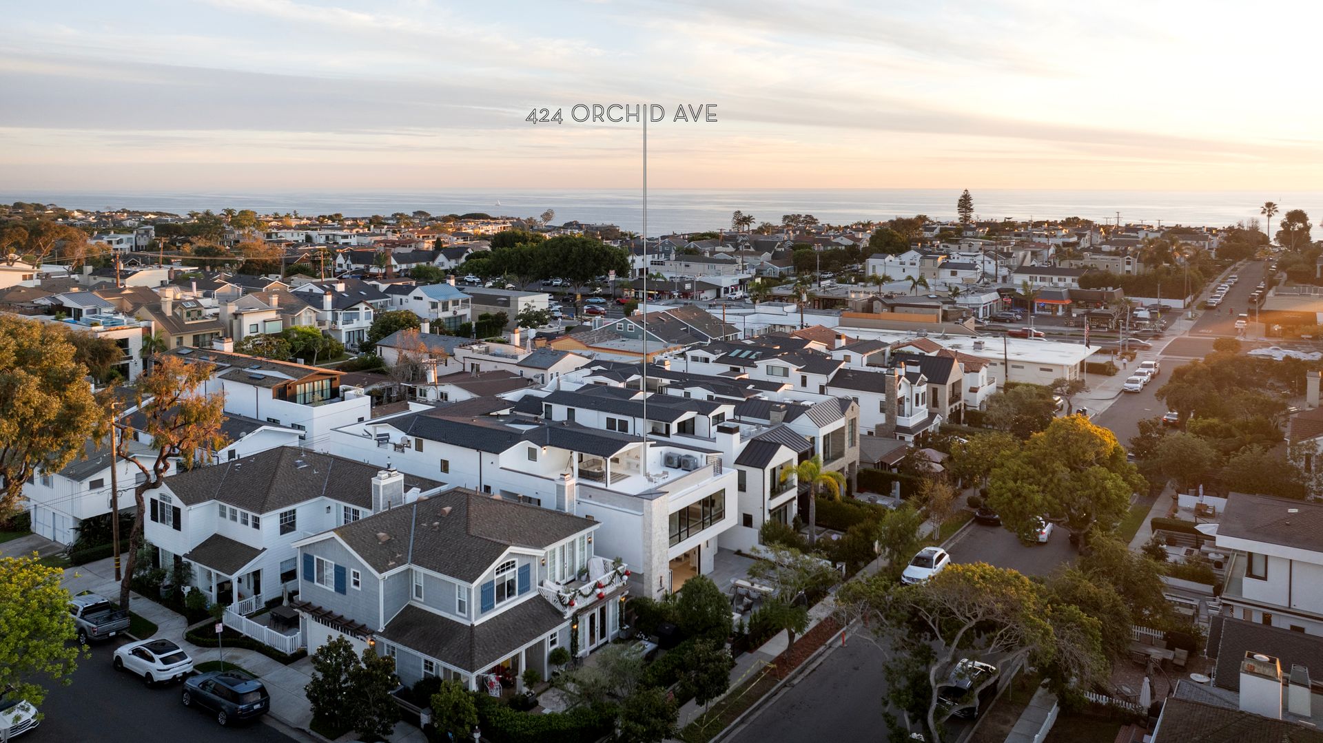 Nestled on the exclusive 400 Block of Flower Street, 424 Orchid Avenue in Corona Del Mar stands out as a remarkable masterpiece with a rare 45-foot lot. This brand-new construction residence is a testament to Organic Modern design, seamlessly blending natural elements with contemporary aesthetics. Upon entry, abundant natural light welcomes you through bifold windows, revealing a spacious front patio highlighted with a gorgeous firepit and ample seating—an ideal space for relaxation and entertainment. The expansive great room boasts a modern fireplace with exquisite porcelain tiles, serving as a refined focal point. The heart of the home is a Porcelanosa two-tone custom kitchen, meticulously crafted in Spain—a dream for culinary enthusiasts. It is equipped with top-of-the-line Miele appliances and an integrated espresso brewing system. A dedicated storage space caters to the wine connoisseur. Effortless entertainment unfolds in the inviting courtyard seamlessly connected to the kitchen and dining area, fostering a delightful flow for al fresco gatherings. Other features on the first floor include an ensuite bedroom/office, providing versatile living space for guests or facilitating remote work from home, extra storage, and a luxurious powder room for guests. Ascend to the second floor to find the primary suite, featuring a lavish bathroom embellished with luxurious Walker Zanger tiles. Large windows, stunning custom walk-in closets, and an enclosed patio create an intimate outdoor oasis. Two additional en-suite bedrooms on this level offer comfort and privacy, complemented by a dedicated laundry room for practicality. Enjoy wide-ranging views of Corona Del Mar village, city lights, sunsets, and picturesque Spyglass hills all year round on the spacious roof-top with a modern multi-color flame fireplace, adorned with beautiful stone detailing and ample seating.