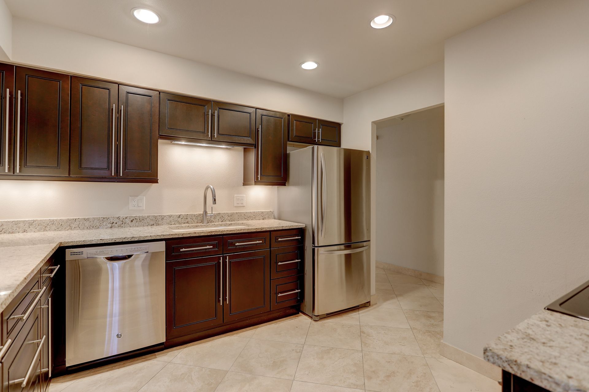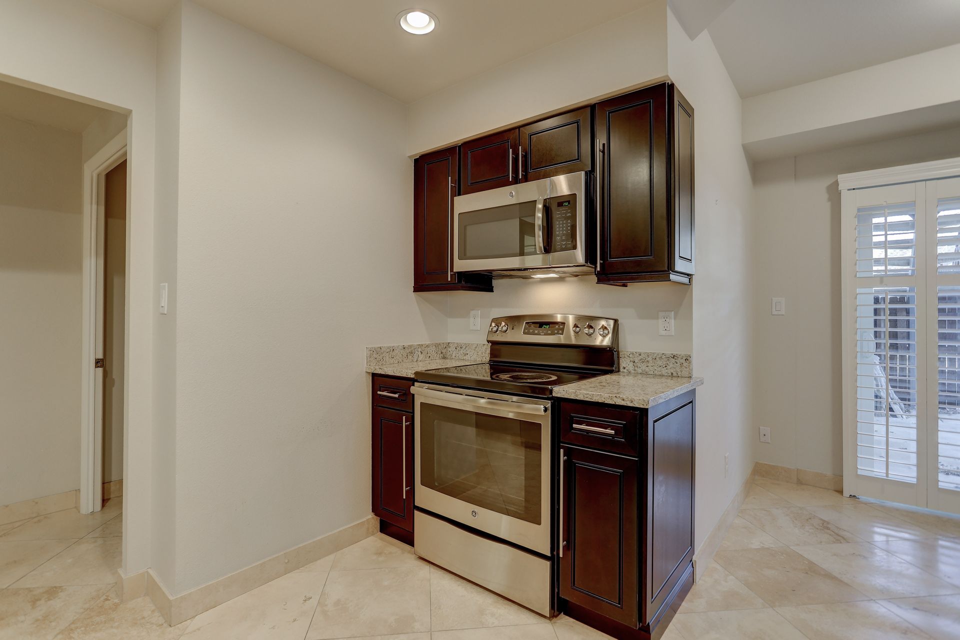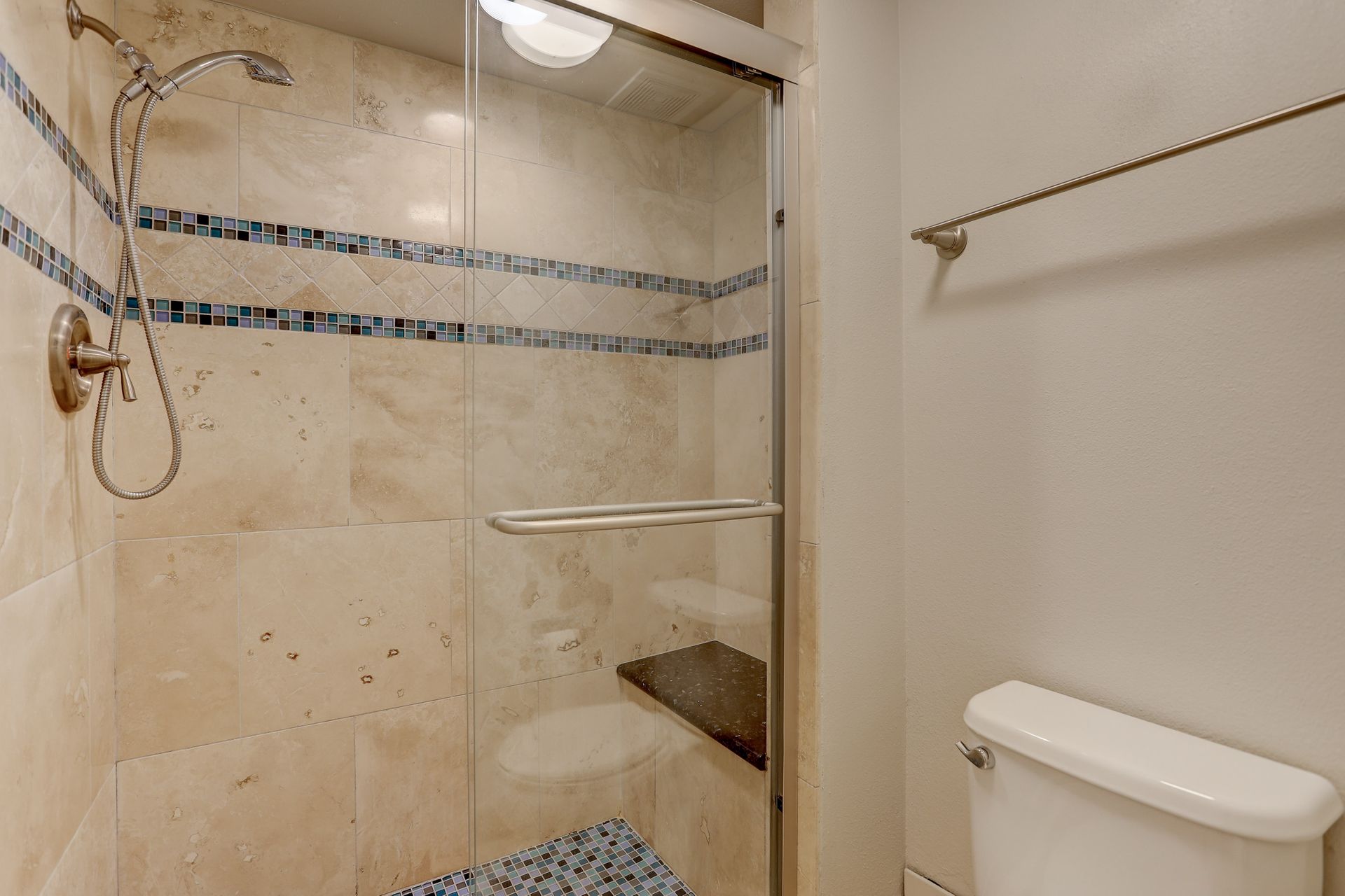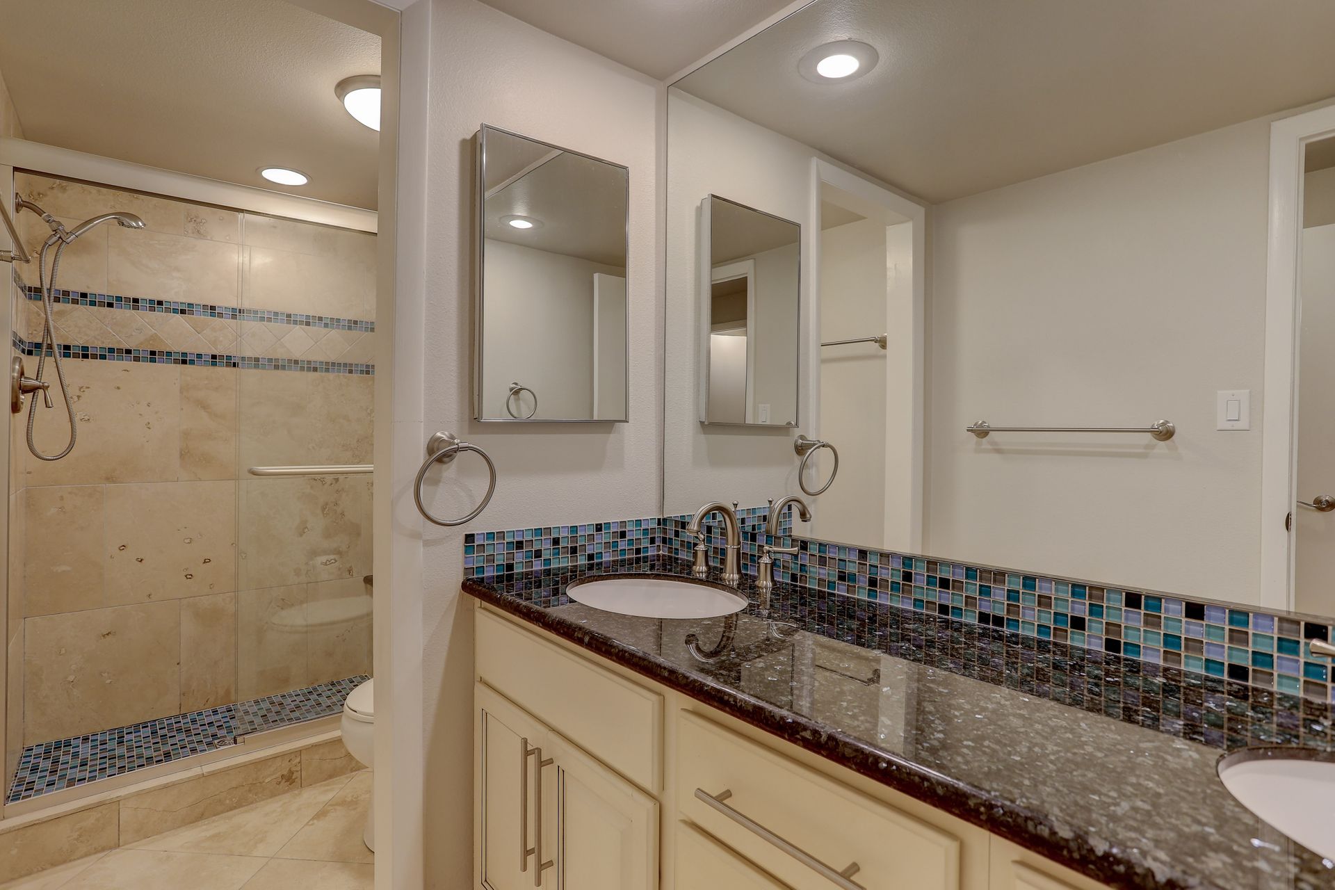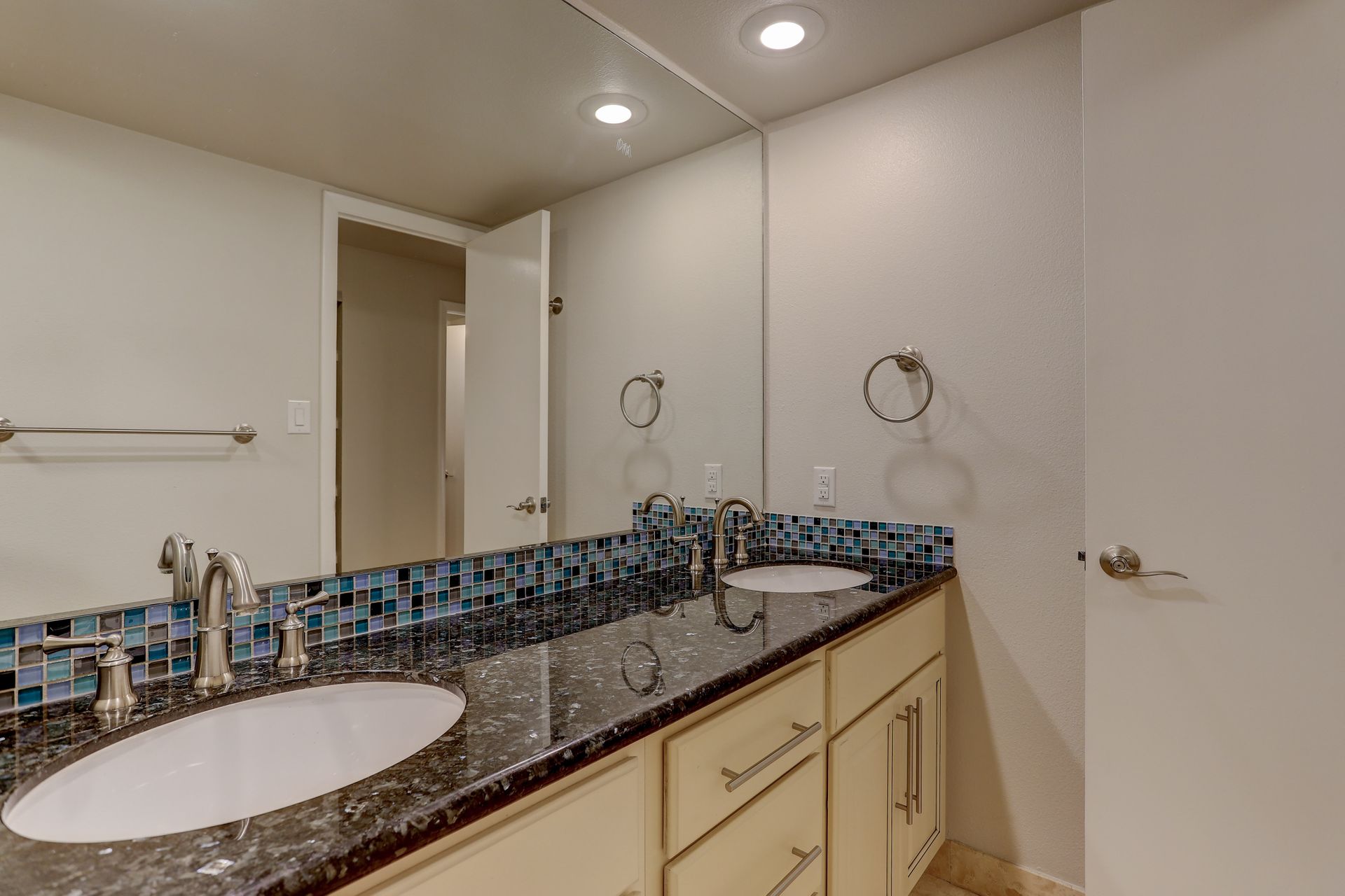 The primary suite, with dual walk-in closets and patio access, features a travertine and glass tile shower, as well as a dual sink vanity with granite countertop. The second bedroom, which also offers a walk-in closet and double doors into the main living area, can also work well as an office.