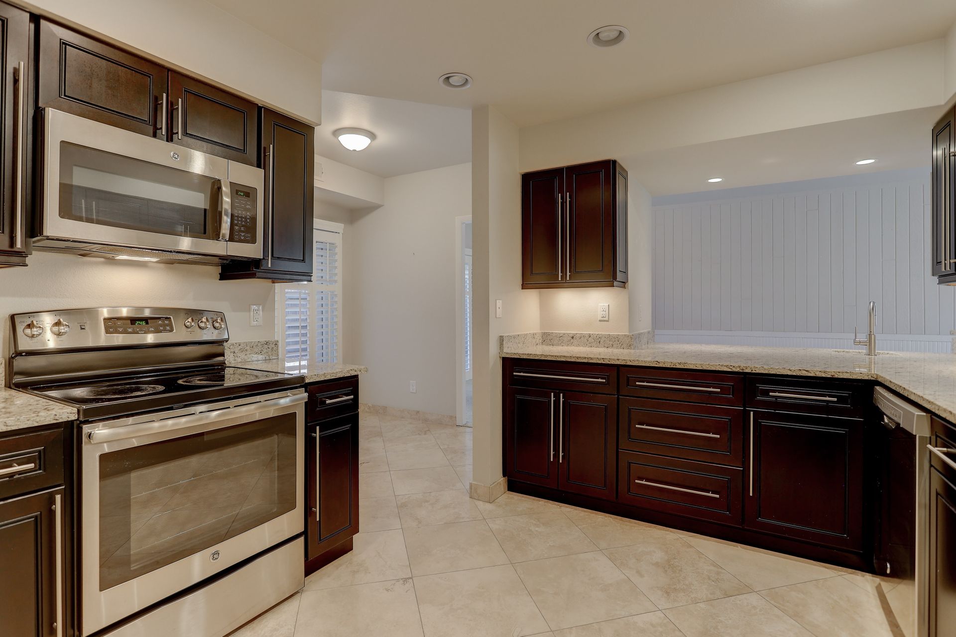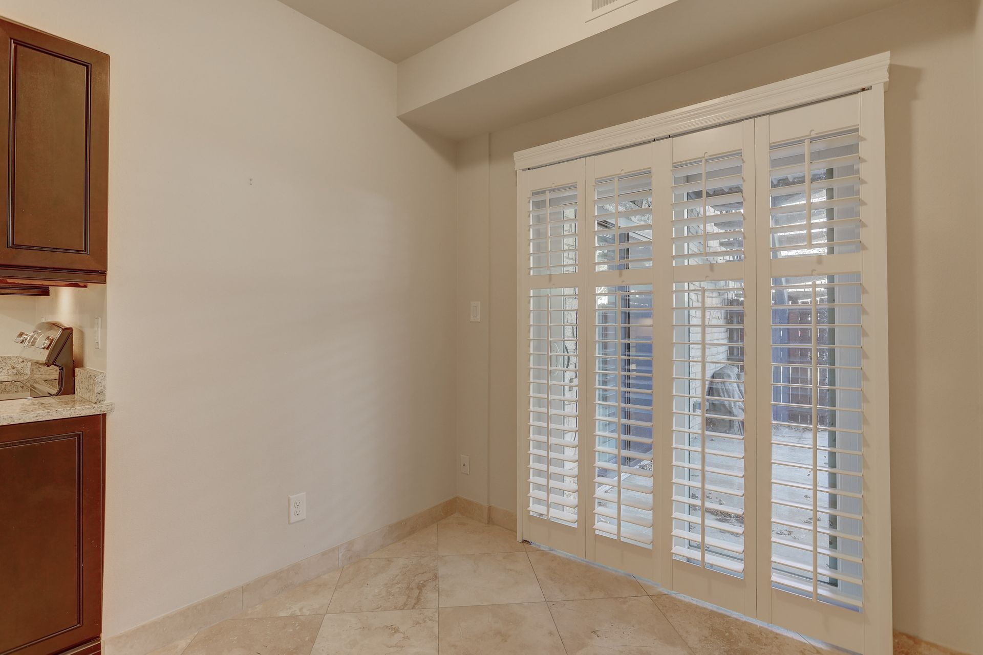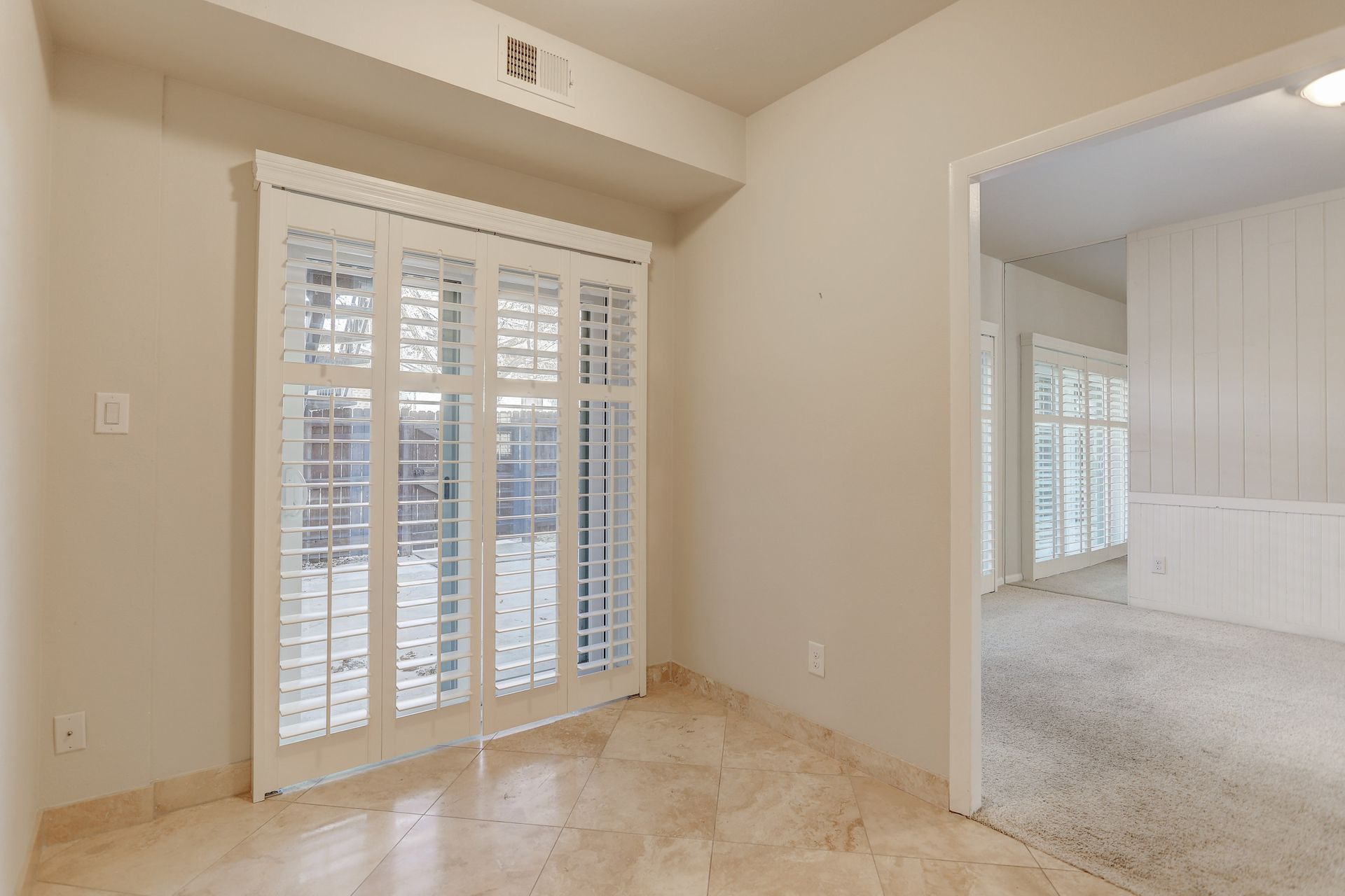 With newer doors and windows throughout, the spacious floor plan features travertine tile floors, high ceilings, plantation shutters and tons of storage space. The recently updated kitchen hosts granite counters, handsome soft-close cabinetry, stainless appliances and a bar sink. The dining room opens out to the large, covered patio.