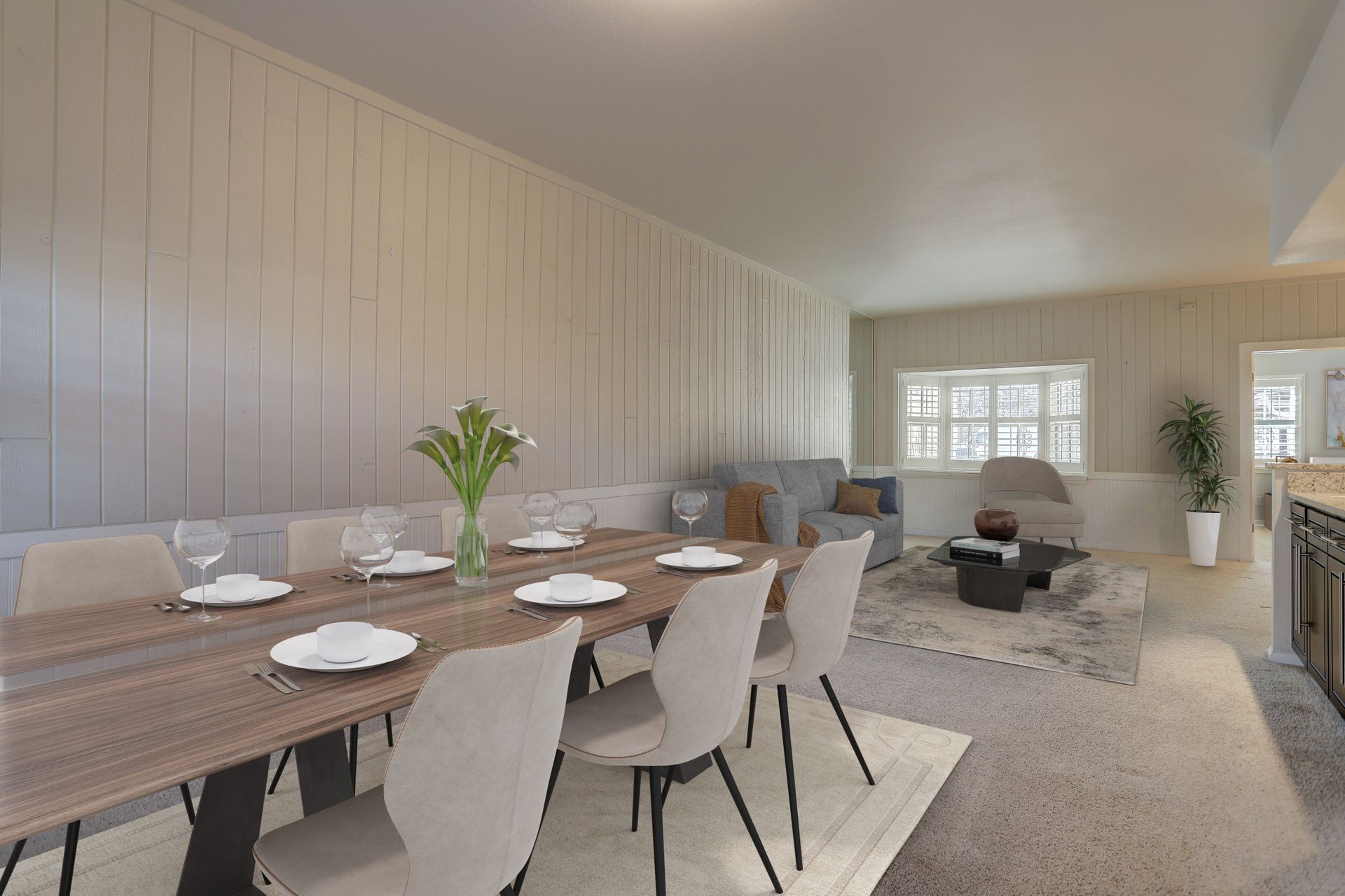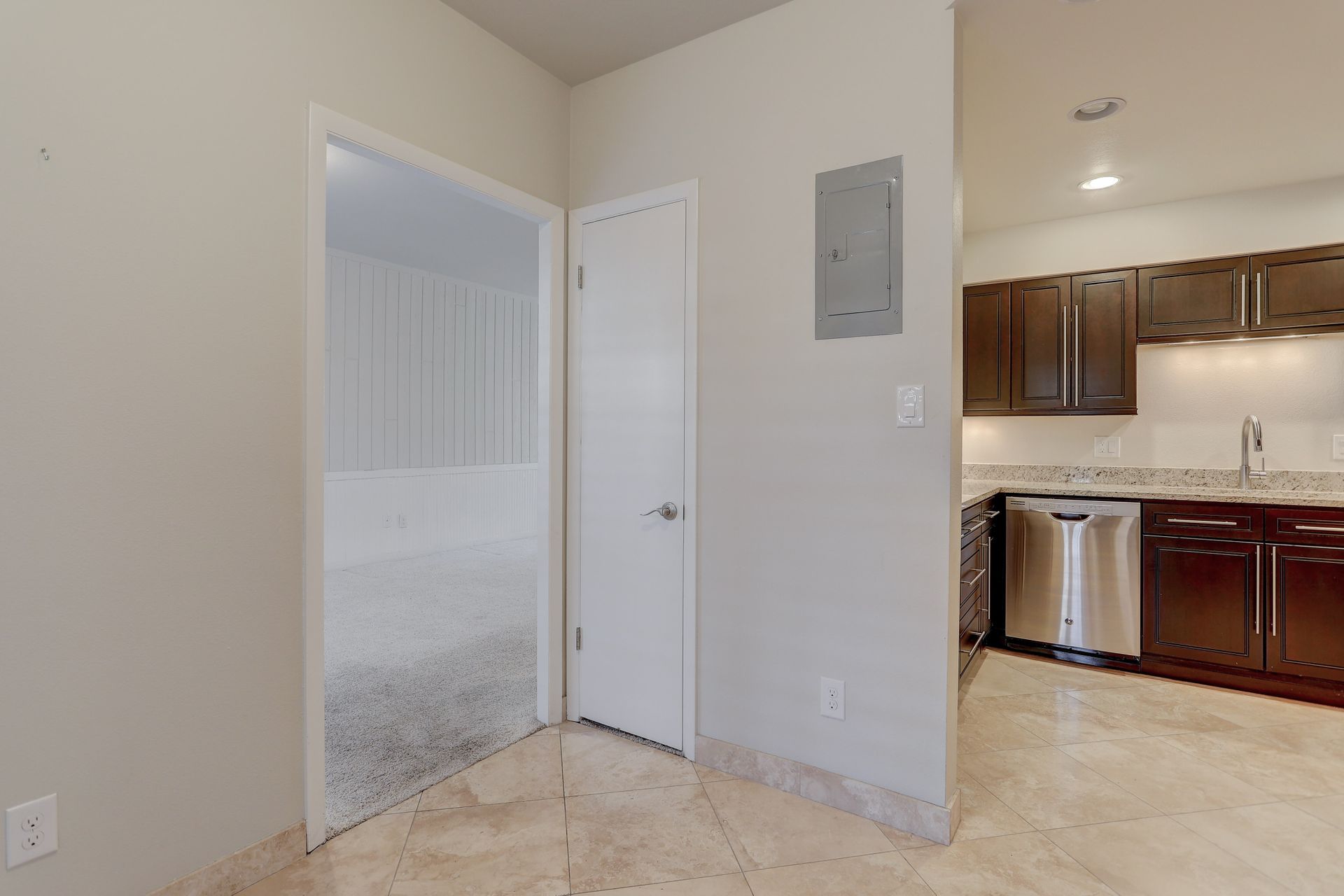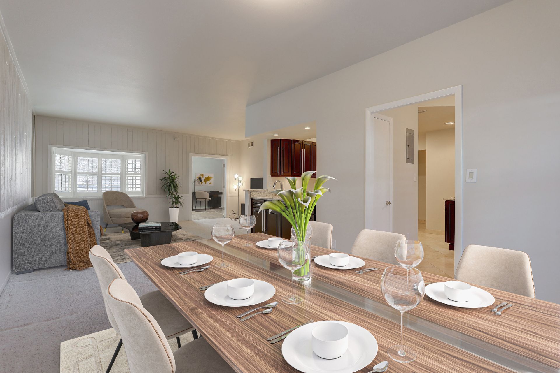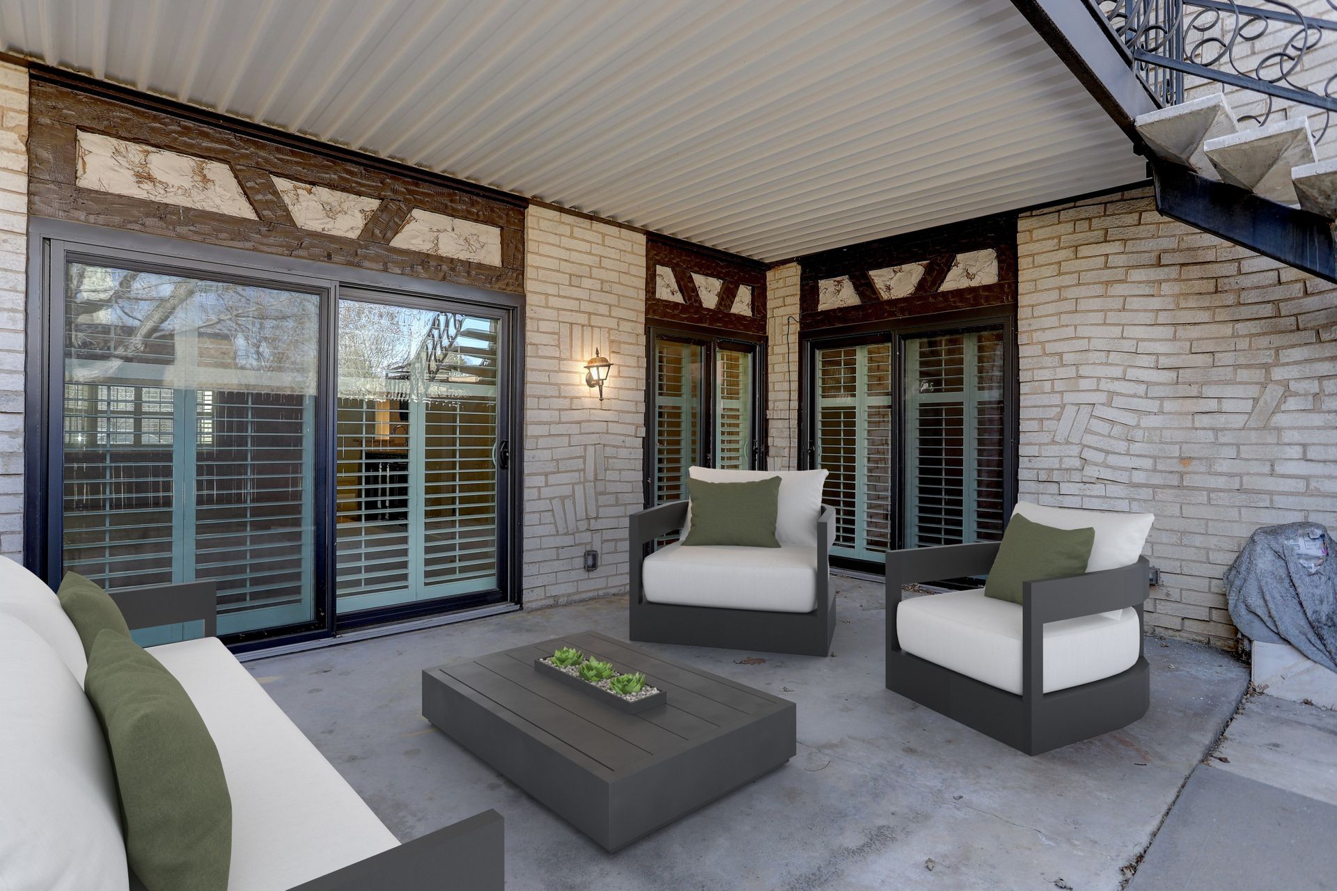 With newer doors and windows throughout, the spacious floor plan features travertine tile floors, high ceilings, plantation shutters and tons of storage space. The recently updated kitchen hosts granite counters, handsome soft-close cabinetry, stainless appliances and a bar sink. The dining room opens out to the large, covered patio.