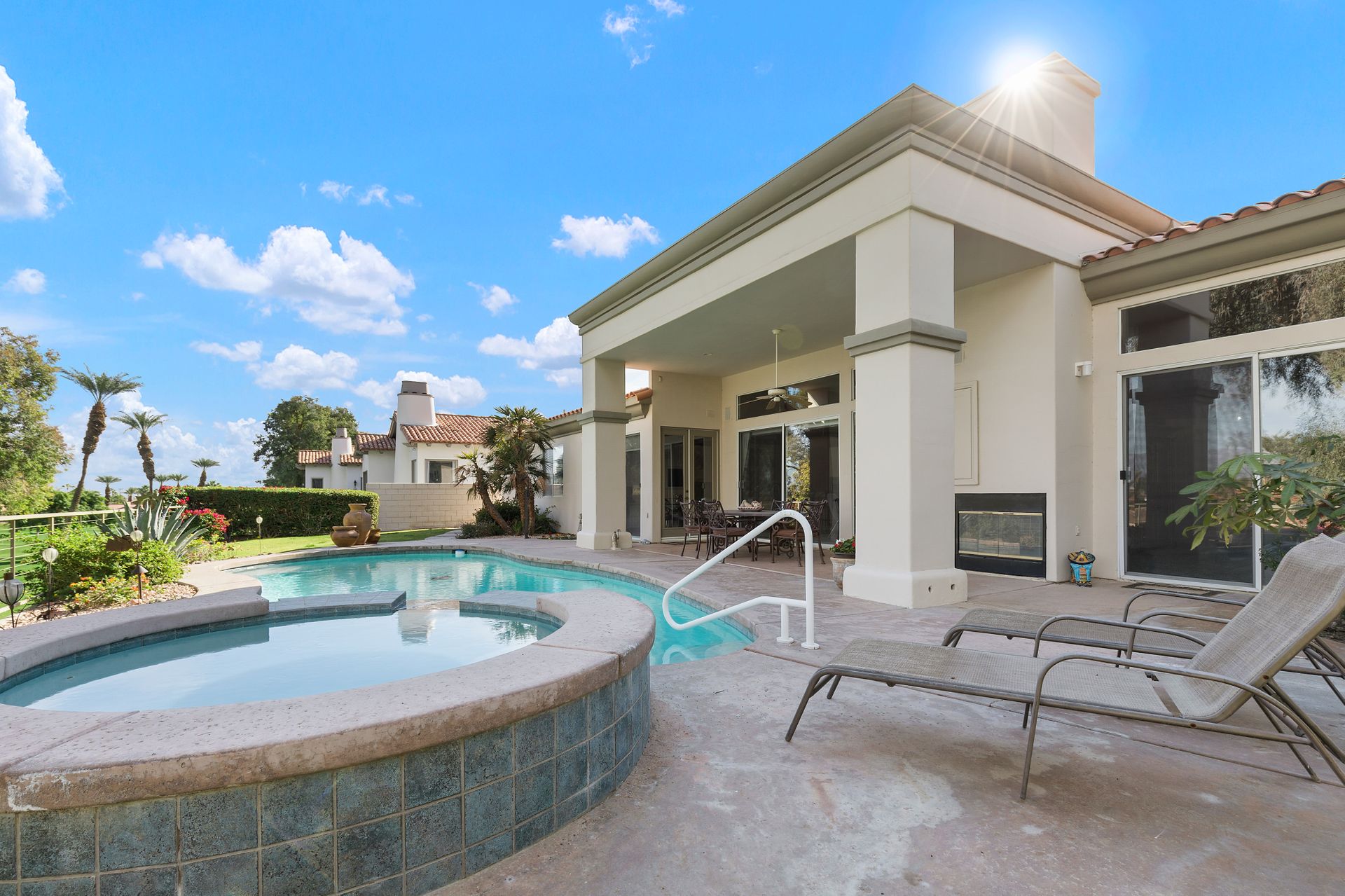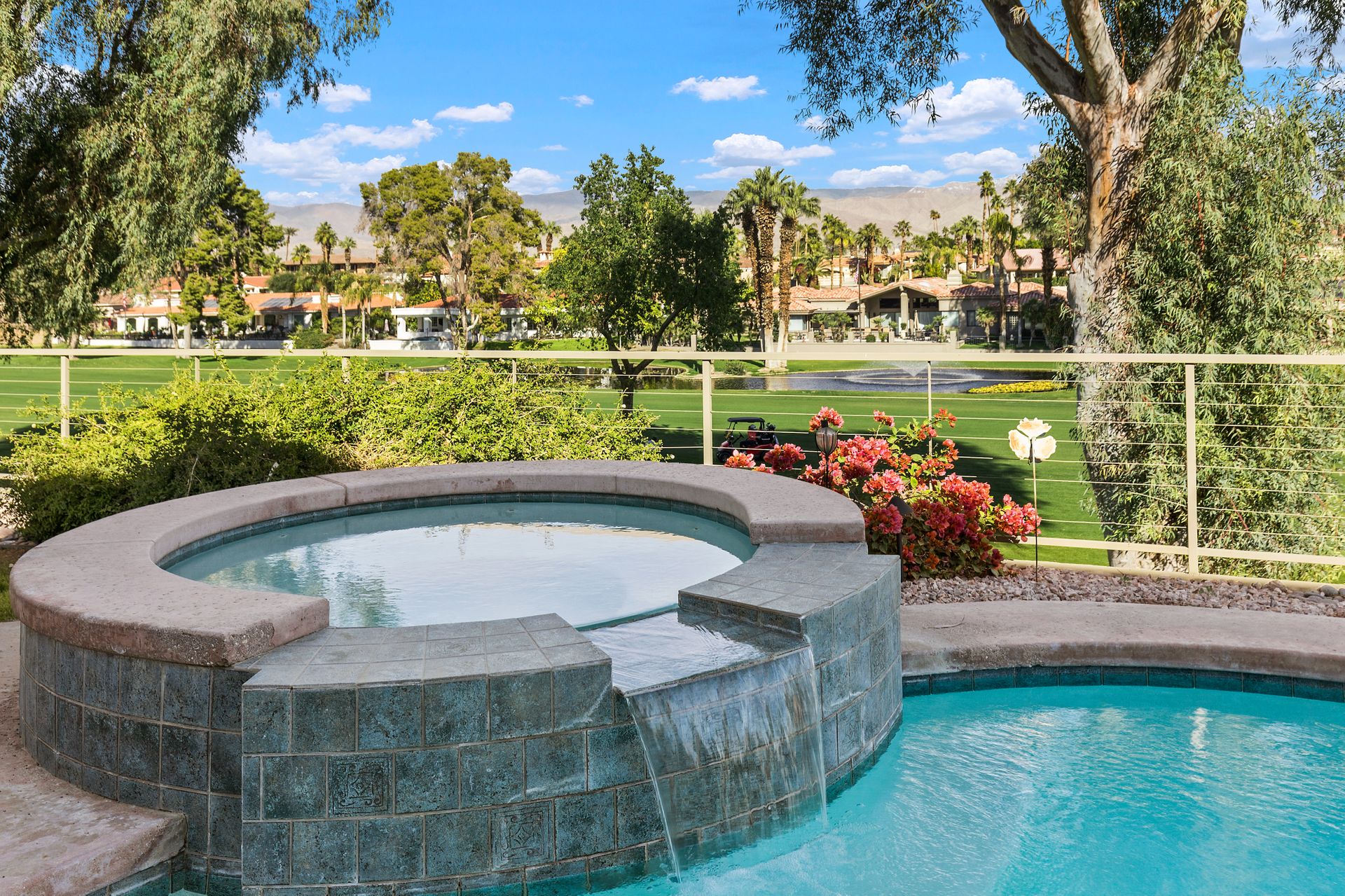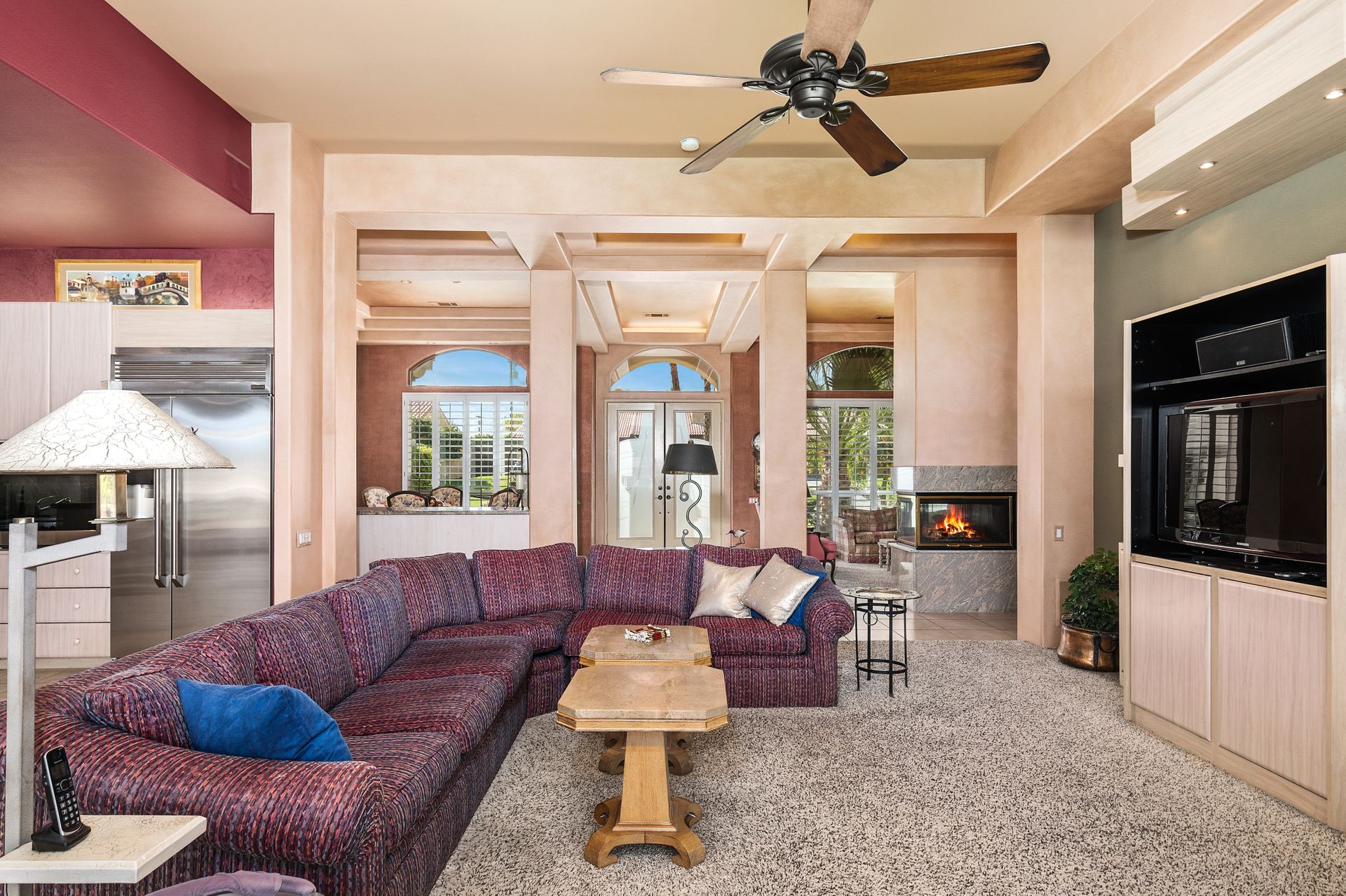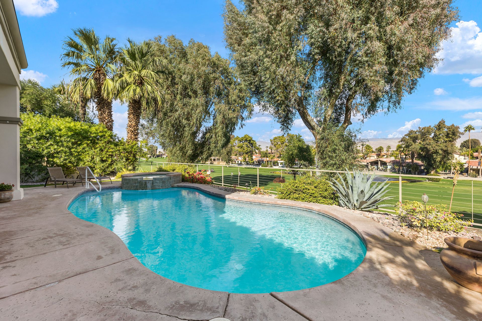 Enter through an inviting double doorway to soaring ceilings and a large open floor plan. This home is an entertainer's delight with a formal living room and dining room, an inviting bar with a wine refrigerator and ice machine, and a fabulous great room adjacent to the fabulous chef's kitchen with double ovens and double dishwashers that are all newer S/S GE Monogram Appliances. There are even two refrigerator drawers located by the six-burner gas stove to keep your most popular items cooled. Outside, enjoy the beautifully landscaped backyard highlighted by a gorgeous pool and spa and an outdoor fireplace! Enjoy your very private backyard overlooking the water feature on the fairway below! The primary suite is a welcome retreat with an extra area currently used as an office. There is a large walk-in closet, a large shower and soaking tub and marble countertops with dual sinks. The two guest bedrooms are both ensuite. The three-car garage features built-in cabinets. Low HOA of only $209 includes internet and cable TV with two boxes with Showtime and HBO with Spectrum, as well as 24-hour guard gated security. IID for lower electric, too. Come and see this home today!