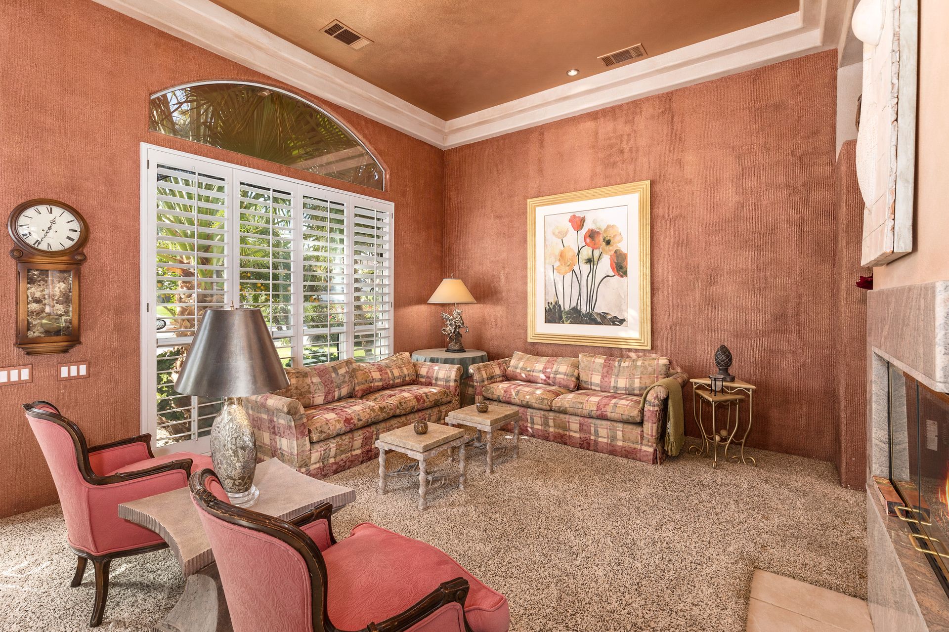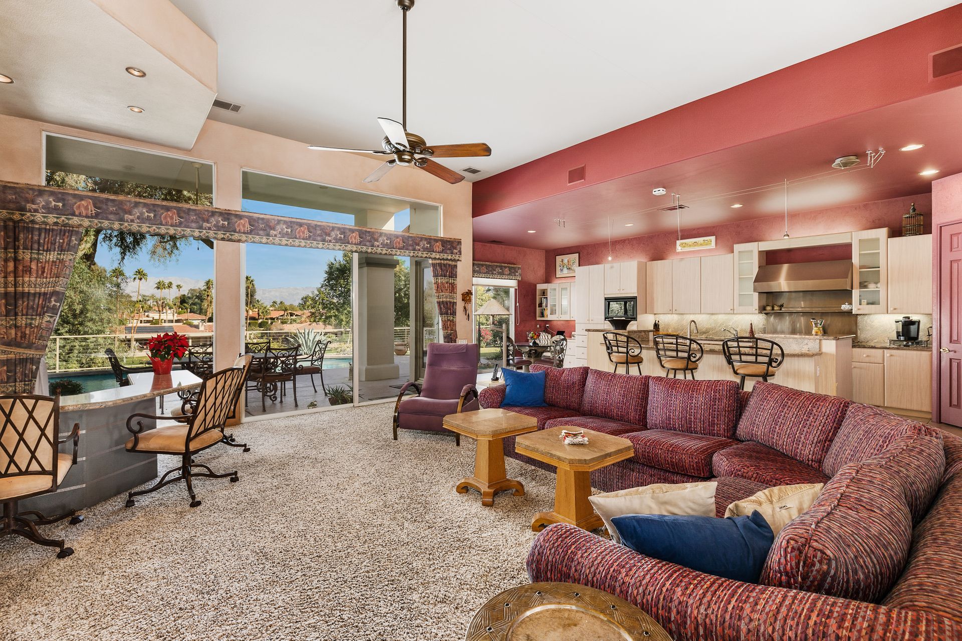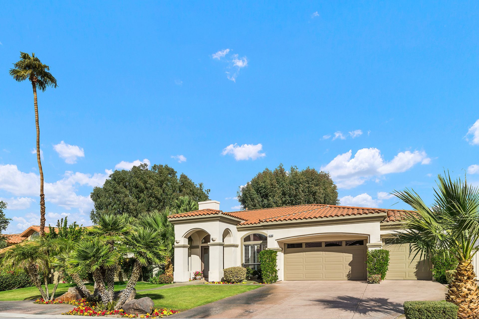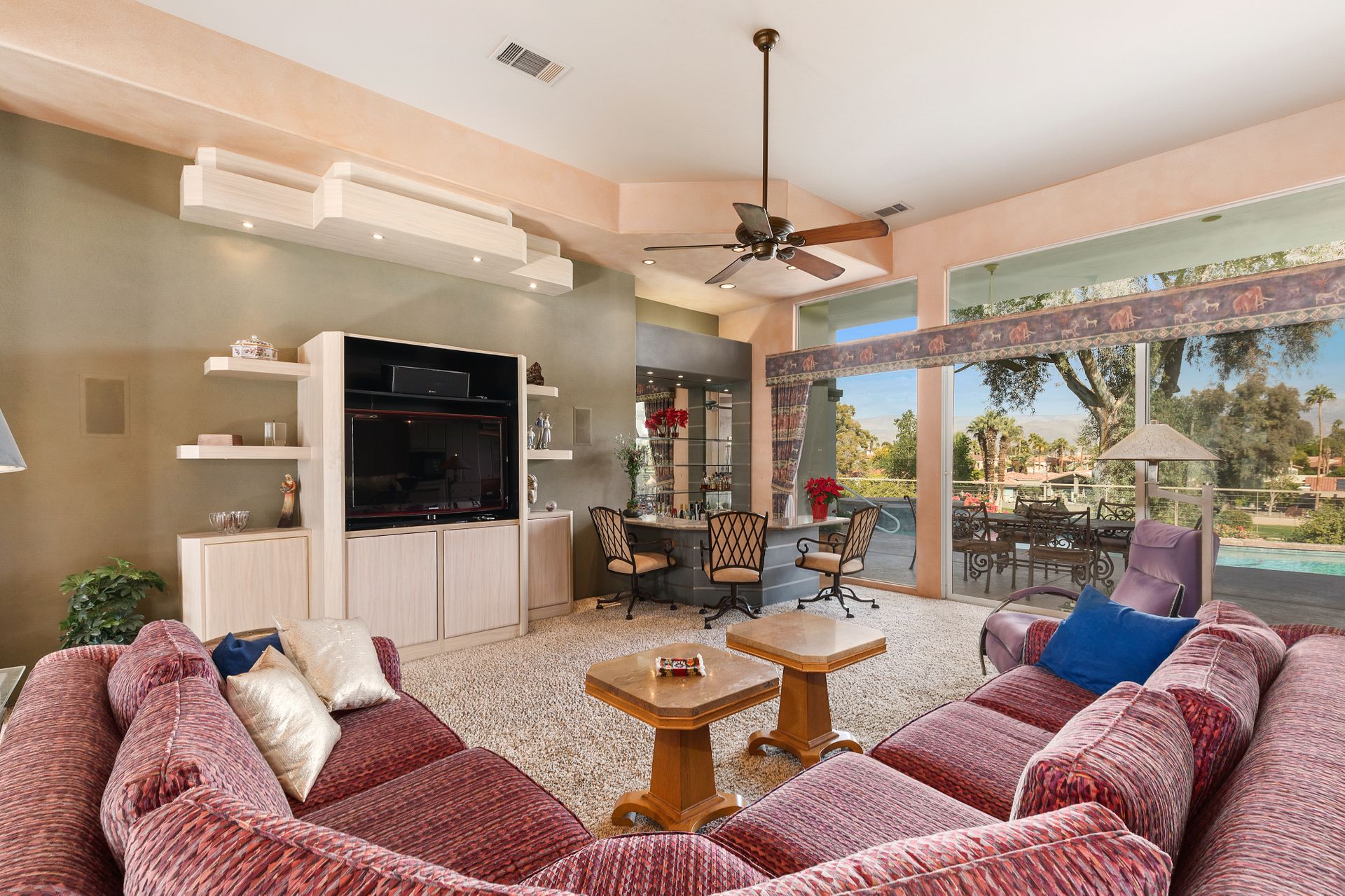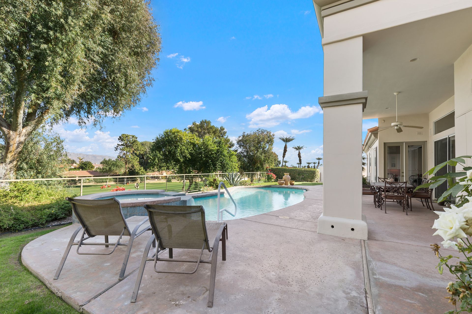 Enter through an inviting double doorway to soaring ceilings and a large open floor plan. This home is an entertainer's delight with a formal living room and dining room, an inviting bar with a wine refrigerator and ice machine, and a fabulous great room adjacent to the fabulous chef's kitchen with double ovens and double dishwashers that are all newer S/S GE Monogram Appliances. There are even two refrigerator drawers located by the six-burner gas stove to keep your most popular items cooled. Outside, enjoy the beautifully landscaped backyard highlighted by a gorgeous pool and spa and an outdoor fireplace! Enjoy your very private backyard overlooking the water feature on the fairway below! The primary suite is a welcome retreat with an extra area currently used as an office. There is a large walk-in closet, a large shower and soaking tub and marble countertops with dual sinks. The two guest bedrooms are both ensuite. The three-car garage features built-in cabinets. Low HOA of only $209 includes internet and cable TV with two boxes with Showtime and HBO with Spectrum, as well as 24-hour guard gated security. IID for lower electric, too. Come and see this home today!