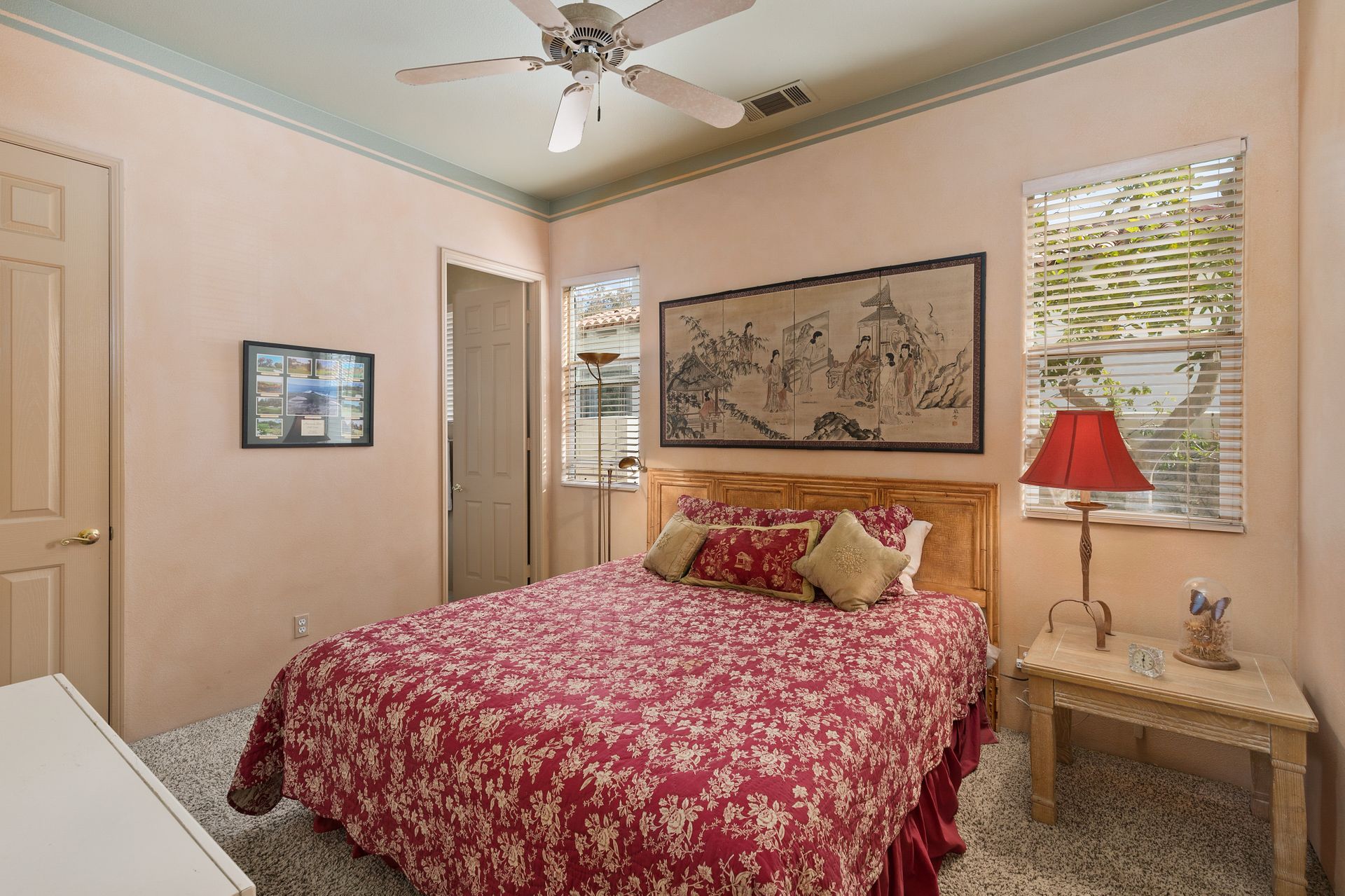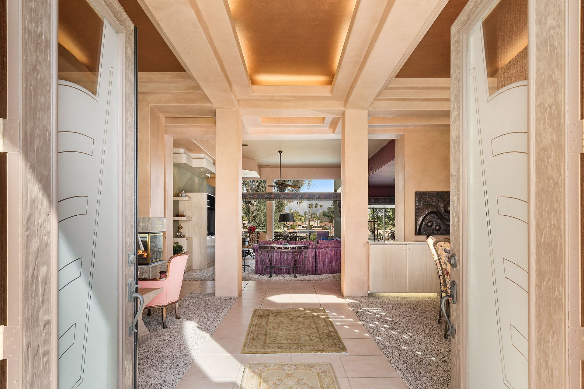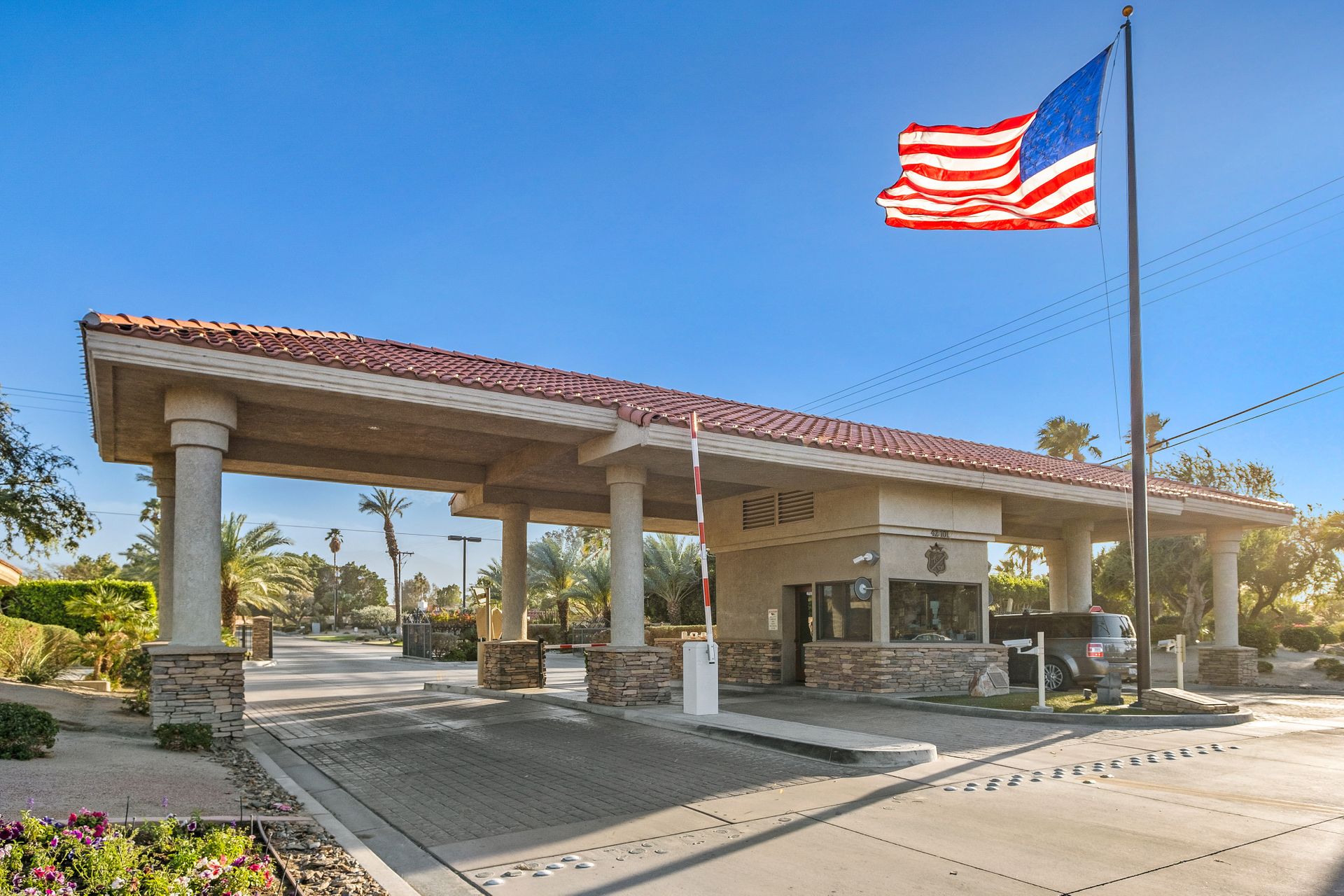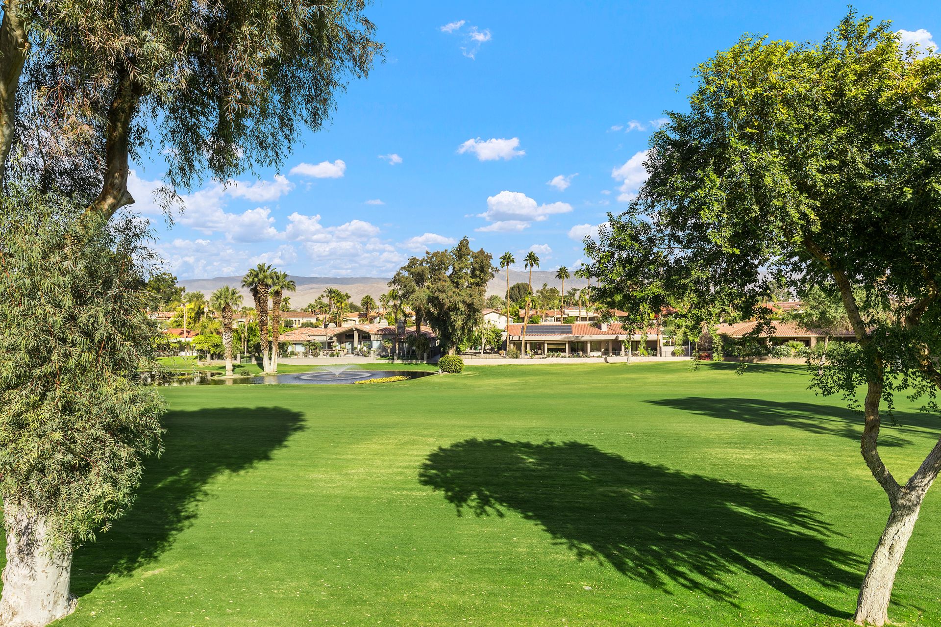 Enter through an inviting double doorway to soaring ceilings and a large open floor plan. This home is an entertainer's delight with a formal living room and dining room, an inviting bar with a wine refrigerator and ice machine, and a fabulous great room adjacent to the fabulous chef's kitchen with double ovens and double dishwashers that are all newer S/S GE Monogram Appliances. There are even two refrigerator drawers located by the six-burner gas stove to keep your most popular items cooled. Outside, enjoy the beautifully landscaped backyard highlighted by a gorgeous pool and spa and an outdoor fireplace! Enjoy your very private backyard overlooking the water feature on the fairway below! The primary suite is a welcome retreat with an extra area currently used as an office. There is a large walk-in closet, a large shower and soaking tub and marble countertops with dual sinks. The two guest bedrooms are both ensuite. The three-car garage features built-in cabinets. Low HOA of only $209 includes internet and cable TV with two boxes with Showtime and HBO with Spectrum, as well as 24-hour guard gated security. IID for lower electric, too. Come and see this home today!