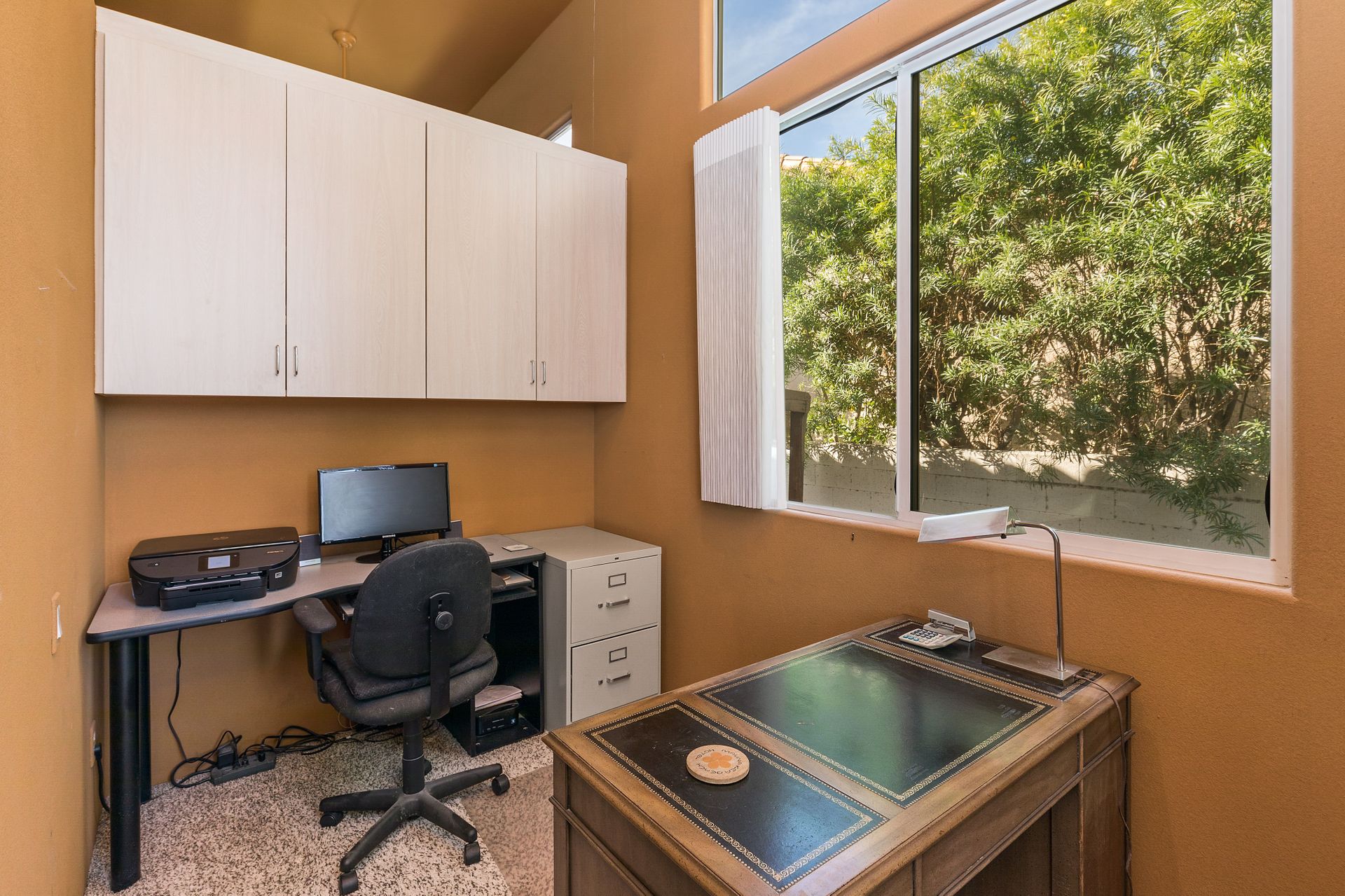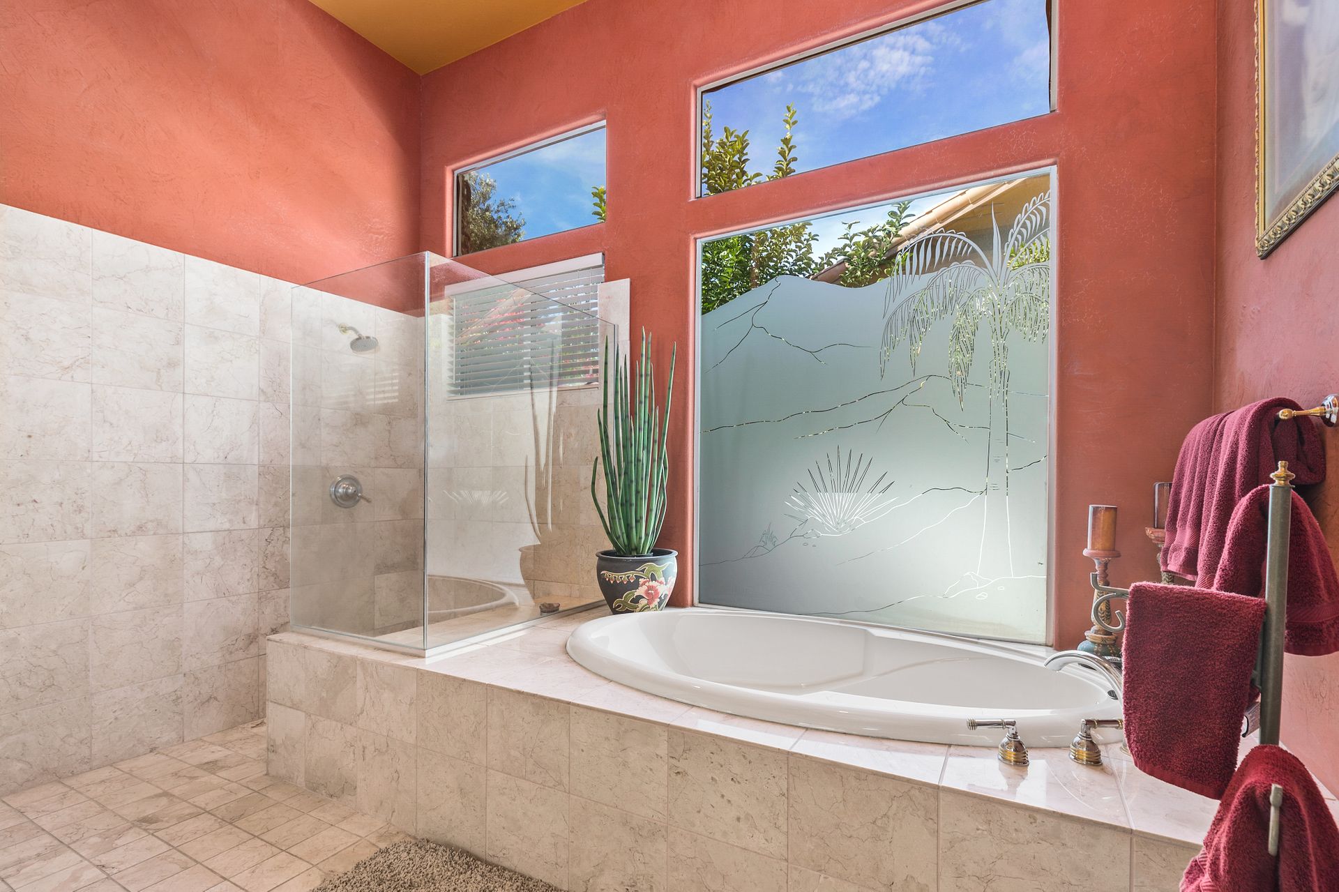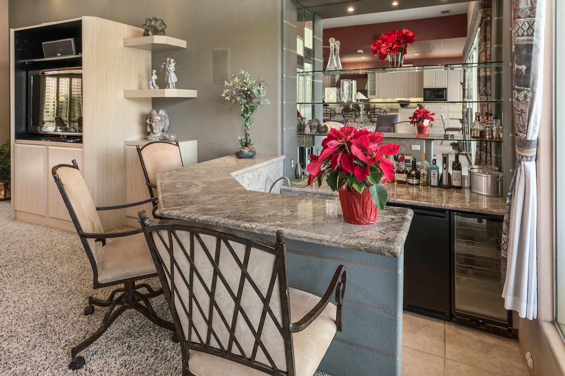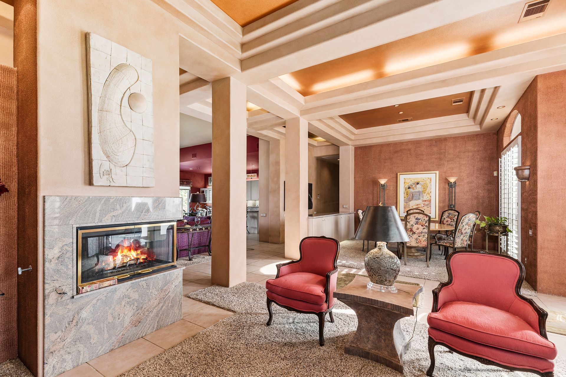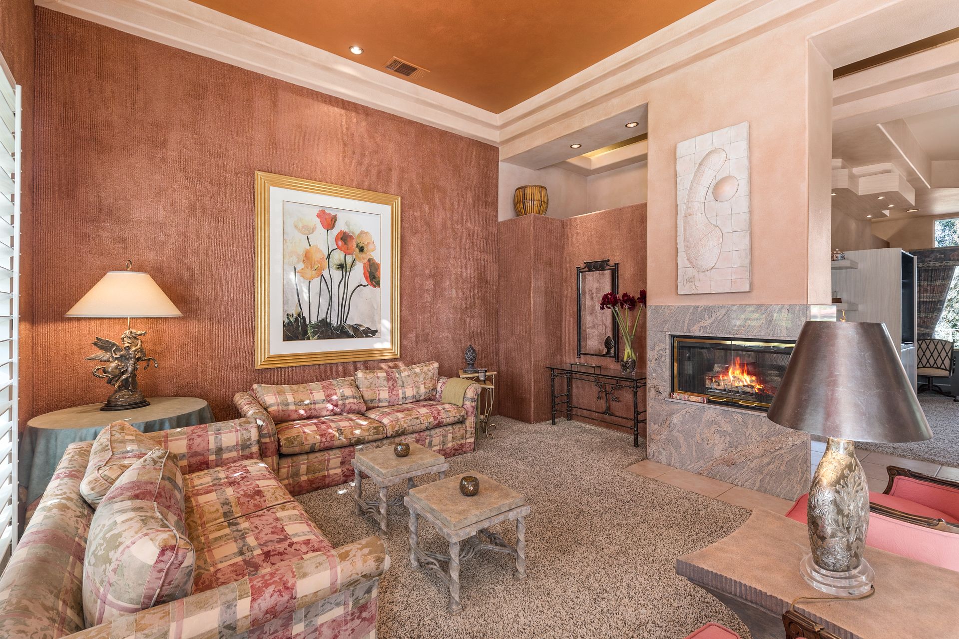 Enter through an inviting double doorway to soaring ceilings and a large open floor plan. This home is an entertainer's delight with a formal living room and dining room, an inviting bar with a wine refrigerator and ice machine, and a fabulous great room adjacent to the fabulous chef's kitchen with double ovens and double dishwashers that are all newer S/S GE Monogram Appliances. There are even two refrigerator drawers located by the six-burner gas stove to keep your most popular items cooled. Outside, enjoy the beautifully landscaped backyard highlighted by a gorgeous pool and spa and an outdoor fireplace! Enjoy your very private backyard overlooking the water feature on the fairway below! The primary suite is a welcome retreat with an extra area currently used as an office. There is a large walk-in closet, a large shower and soaking tub and marble countertops with dual sinks. The two guest bedrooms are both ensuite. The three-car garage features built-in cabinets. Low HOA of only $209 includes internet and cable TV with two boxes with Showtime and HBO with Spectrum, as well as 24-hour guard gated security. IID for lower electric, too. Come and see this home today!