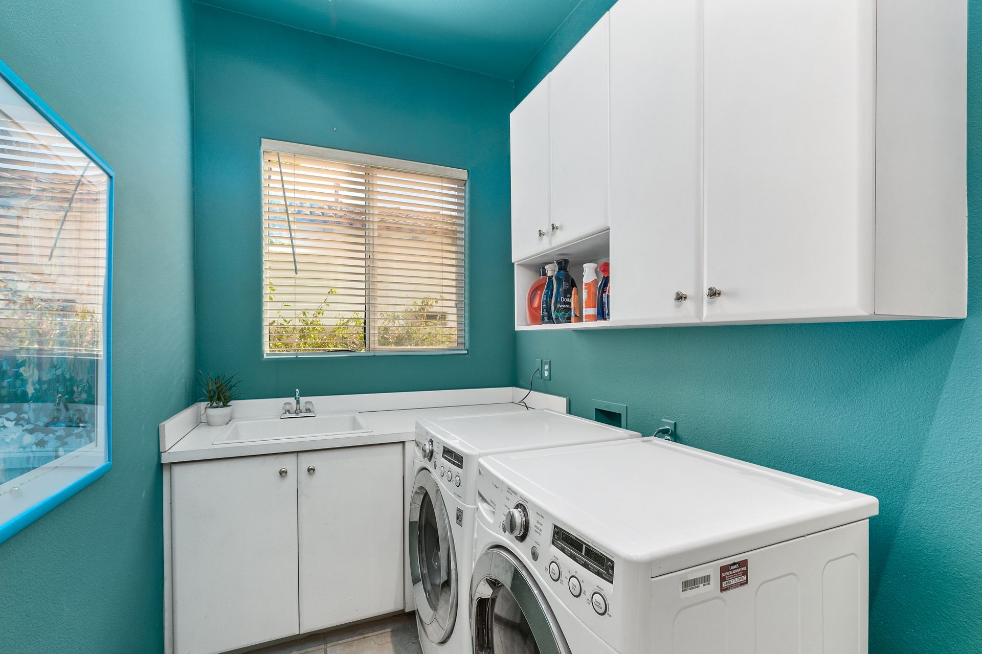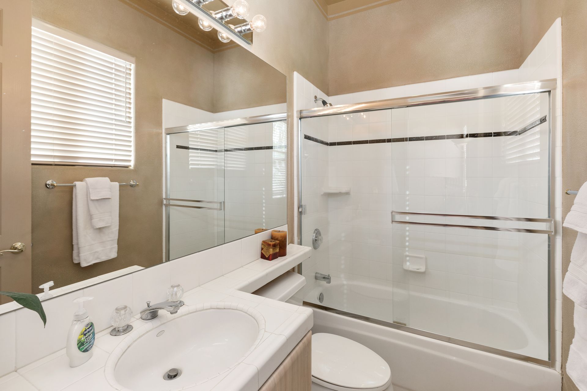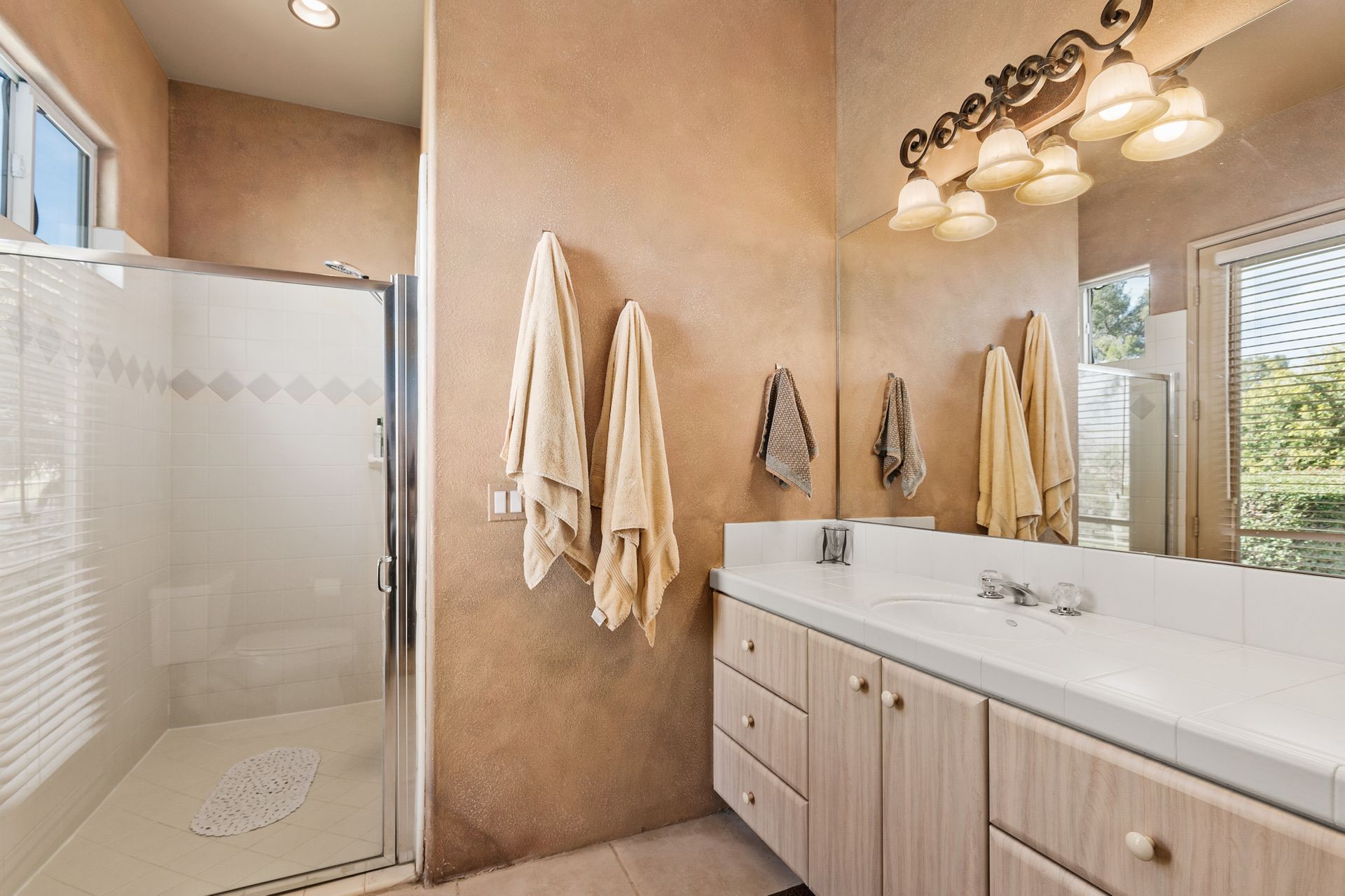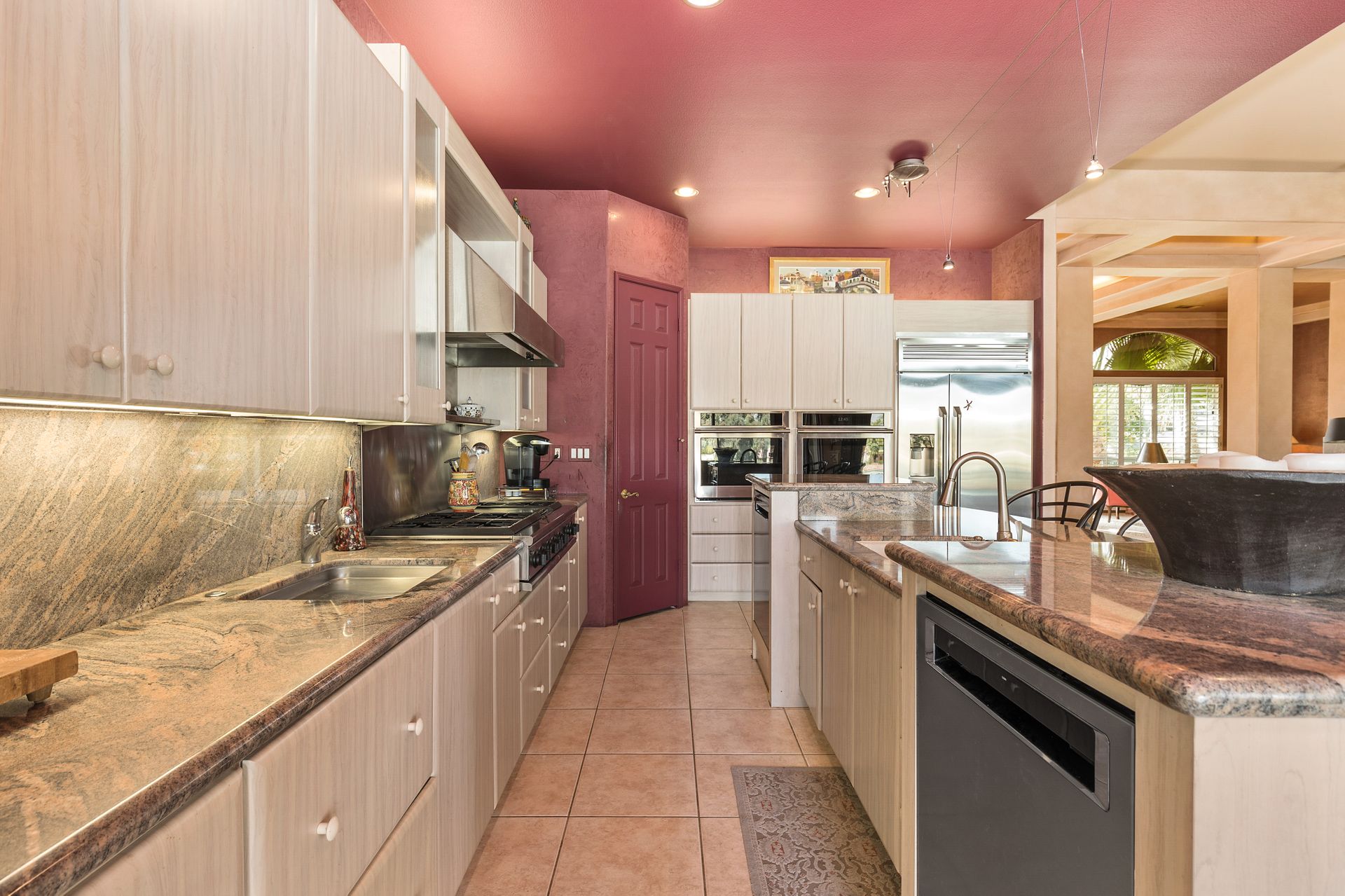 Enter through an inviting double doorway to soaring ceilings and a large open floor plan. This home is an entertainer's delight with a formal living room and dining room, an inviting bar with a wine refrigerator and ice machine, and a fabulous great room adjacent to the fabulous chef's kitchen with double ovens and double dishwashers that are all newer S/S GE Monogram Appliances. There are even two refrigerator drawers located by the six-burner gas stove to keep your most popular items cooled. Outside, enjoy the beautifully landscaped backyard highlighted by a gorgeous pool and spa and an outdoor fireplace! Enjoy your very private backyard overlooking the water feature on the fairway below! The primary suite is a welcome retreat with an extra area currently used as an office. There is a large walk-in closet, a large shower and soaking tub and marble countertops with dual sinks. The two guest bedrooms are both ensuite. The three-car garage features built-in cabinets. Low HOA of only $209 includes internet and cable TV with two boxes with Showtime and HBO with Spectrum, as well as 24-hour guard gated security. IID for lower electric, too. Come and see this home today!