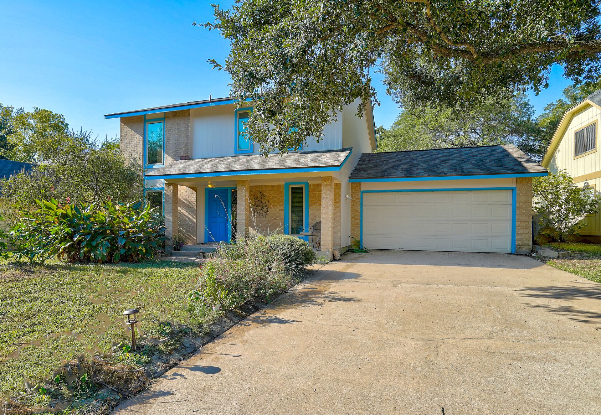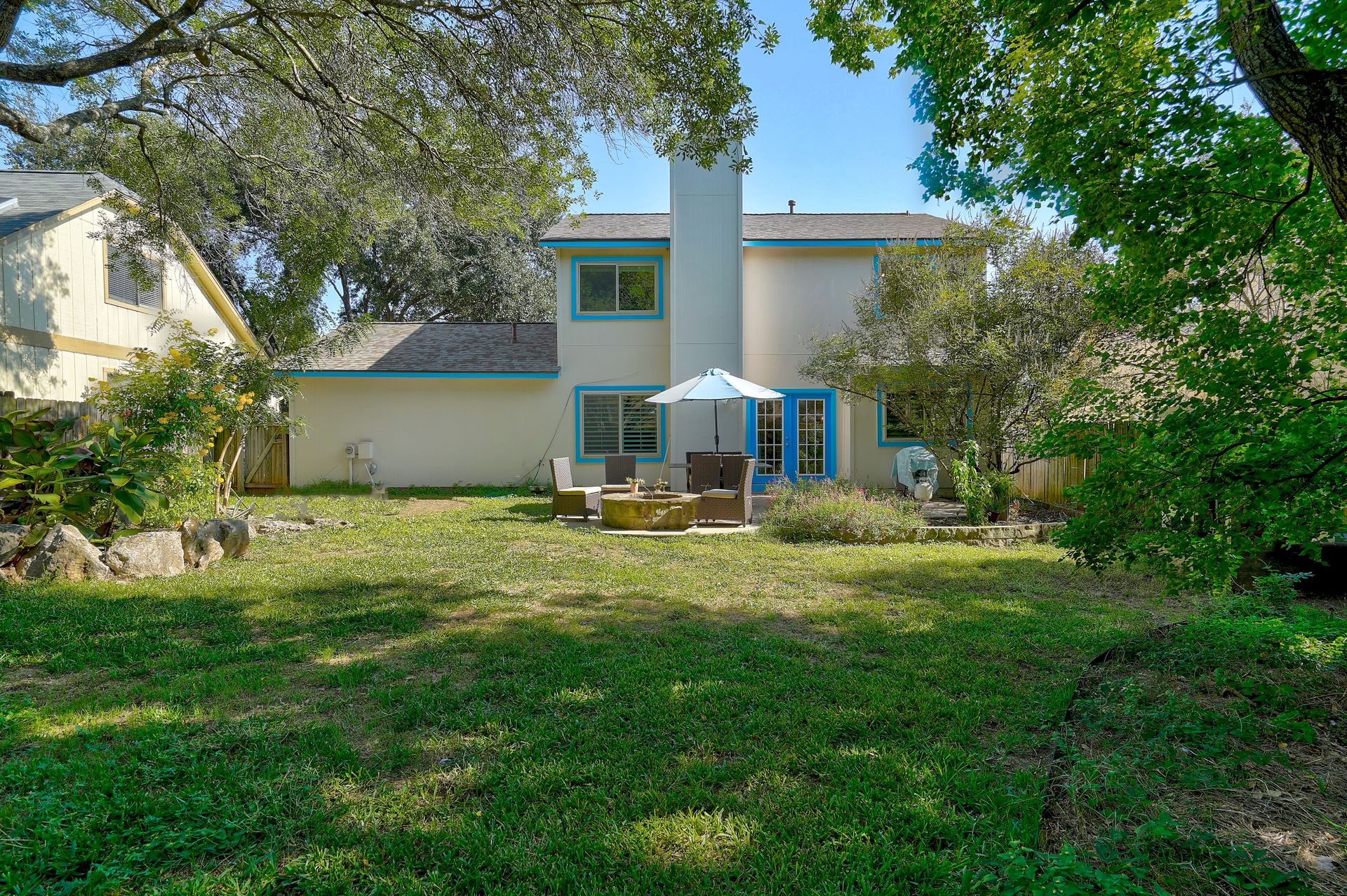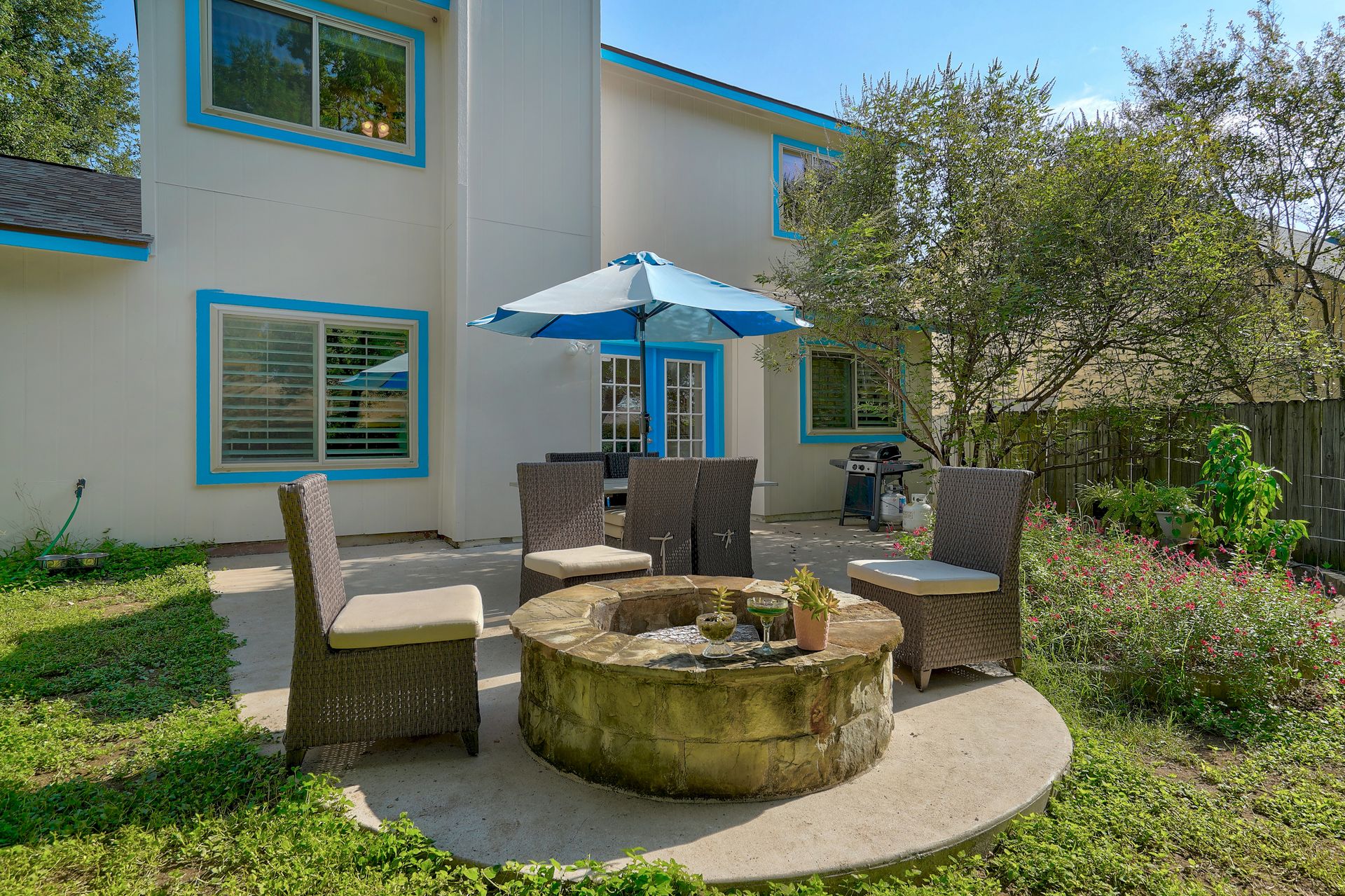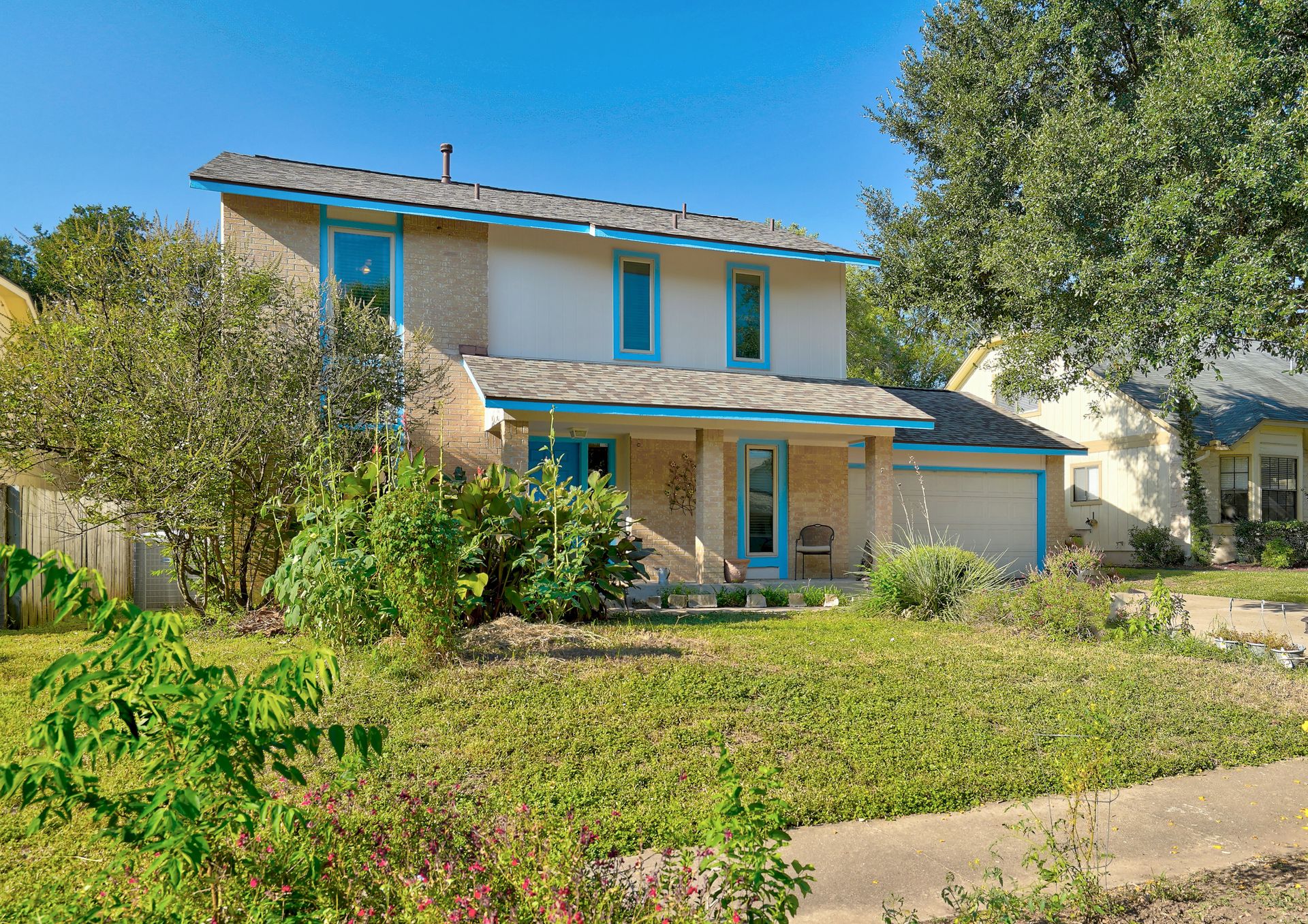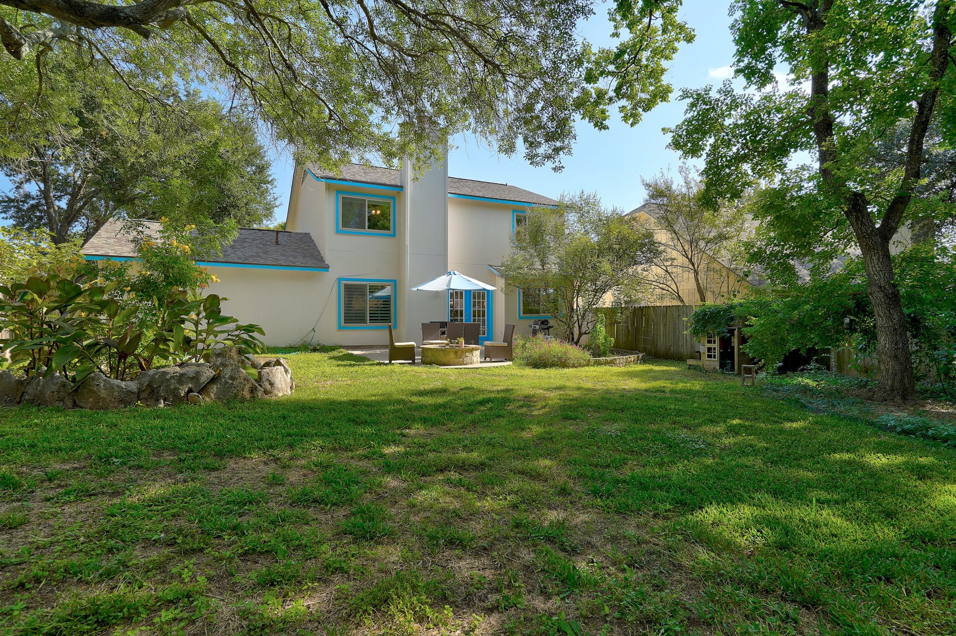 Cute as a button two-story home in Mesa Park with Robin's egg blue trim located just minutes from the Domain, Arboretum and Quarry Lake with easy access to Mopac/183. The home boasts an open floorplan downstairs with a cohesive living/dining area and a kitchen complete with a gourmet bar, stainless steel appliances, oversized cabinets, pot drawers and vent hood, perfect for the stay at home chef. You will enjoy the view of the spacious tree-lined backyard, landscaped with native plants, and the patio with stone firepit through the beautiful Plantation shutters. Many structural updates throughout, including a wall of windows and double French doors which provide loads of natural light, an inviting brick fireplace with raised hearth in living area and recently installed carpet upstairs! All of the fun, bright-colored bedrooms are located upstairs, along with a King-sized great room with attached bath. There is also a bonus half bath downstairs. Exemplary schools include Davis Elementary, Murchison MS and Anderson HS. It is a perfect place to call home!!