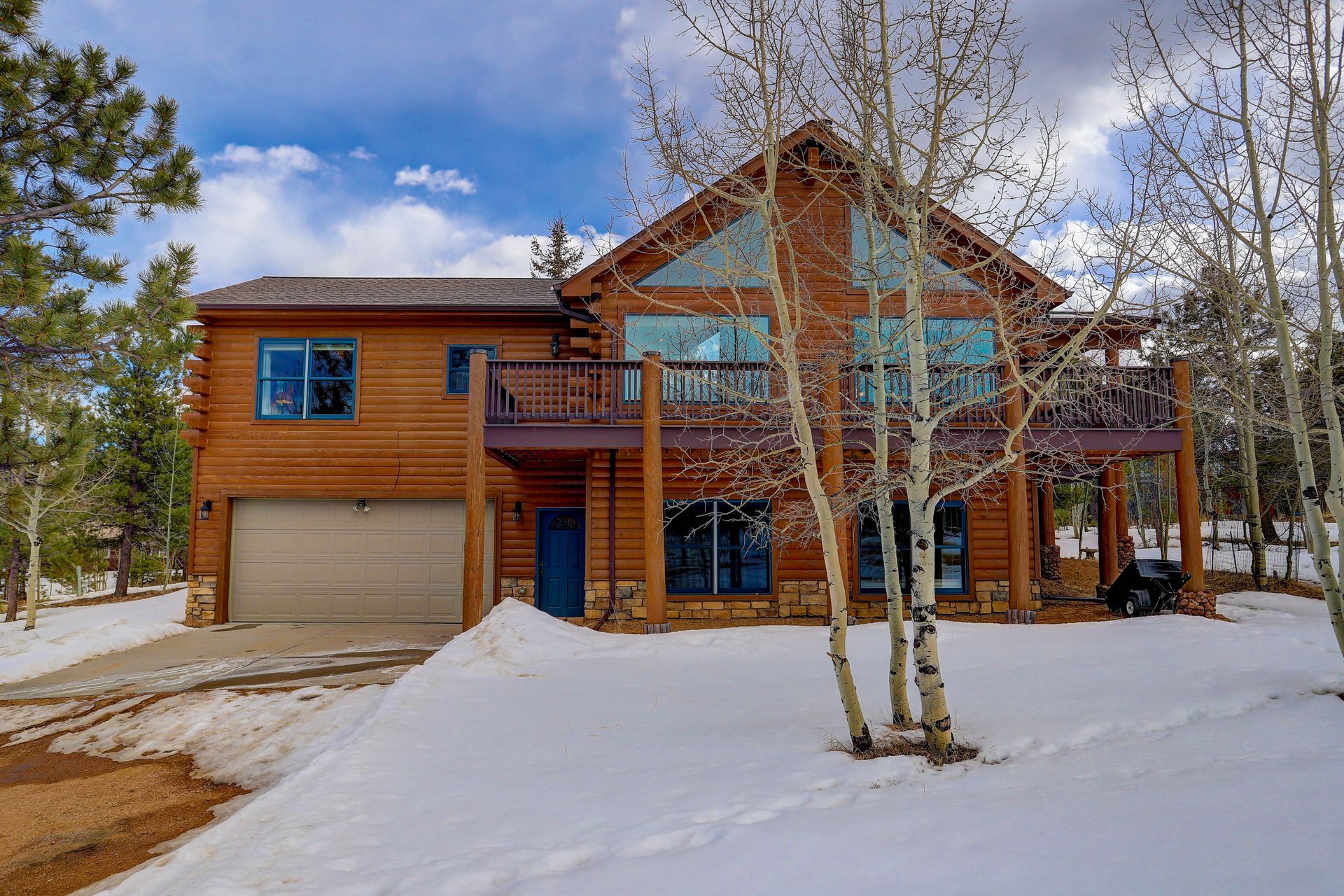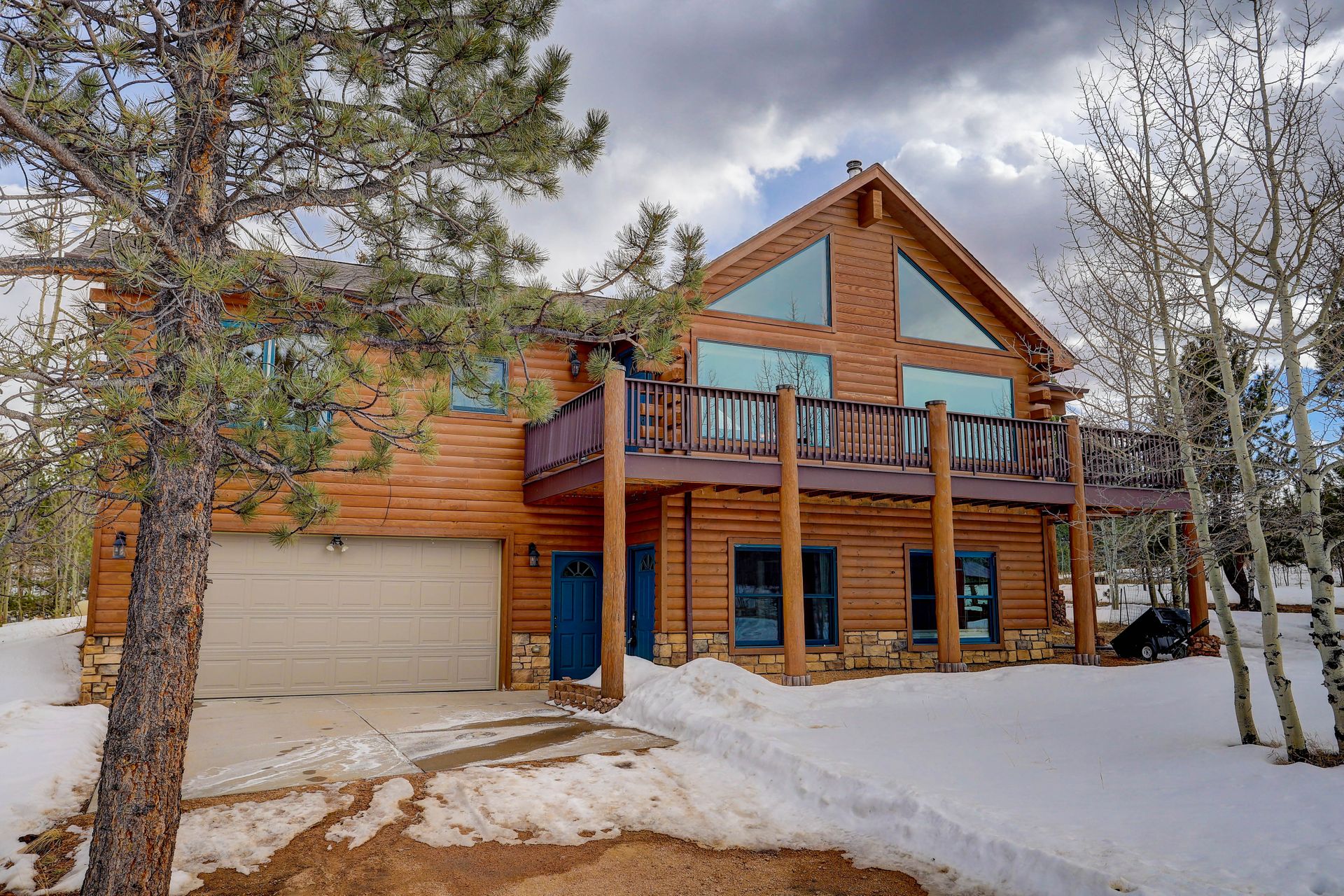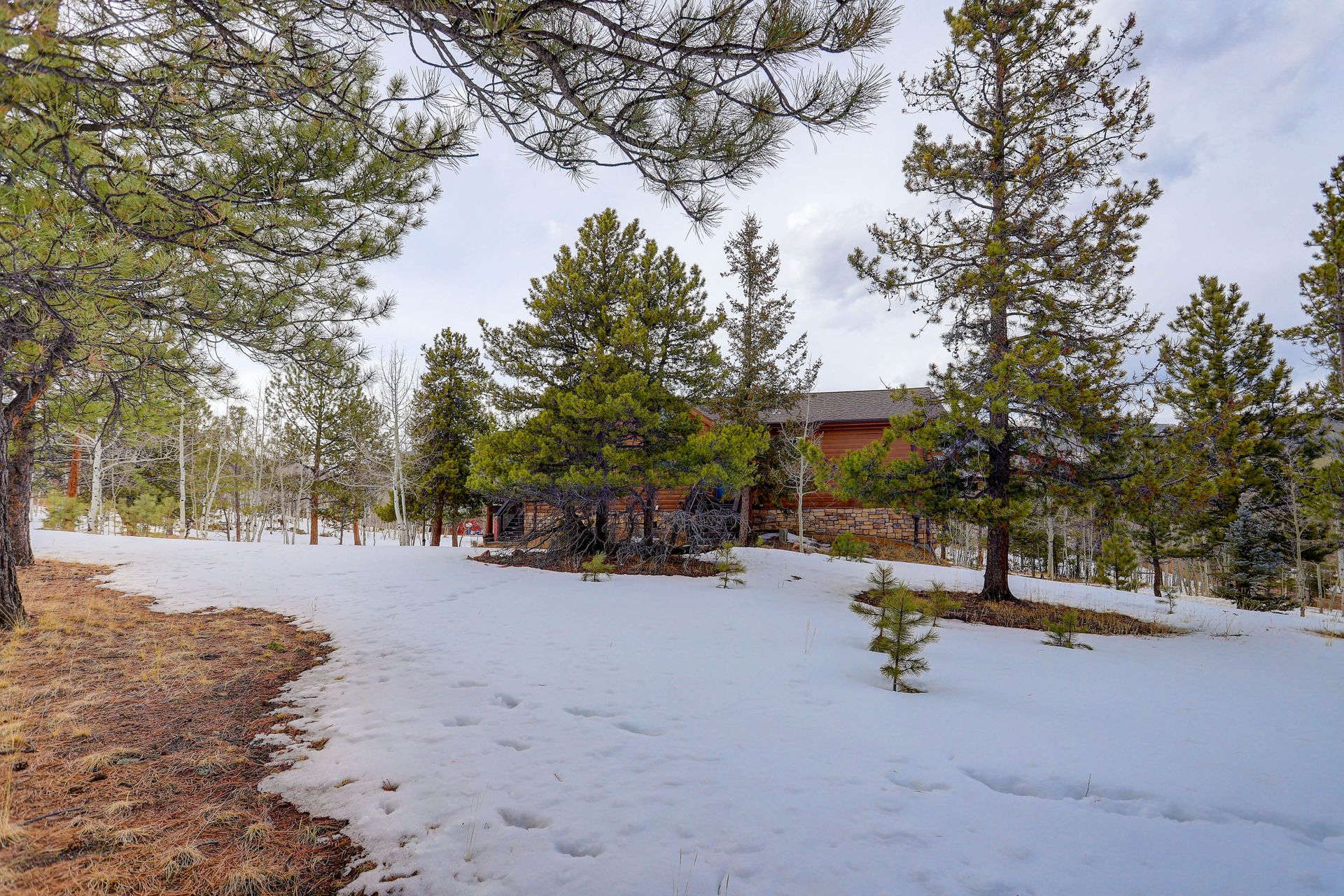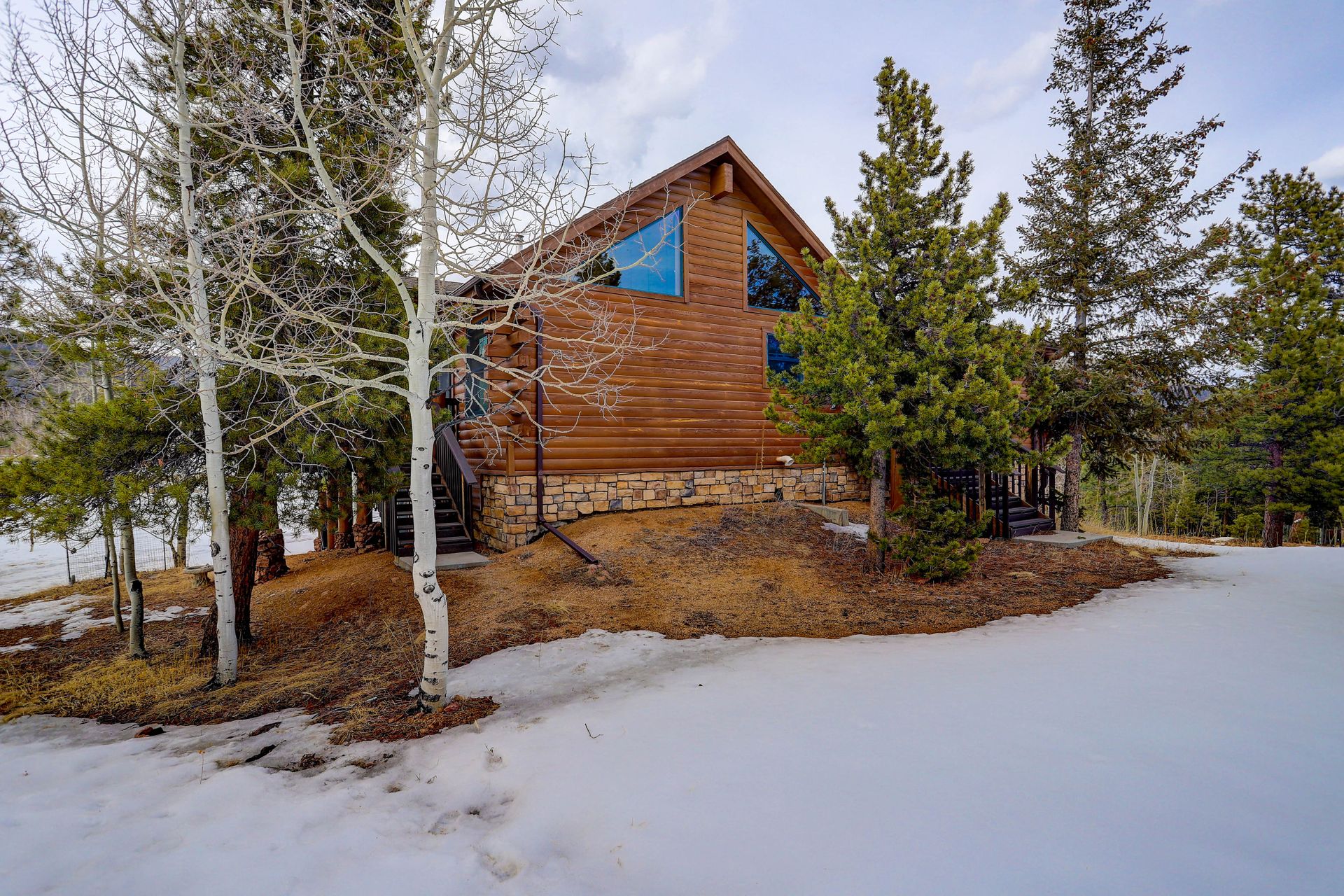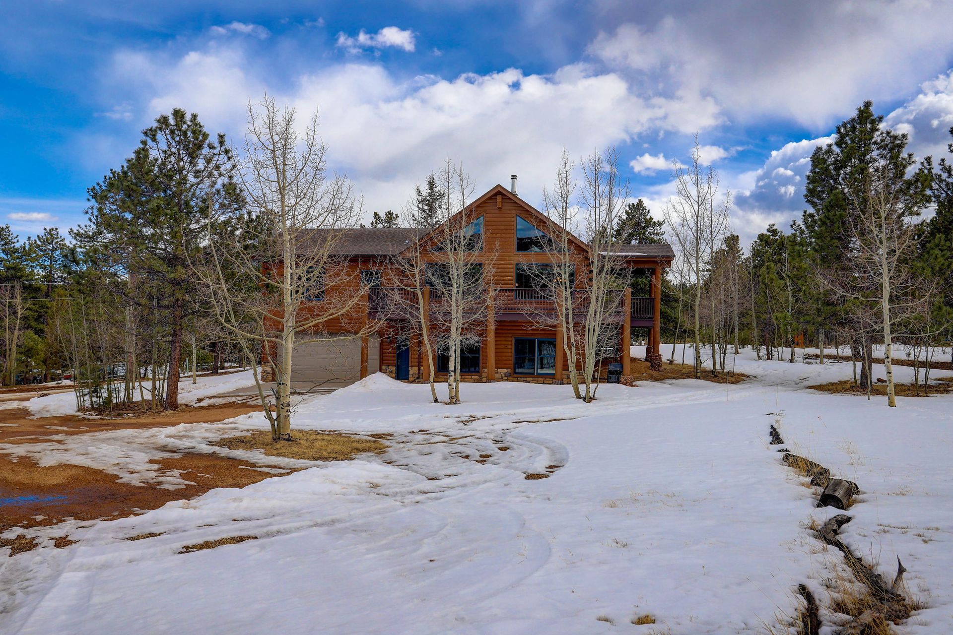 Looking out to the Pike National Forest and Mt Evans Wilderness you’ll have snowcapped views from Mt Logan to Rosalie Peak from your vaulted great room. Towering beetle killed pine ceilings, oak and tile floors, turquoise cabinets, quartz counters and a brick hearth with wood stove accent this living, dining and kitchen space. The engineered logs make for an incredibly solid home and provide that mountain rustic feel that you move here to find. Immaculately maintained and ready for immediate occupancy you can be home before the spring flowers arrive. The wrap around deck is low maintenance so you’ll only need to enjoy the stars, sun and views. The acre lot is flat to gently sloping and graced with pines, aspen and meadow. The HOA is voluntary but for a small annual fee you will have access to stocked trout ponds for summer or winter fun. There are even horse facilities that may have room for your “ride”. Recreational opportunities are endless and begin minutes from your front door.