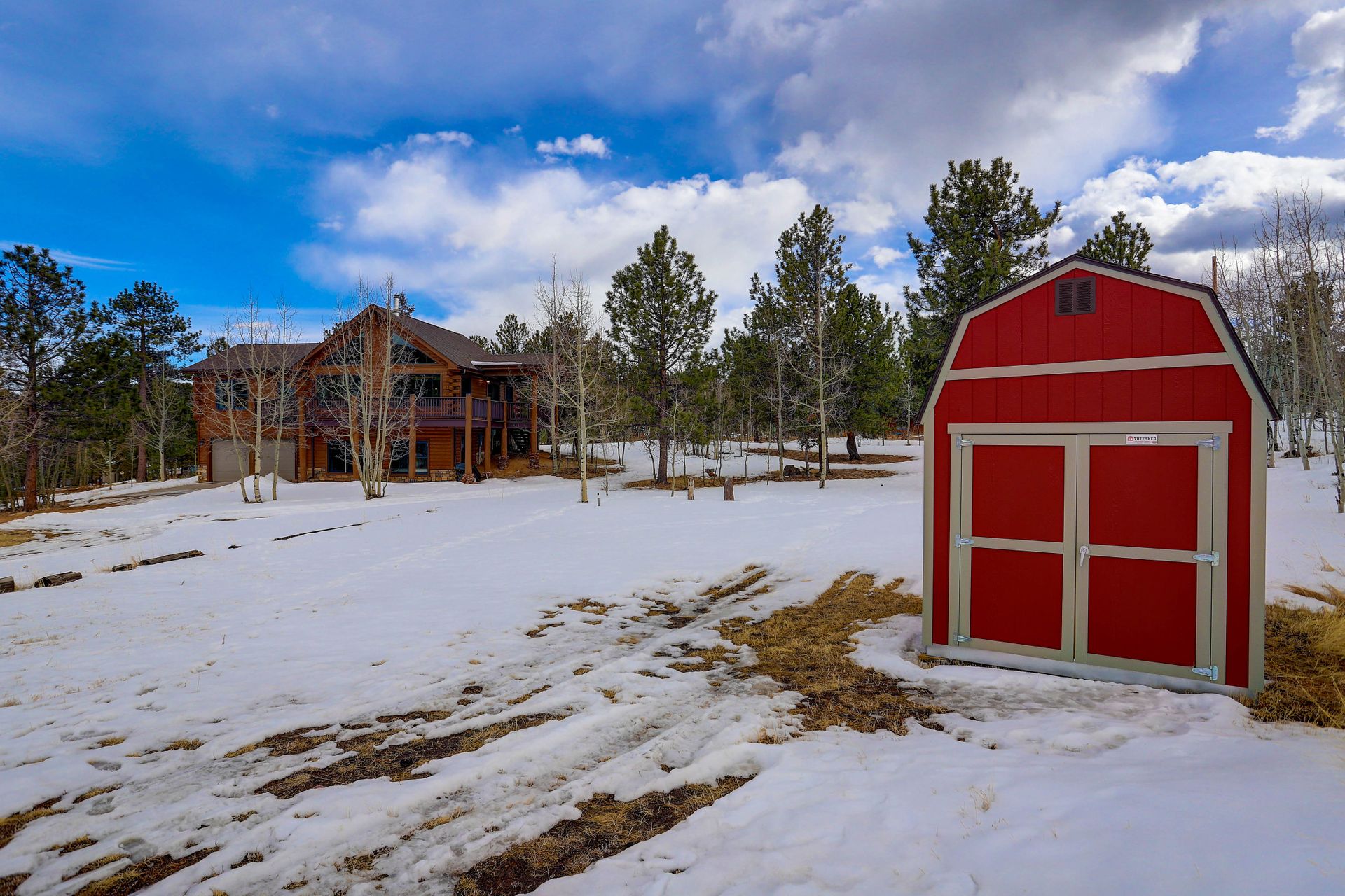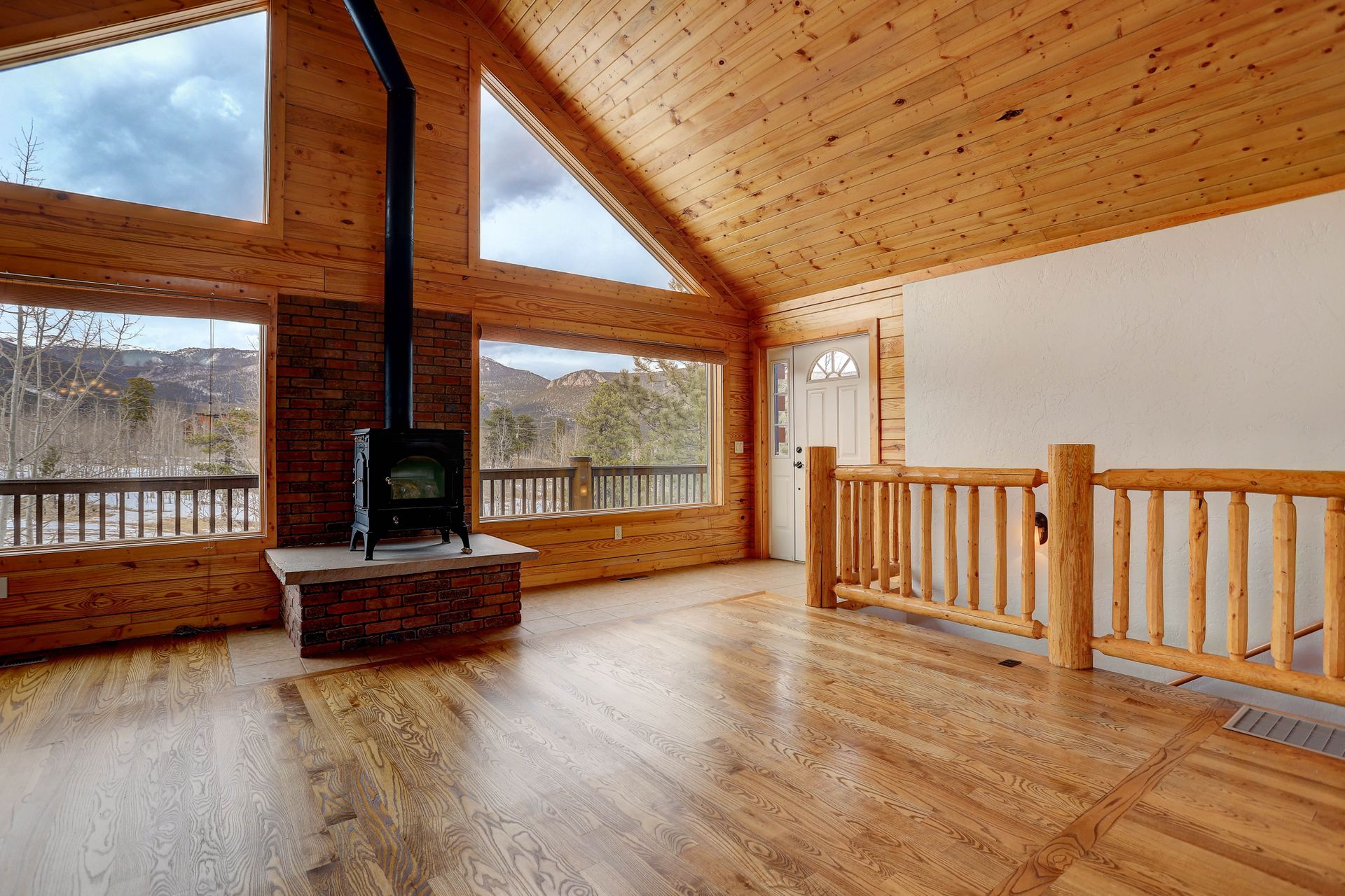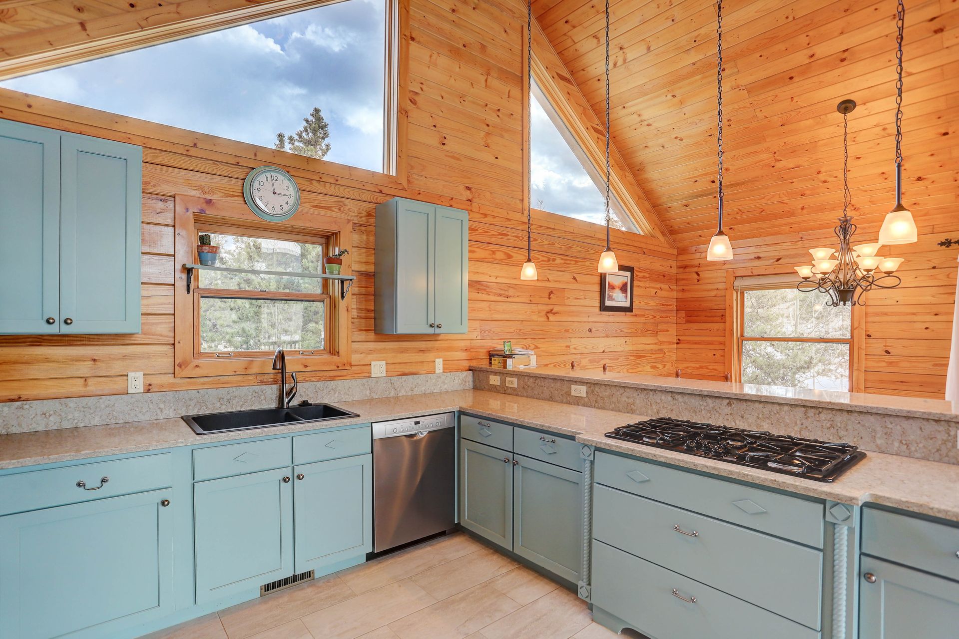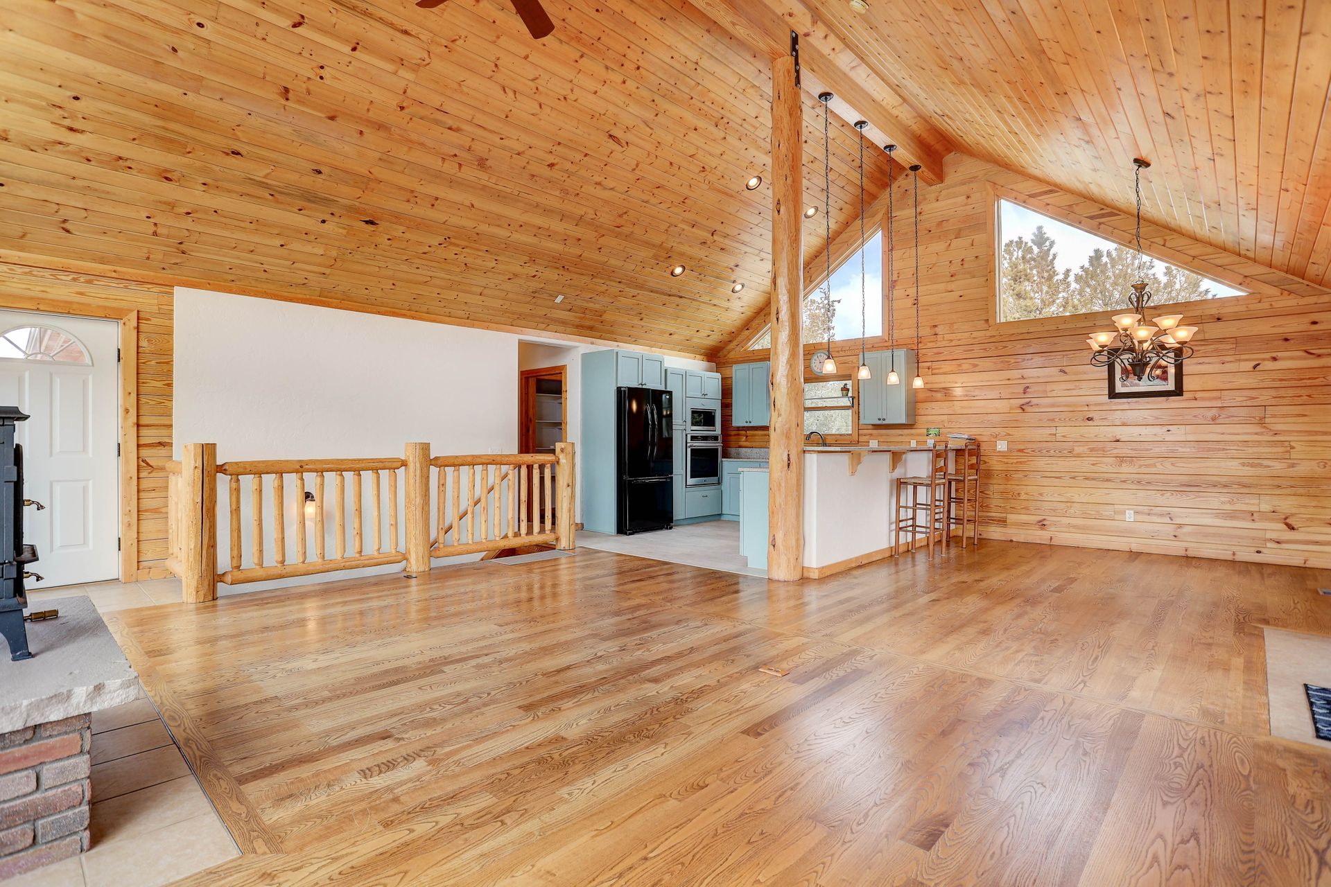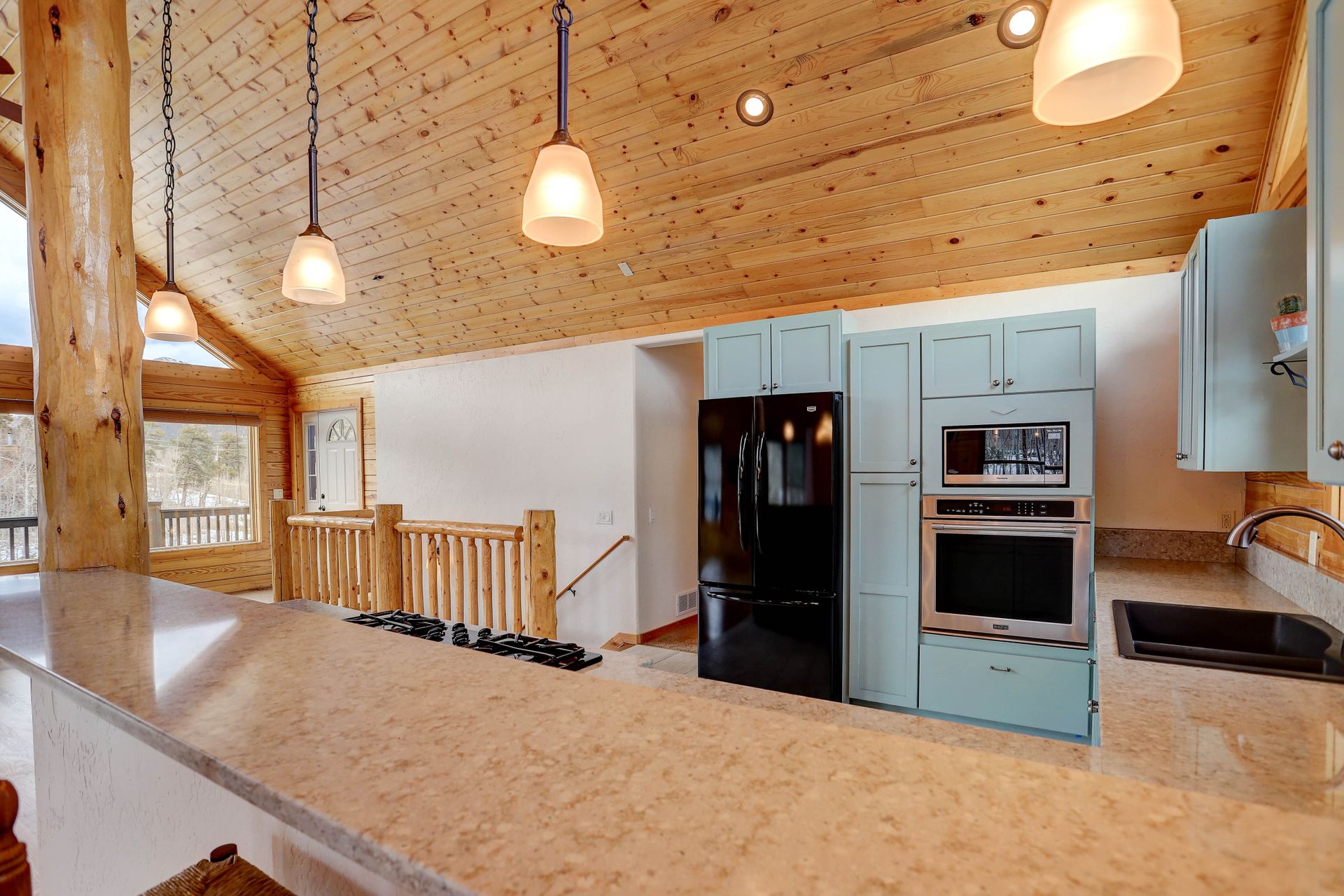 Looking out to the Pike National Forest and Mt Evans Wilderness you’ll have snowcapped views from Mt Logan to Rosalie Peak from your vaulted great room. Towering beetle killed pine ceilings, oak and tile floors, turquoise cabinets, quartz counters and a brick hearth with wood stove accent this living, dining and kitchen space. The engineered logs make for an incredibly solid home and provide that mountain rustic feel that you move here to find. Immaculately maintained and ready for immediate occupancy you can be home before the spring flowers arrive. The wrap around deck is low maintenance so you’ll only need to enjoy the stars, sun and views. The acre lot is flat to gently sloping and graced with pines, aspen and meadow. The HOA is voluntary but for a small annual fee you will have access to stocked trout ponds for summer or winter fun. There are even horse facilities that may have room for your “ride”. Recreational opportunities are endless and begin minutes from your front door.
