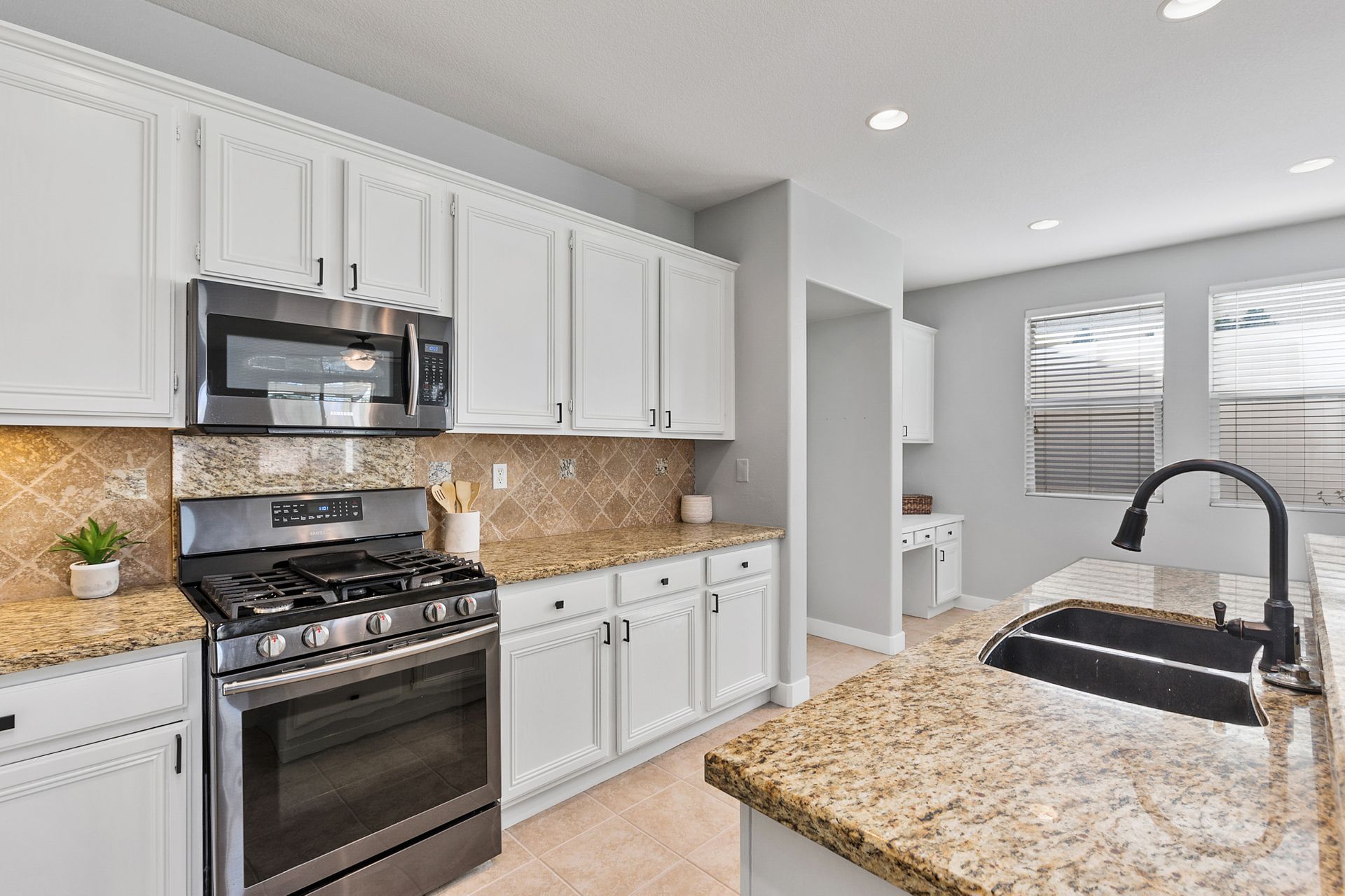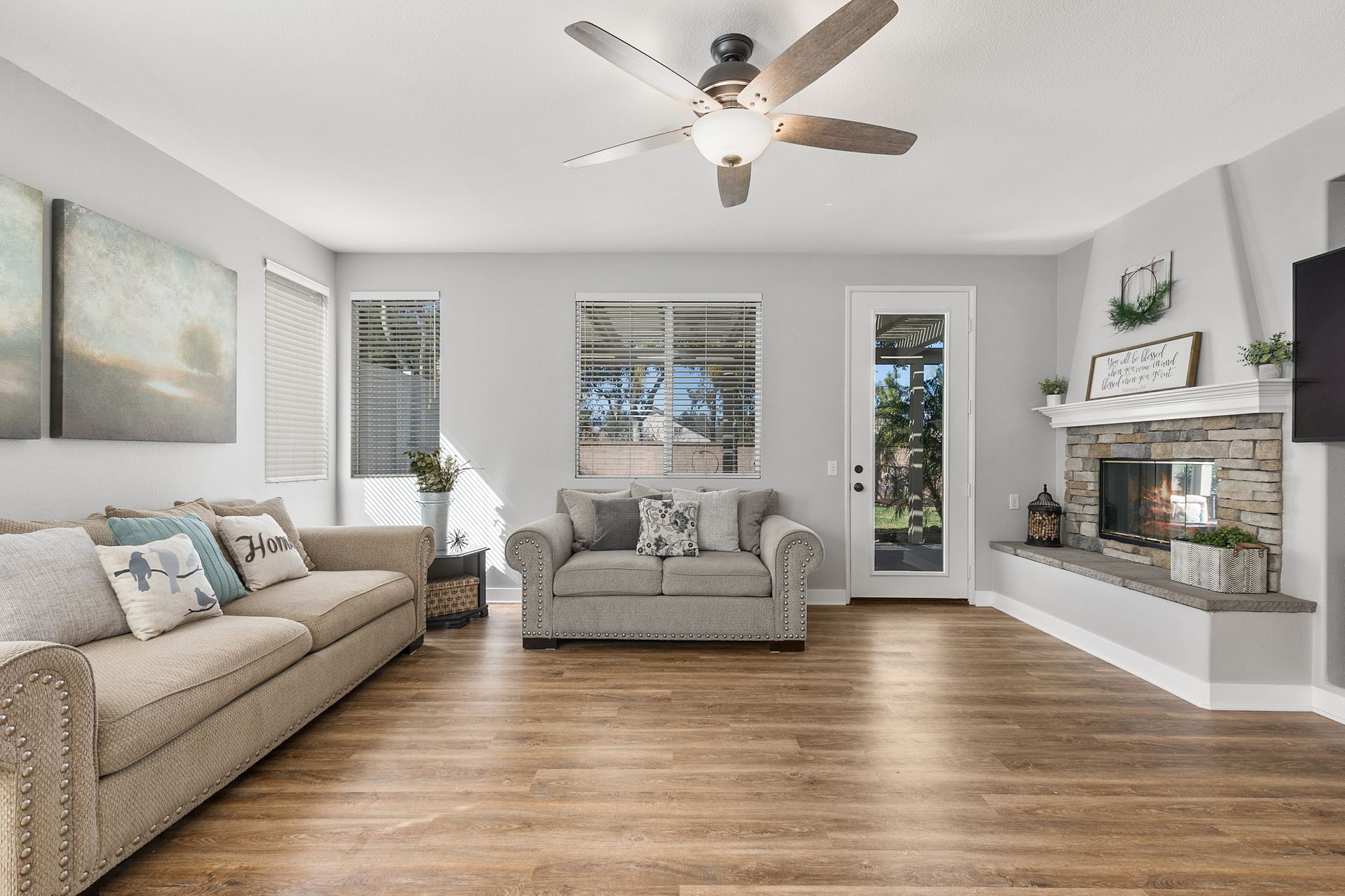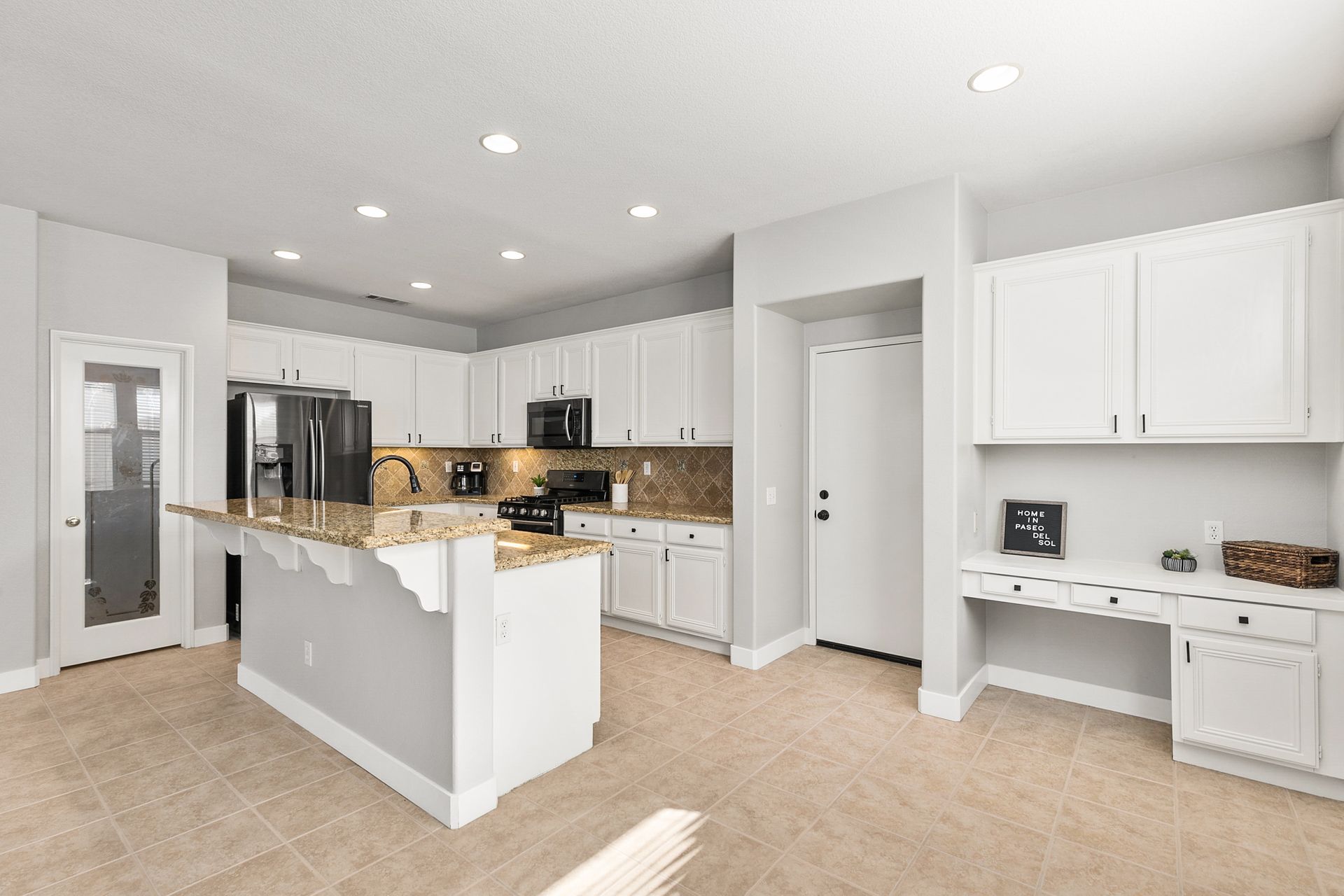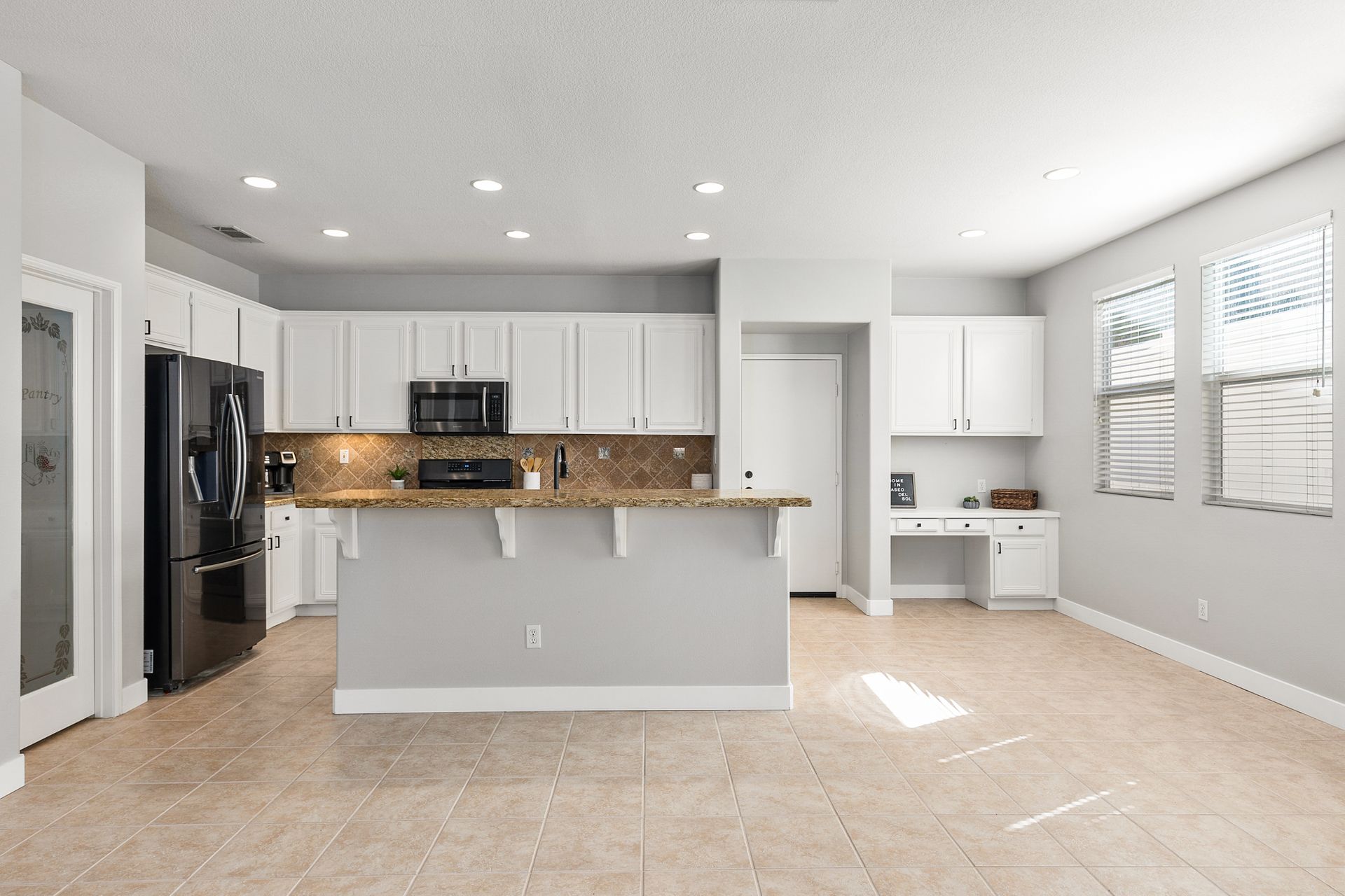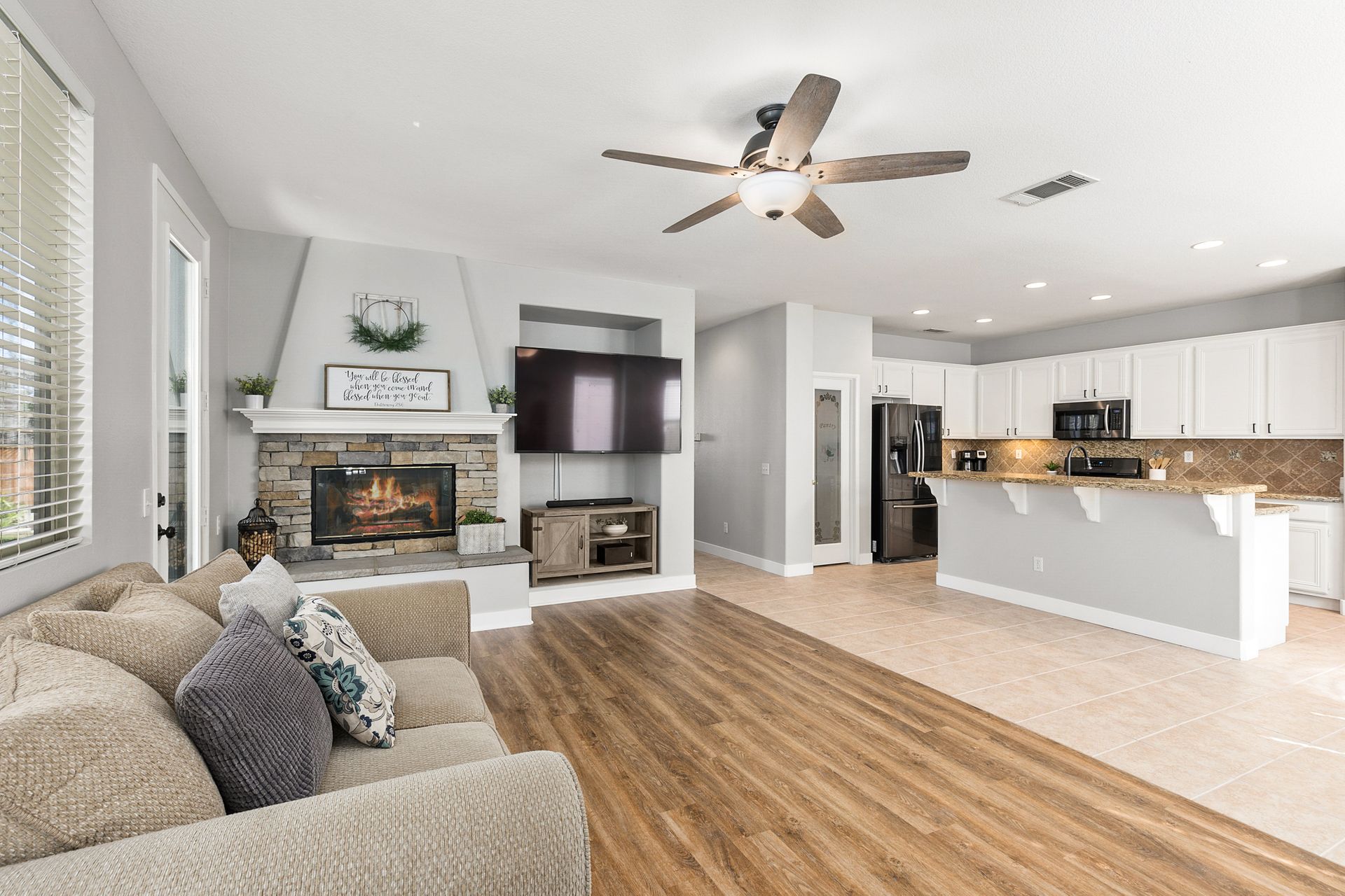 The kitchen is nicely appointed with white cabinetry with contrasting black pulls and knobs, granite countertops, black stainless-steel appliances, and a breakfast bar seating area. The family room features a stone-adorned hearth and fireplace, upgraded LVP flooring and direct access to the backyard via an oversized door with glass inset.