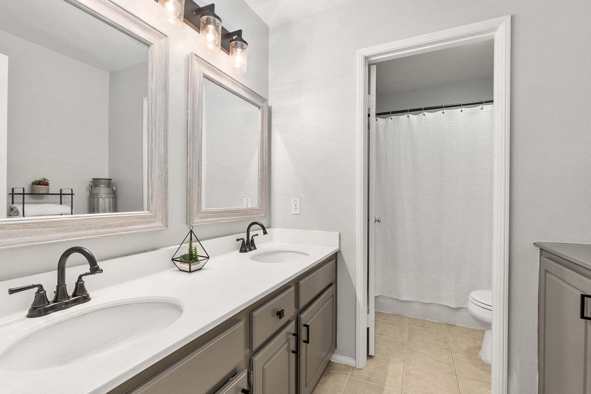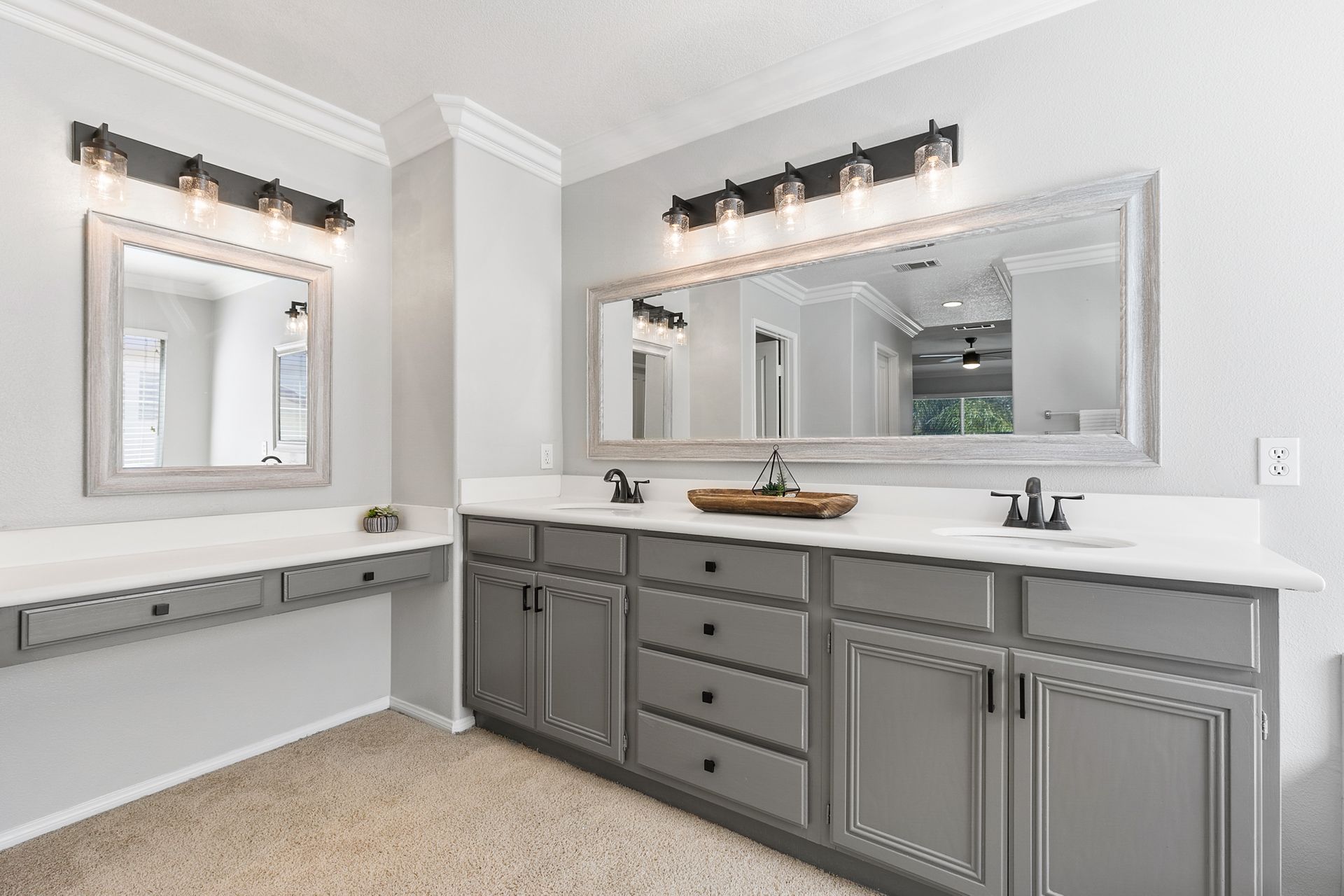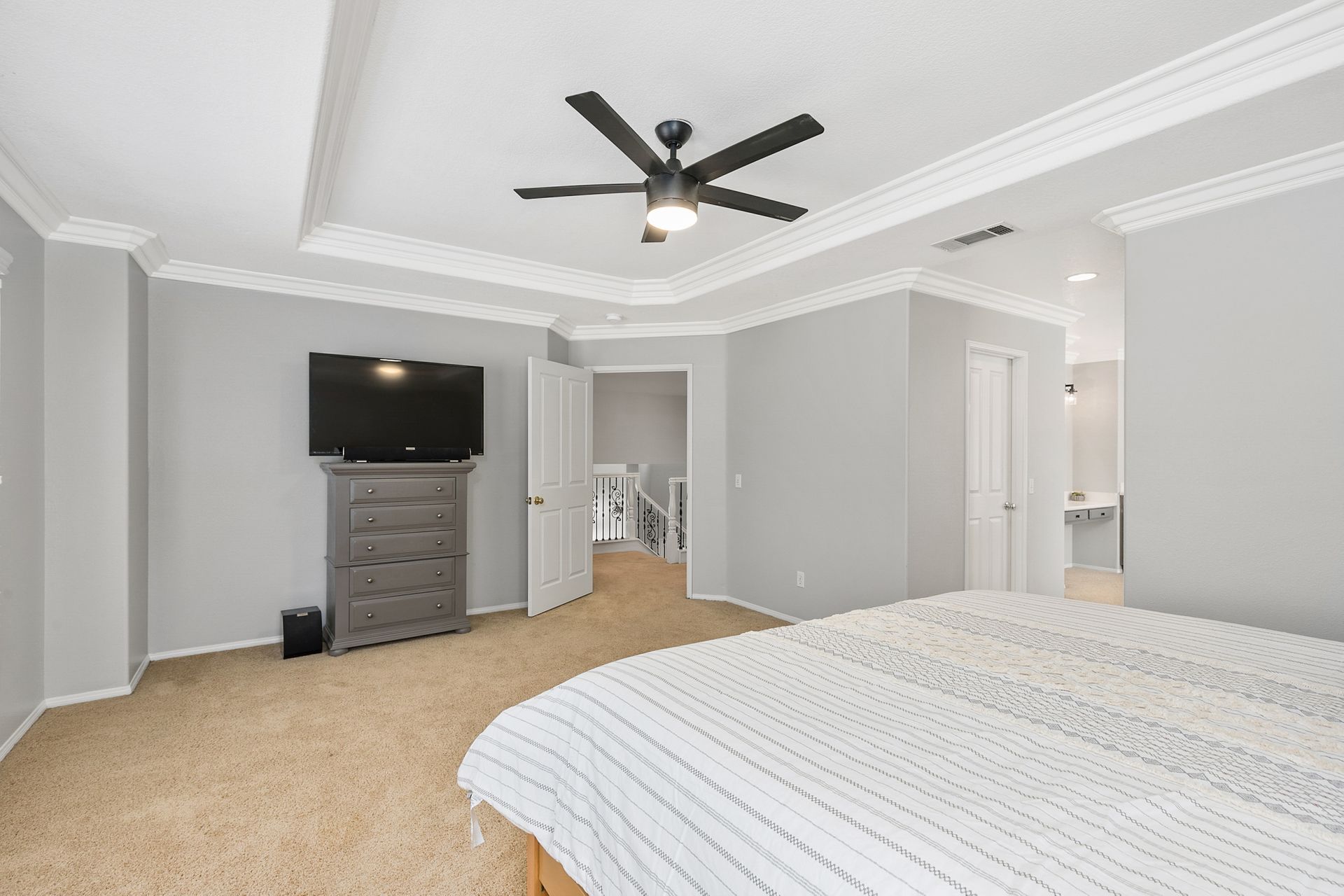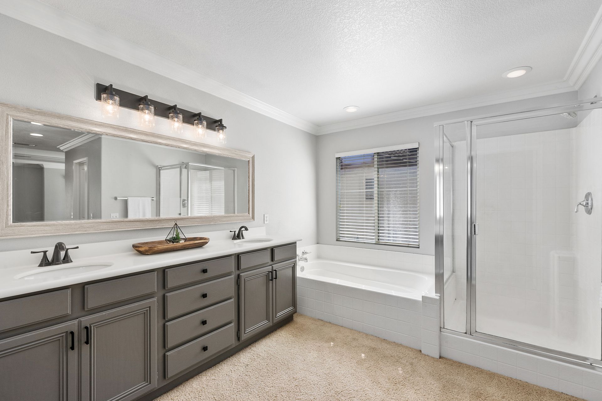 As you ascend upstairs, you'll truly experience the vast openness of the space, further accentuated by soaring ceilings. Upstairs you will find the spacious primary bedroom, three secondary bedrooms and the laundry room. Unwind in the generously sized primary suite with two walk-in closets, tray ceilings, and a modern ceiling fan. The primary ensuite features a walk-in shower and separate soaking tub, a rich gray dual sink vanity with oil rubbed bronze faucets, complementing lighting and new framed mirrors. The secondary bedrooms feature fresh paint, mirrored closet doors and updated ceiling fans.