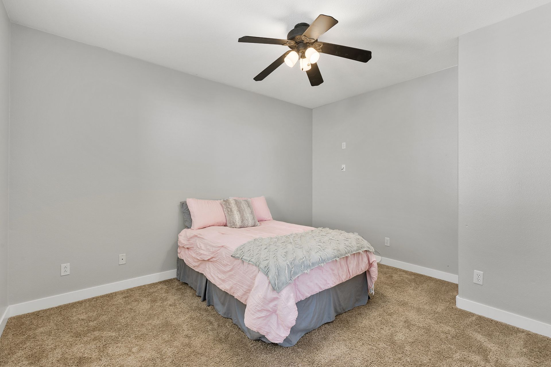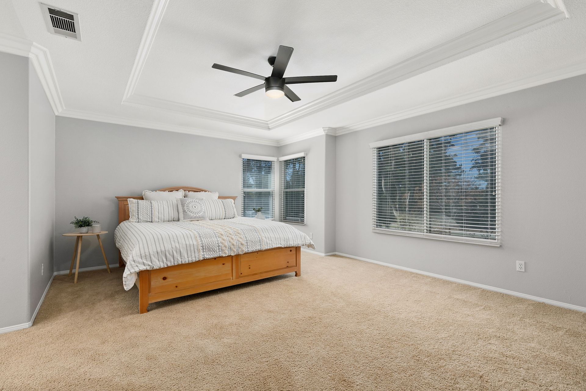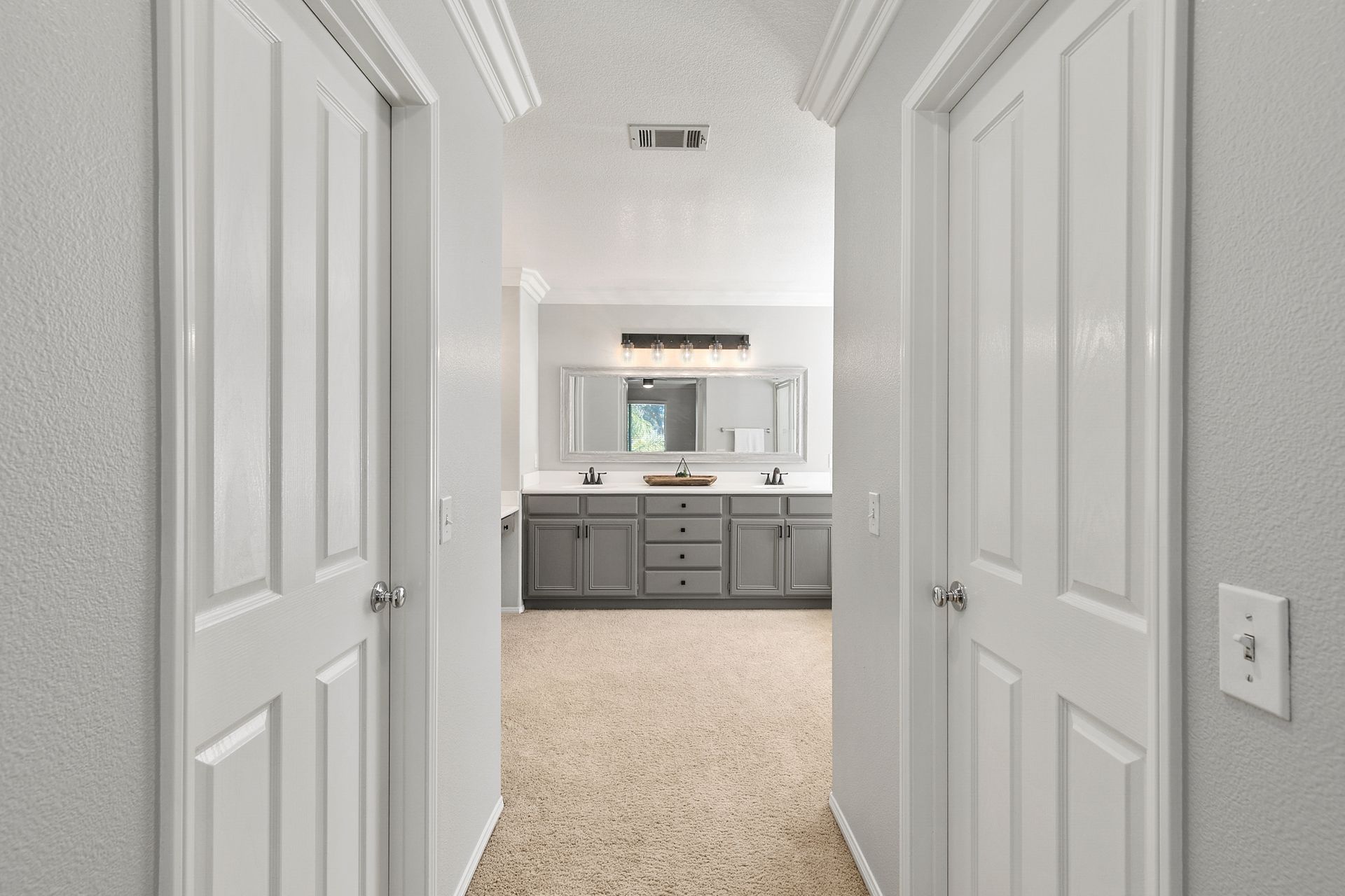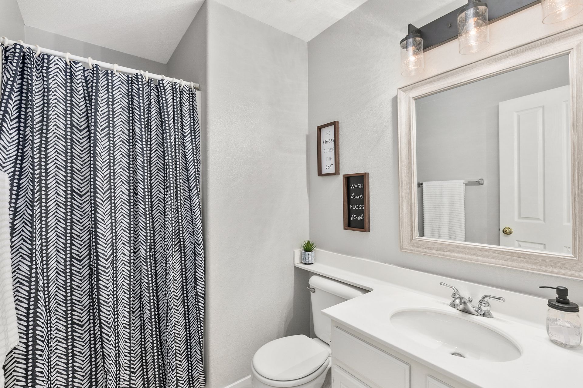 As you ascend upstairs, you'll truly experience the vast openness of the space, further accentuated by soaring ceilings. Upstairs you will find the spacious primary bedroom, three secondary bedrooms and the laundry room. Unwind in the generously sized primary suite with two walk-in closets, tray ceilings, and a modern ceiling fan. The primary ensuite features a walk-in shower and separate soaking tub, a rich gray dual sink vanity with oil rubbed bronze faucets, complementing lighting and new framed mirrors. The secondary bedrooms feature fresh paint, mirrored closet doors and updated ceiling fans.