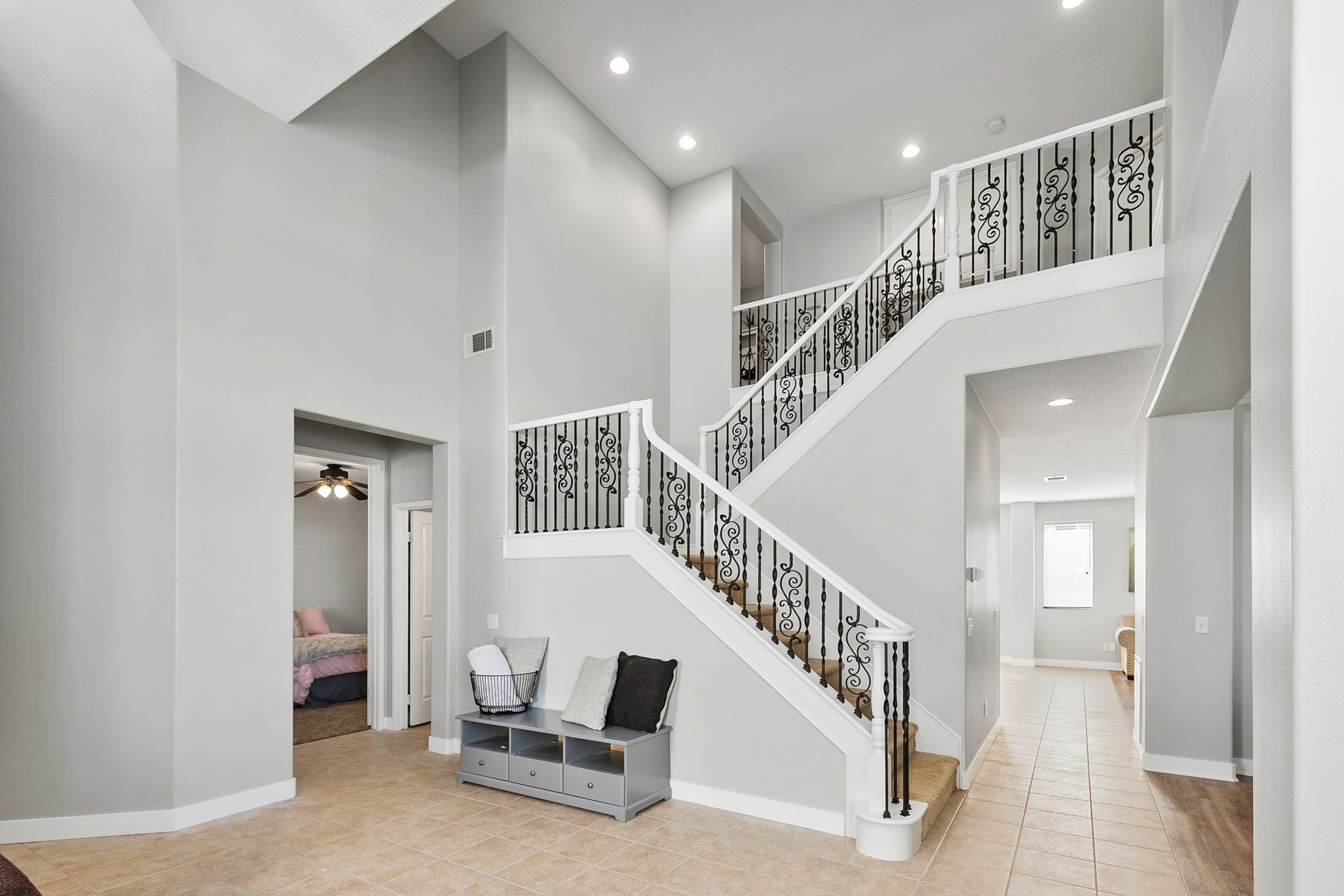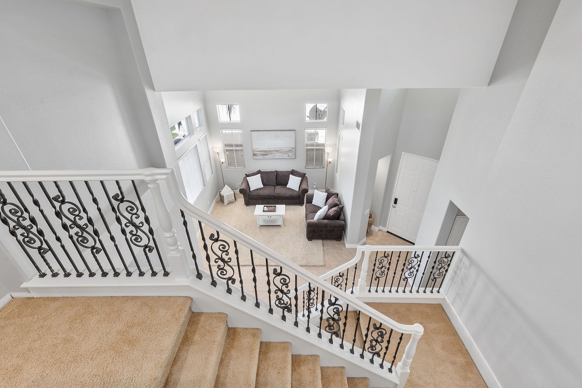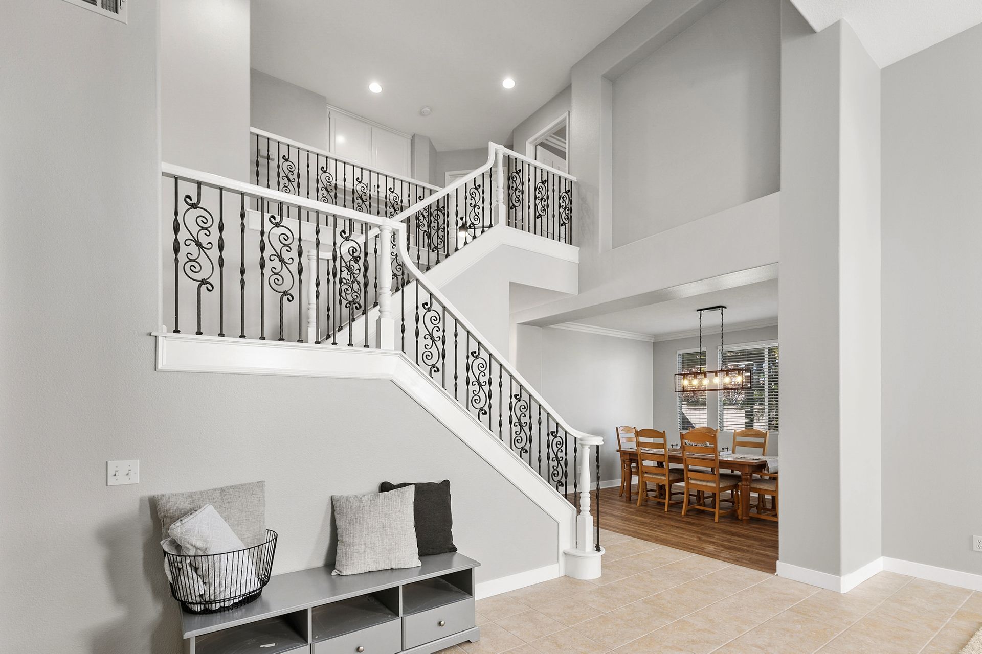 The moment you drive up you are greeted by the inviting stack stone pillars with carriage lighting and slate steps that lead you to a private courtyard entry. Once inside, you'll immediately notice the architectural design elements including two-story soaring ceilings, large picture windows and a grand wrought iron staircase.
