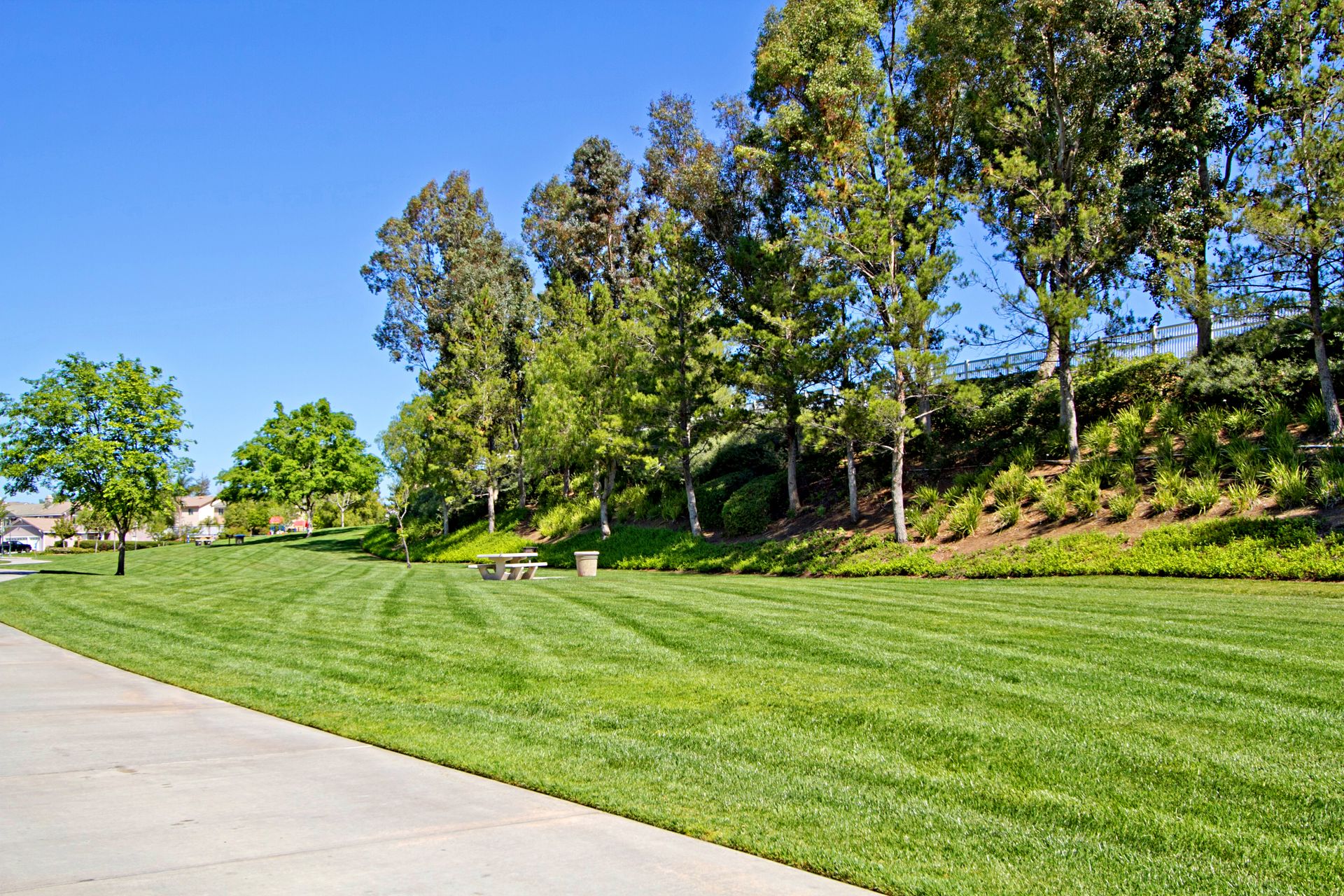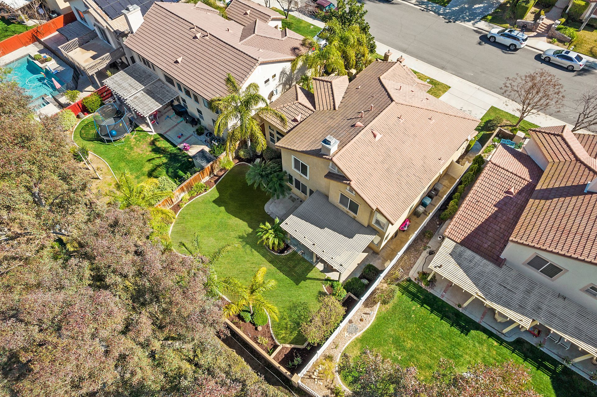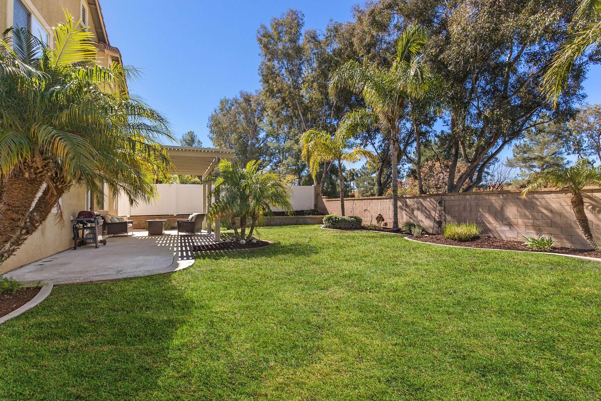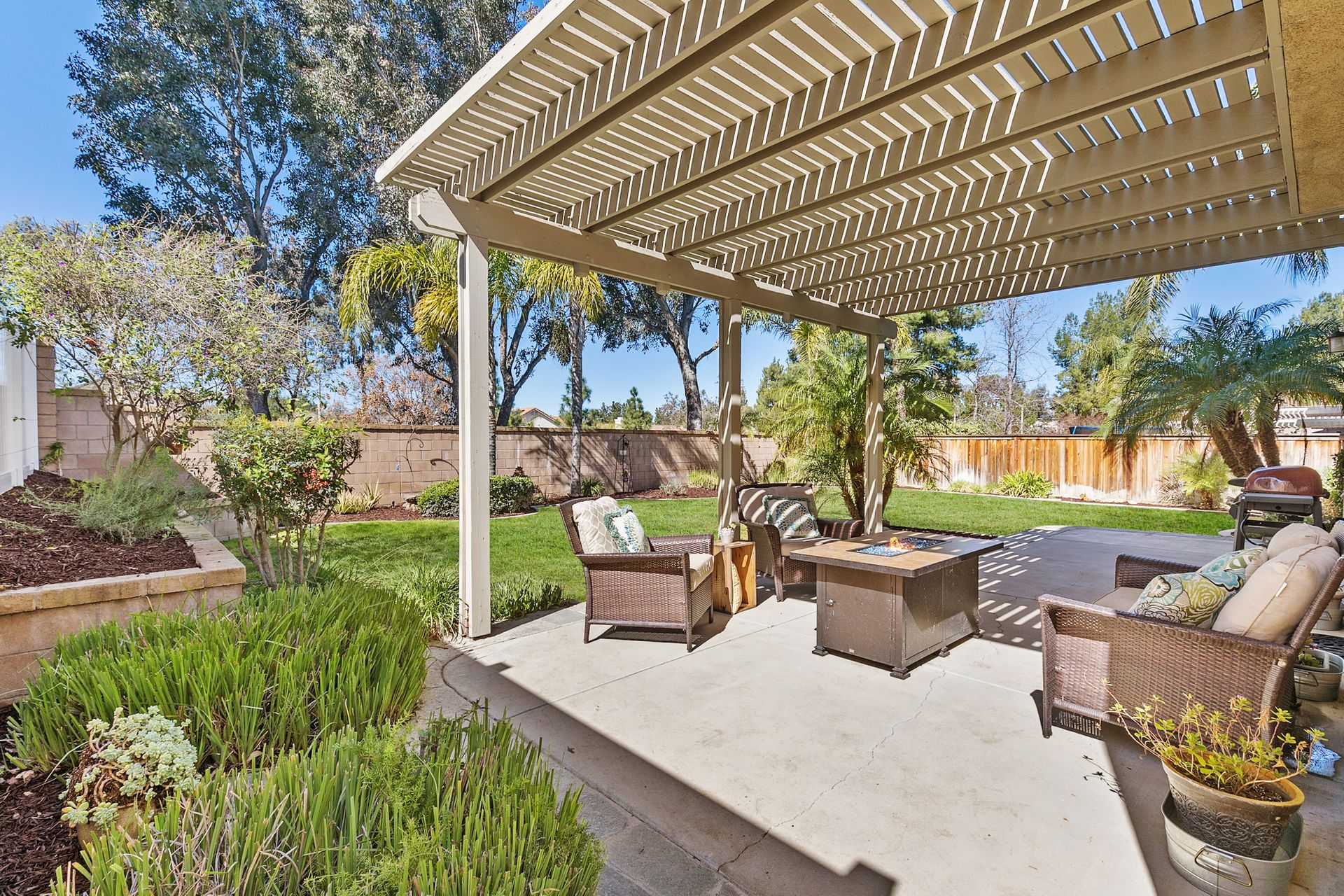 The backyard is tastefully designed with a pergola, a cement patio with slate decorative accents and lush softscape striking just the right balance between sod, plants, trees.