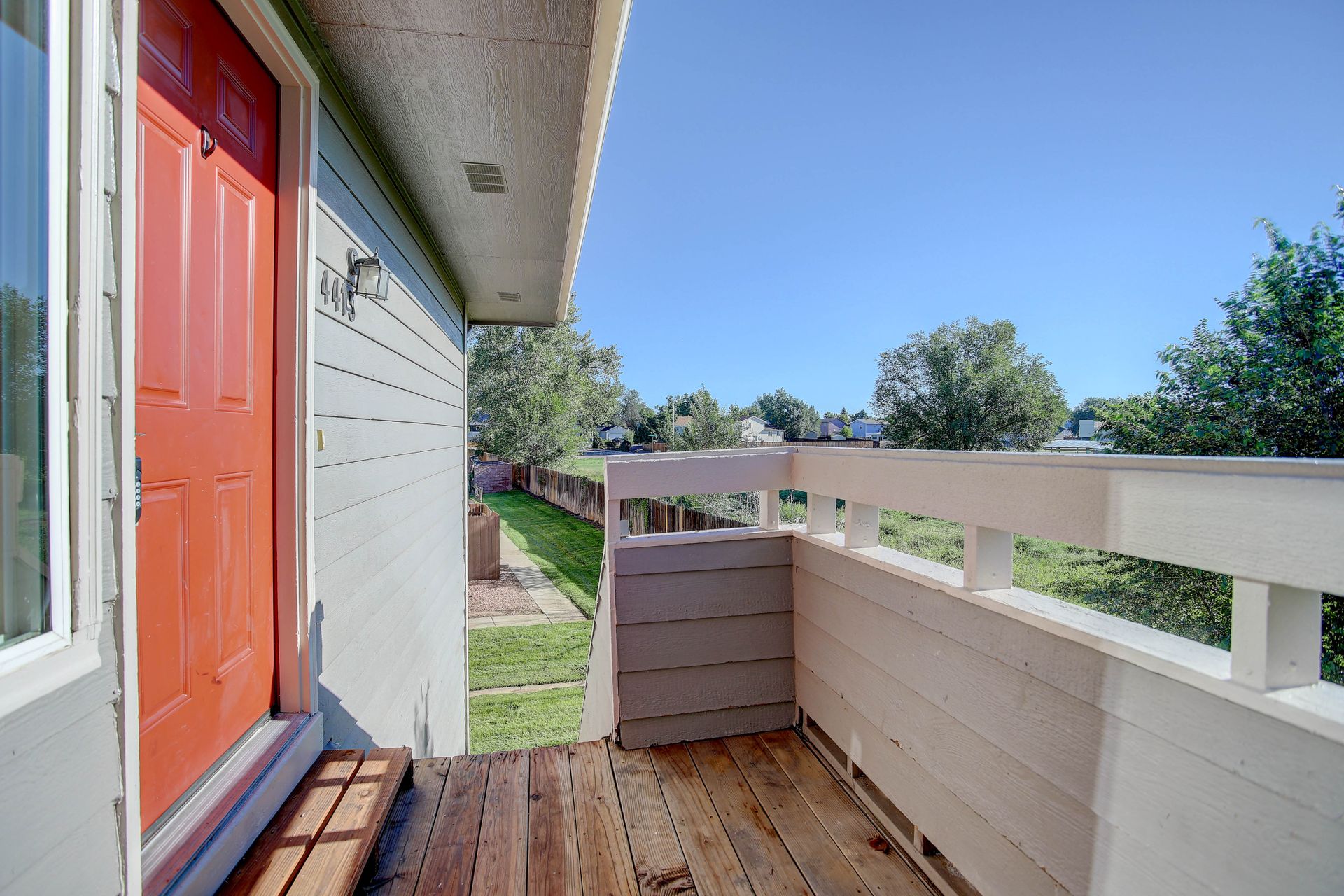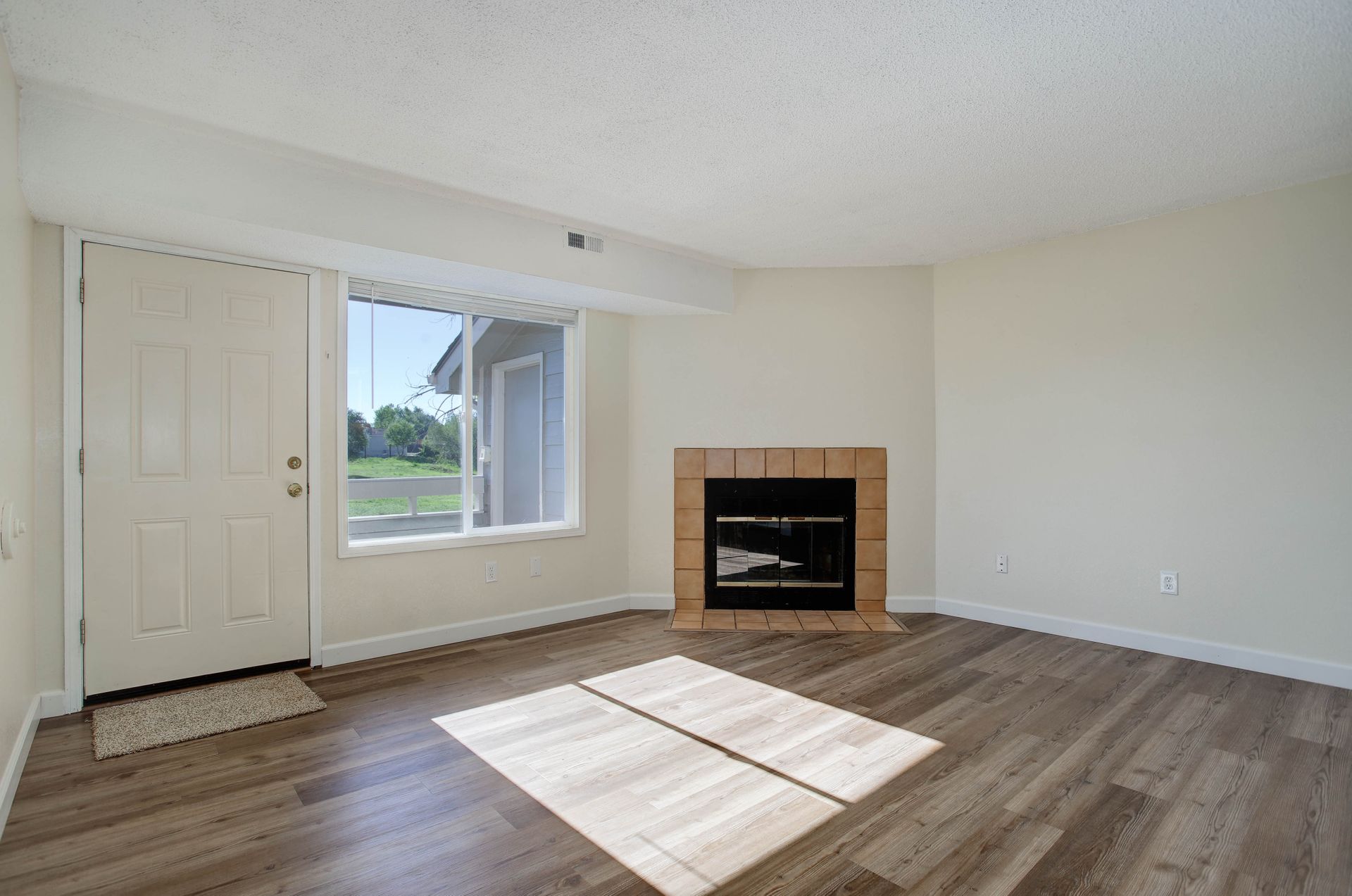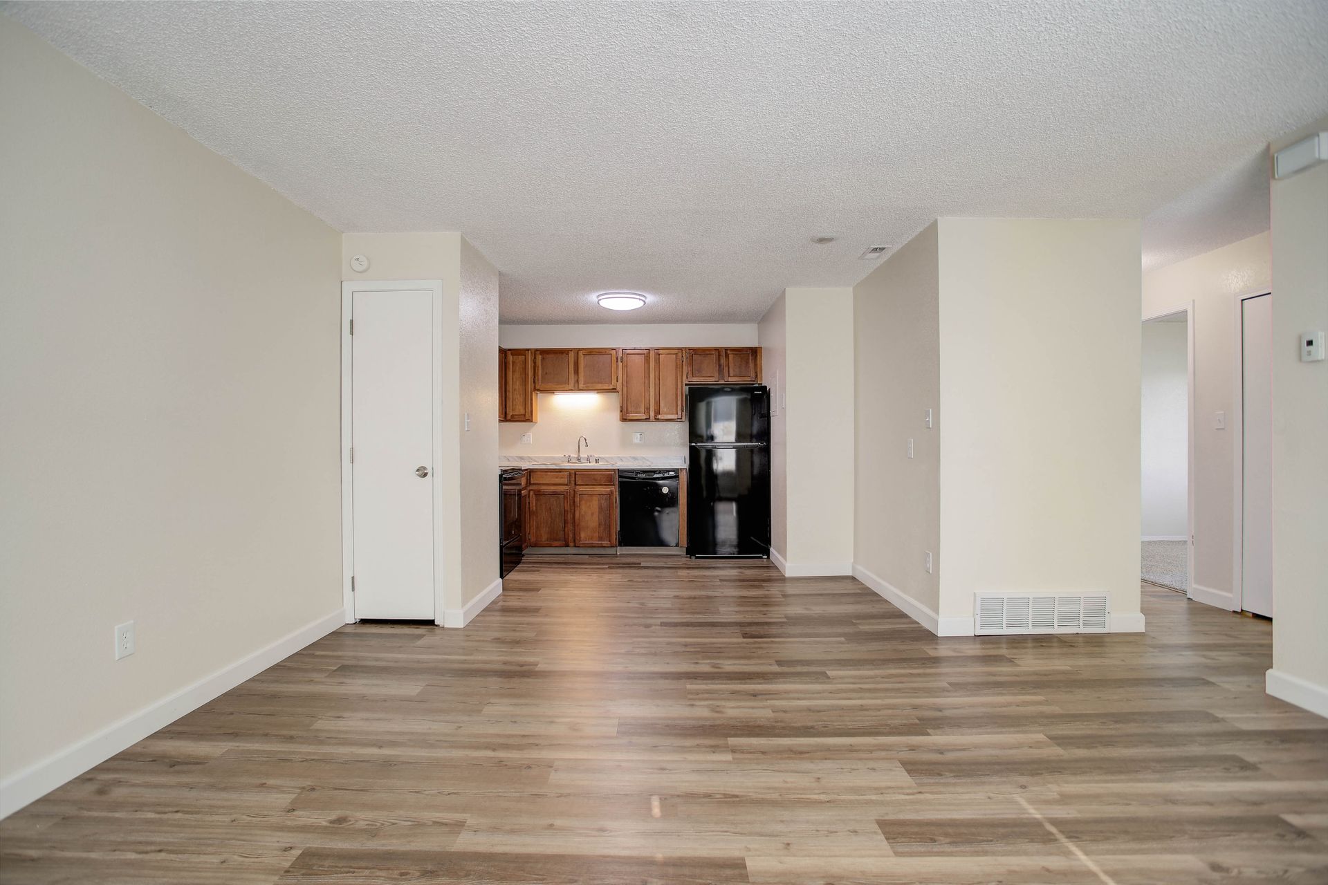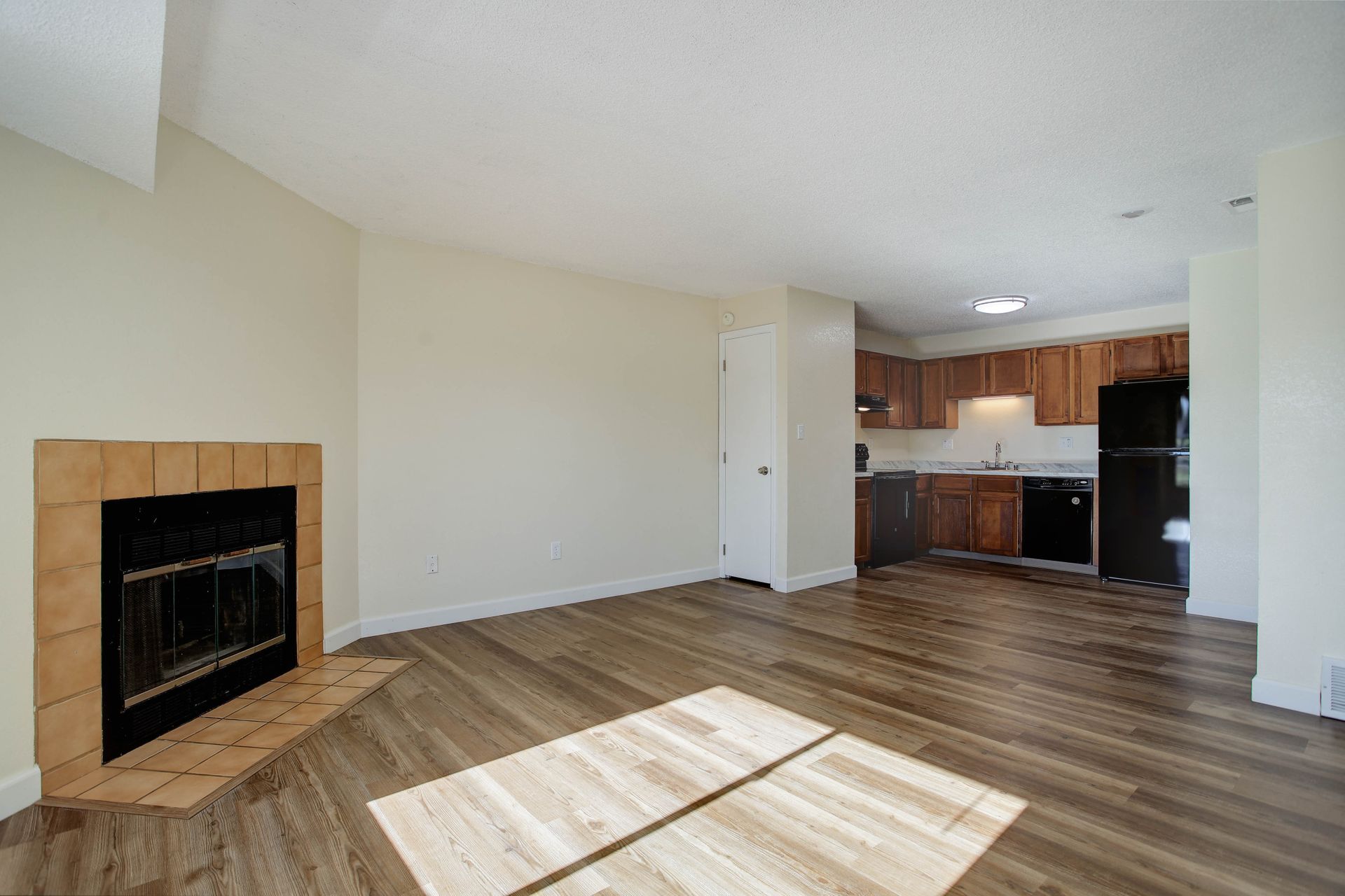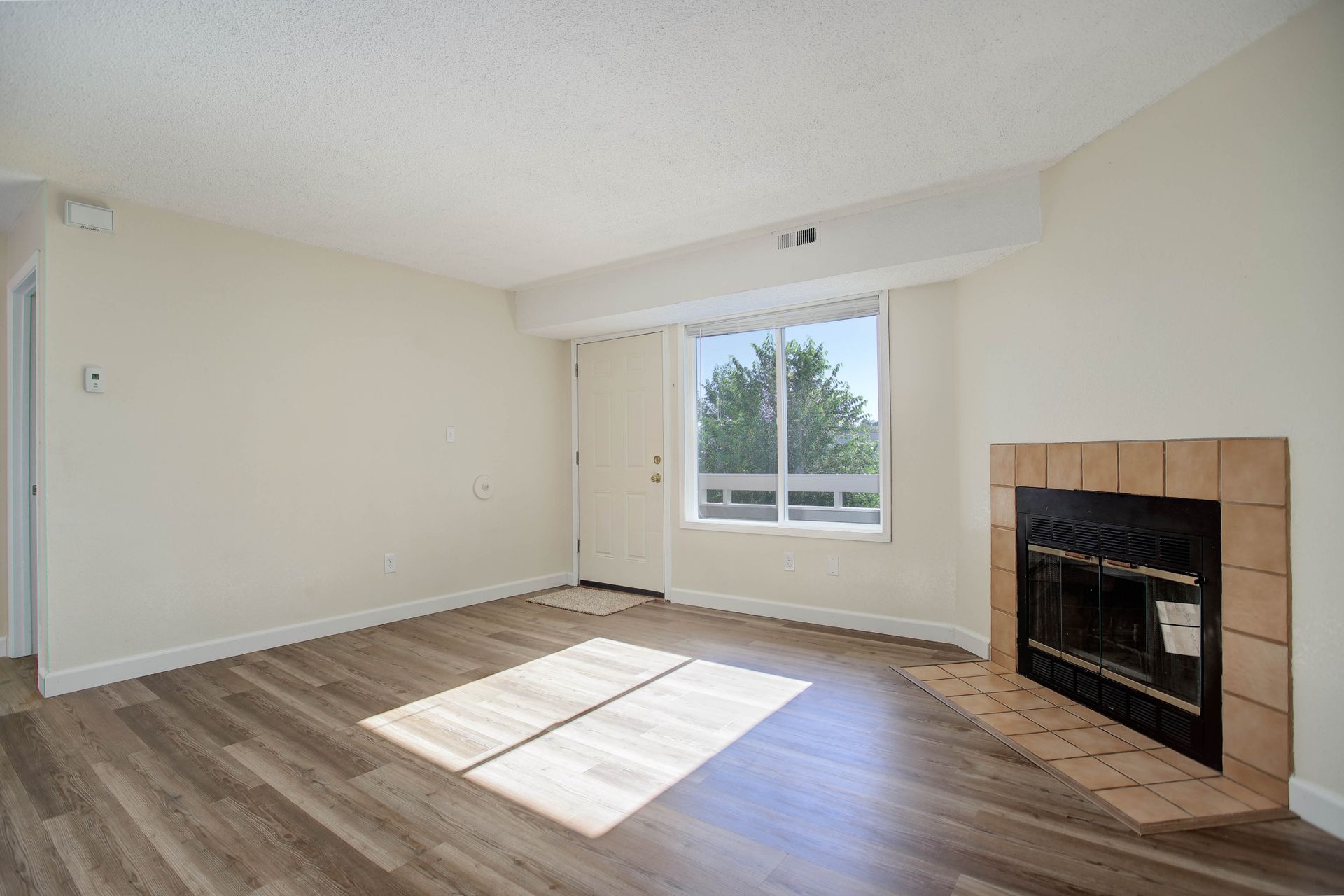 This upper level unit is on the east side of the complex, in one of the best locations overlooking the expansive green areas and bordering church property. This property features...large, sunny-south facing living room with new LVP floors, corner wood-burning FP…cozy eat-in kitchen with ample cabinet space, marble-look counters, and new range oven, hood and refrigerator…new carpet in both the 14x17 primary bedroom and 2nd bedroom...full hall bath with painted vanity and updated light fixture and faucet…laundry space for your full size washer and dryer...and large linen closet. Outside, you'll enjoy the...private deck with view of the mature trees...extra storage in the mechanical room...and assigned parking space. LOW HOA dues in comparison to other complexes, and easy access to both Academy Blvd. and Powers Blvd., too! LVP, carpet, switches and outlets ('24); water heater (‘22).
