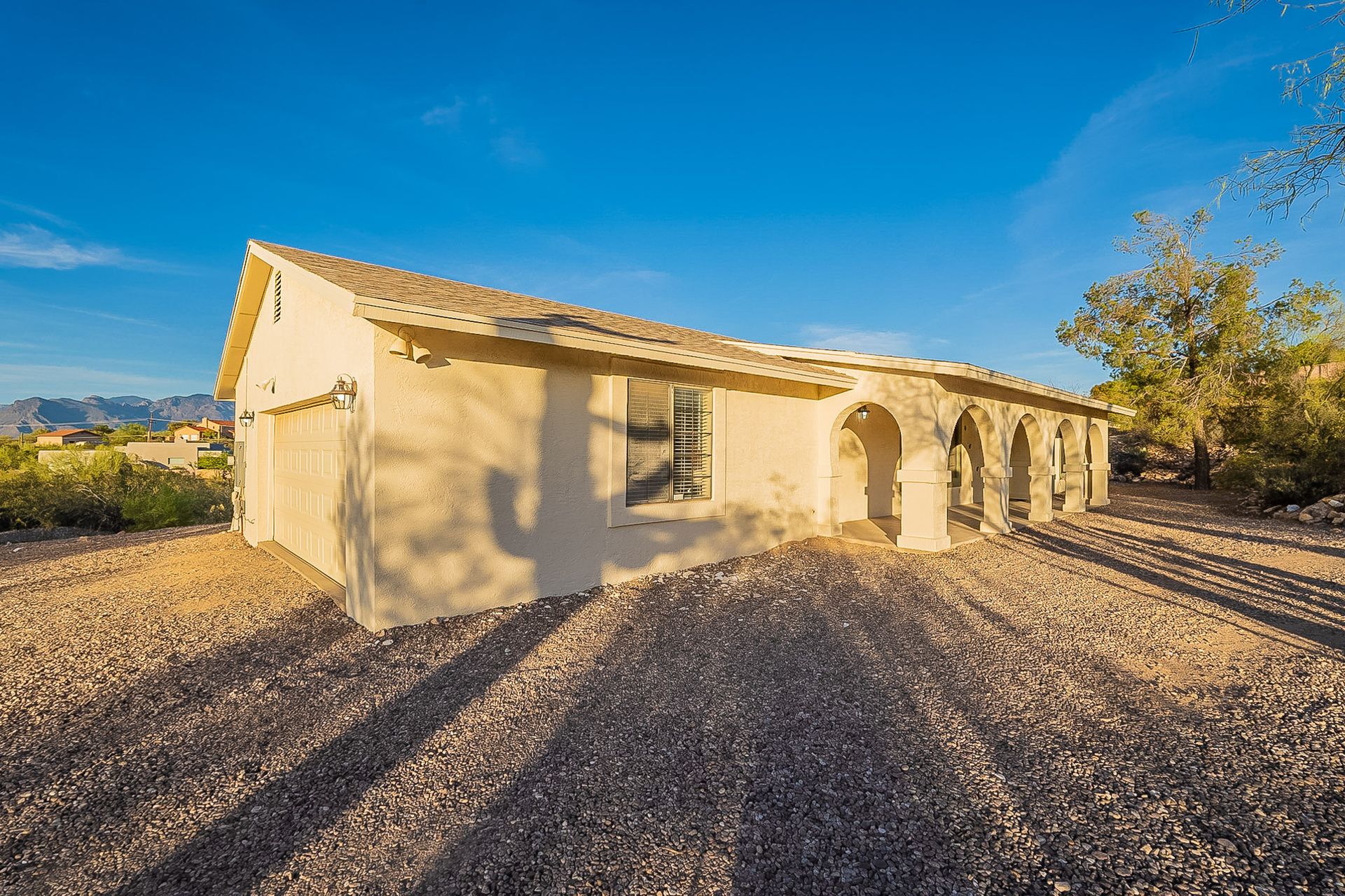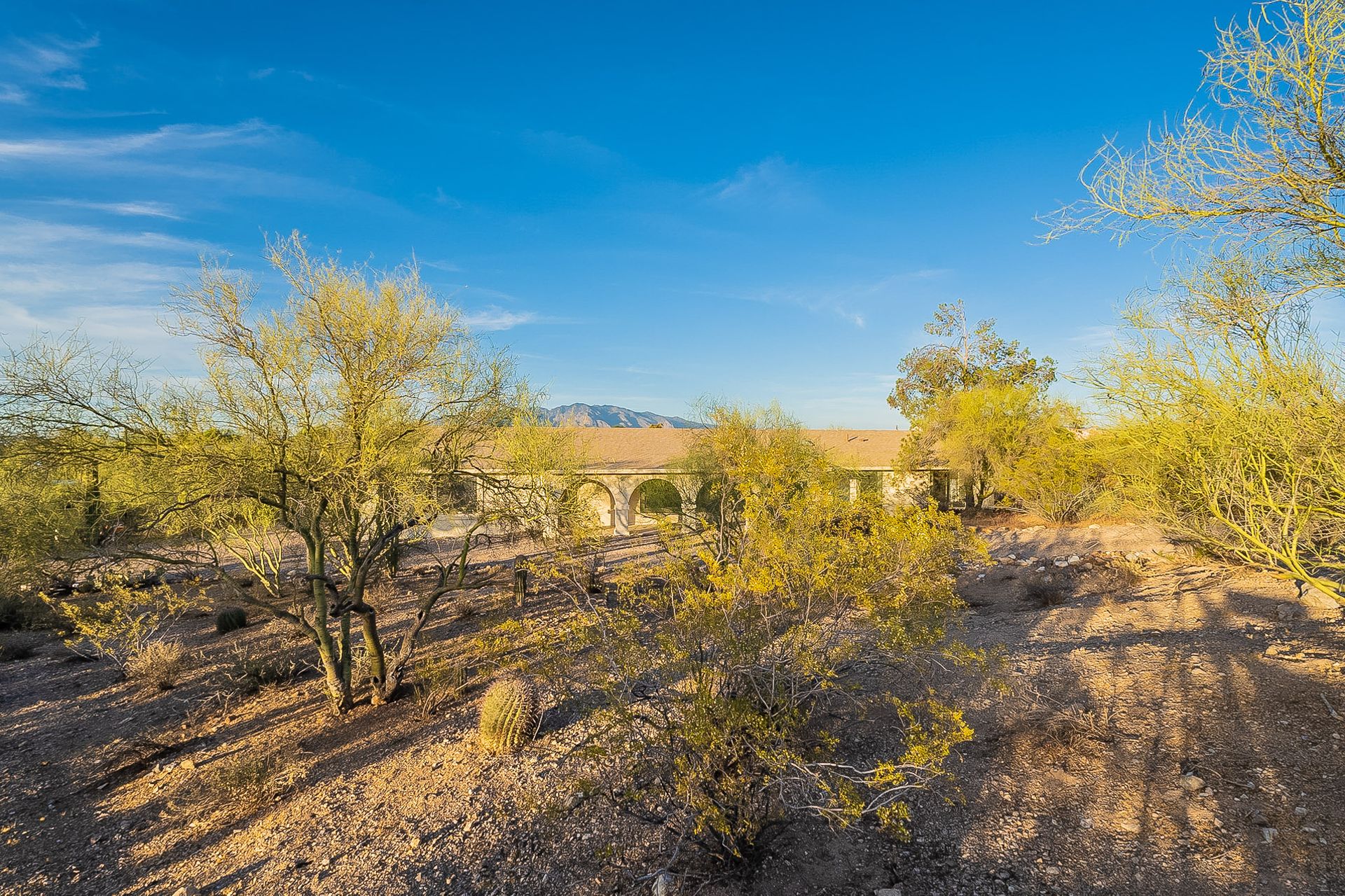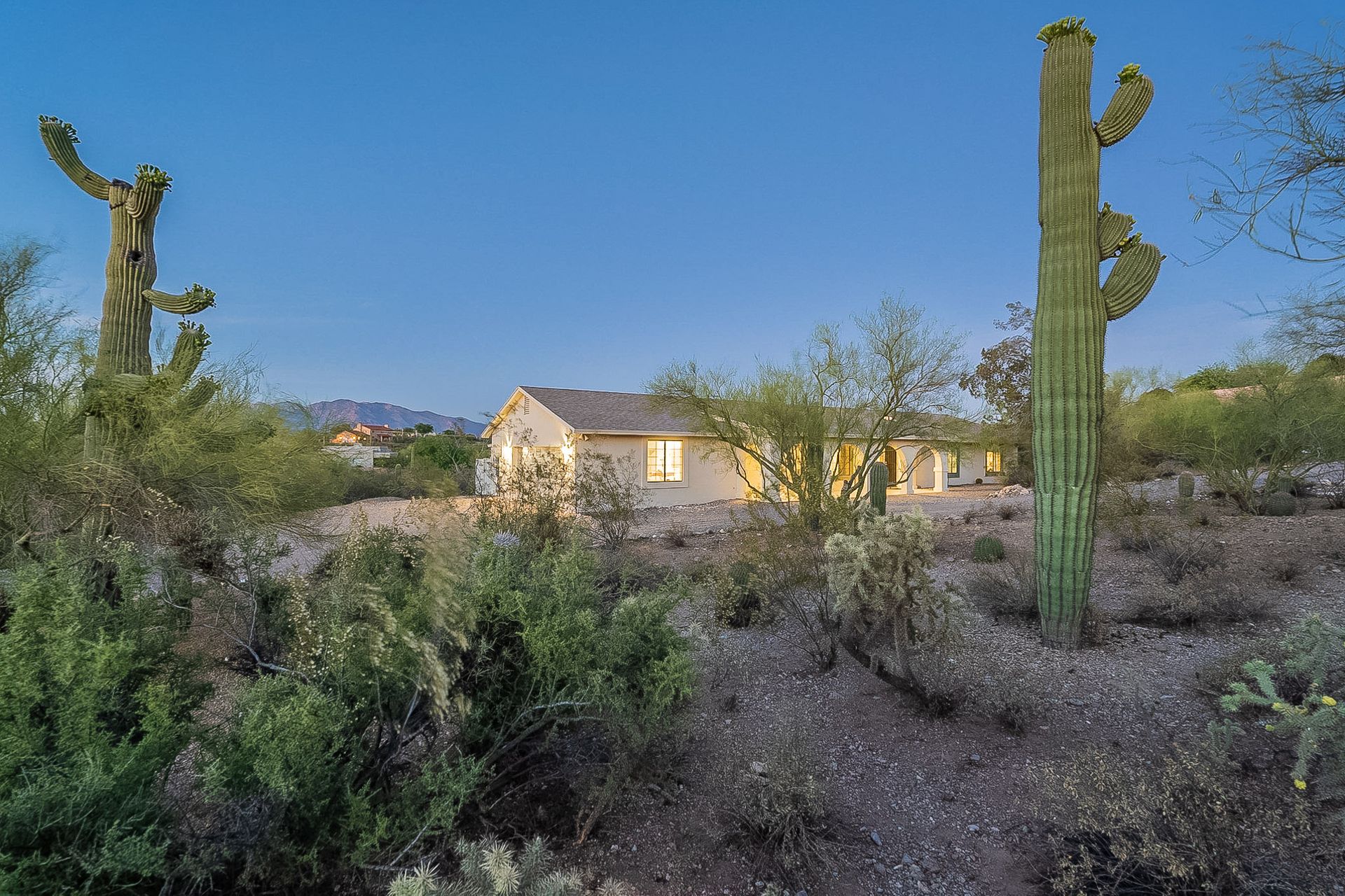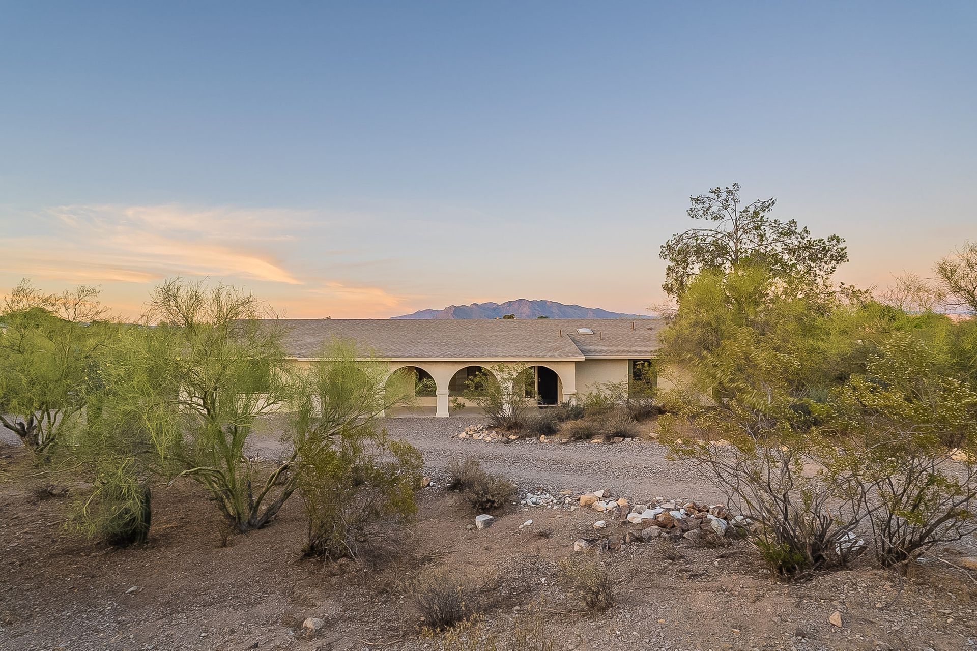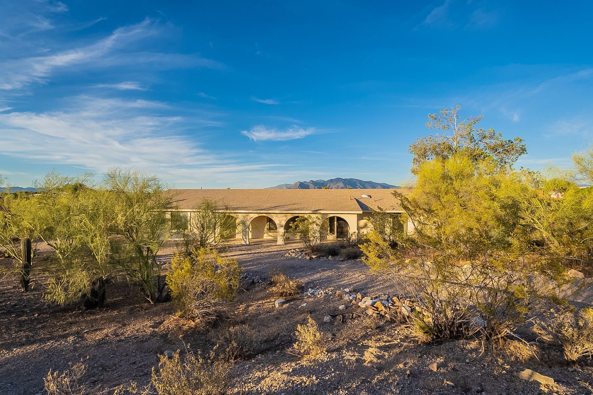 PRIVACY AND LOCATION! This stunning Tucson Ranch sits on over an acre of land with no rear neighbors. Lush acre backs up to a wash with beautiful mountain views, stunning sunsets, and city lights. Enjoy the low-care front yard and gorgeous backyard with a fully covered patio, pavers, a side yard, and artificial turf. The kitchen has just had a facelift with gorgeous greyish-blue cabinets, new hardware, and quartz-like counters – The bonus is a huge walk-in pantry. Beautiful wood beams run across the vaulted ceilings and warm Saltillo flooring. Three large bedrooms, two baths, oversized two-car garage plus huge workshop, man door, and extra storage. There are also dual-pane windows and newer light fixtures. It feels like you are on your own remote island - with a cul-de-sac location, however less than 10 minutes to I-10, with an easy commute to the University of Arizona, downtown, Raytheon, Caterpillar, Davis Monthan Air Base, and Tucson airport. This is a true Tucson gem - Hurry over for a Visit.
