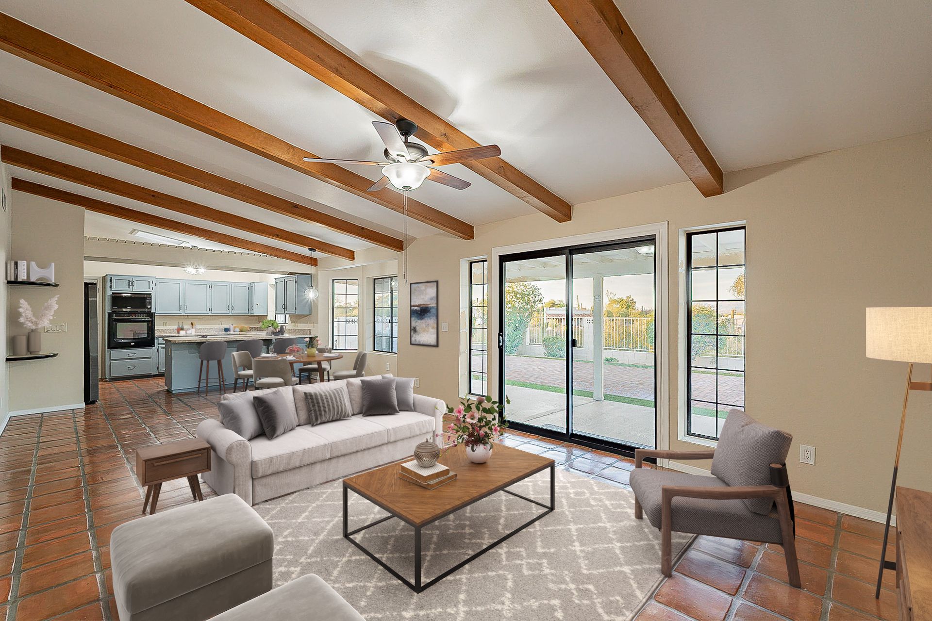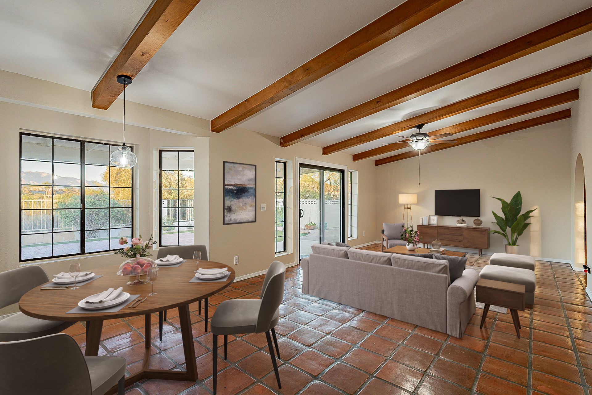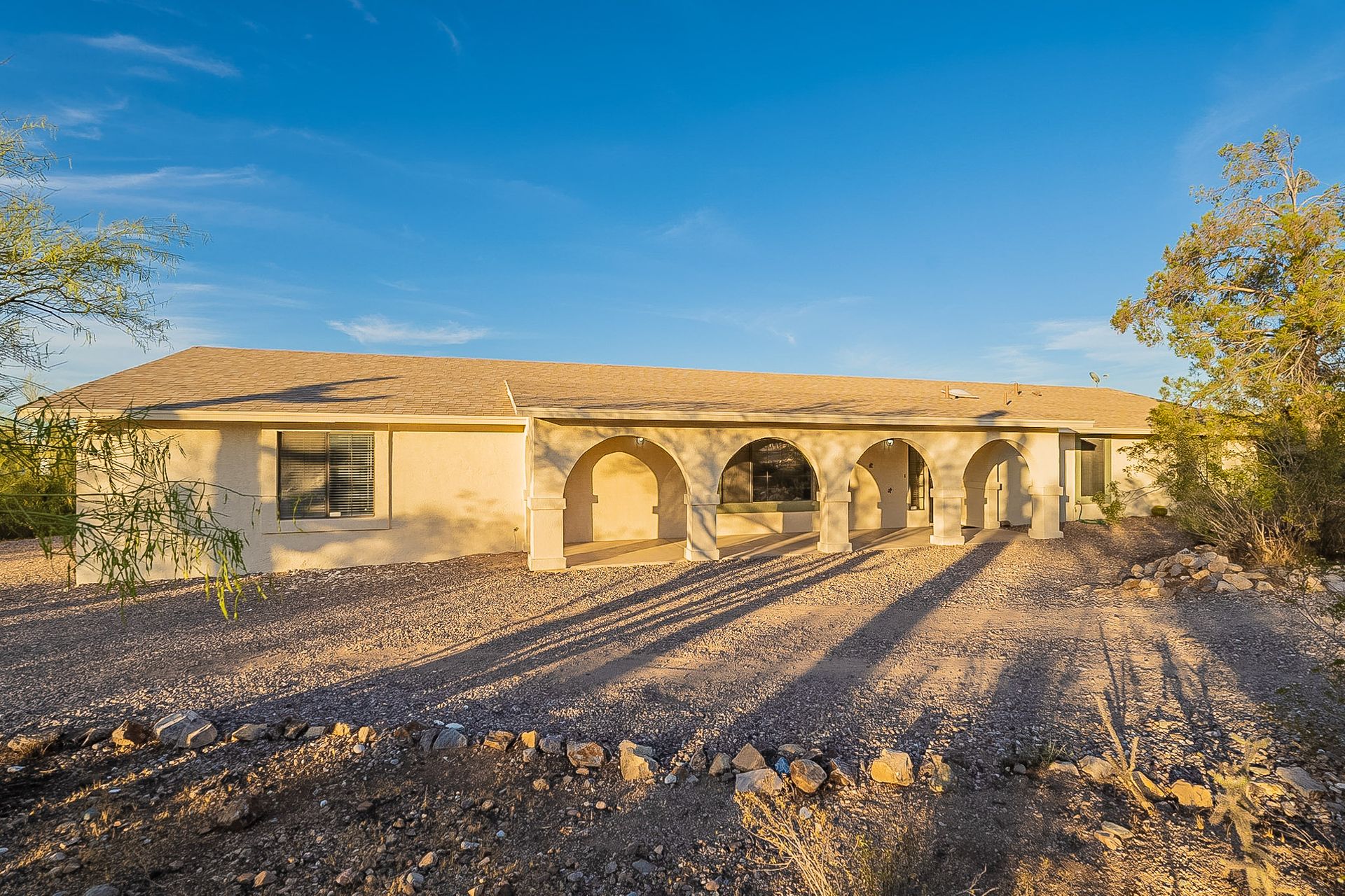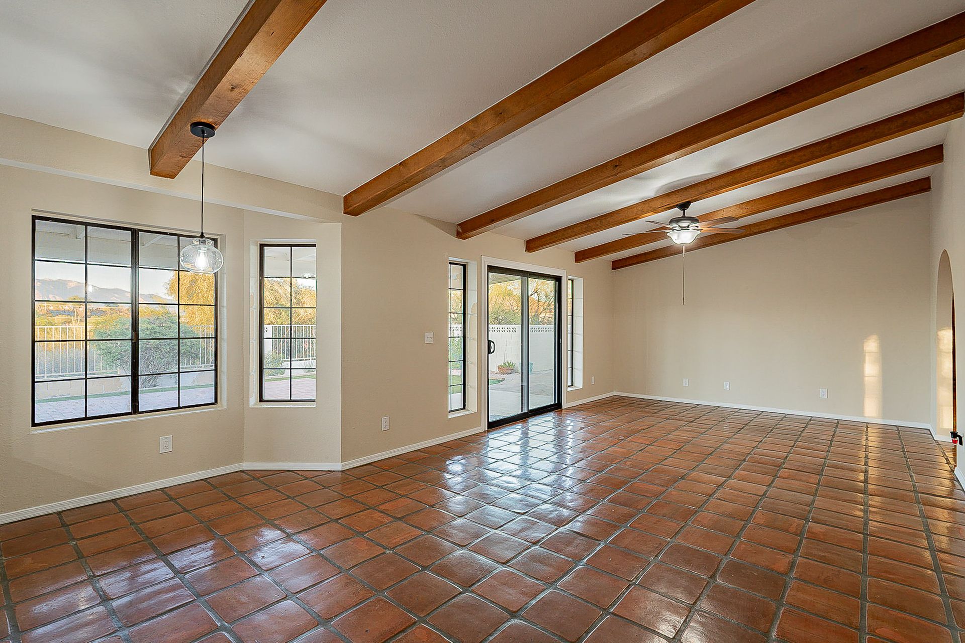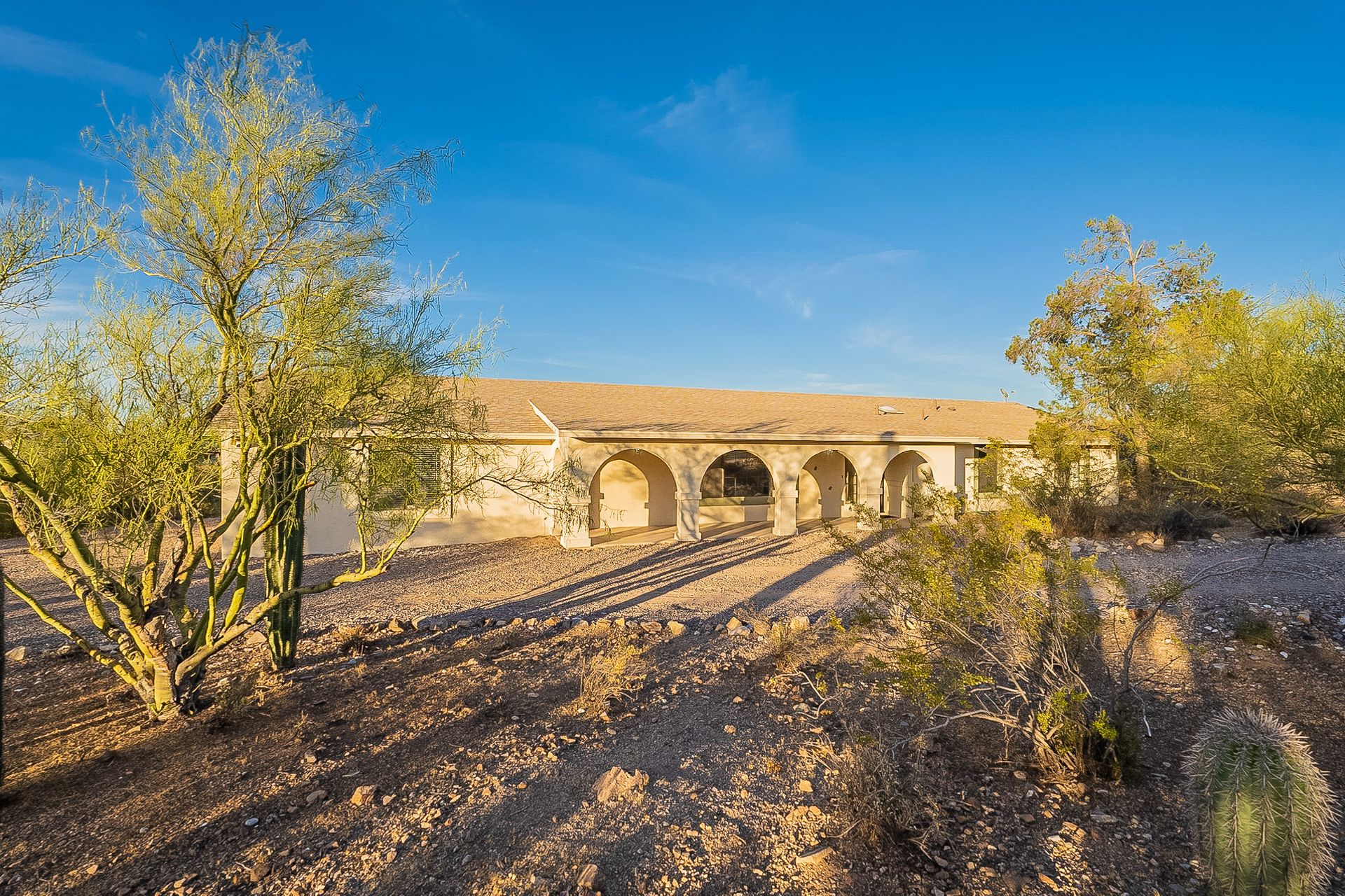 PRIVACY AND LOCATION! This stunning Tucson Ranch sits on over an acre of land with no rear neighbors. Lush acre backs up to a wash with beautiful mountain views, stunning sunsets, and city lights. Enjoy the low-care front yard and gorgeous backyard with a fully covered patio, pavers, a side yard, and artificial turf. The kitchen has just had a facelift with gorgeous greyish-blue cabinets, new hardware, and quartz-like counters – The bonus is a huge walk-in pantry. Beautiful wood beams run across the vaulted ceilings and warm Saltillo flooring. Three large bedrooms, two baths, oversized two-car garage plus huge workshop, man door, and extra storage. There are also dual-pane windows and newer light fixtures. It feels like you are on your own remote island - with a cul-de-sac location, however less than 10 minutes to I-10, with an easy commute to the University of Arizona, downtown, Raytheon, Caterpillar, Davis Monthan Air Base, and Tucson airport. This is a true Tucson gem - Hurry over for a Visit.