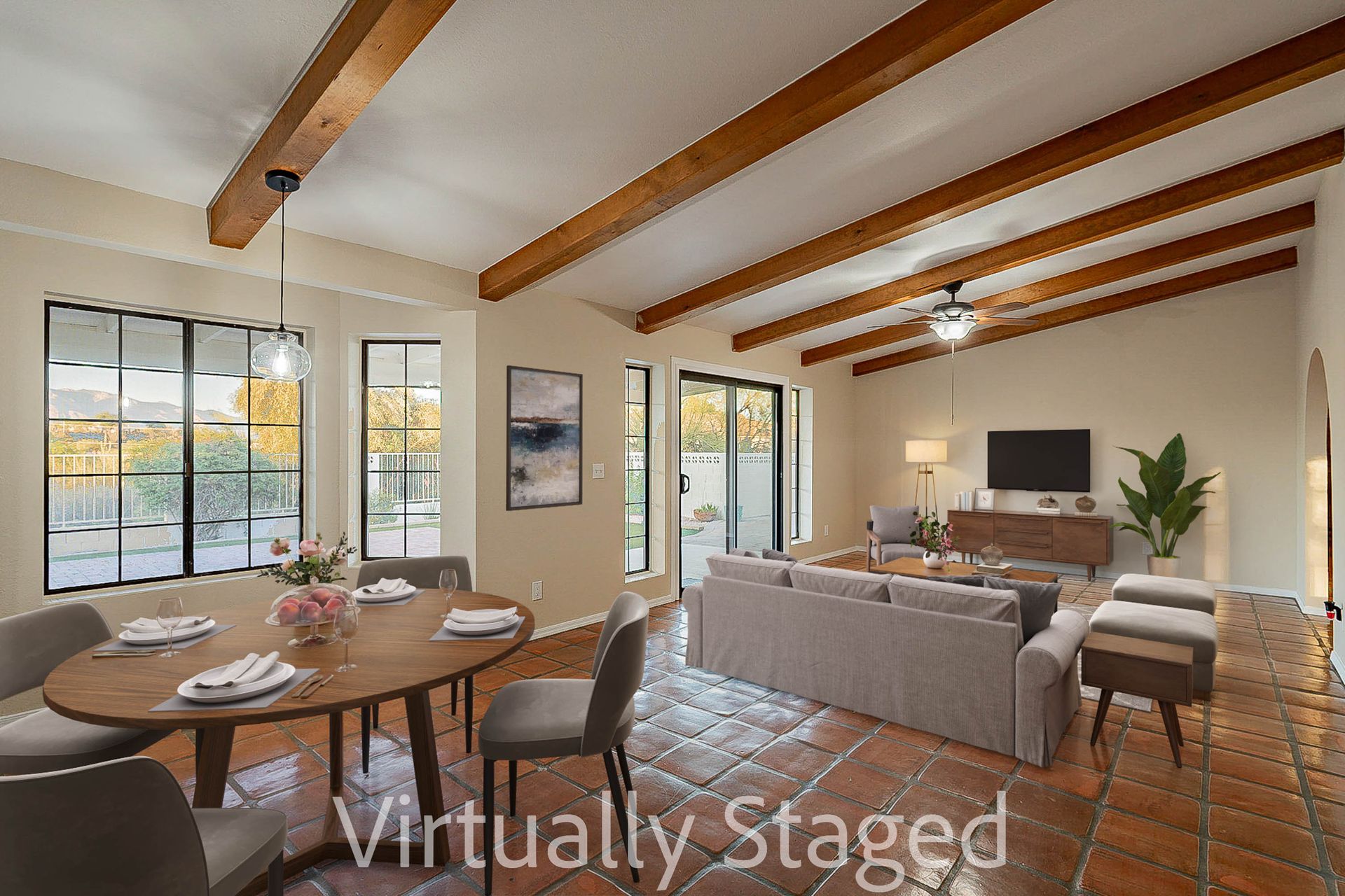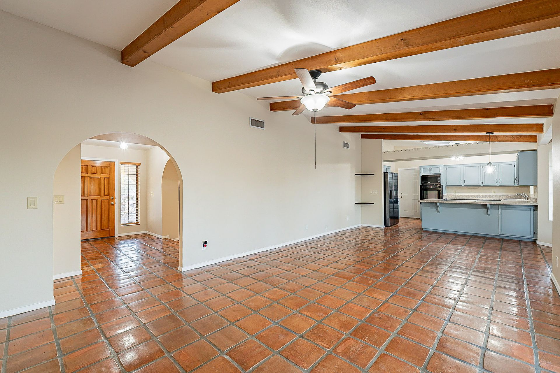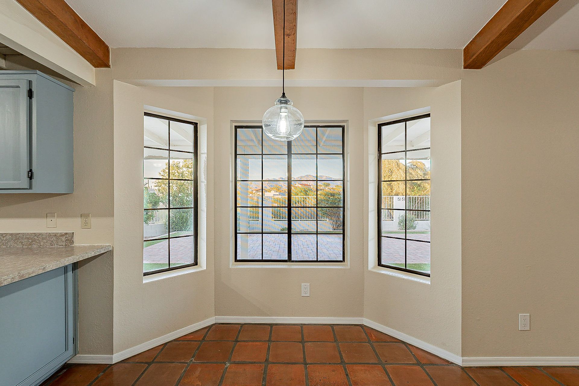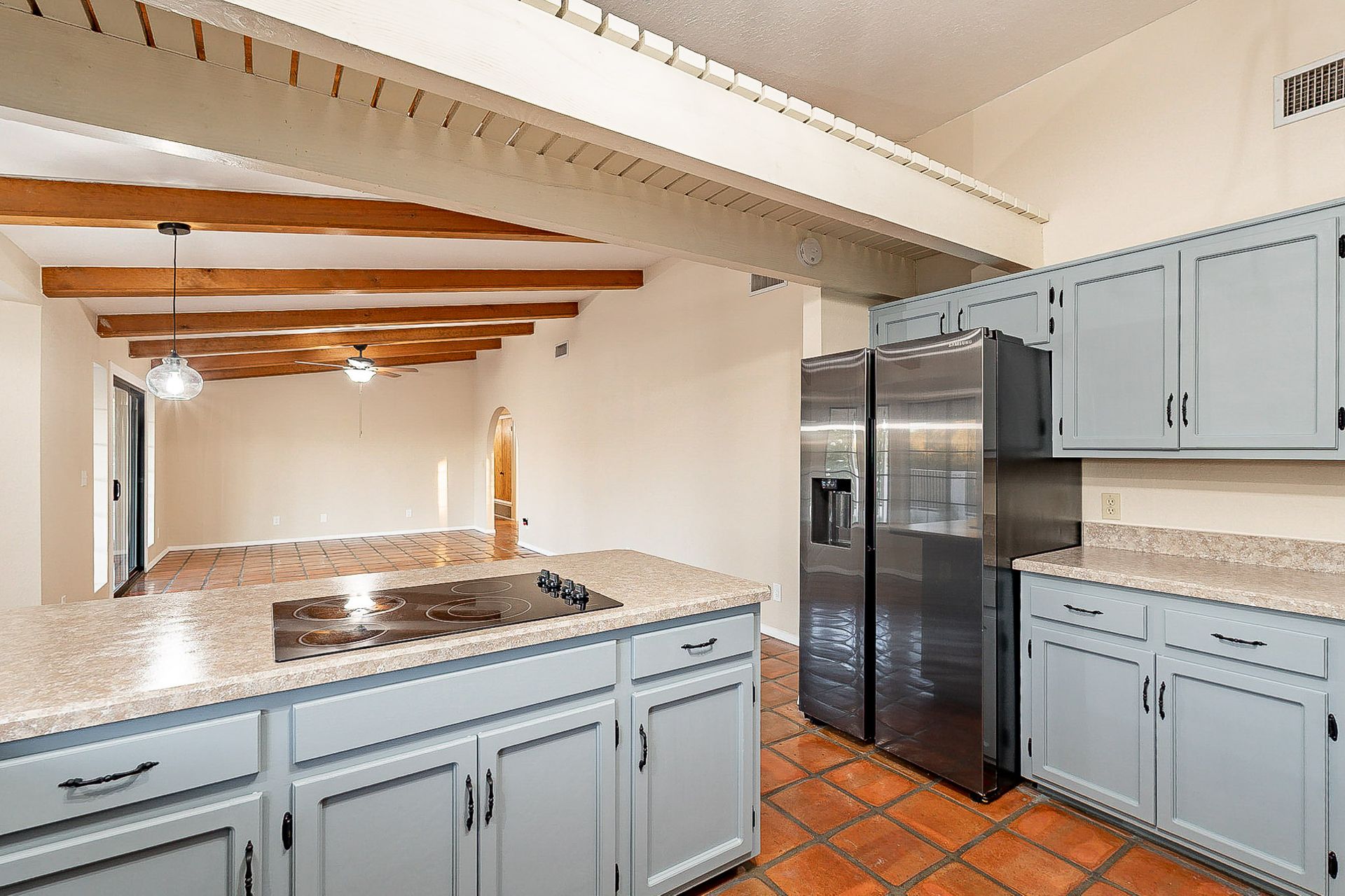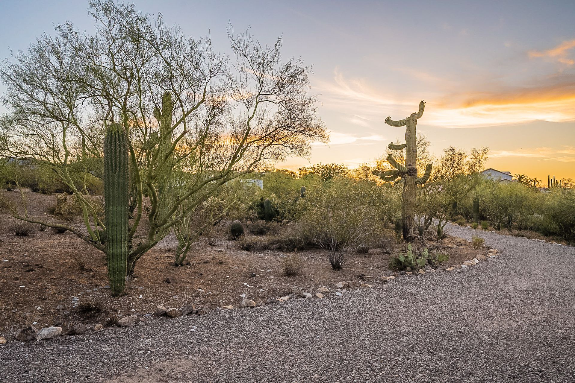 PRIVACY AND LOCATION! This stunning Tucson Ranch sits on over an acre of land with no rear neighbors. Lush acre backs up to a wash with beautiful mountain views, stunning sunsets, and city lights. Enjoy the low-care front yard and gorgeous backyard with a fully covered patio, pavers, a side yard, and artificial turf. The kitchen has just had a facelift with gorgeous greyish-blue cabinets, new hardware, and quartz-like counters – The bonus is a huge walk-in pantry. Beautiful wood beams run across the vaulted ceilings and warm Saltillo flooring. Three large bedrooms, two baths, oversized two-car garage plus huge workshop, man door, and extra storage. There are also dual-pane windows and newer light fixtures. It feels like you are on your own remote island - with a cul-de-sac location, however less than 10 minutes to I-10, with an easy commute to the University of Arizona, downtown, Raytheon, Caterpillar, Davis Monthan Air Base, and Tucson airport. This is a true Tucson gem - Hurry over for a Visit.