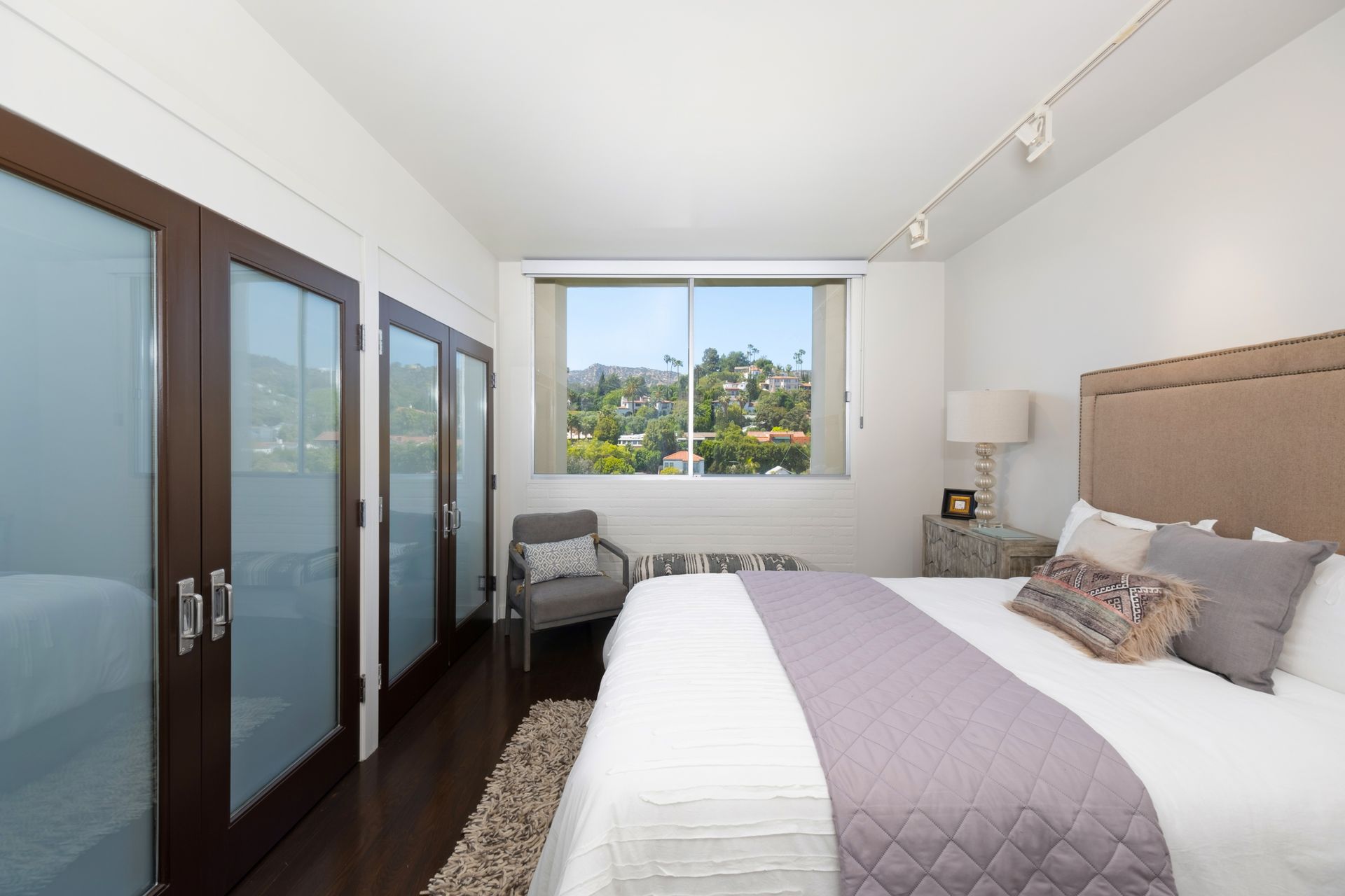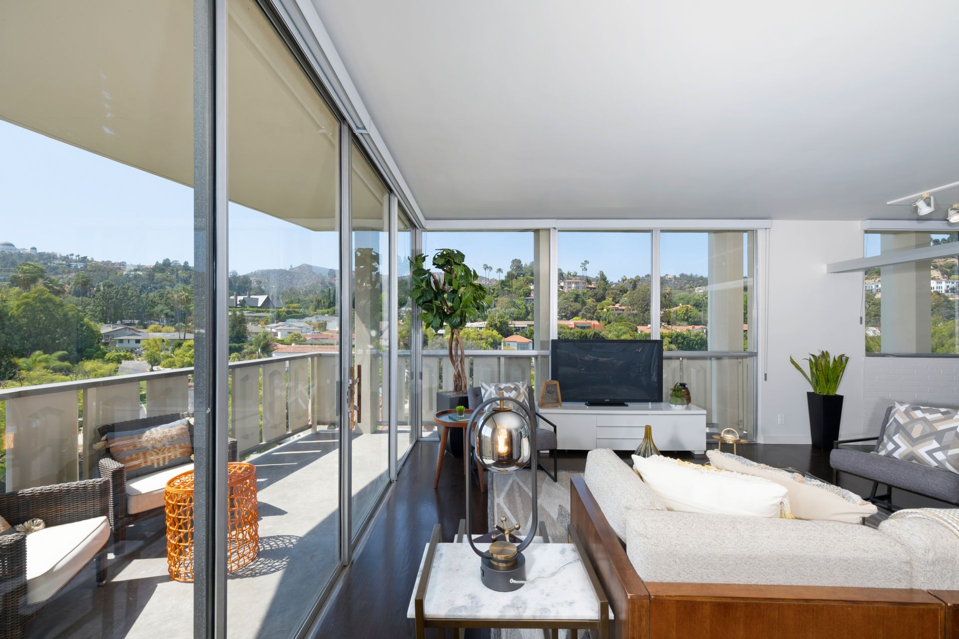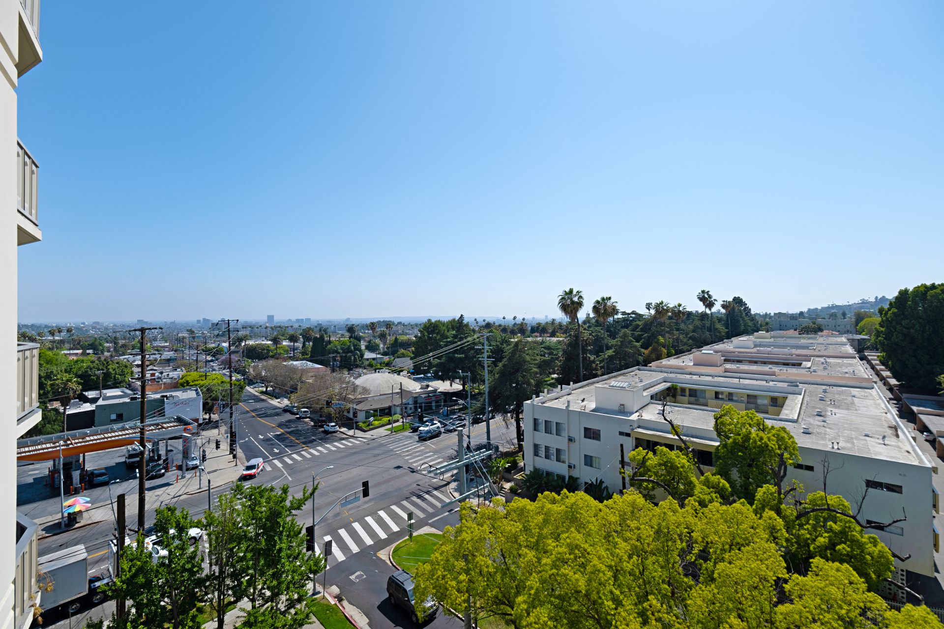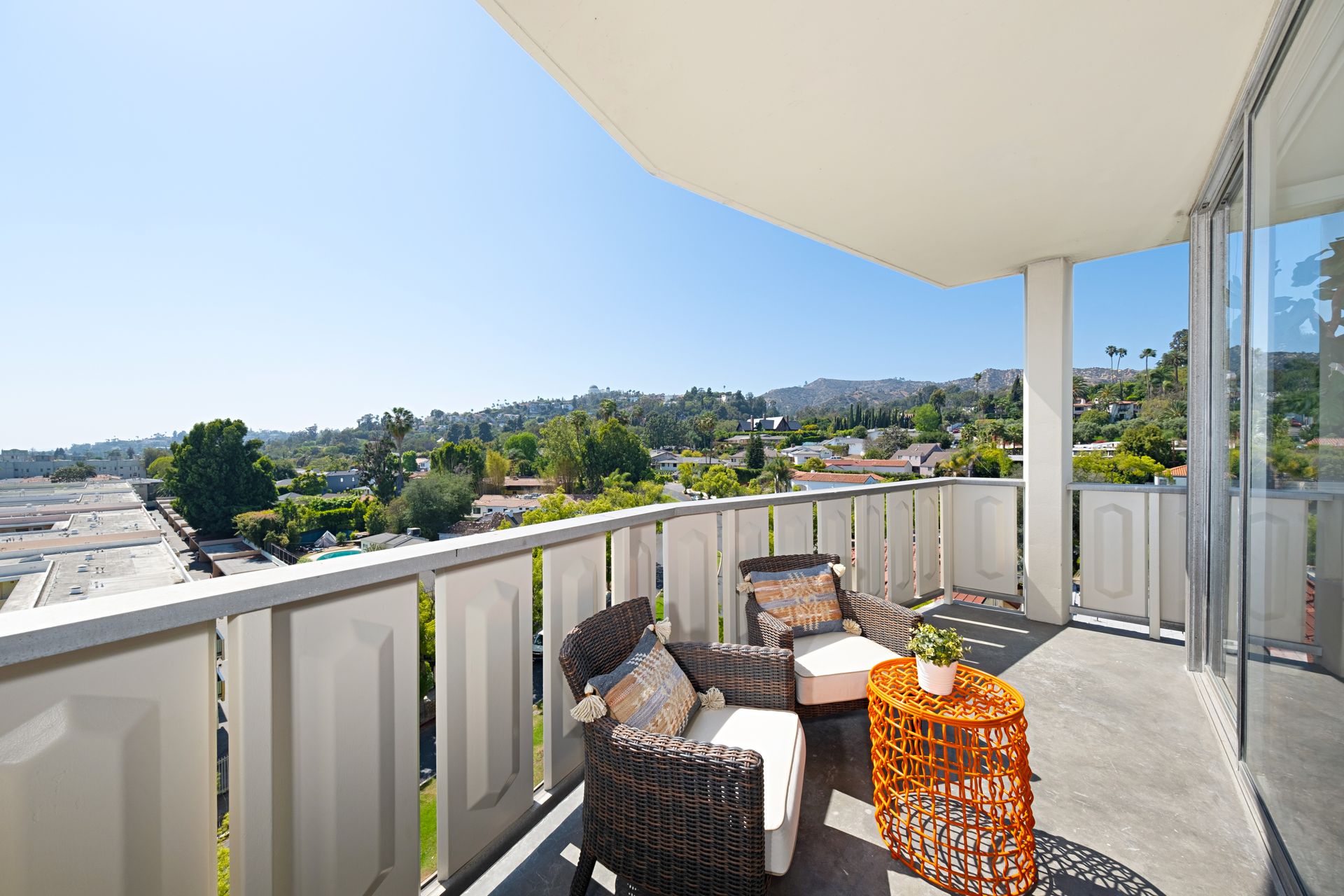 This coveted designer corner unit is most ideal for your main residence or Pied-à-terre. The modern kitchen features granite countertops, stainless-steel backsplash, and newer appliances. The unit showcases nine-foot ceilings with wall to ceiling glass windows with updated custom-fit shades. The newer sliding doors create an open space living area or an enclosed office with Halogen track lighting and built-in floating bookcases. The unit has oak hardwood floors with dark custom walnut finish and several built-in closets. The master bathroom has its own en-suite bathroom and newer spacious closets. This full-service complex features 24-hour security, a doorman, a beautiful heated pool, a gym, saunas, community laundry, two assigned premium parking spaces, a private storage unit and community bike racks. The unit has amazing views of all the things that makes this city spectacular: downtown, the ocean, hiking trails and Hollywood hills! Located a block away from Hillhurst Village shops, grocery stores and restaurants. Come home after a busy day and unwind watching the sunset off your private balcony.