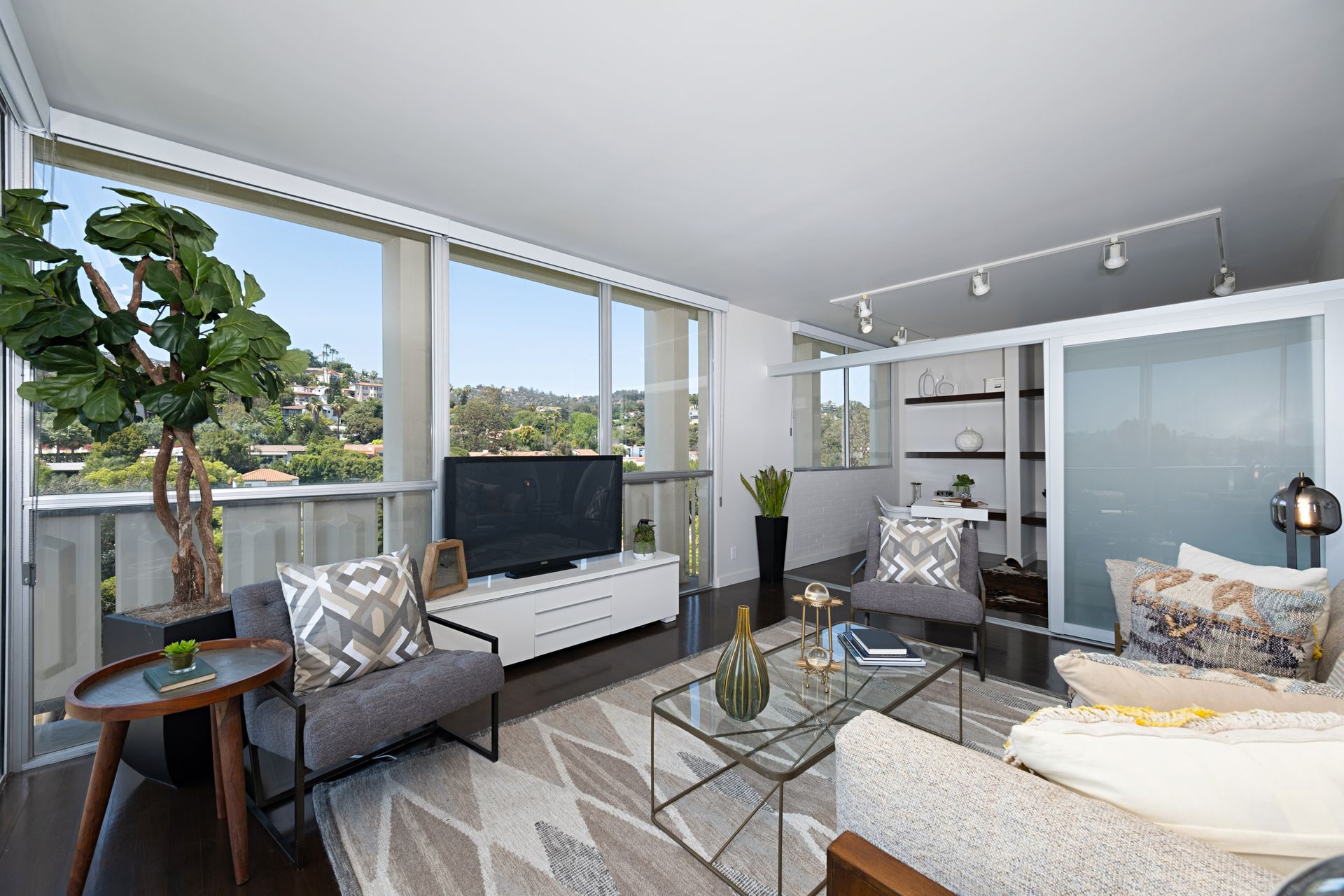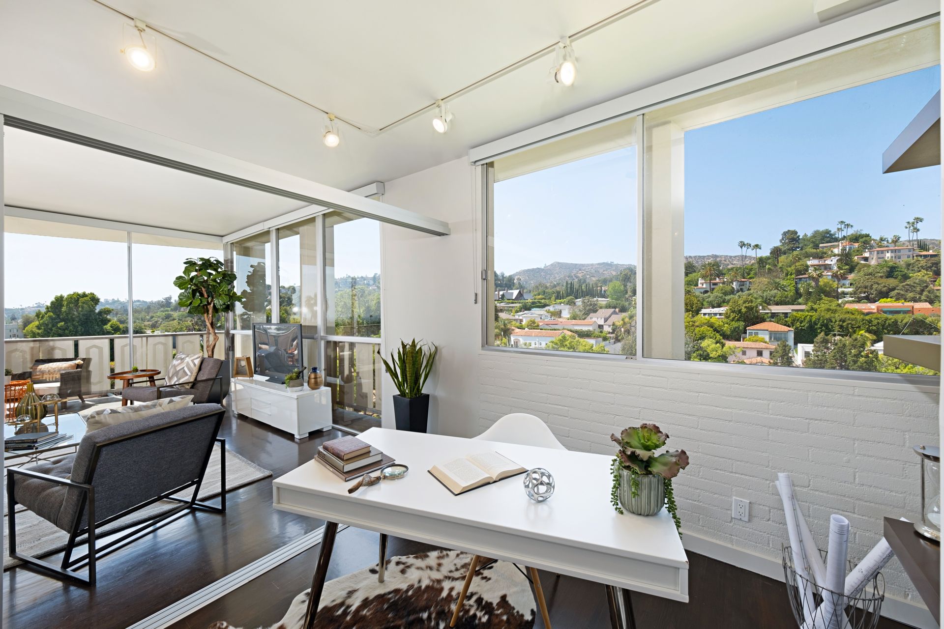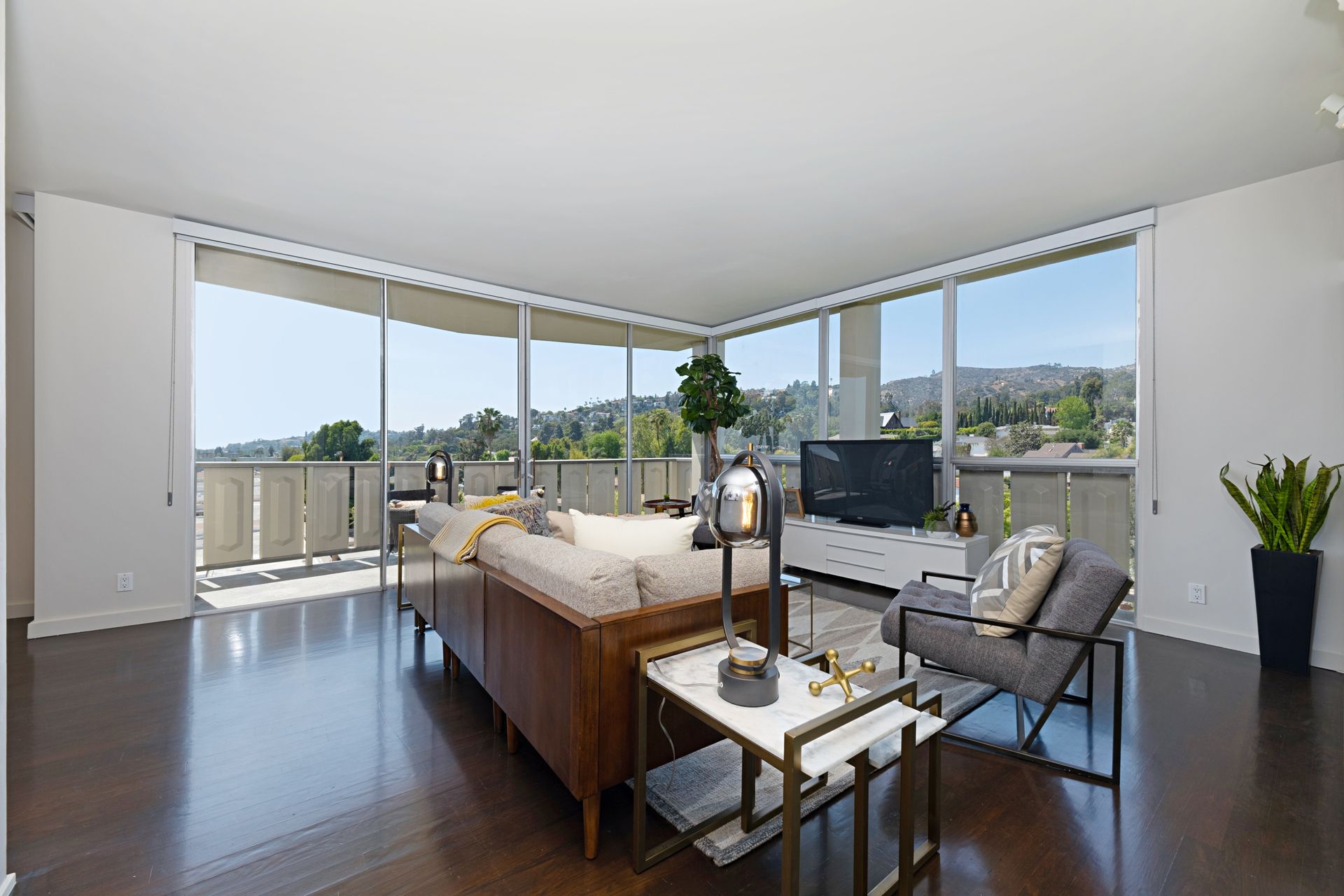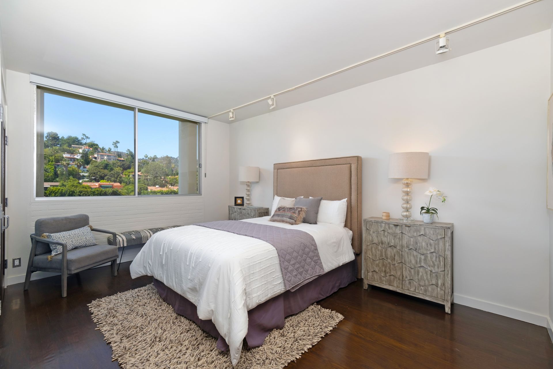 This coveted designer corner unit is most ideal for your main residence or Pied-à-terre. The modern kitchen features granite countertops, stainless-steel backsplash, and newer appliances. The unit showcases nine-foot ceilings with wall to ceiling glass windows with updated custom-fit shades. The newer sliding doors create an open space living area or an enclosed office with Halogen track lighting and built-in floating bookcases. The unit has oak hardwood floors with dark custom walnut finish and several built-in closets. The master bathroom has its own en-suite bathroom and newer spacious closets. This full-service complex features 24-hour security, a doorman, a beautiful heated pool, a gym, saunas, community laundry, two assigned premium parking spaces, a private storage unit and community bike racks. The unit has amazing views of all the things that makes this city spectacular: downtown, the ocean, hiking trails and Hollywood hills! Located a block away from Hillhurst Village shops, grocery stores and restaurants. Come home after a busy day and unwind watching the sunset off your private balcony.