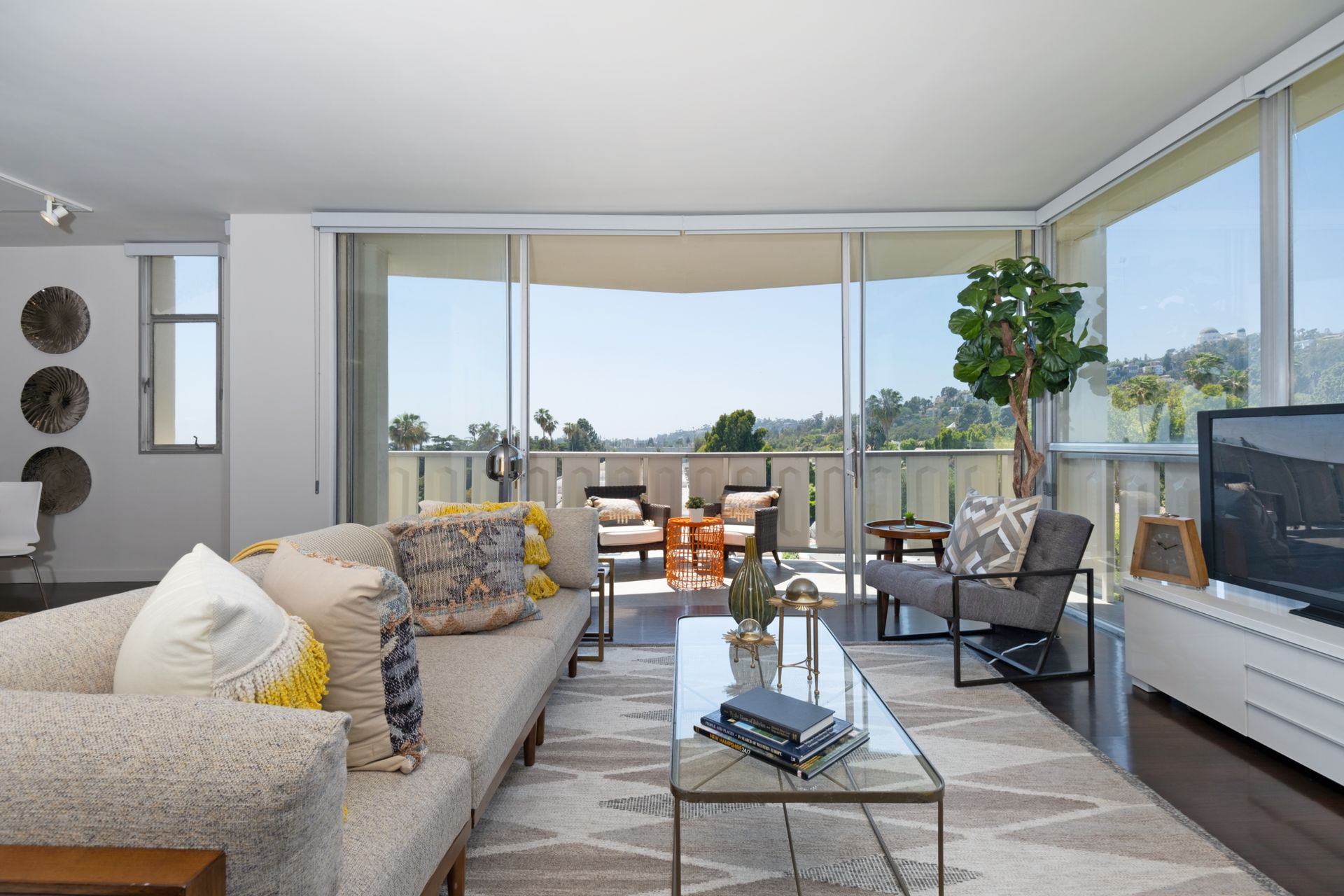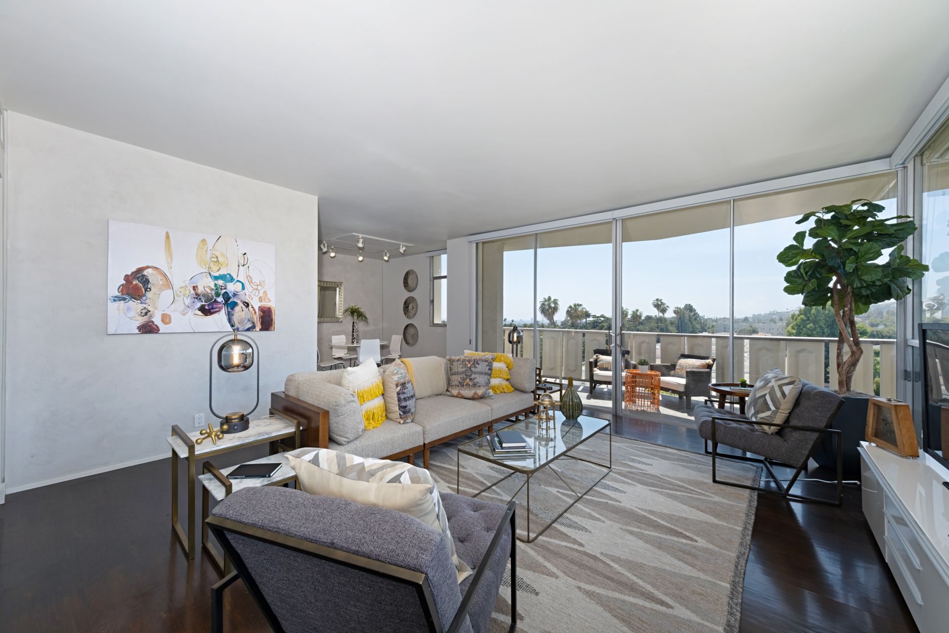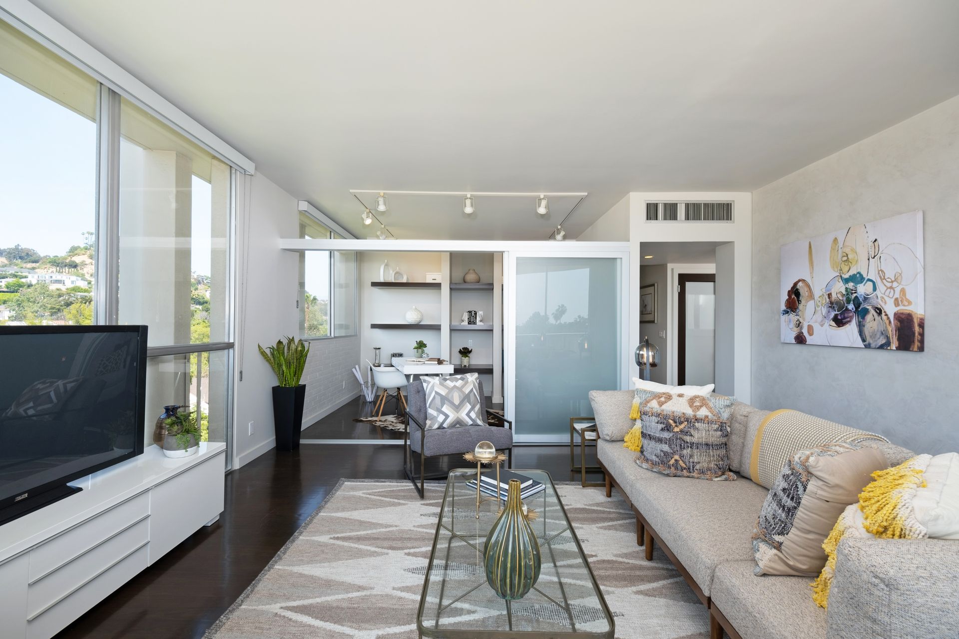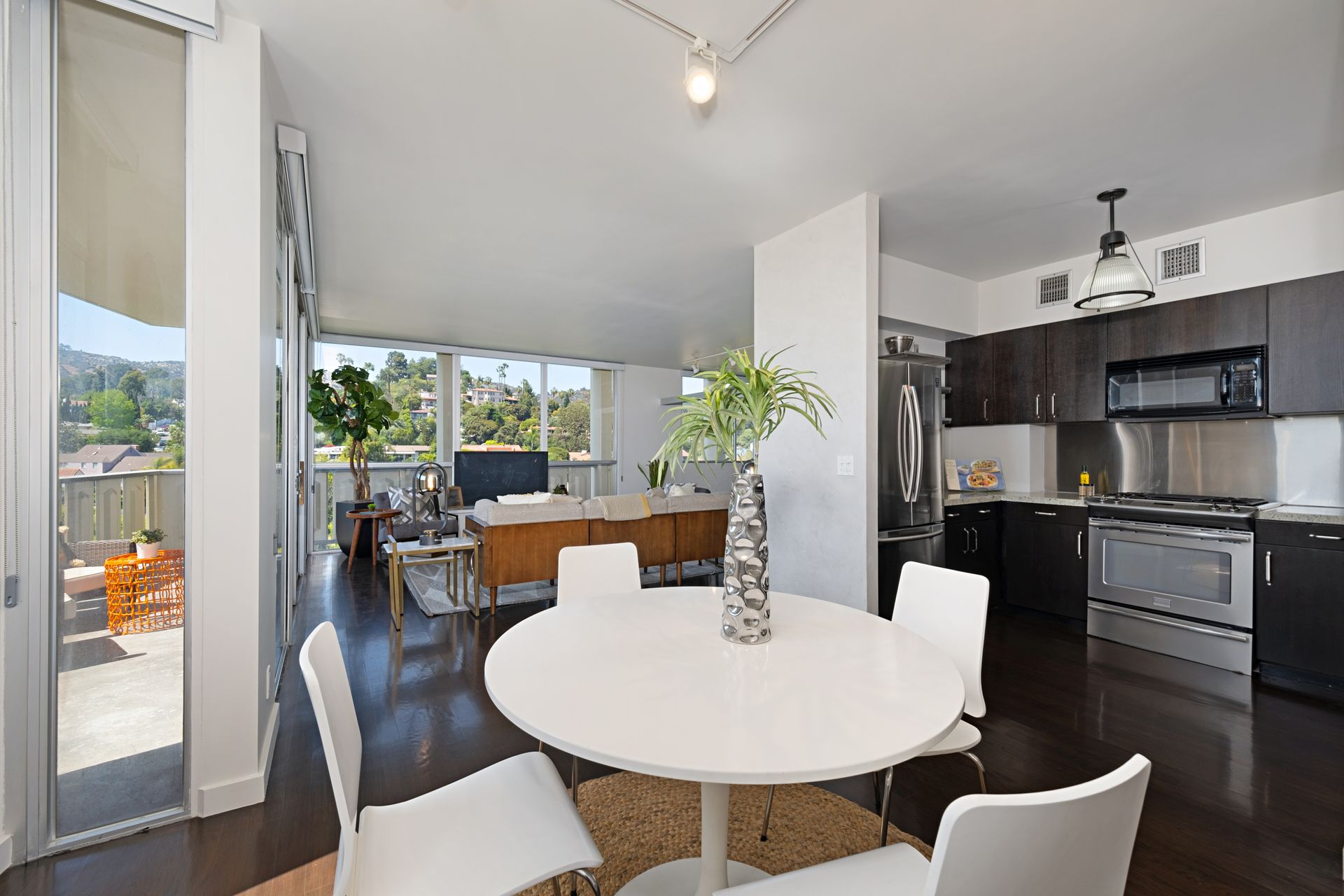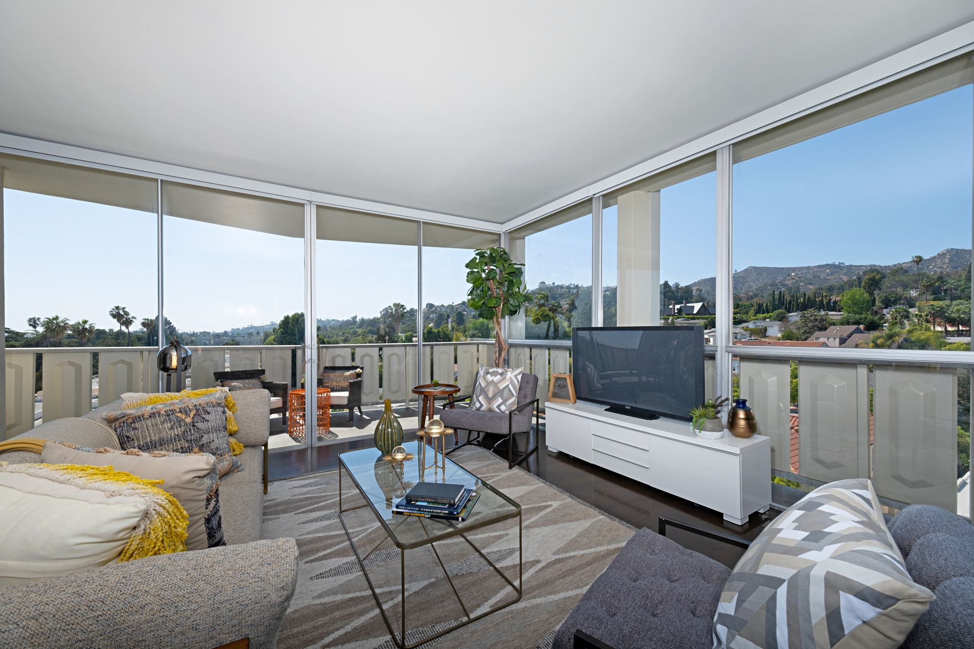 This coveted designer corner unit is most ideal for your main residence or Pied-à-terre. The modern kitchen features granite countertops, stainless-steel backsplash, and newer appliances. The unit showcases nine-foot ceilings with wall to ceiling glass windows with updated custom-fit shades. The newer sliding doors create an open space living area or an enclosed office with Halogen track lighting and built-in floating bookcases. The unit has oak hardwood floors with dark custom walnut finish and several built-in closets. The master bathroom has its own en-suite bathroom and newer spacious closets. This full-service complex features 24-hour security, a doorman, a beautiful heated pool, a gym, saunas, community laundry, two assigned premium parking spaces, a private storage unit and community bike racks. The unit has amazing views of all the things that makes this city spectacular: downtown, the ocean, hiking trails and Hollywood hills! Located a block away from Hillhurst Village shops, grocery stores and restaurants. Come home after a busy day and unwind watching the sunset off your private balcony.